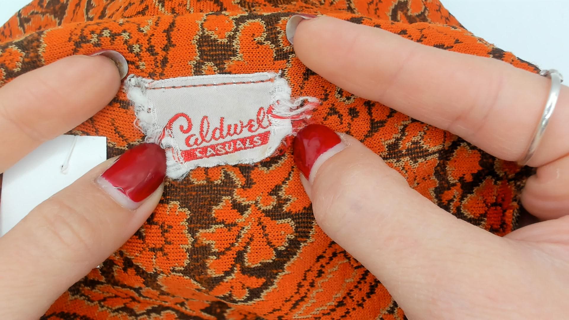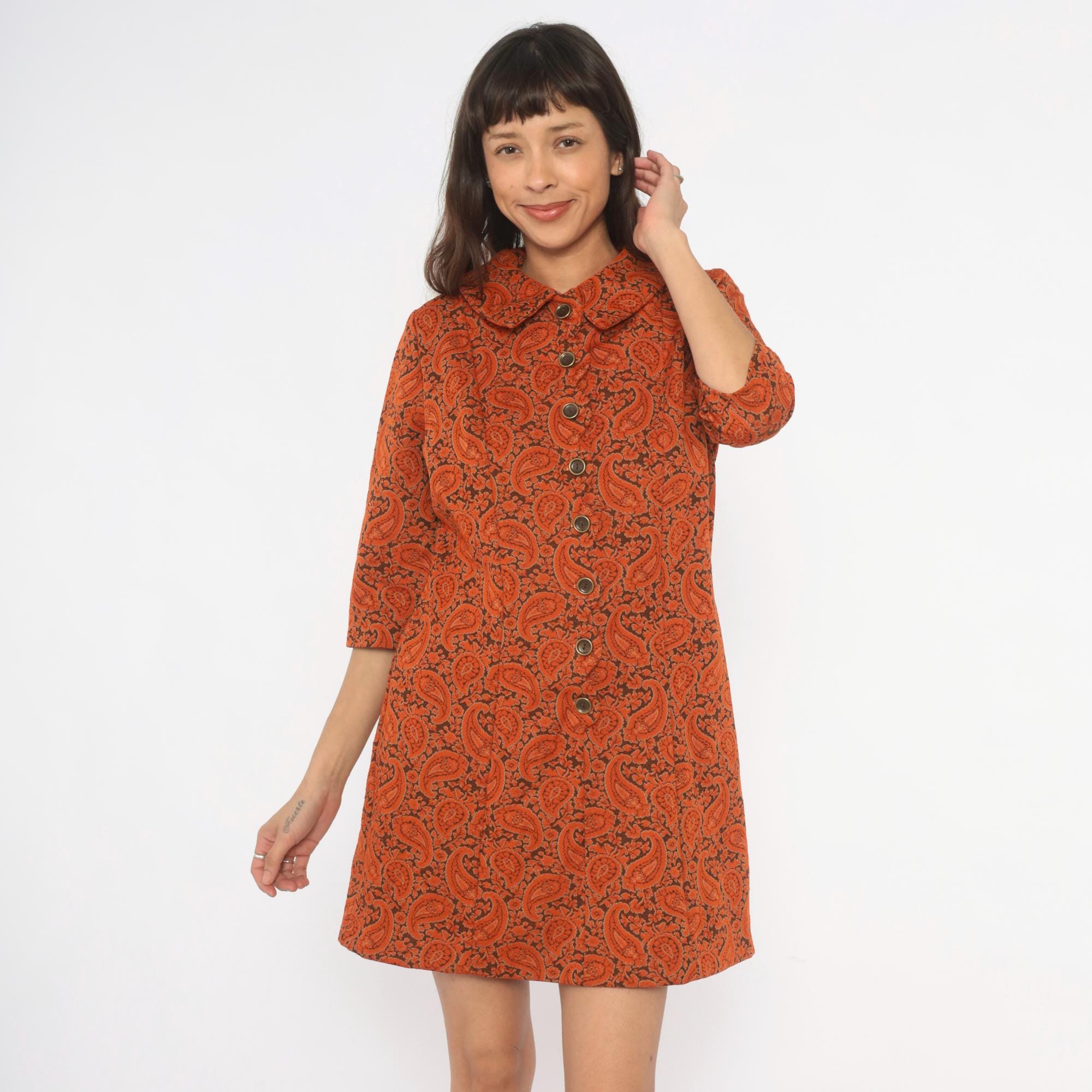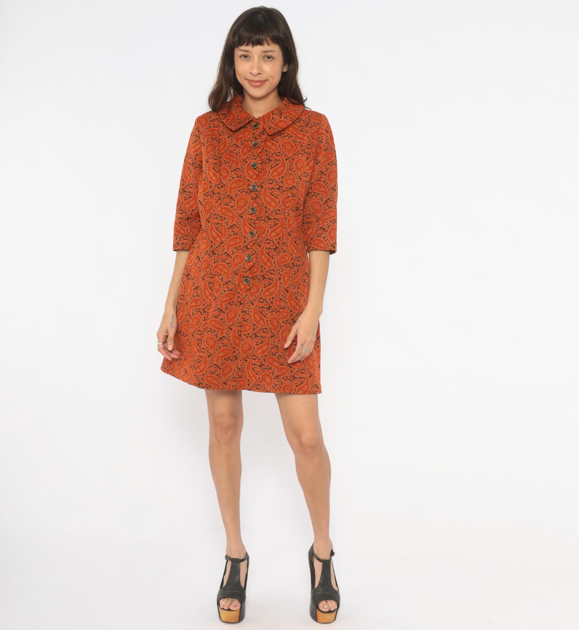 70s orange and brown paisley shift dress from Caldwell with a pointed fold-over collar and full button front closure with brass-tone buttons. Three-quarter length sleeves and an A-line silhouette falling above the knee. Allover paisley and floral print in rust, copper, and deep brown tones across the entire garment.