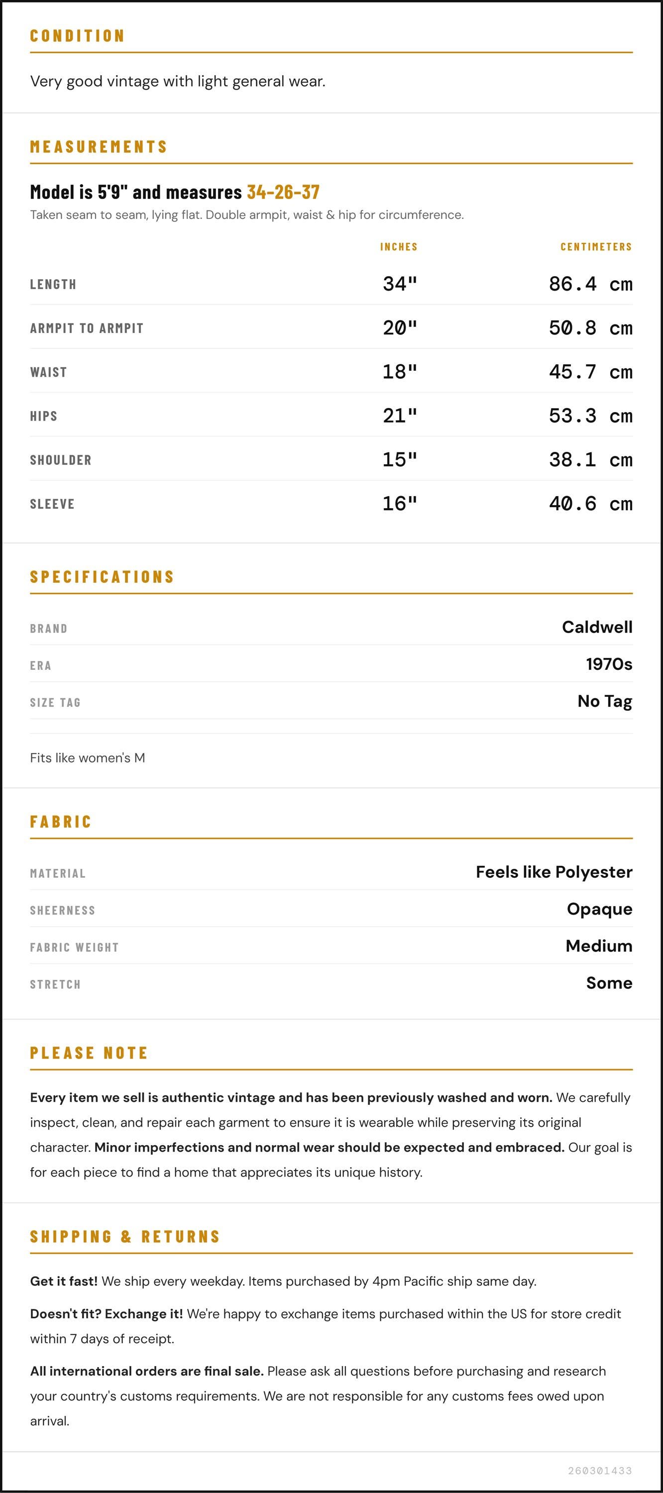 Measurements are taken laying flat and should be doubled where applicable. The "best fits" size is just an estimate, and vintage sizing can vary from modern sizing. Please use measurements to ensure proper fit. The best thing to do is measure a similar item of your own, and compare. When an item has stretch, we will list the unstretched dimensions with the stretched measurement afterwards.