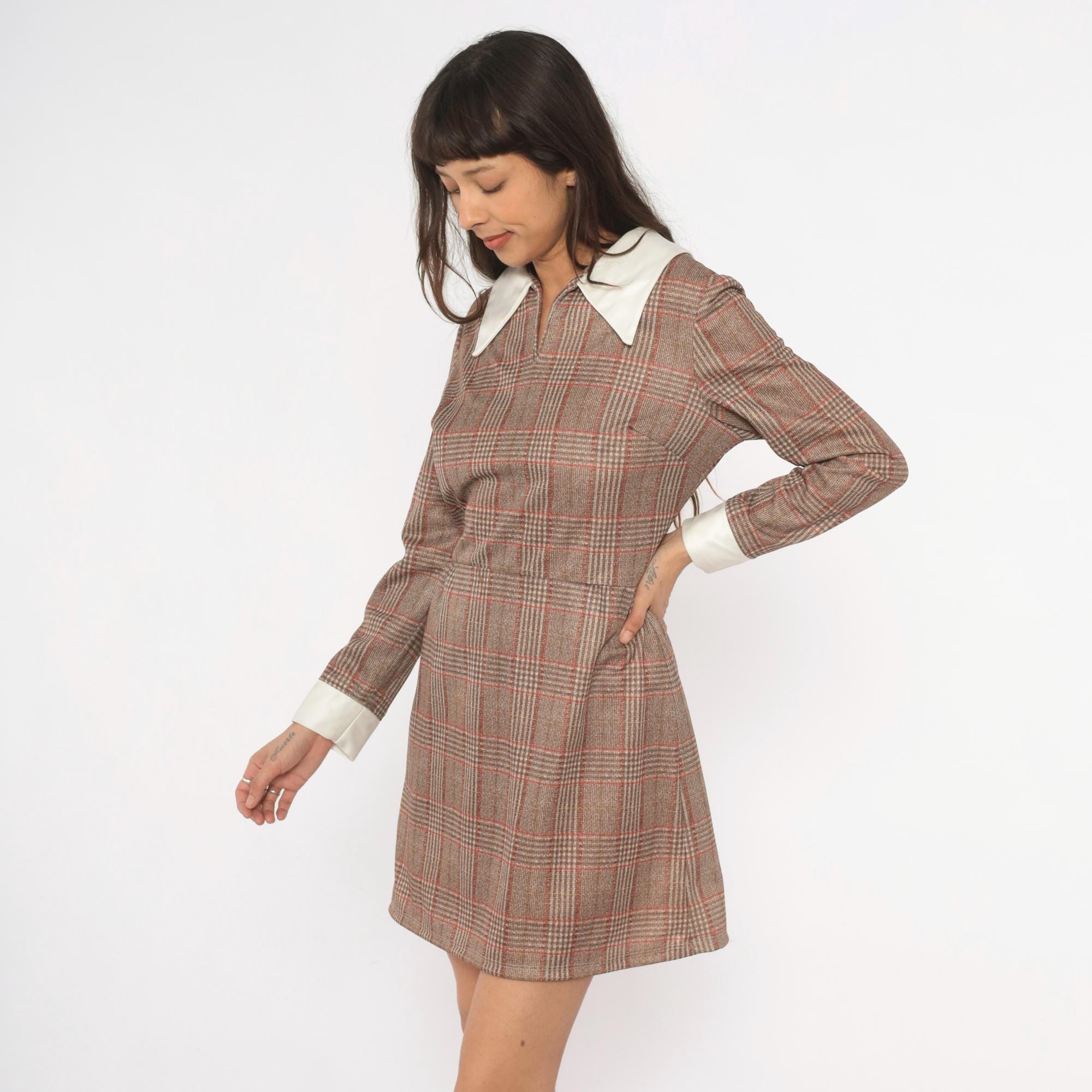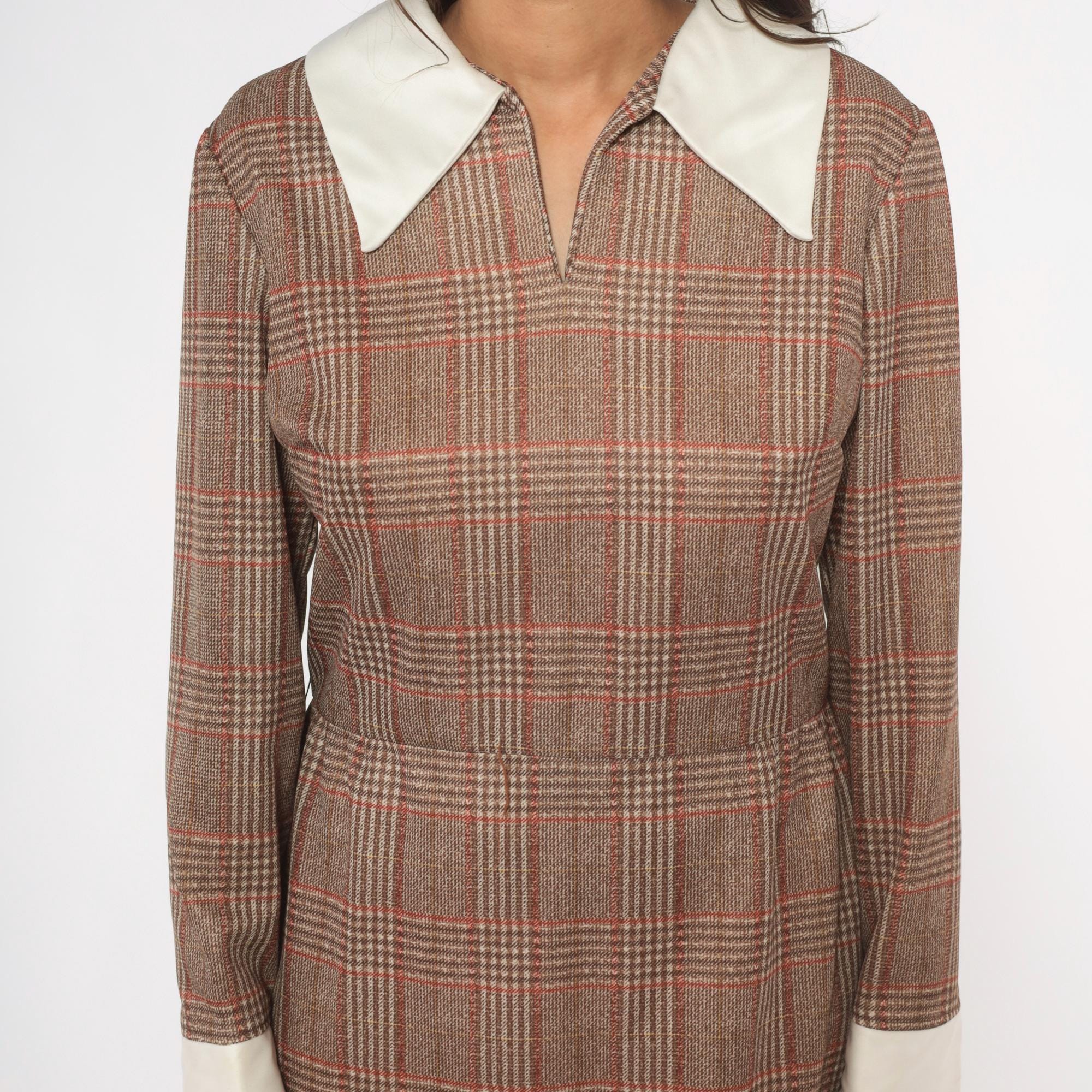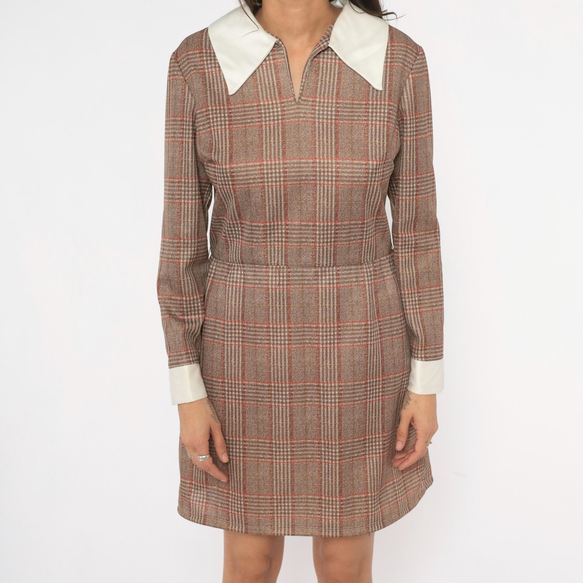 70s glen plaid mini dress in tan, rust, and brown with a contrasting cream pointed collar and matching wide cuffs. Long sleeves, fitted waist, and an A-line skirt with back zipper closure. V-notch neckline with the collar sitting flat across the shoulders and chest.