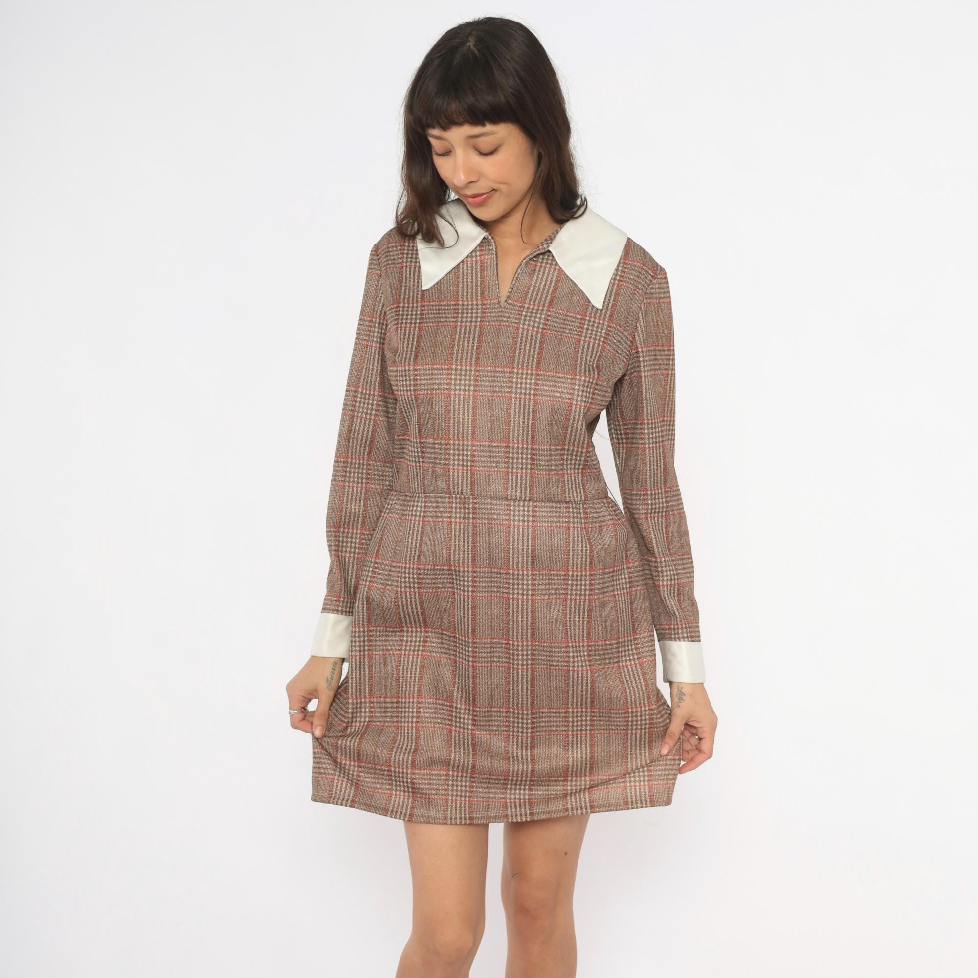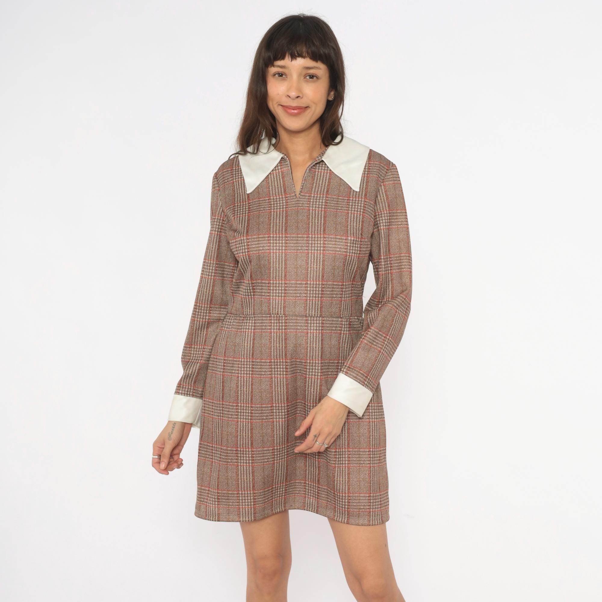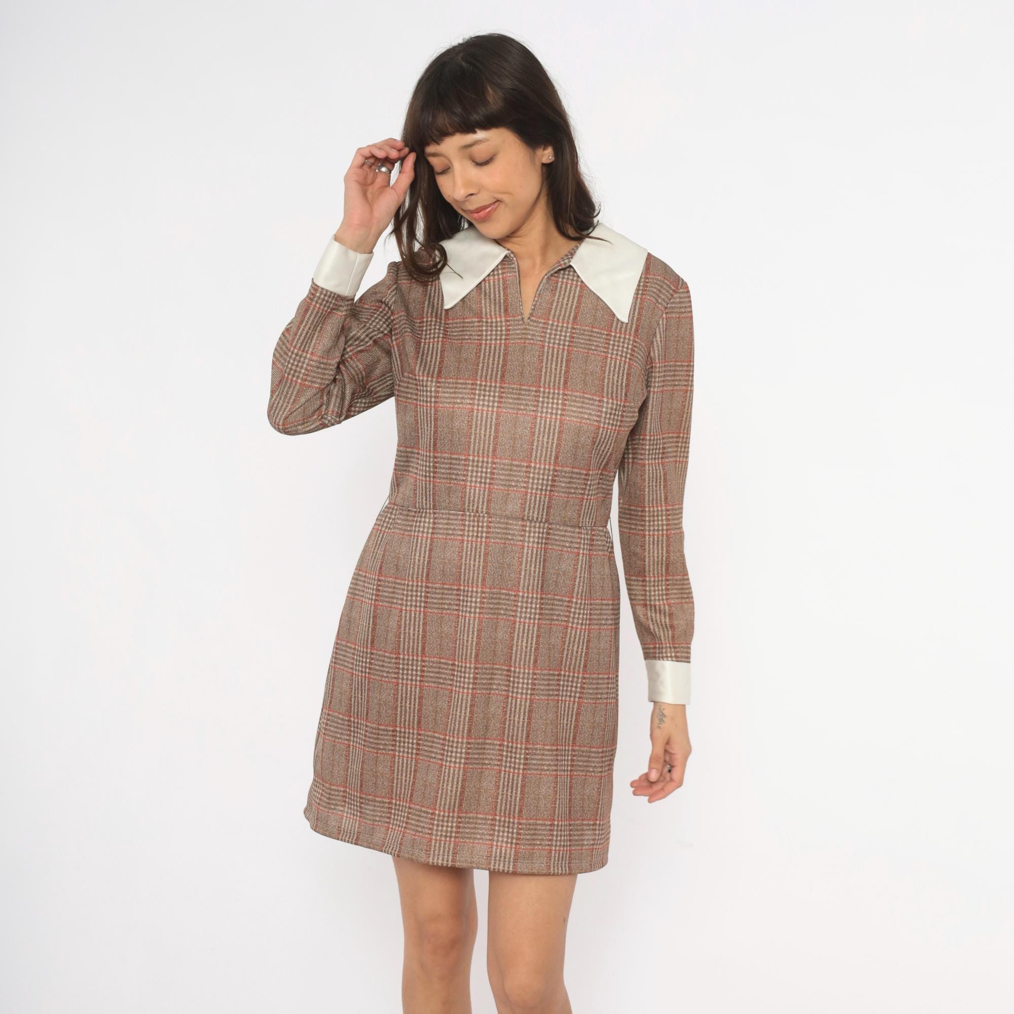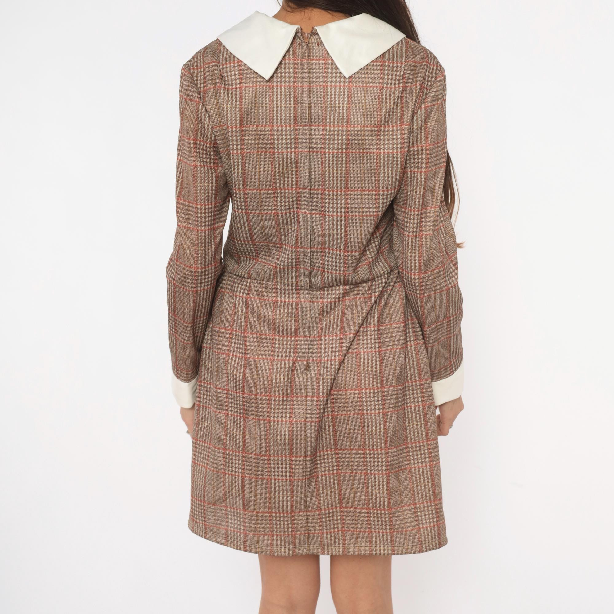 70s glen plaid mini dress in tan, rust, and brown with a contrasting cream pointed collar and matching wide cuffs. Long sleeves, fitted waist, and an A-line skirt with back zipper closure. V-notch neckline with the collar sitting flat across the shoulders and chest.