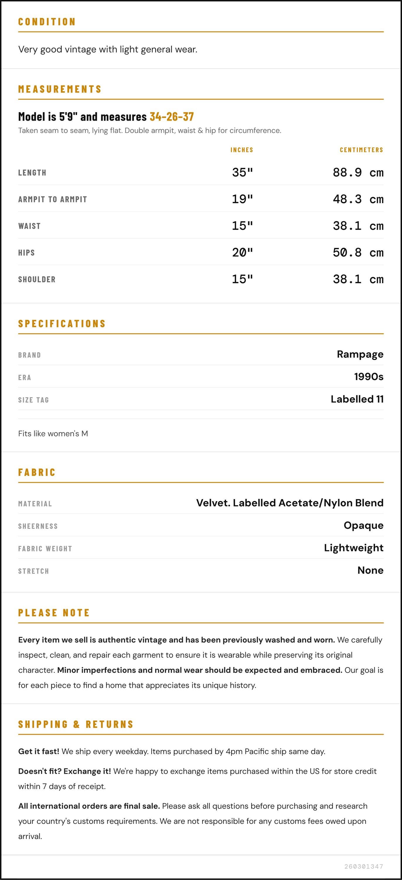 Measurements are taken laying flat and should be doubled where applicable. The "best fits" size is just an estimate, and vintage sizing can vary from modern sizing. Please use measurements to ensure proper fit. The best thing to do is measure a similar item of your own, and compare. When an item has stretch, we will list the unstretched dimensions with the stretched measurement afterwards.