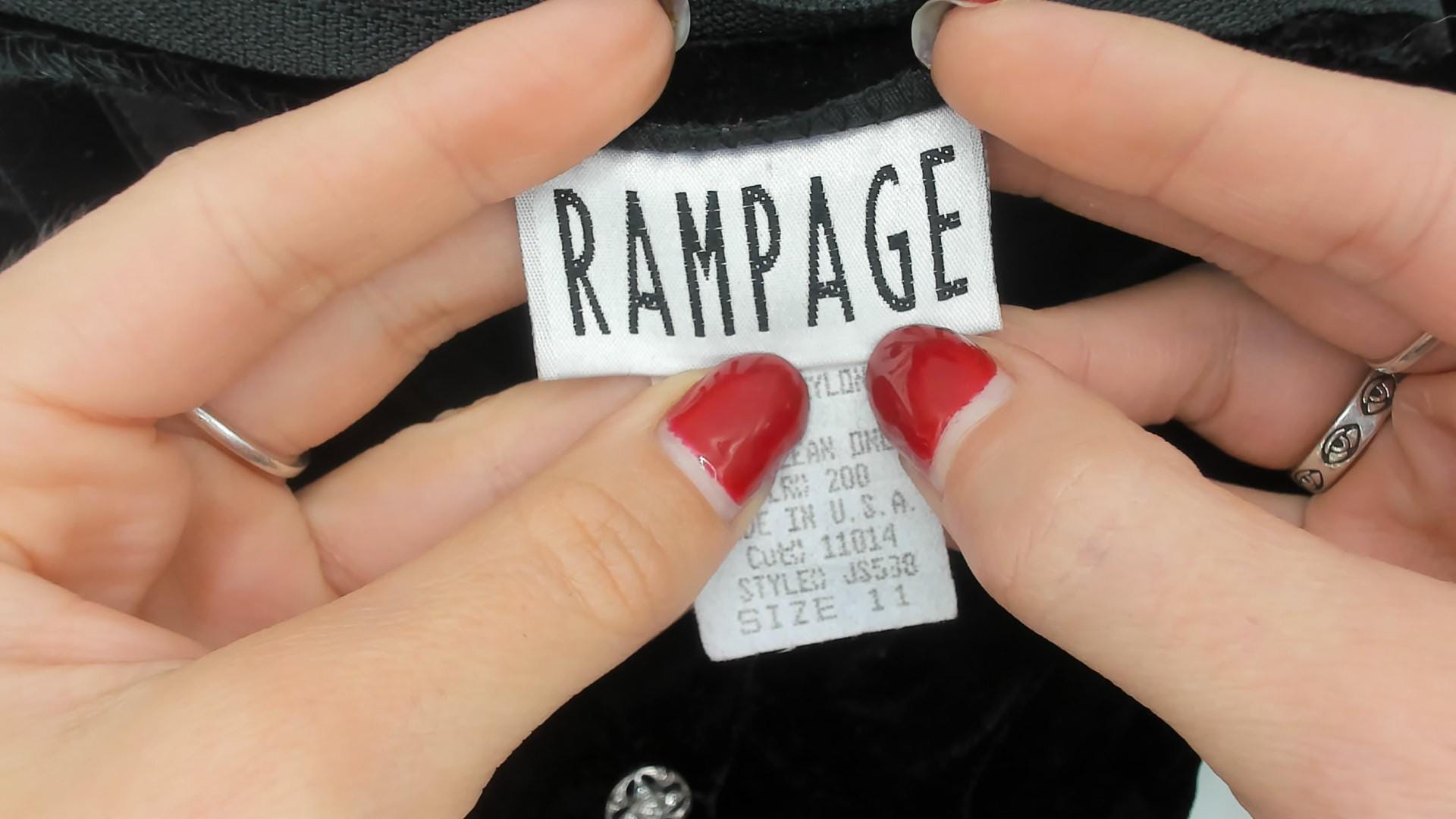 90s black velvet sleeveless mini dress from Rampage with a scoop neckline trimmed in satin binding. Three small rhinestone buttons line the center front bodice. Fitted through the bodice and waist with a back zipper closure, and the hemline falls above the knee.