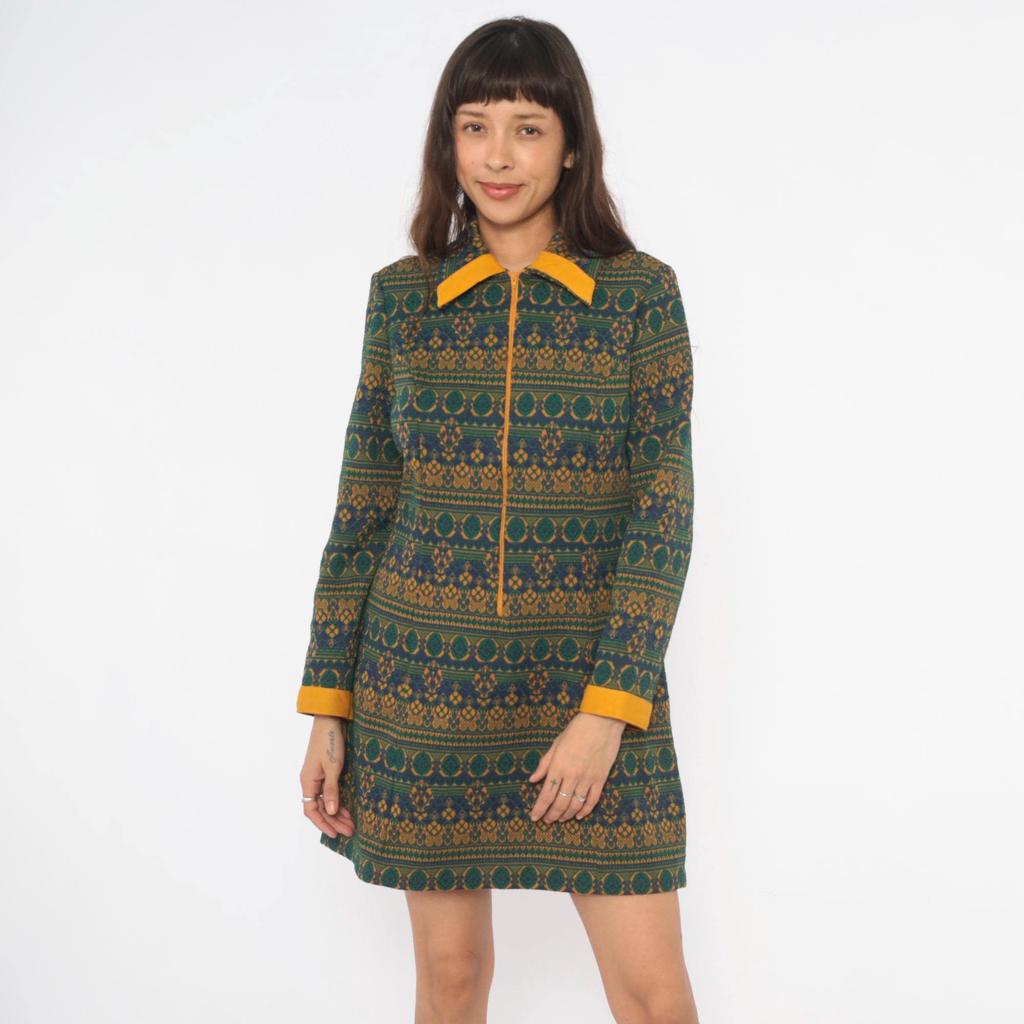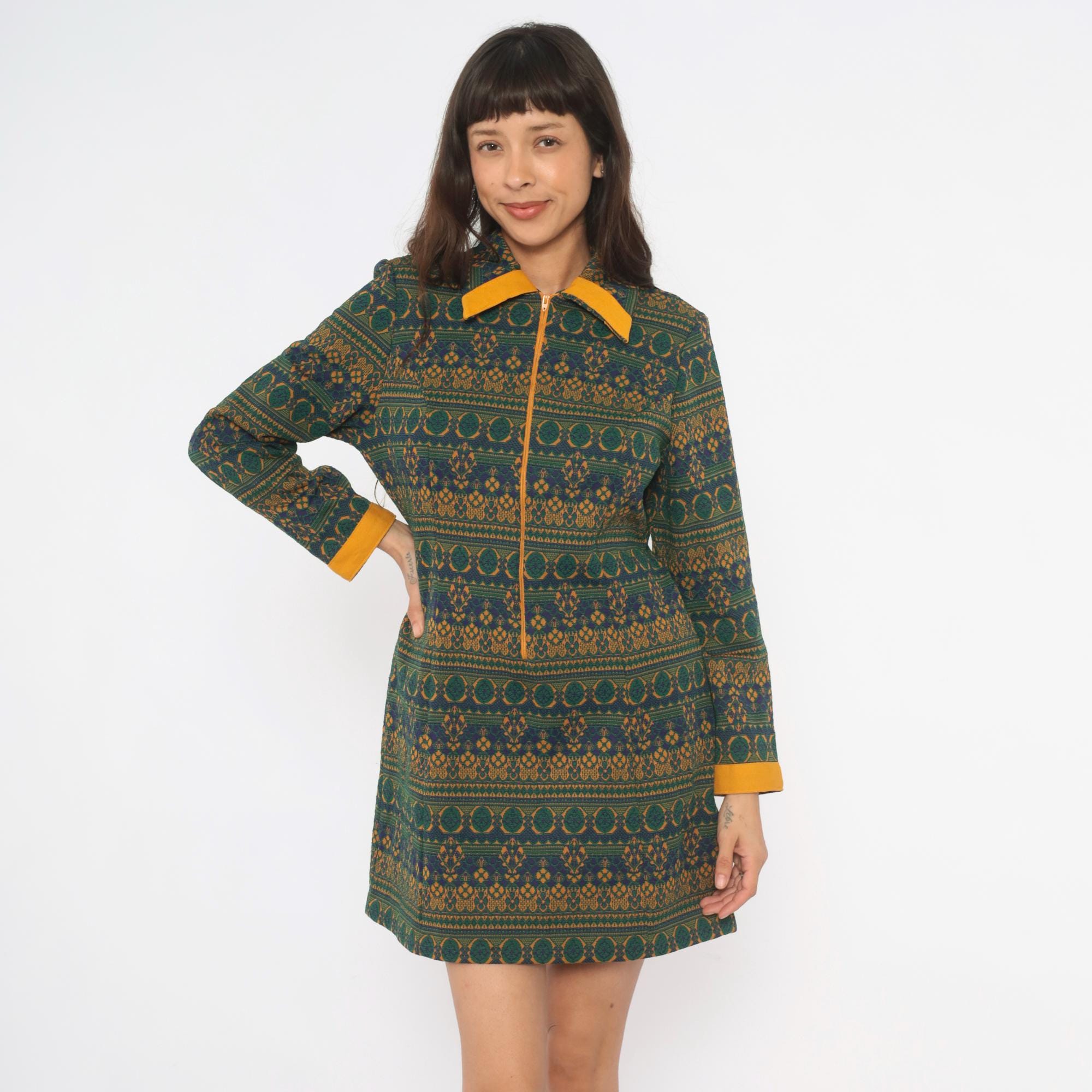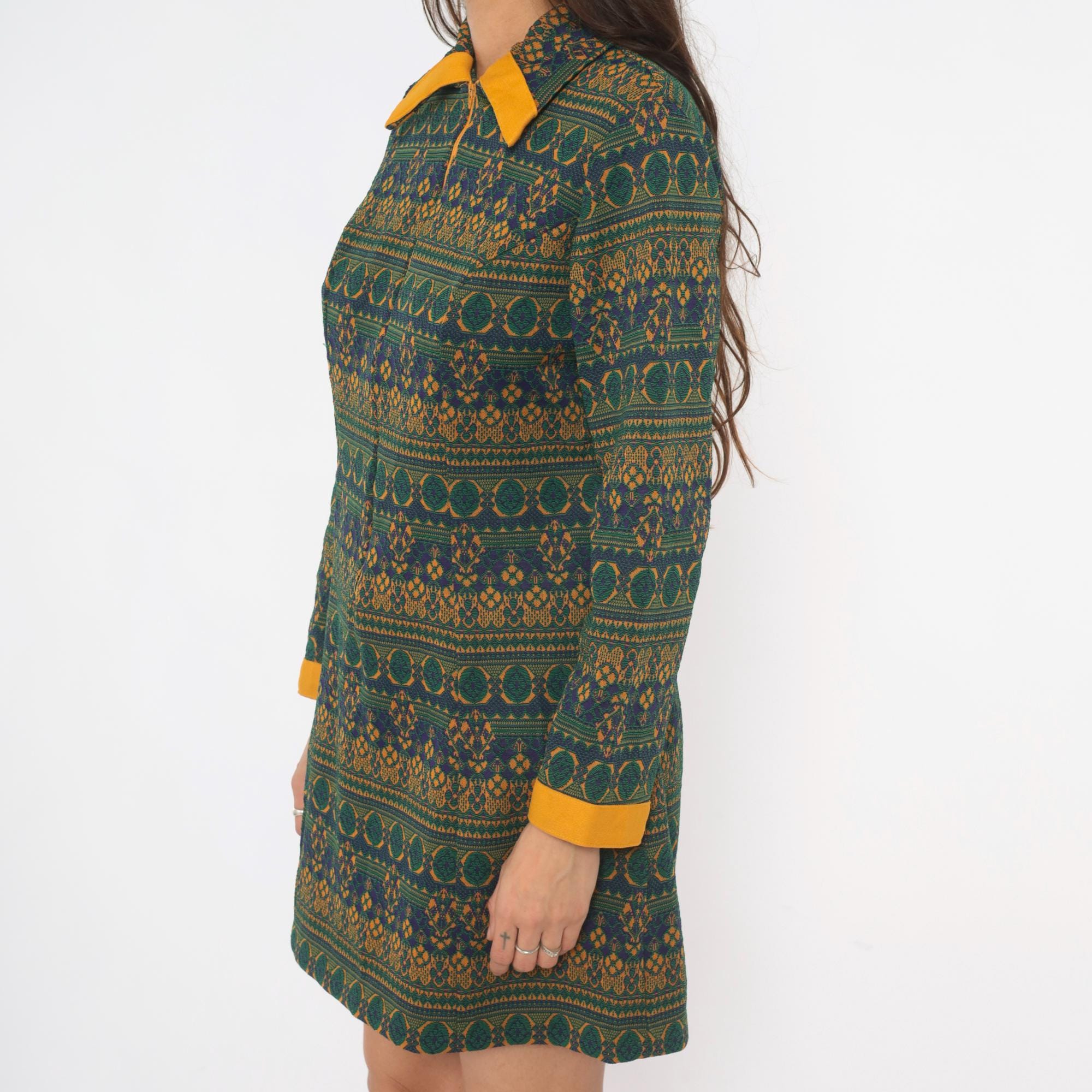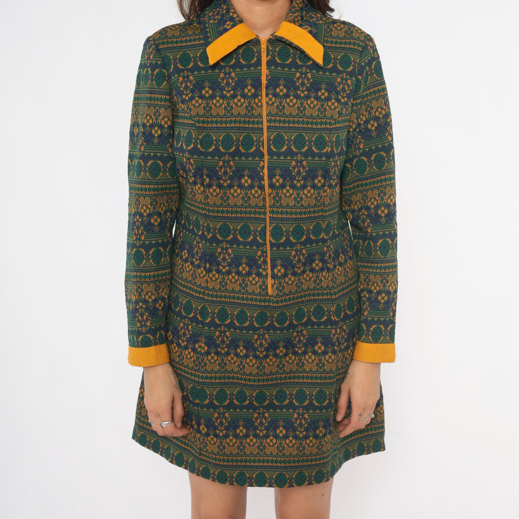 70s jacquard mini dress from NPC Fashions with horizontal bands of folk-inspired geometric and floral motifs in forest green, navy, and gold. Pointed mustard collar with matching turned-back cuffs and front zipper closure from neckline to waist. Long sleeves, A-line silhouette, and allover woven tapestry pattern with repeating medallion and diamond rows.