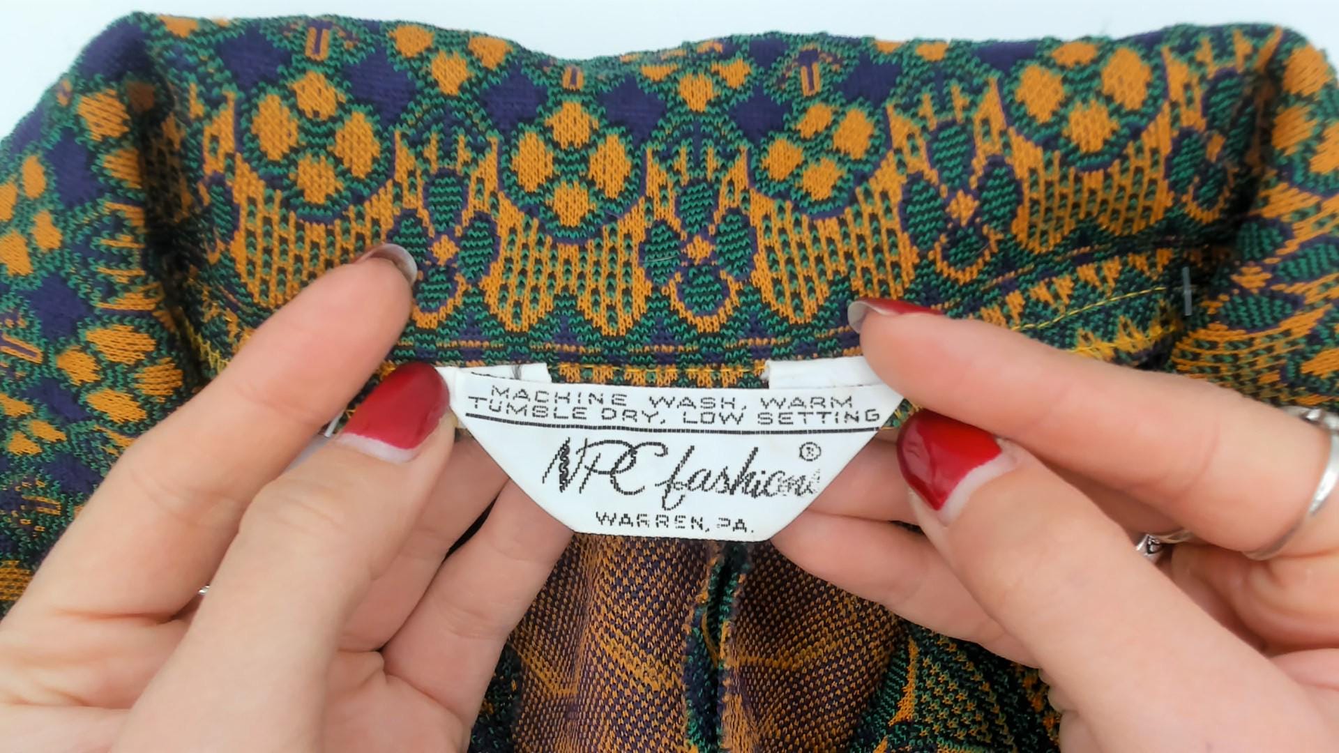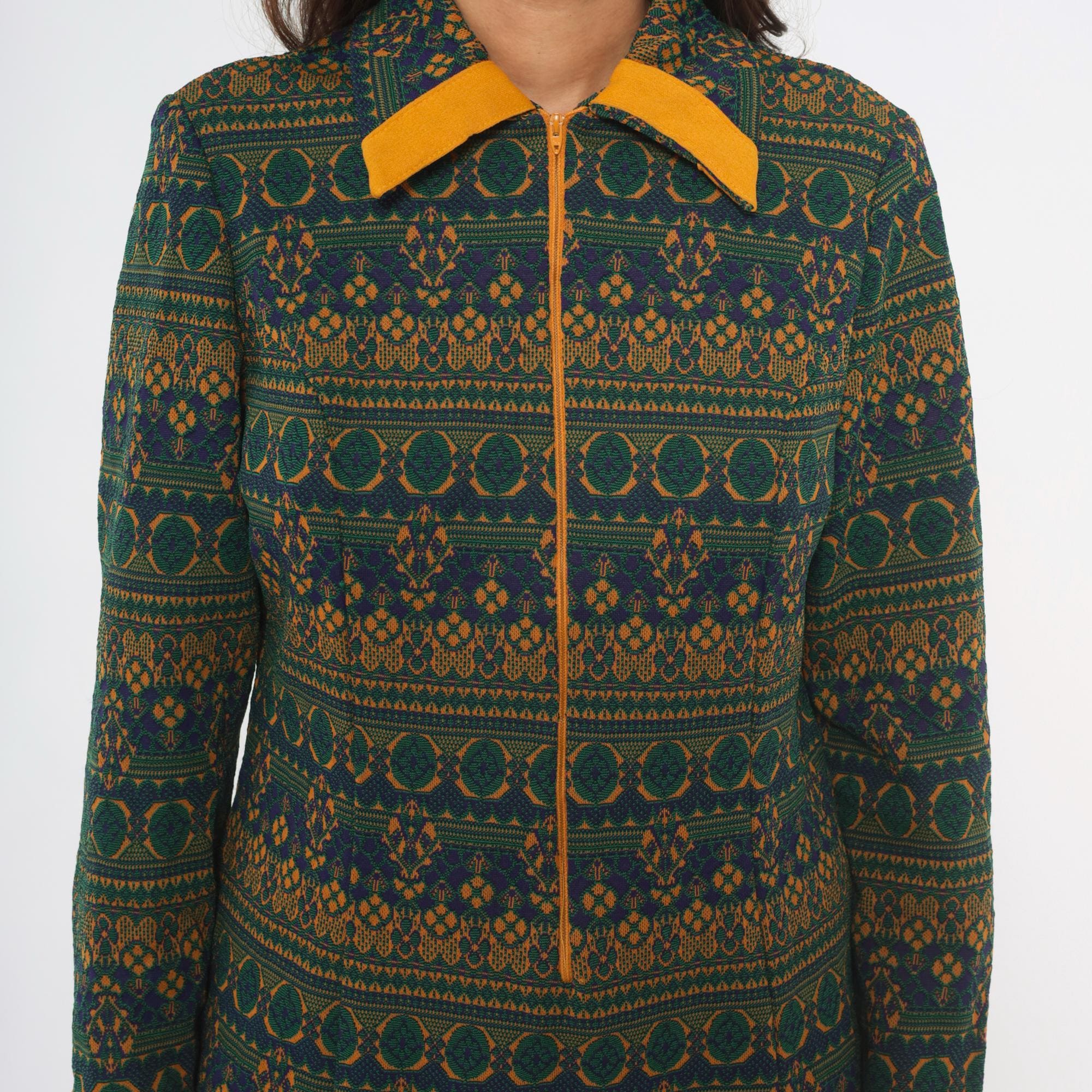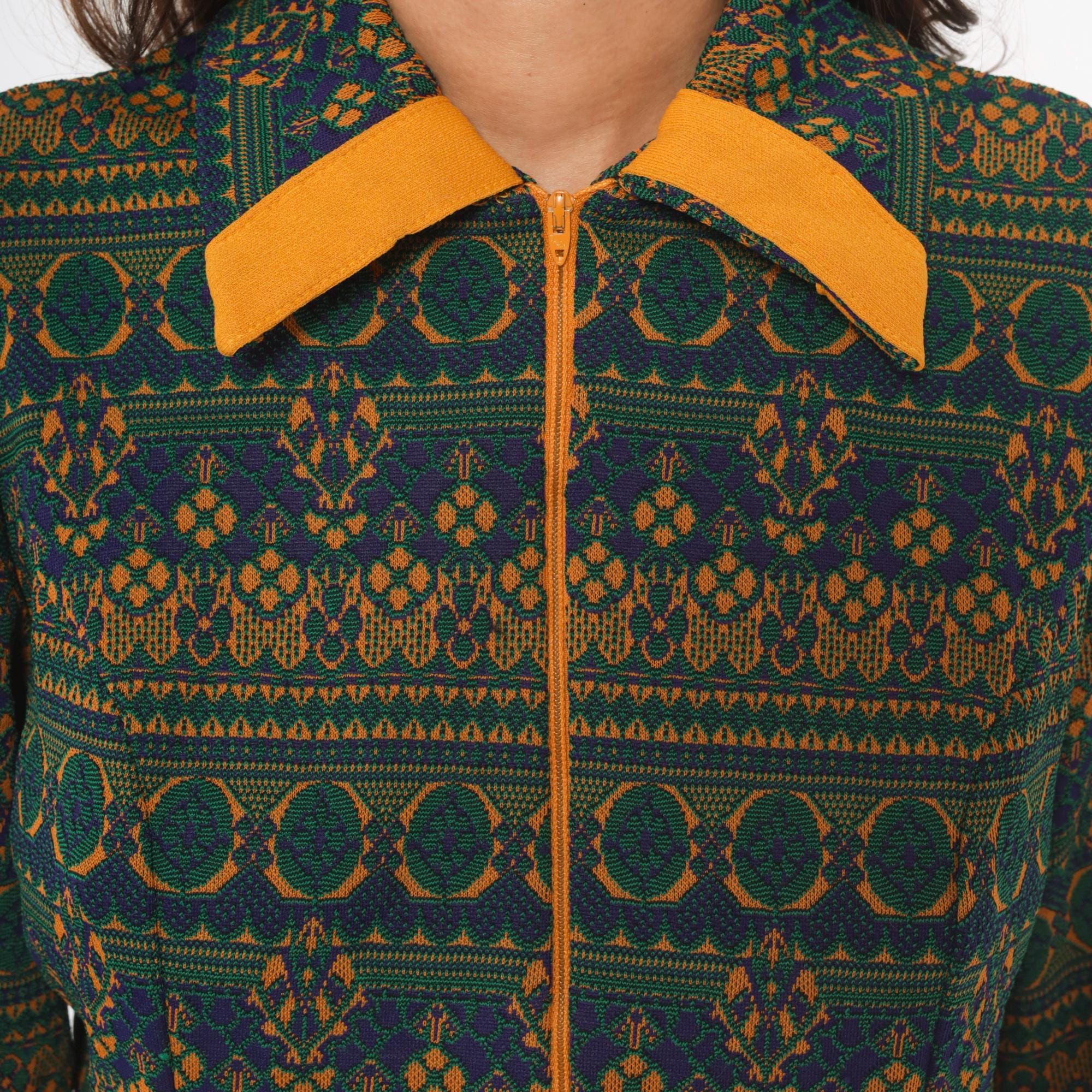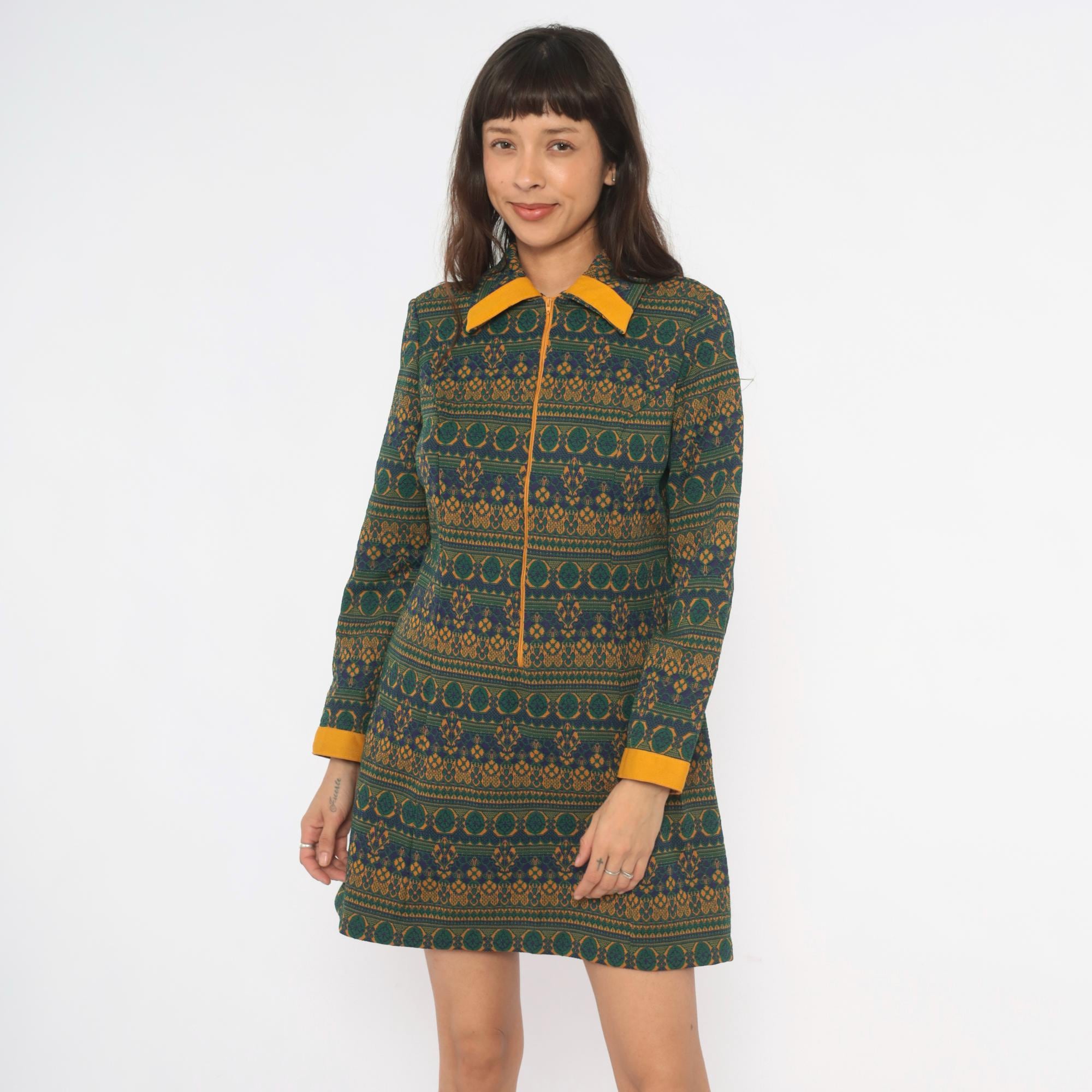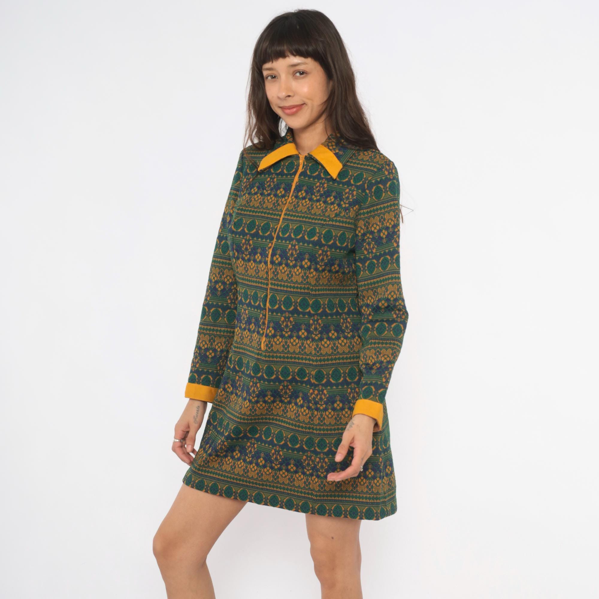 70s jacquard mini dress from NPC Fashions with horizontal bands of folk-inspired geometric and floral motifs in forest green, navy, and gold. Pointed mustard collar with matching turned-back cuffs and front zipper closure from neckline to waist. Long sleeves, A-line silhouette, and allover woven tapestry pattern with repeating medallion and diamond rows.