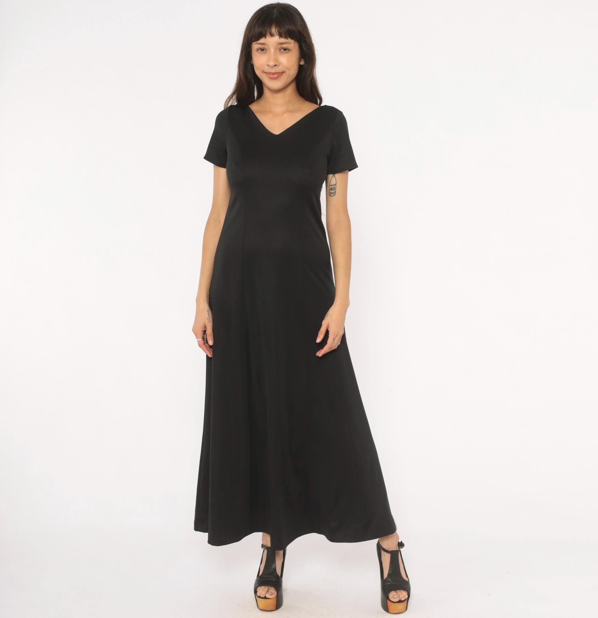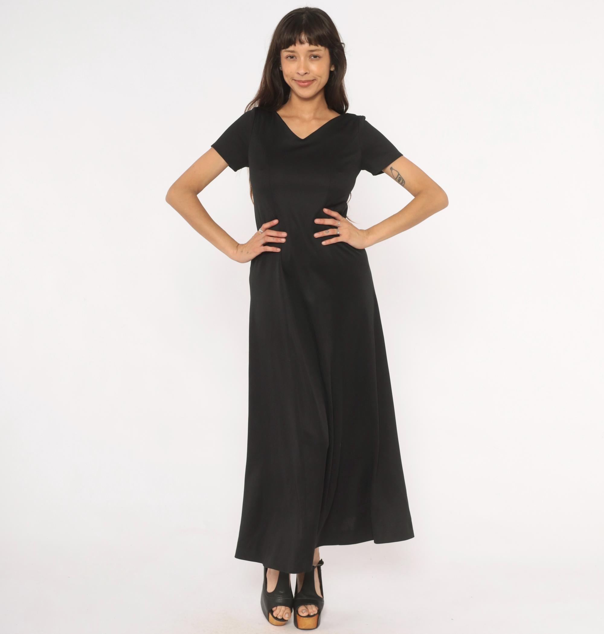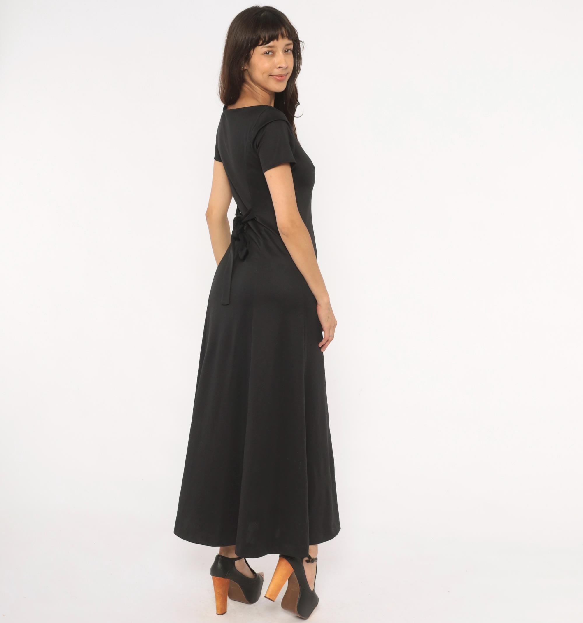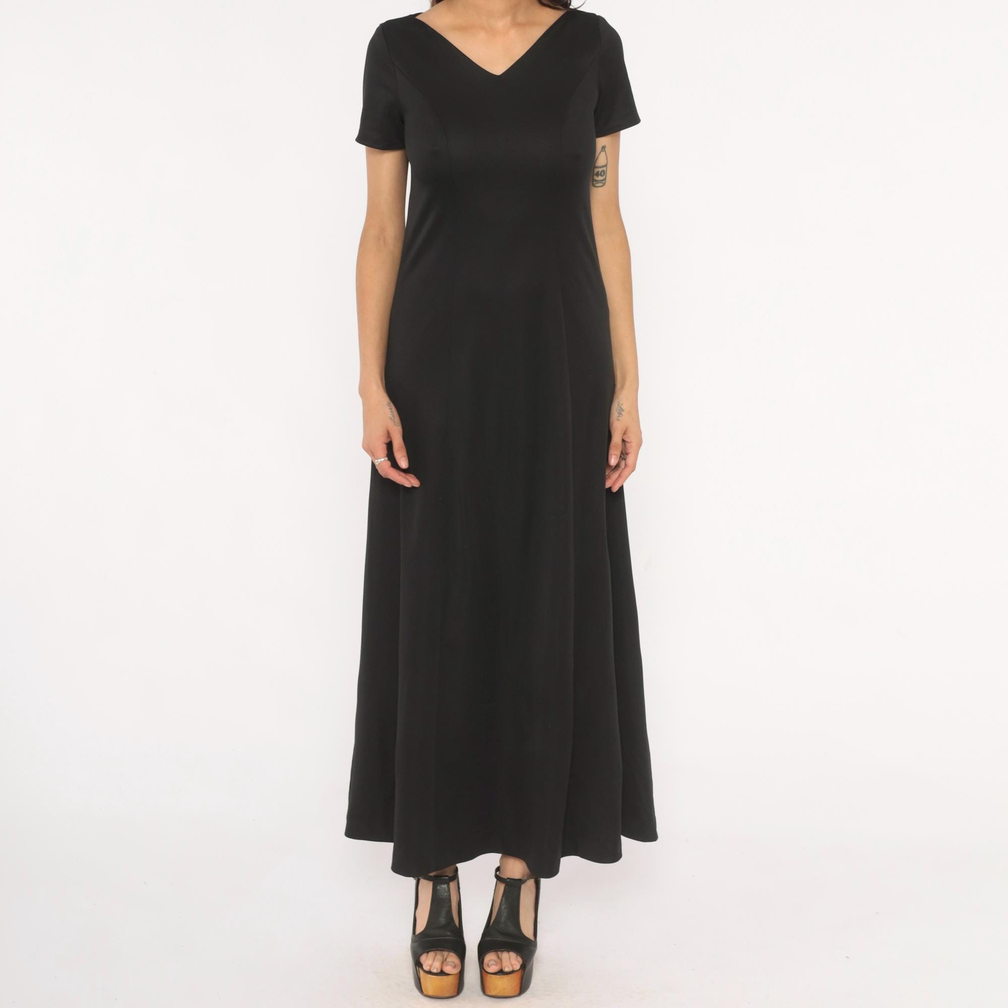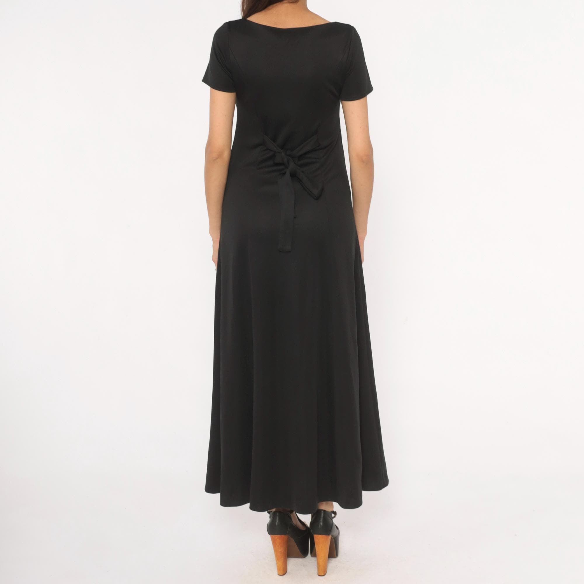 90s black maxi dress from Formal Fashions Inc with a V-neckline and short sleeves. Fitted bodice with princess seaming through the torso, flaring into a full A-line skirt. Tie-back closure at the waist. Ankle-length hem and pullover construction.