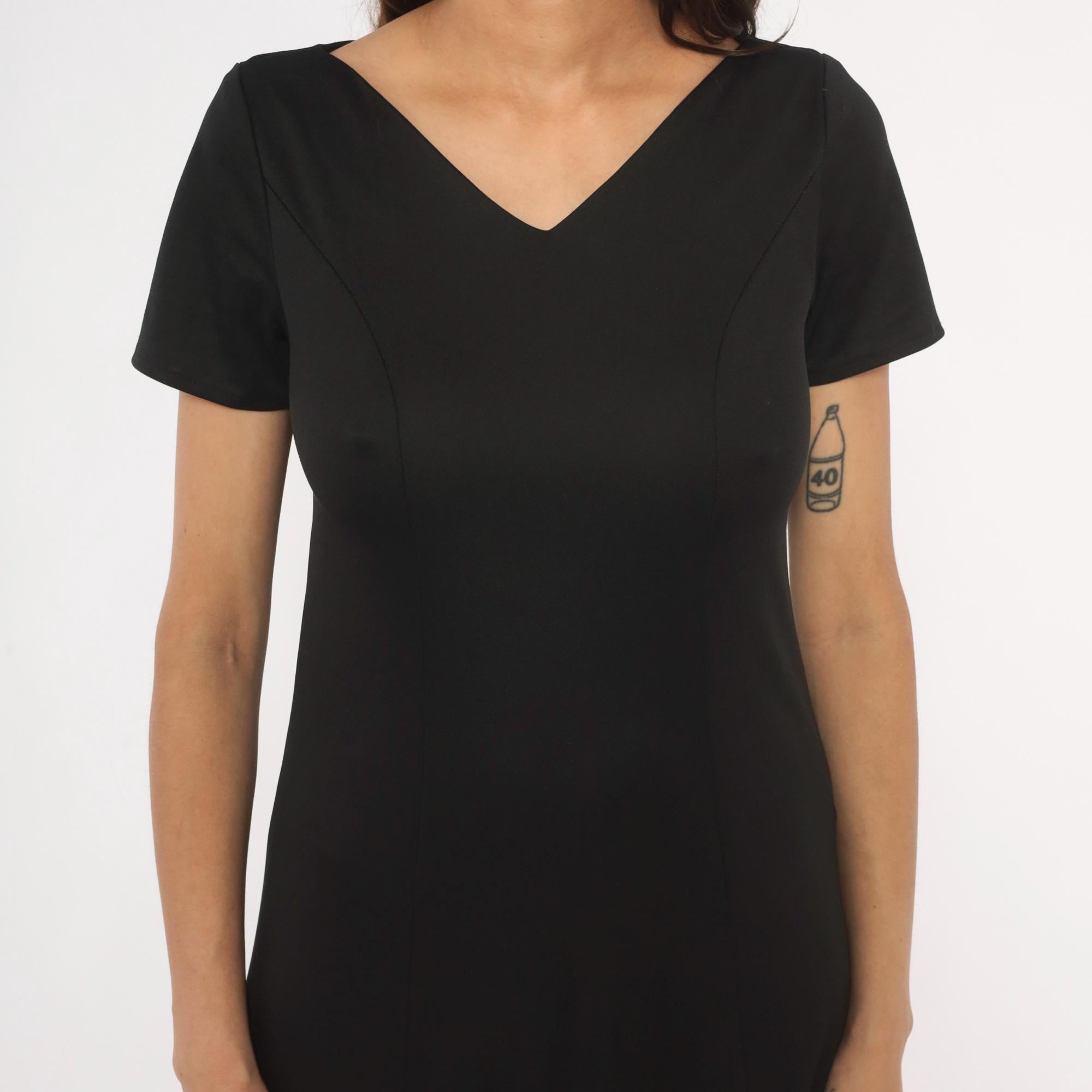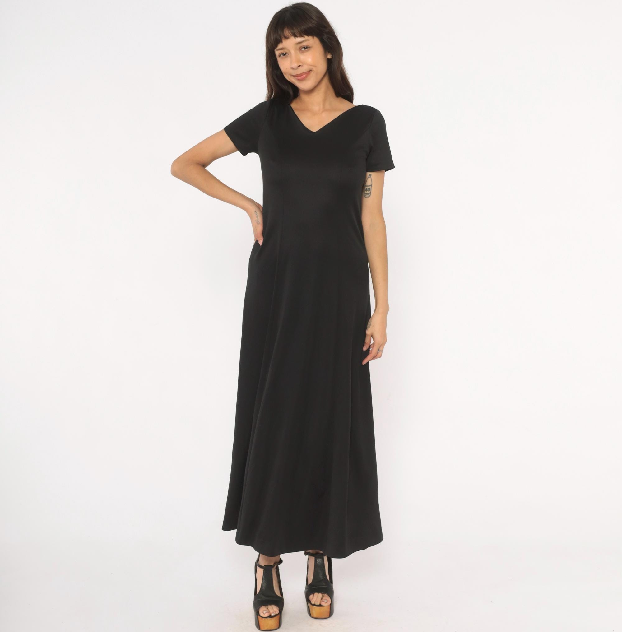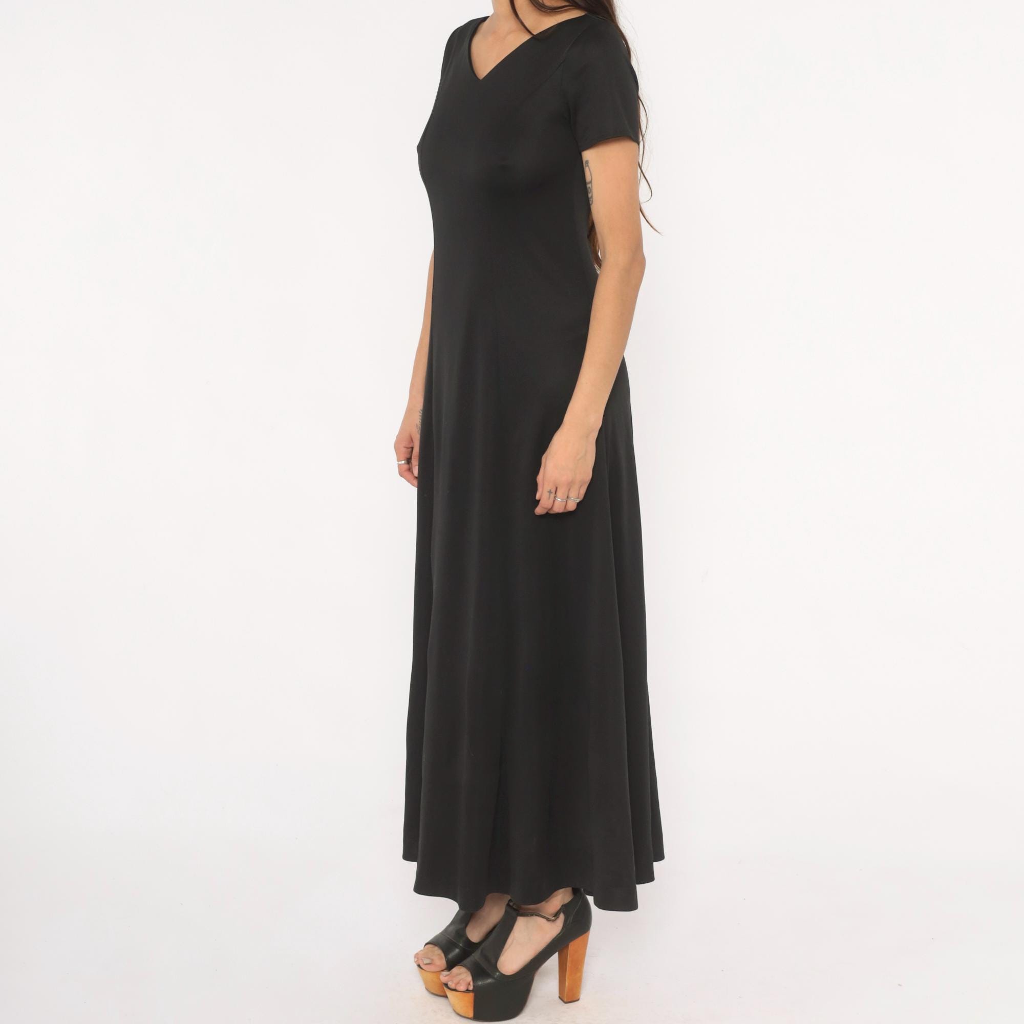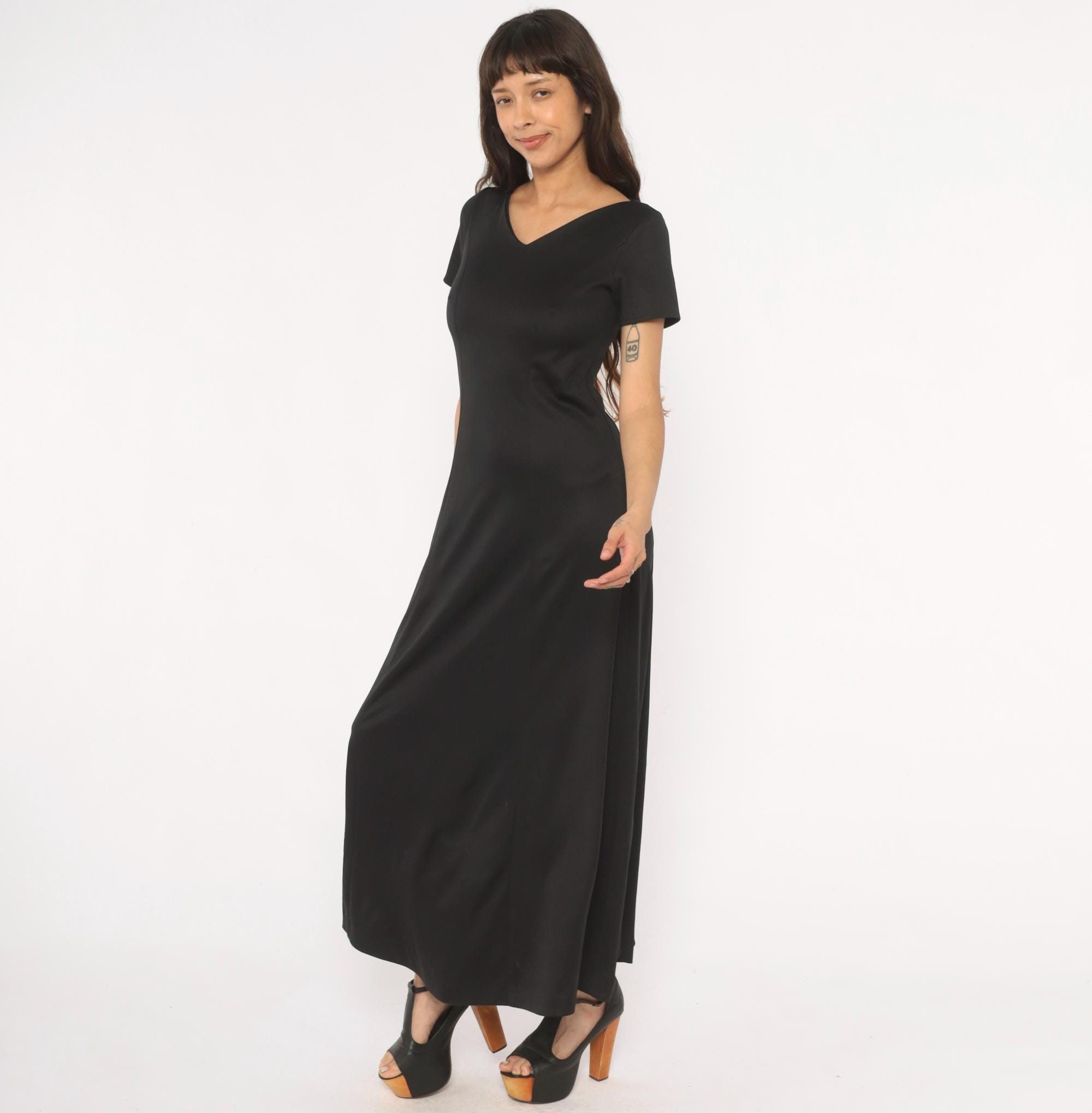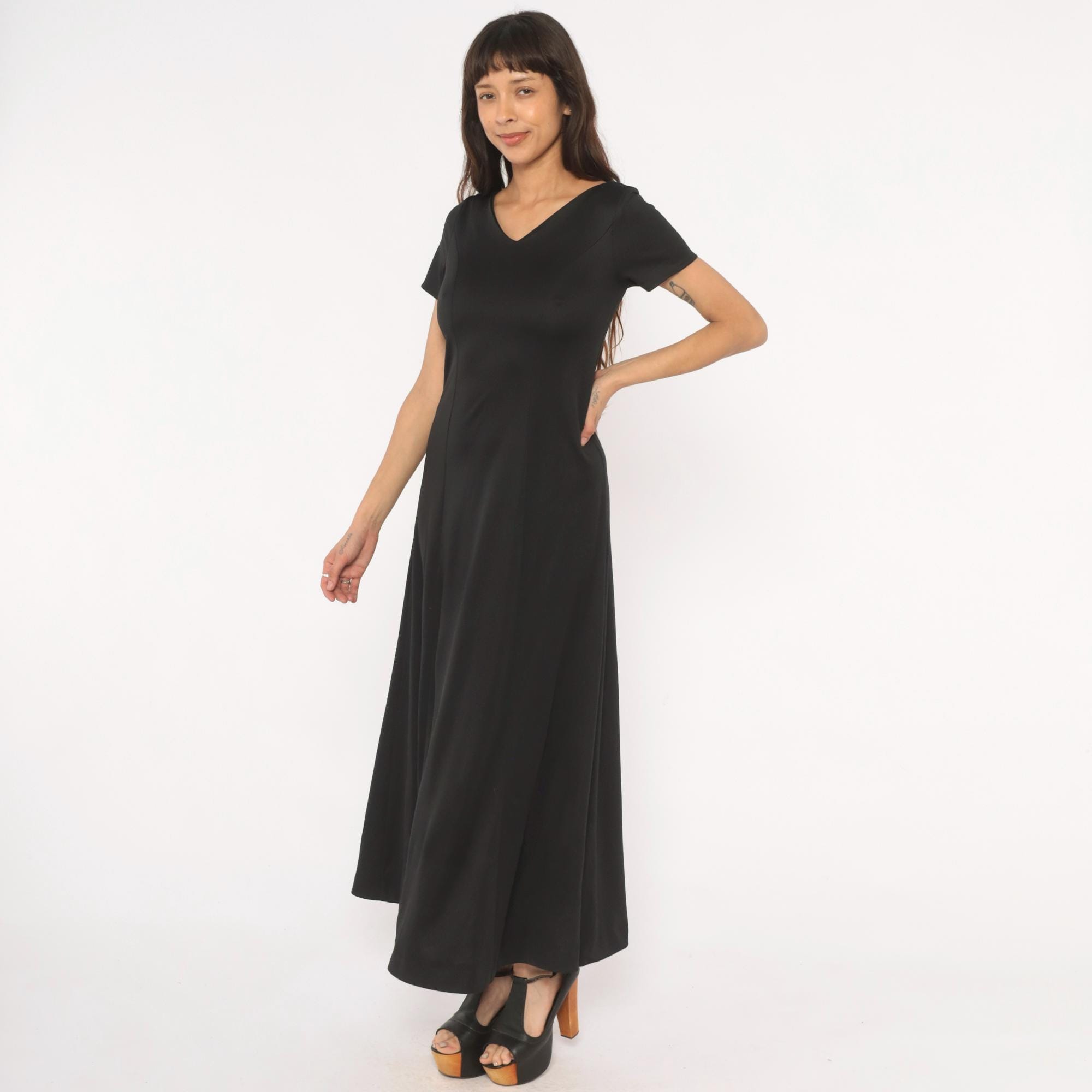 90s black maxi dress from Formal Fashions Inc with a V-neckline and short sleeves. Fitted bodice with princess seaming through the torso, flaring into a full A-line skirt. Tie-back closure at the waist. Ankle-length hem and pullover construction.