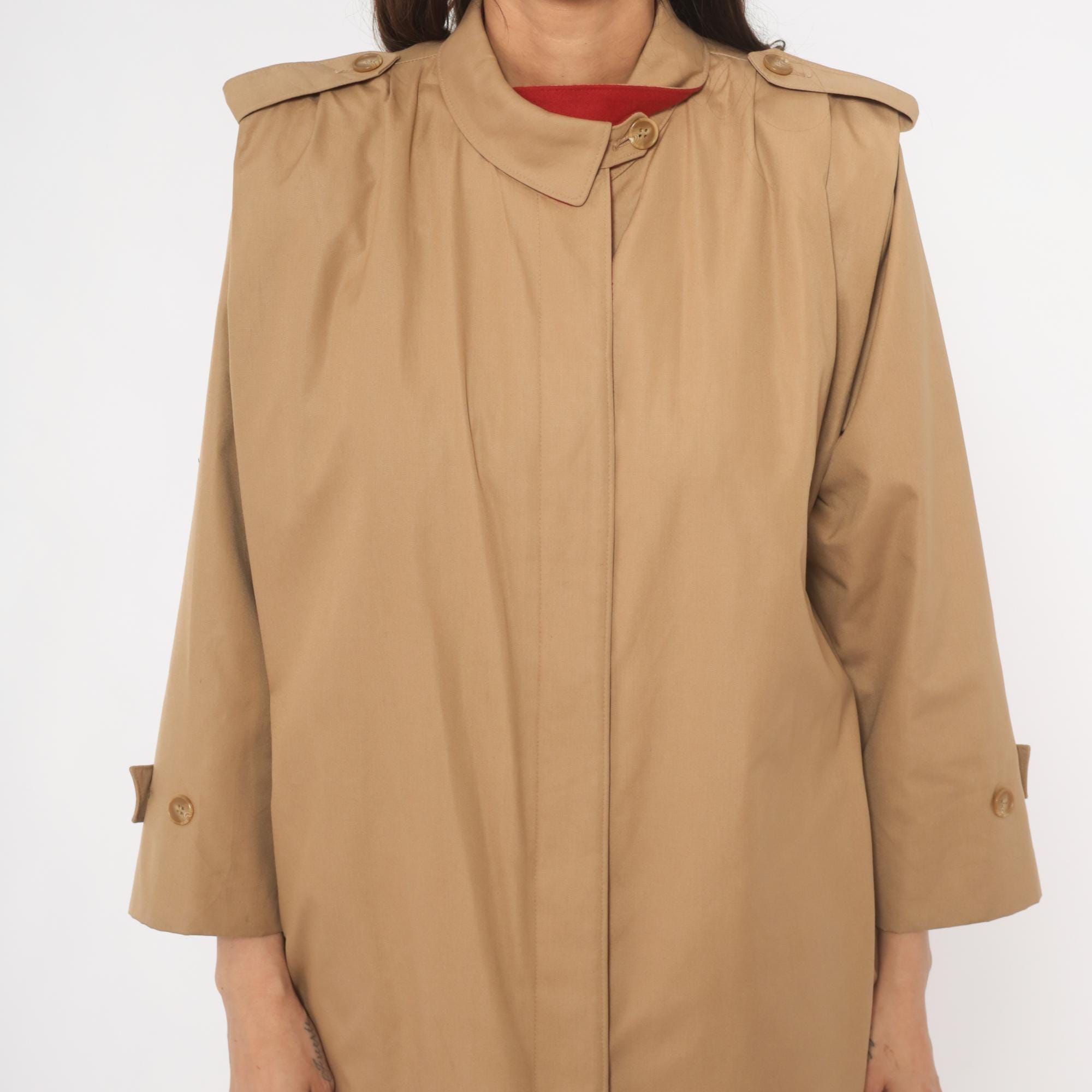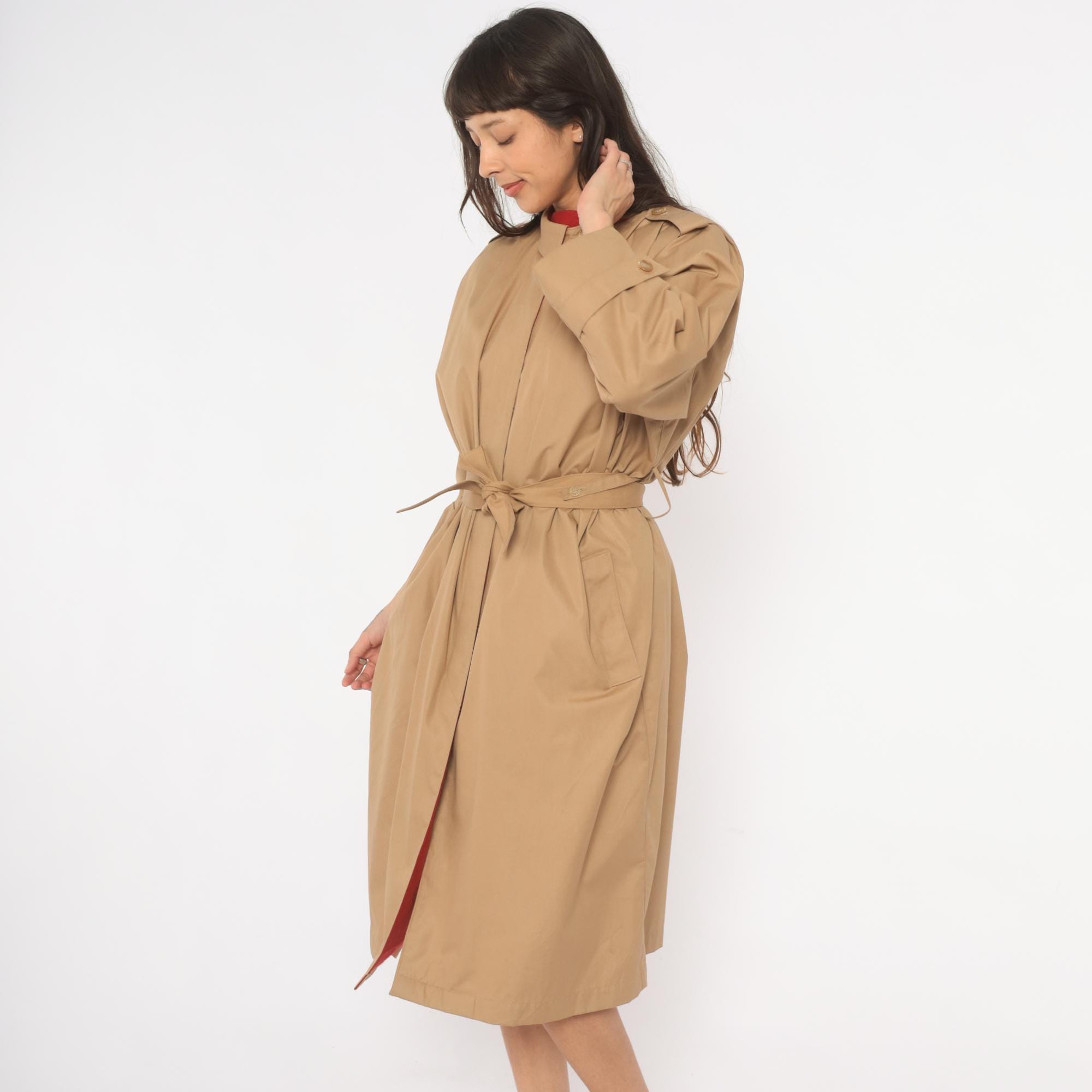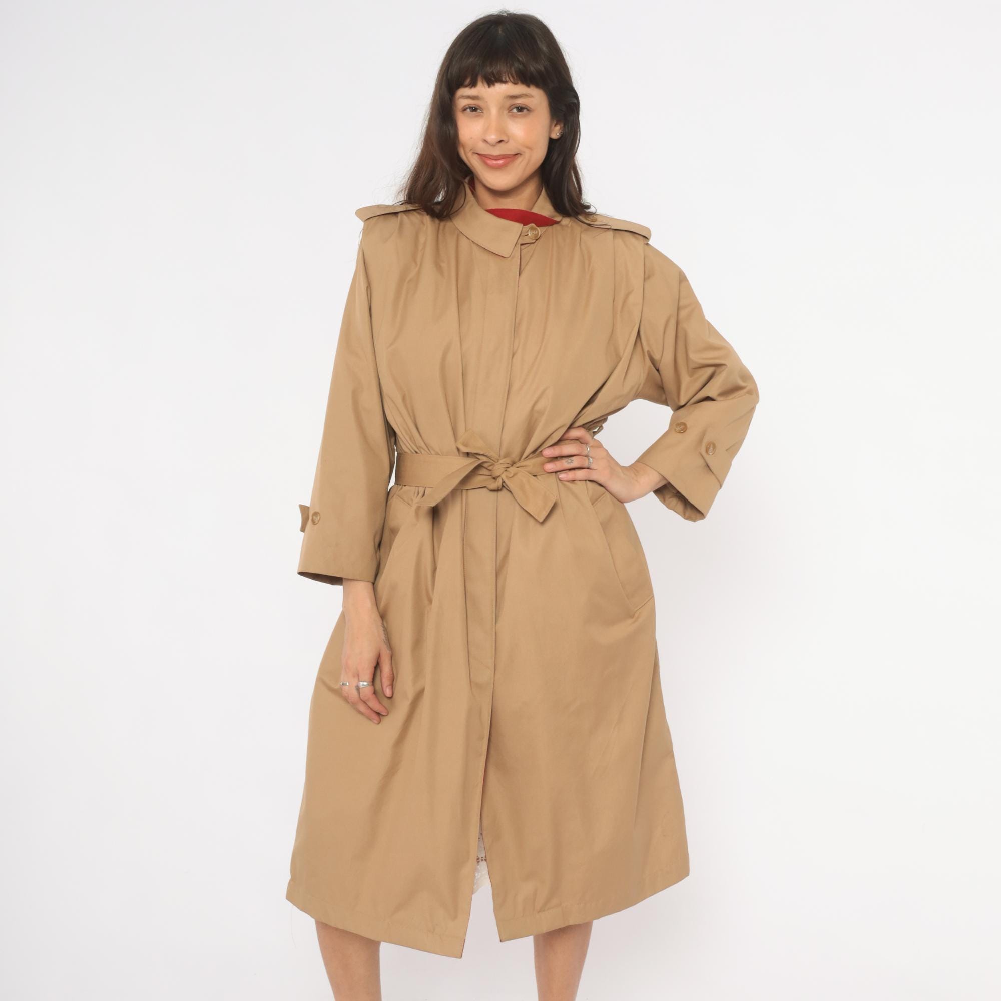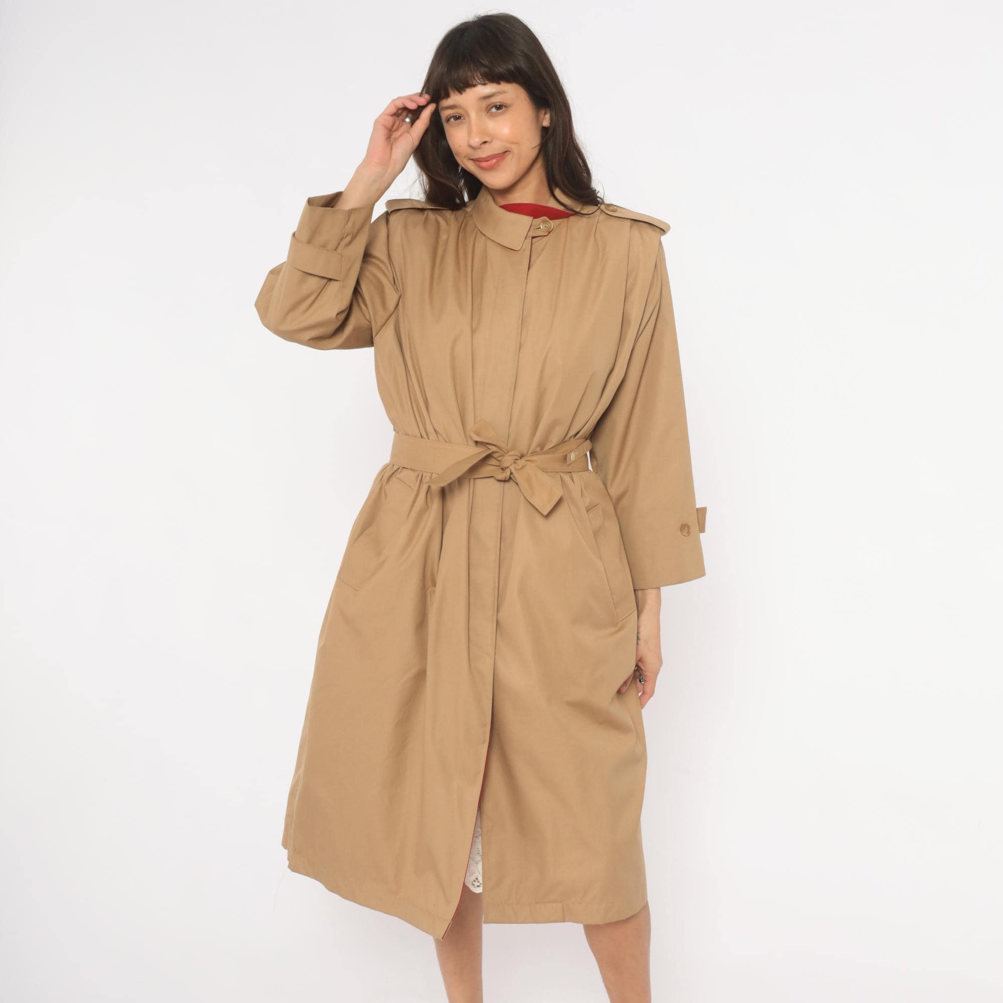 80s tan trench coat with a red fully-lined interior, button front closure hidden by a fly placket, and a matching self-tie waist belt. Epaulettes at each shoulder, buttoned cuff straps at the wrists, and side seam pockets. Pointed fold-down collar with a single throat latch button, knee-length hem.