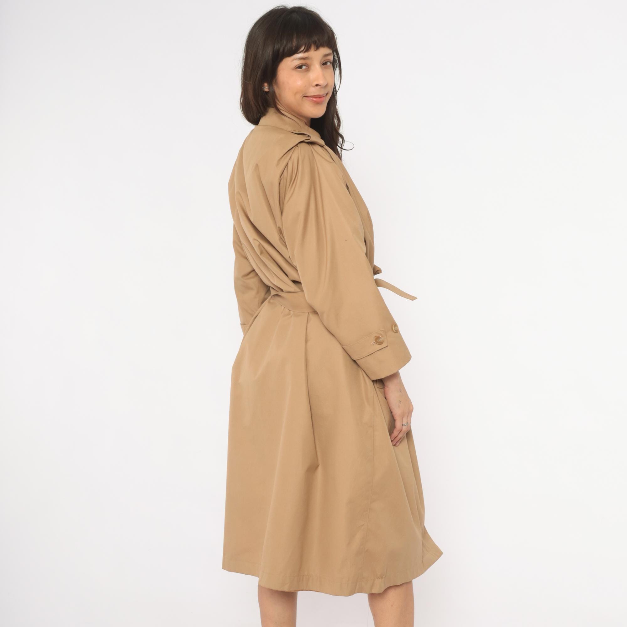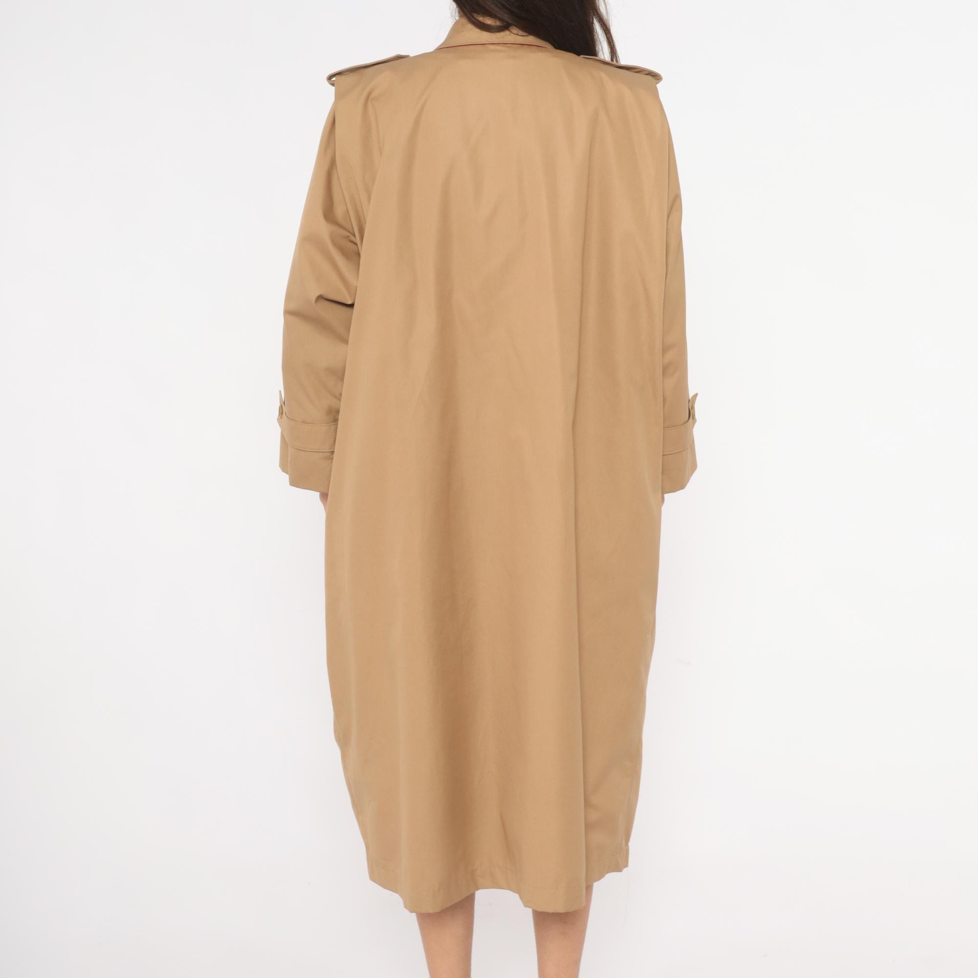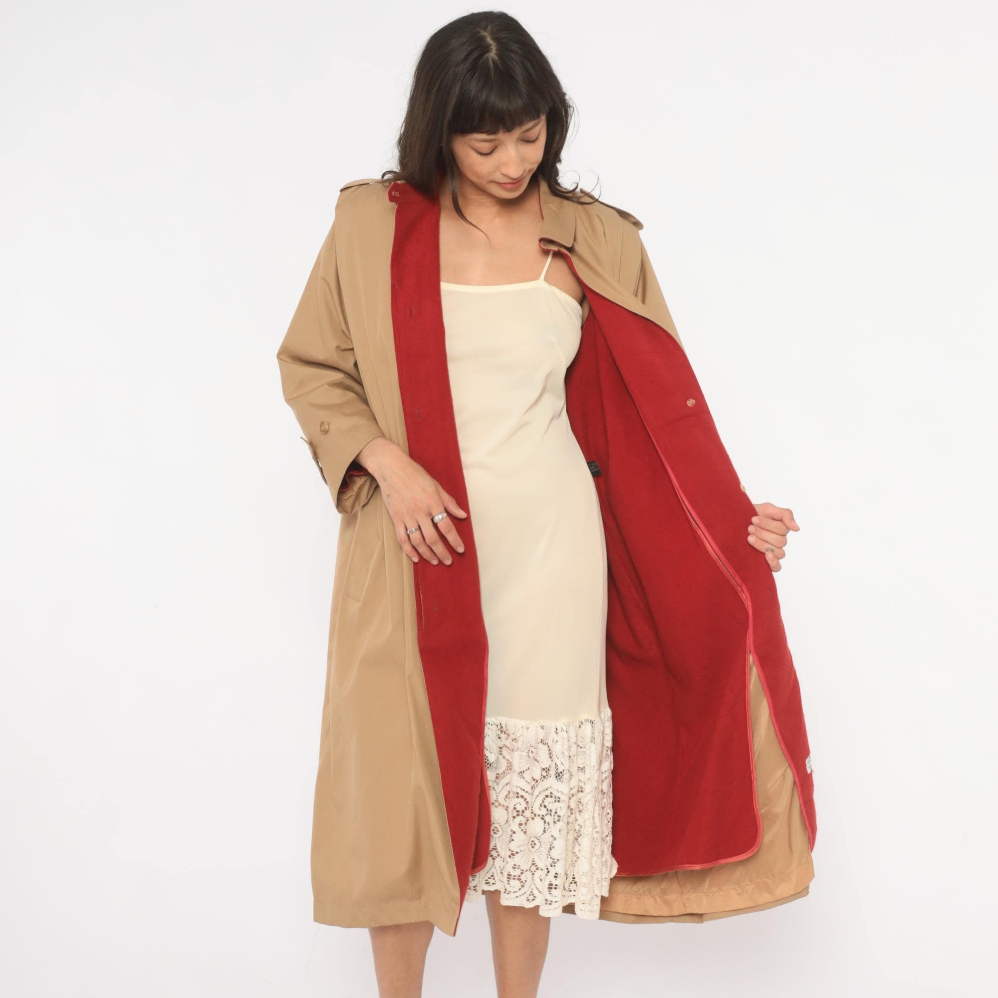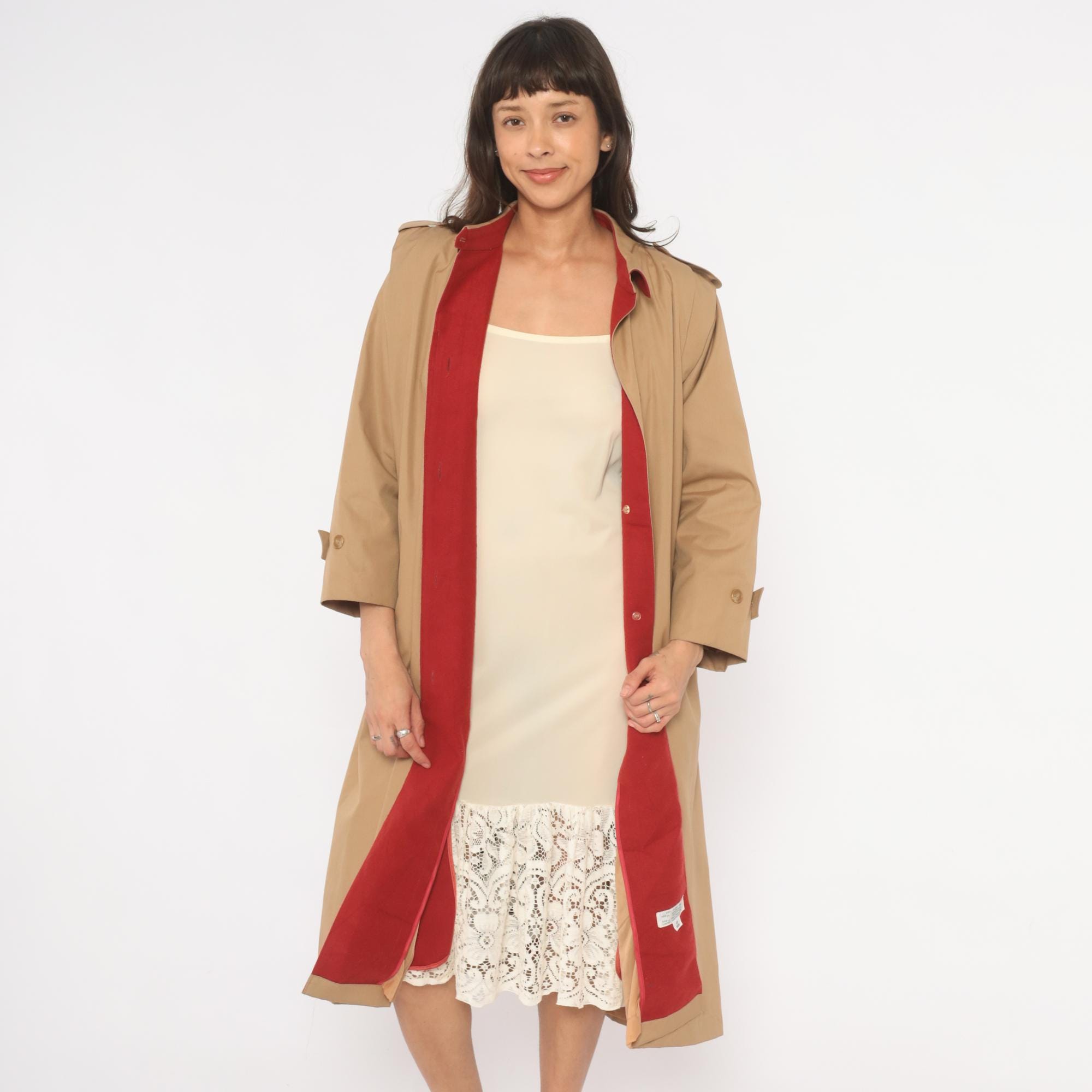 80s tan trench coat with a red fully-lined interior, button front closure hidden by a fly placket, and a matching self-tie waist belt. Epaulettes at each shoulder, buttoned cuff straps at the wrists, and side seam pockets. Pointed fold-down collar with a single throat latch button, knee-length hem.