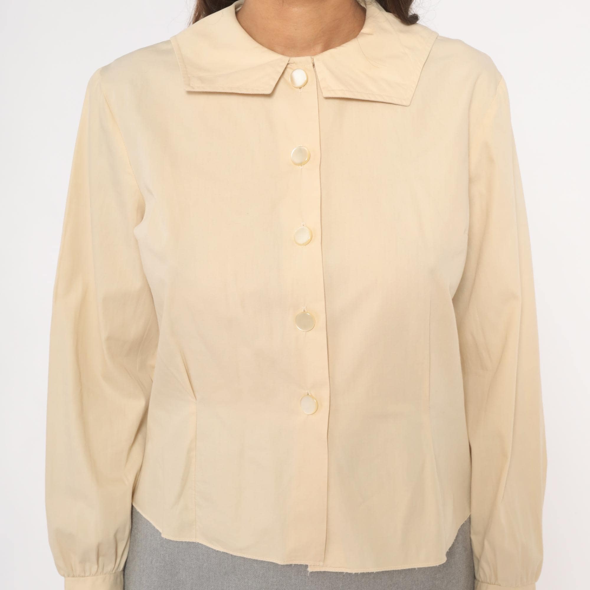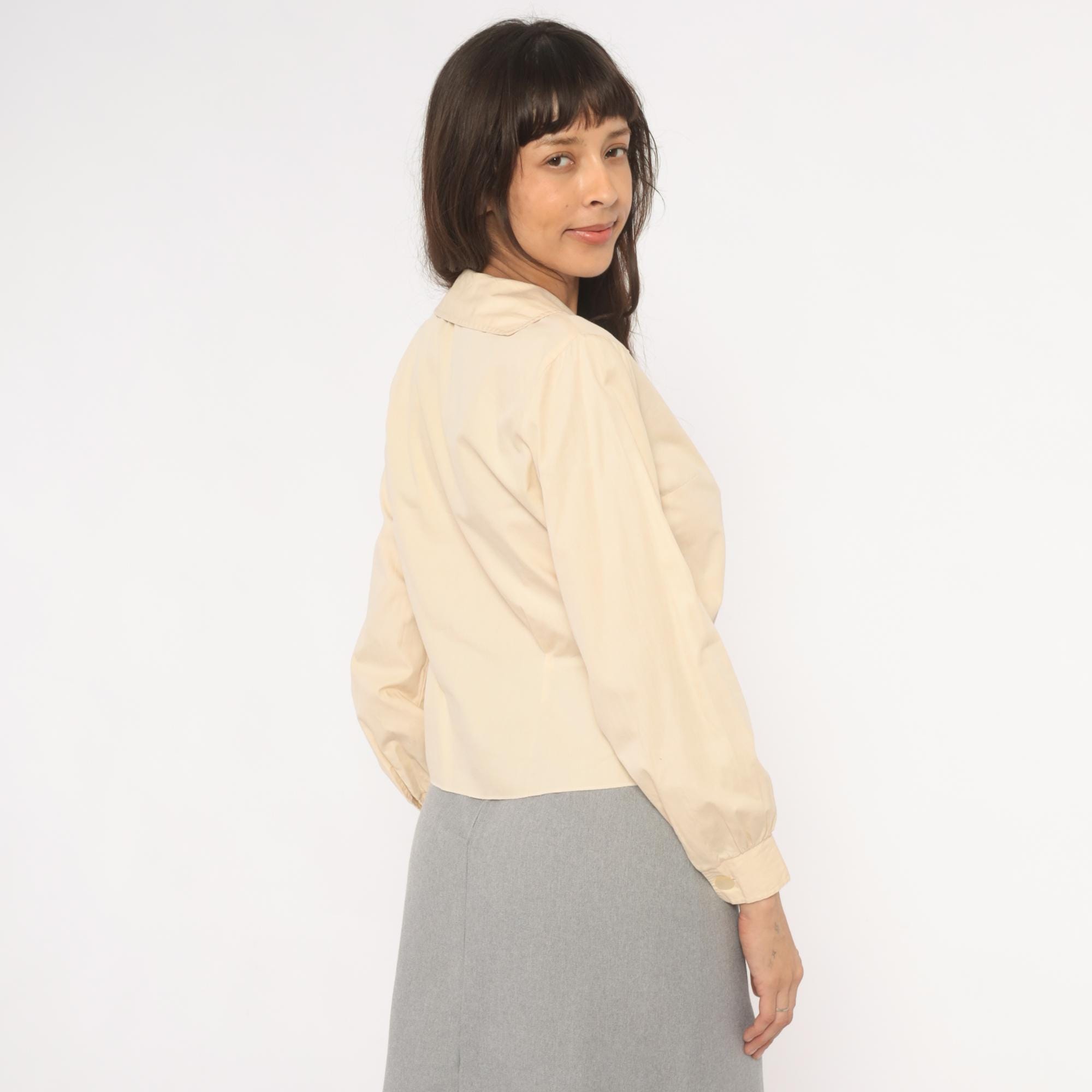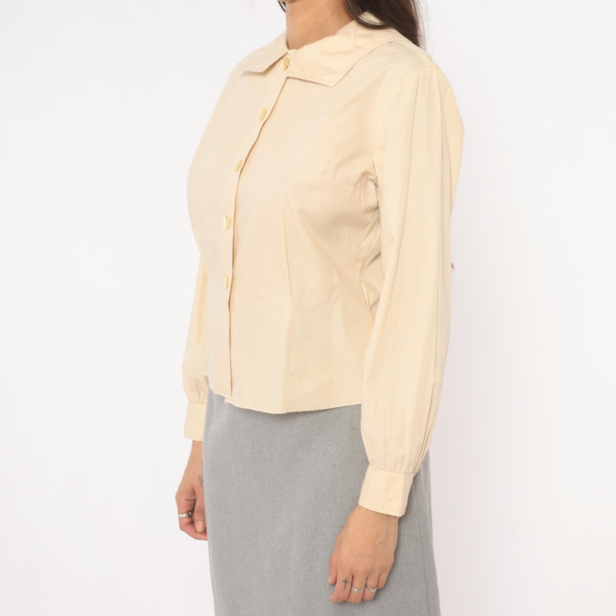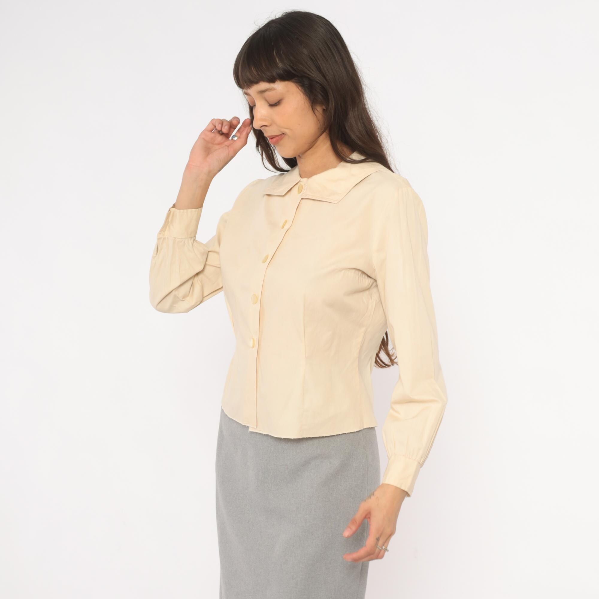 70s cream button front blouse from Fashionalit with a wide pointed collar and five matching buttons down the center placket. Long puff sleeves with gathered shoulders and single-button cuffs. Fitted through the waist with a cropped length.