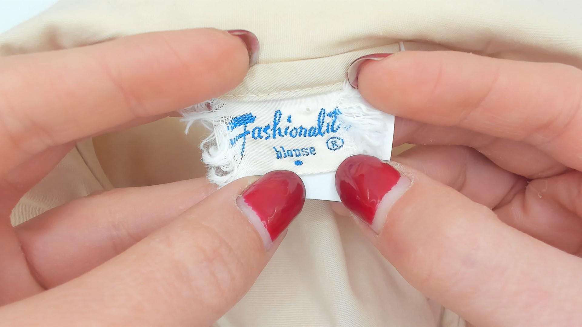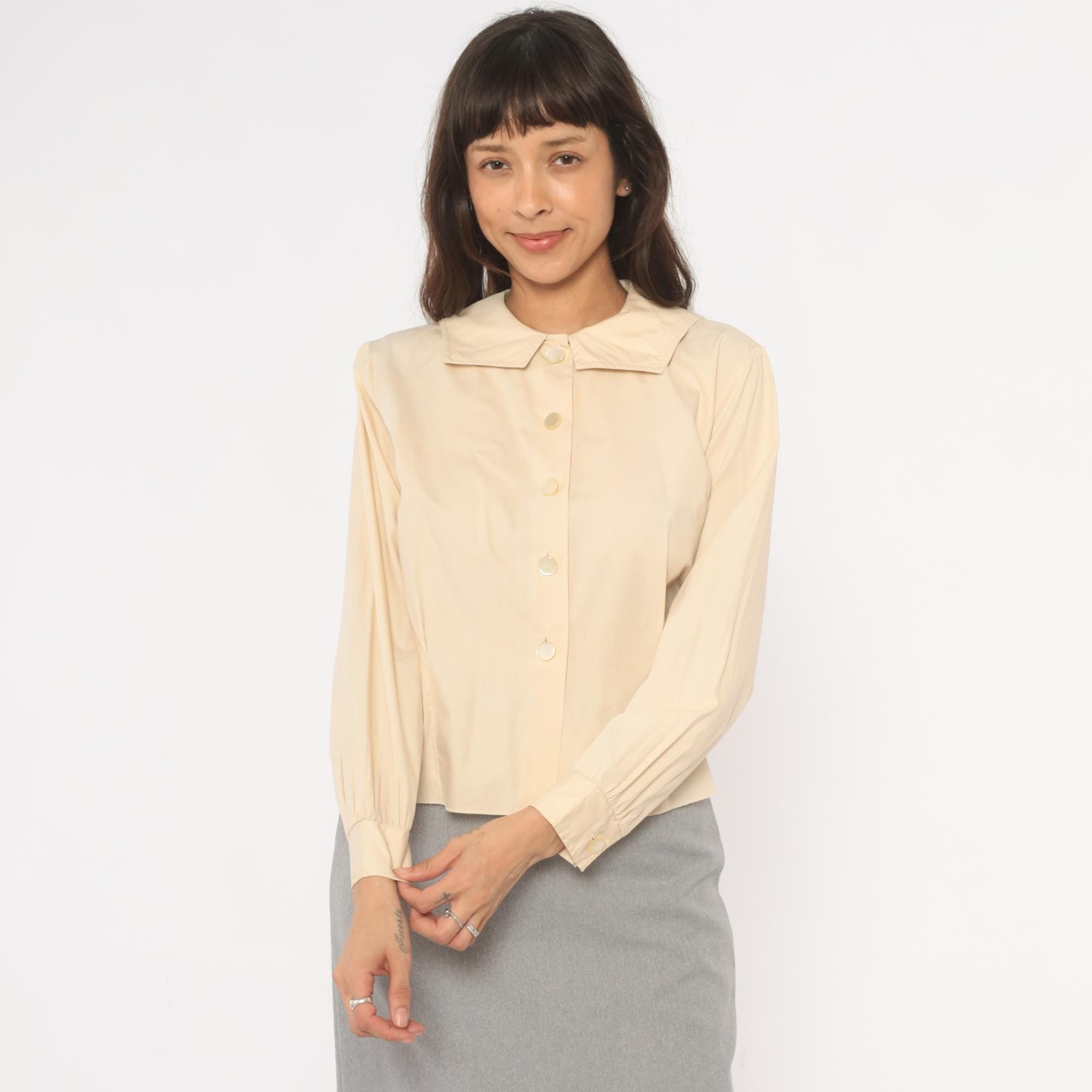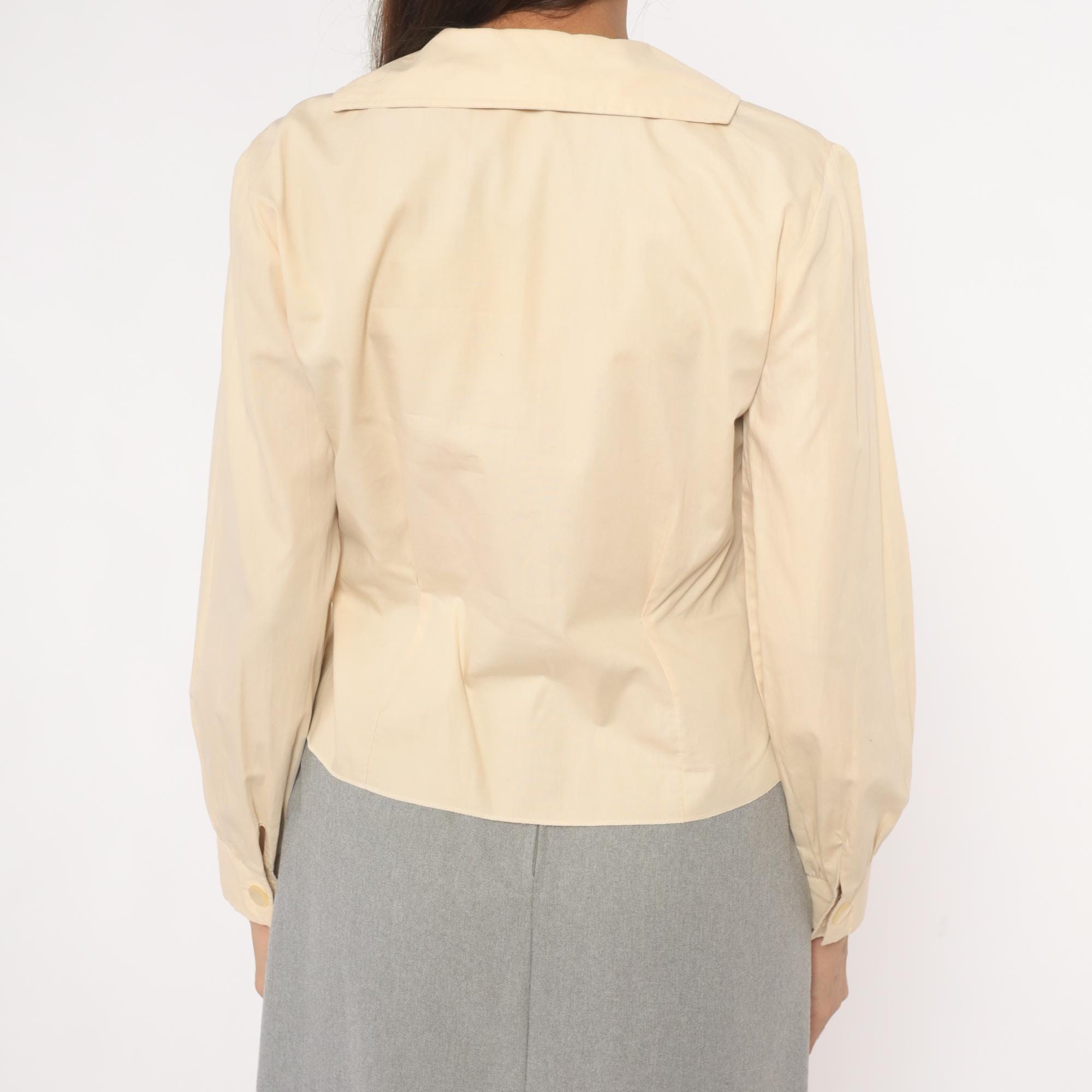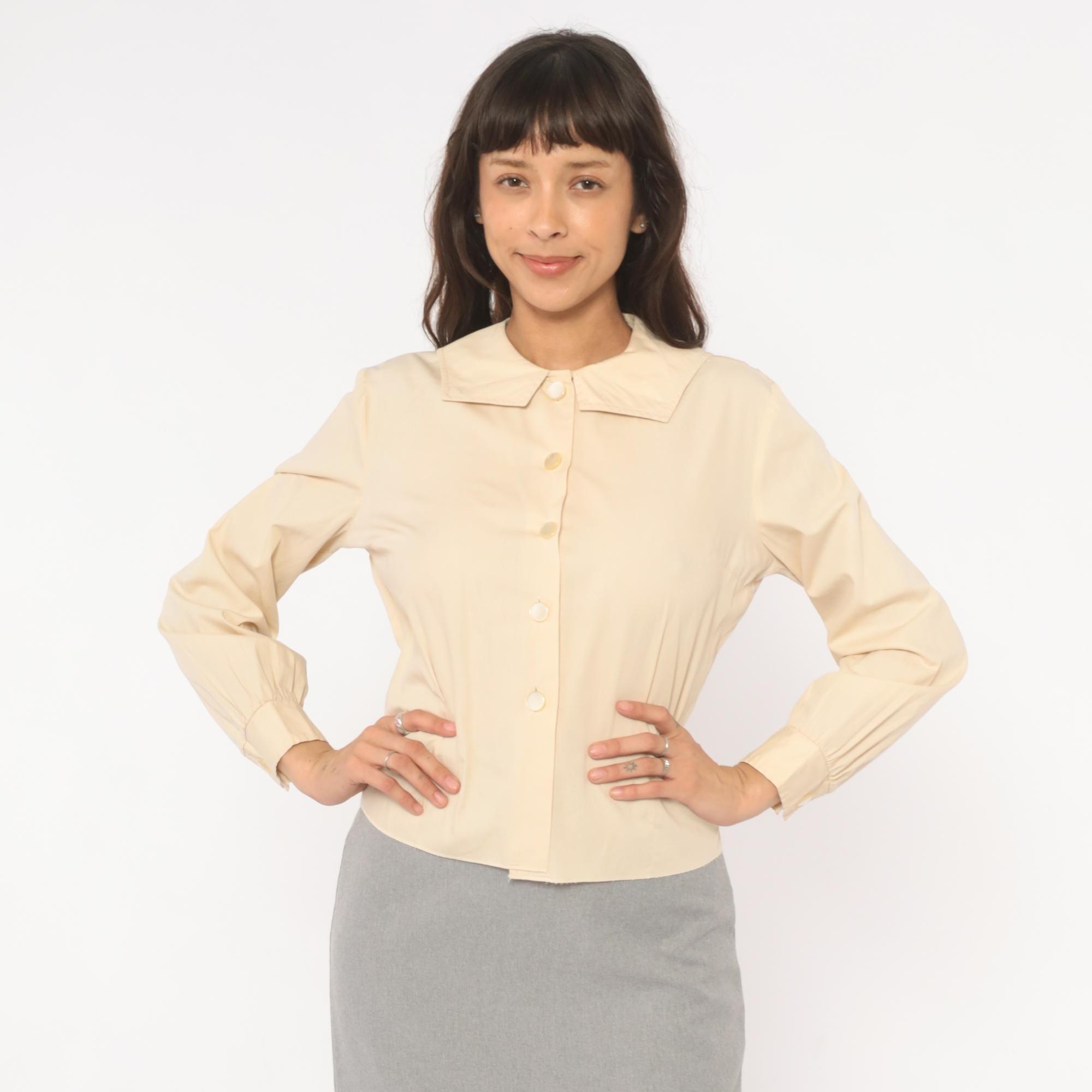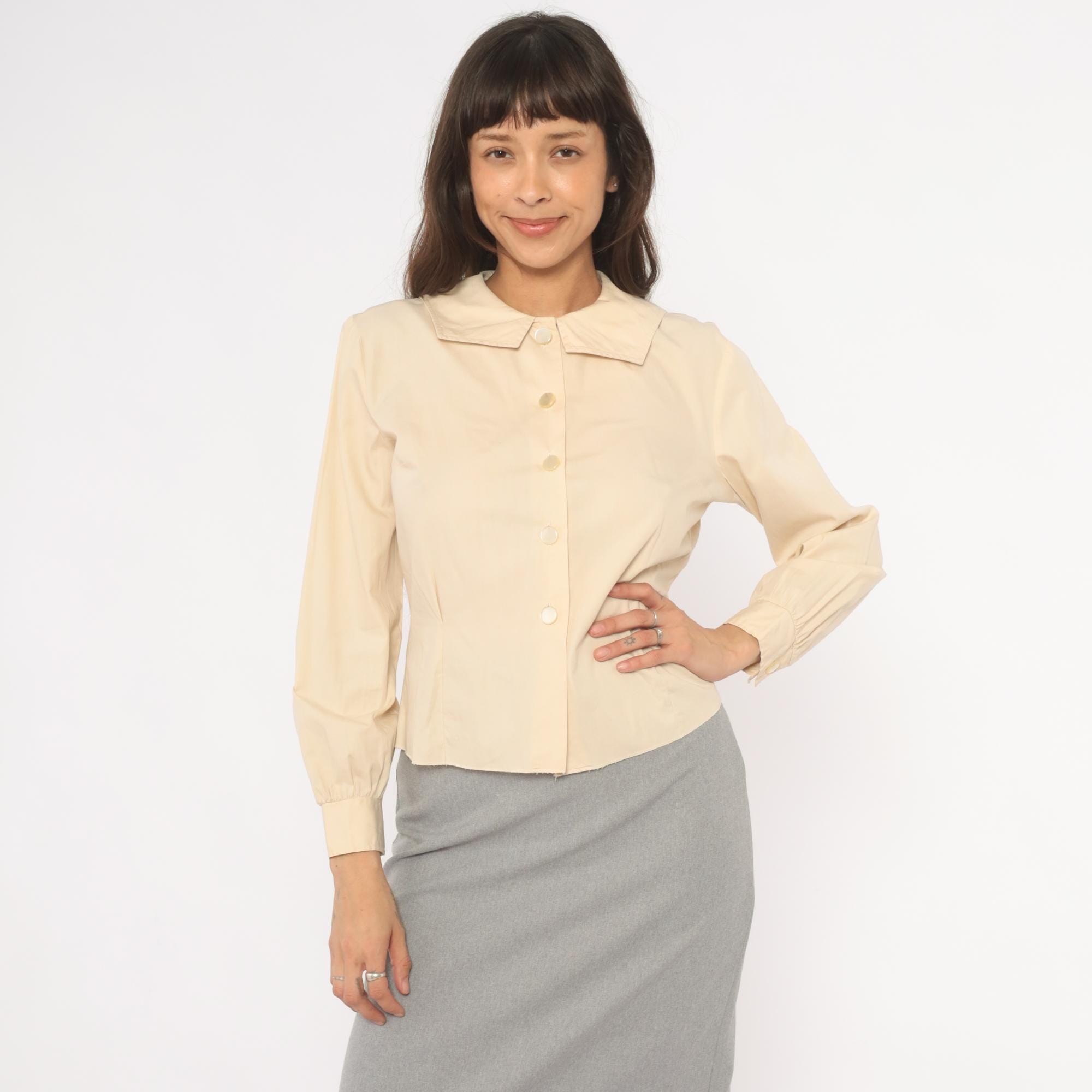 70s cream button front blouse from Fashionalit with a wide pointed collar and five matching buttons down the center placket. Long puff sleeves with gathered shoulders and single-button cuffs. Fitted through the waist with a cropped length.