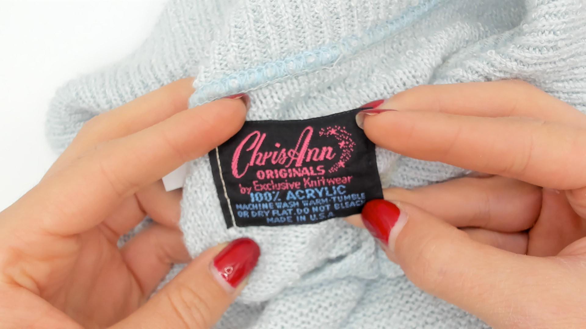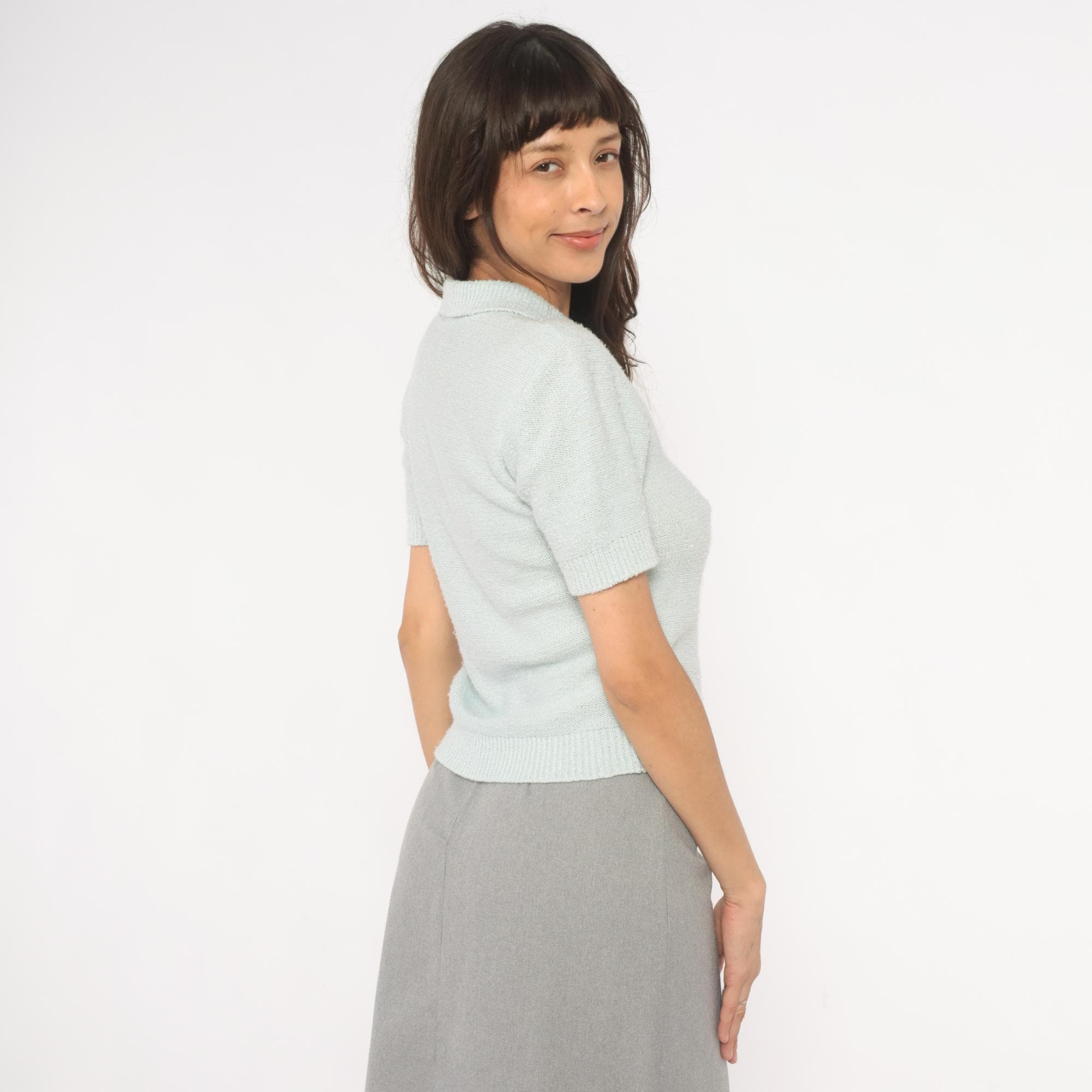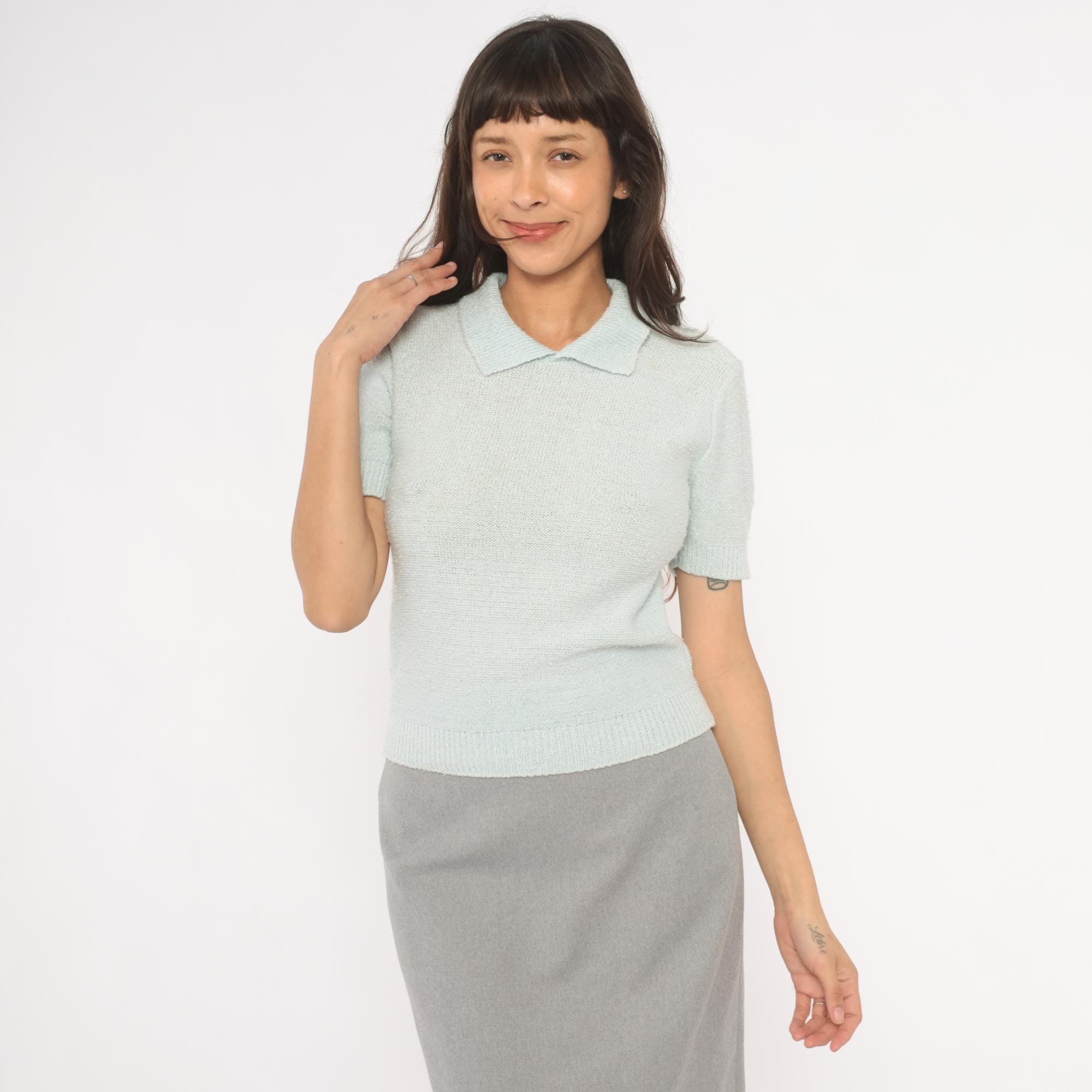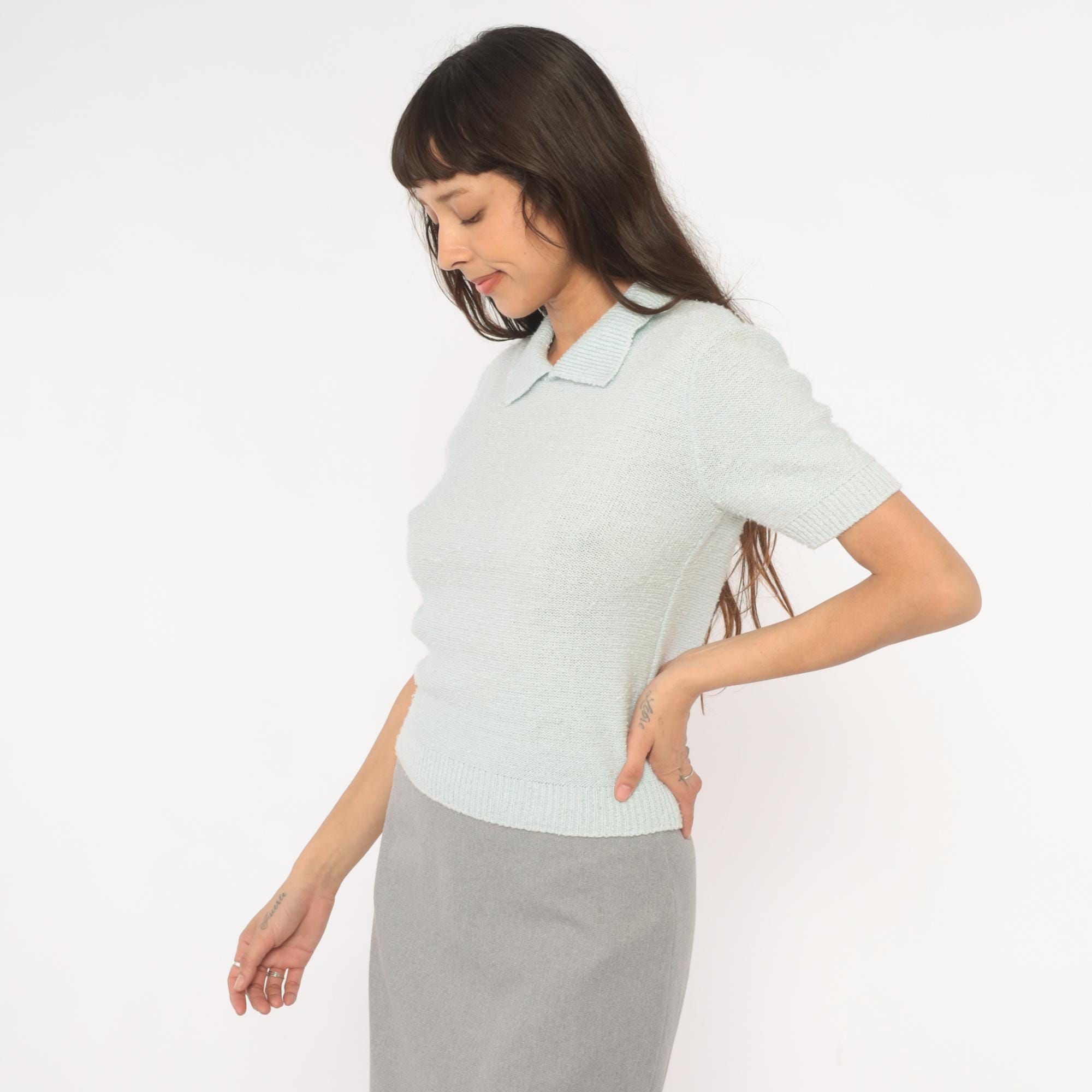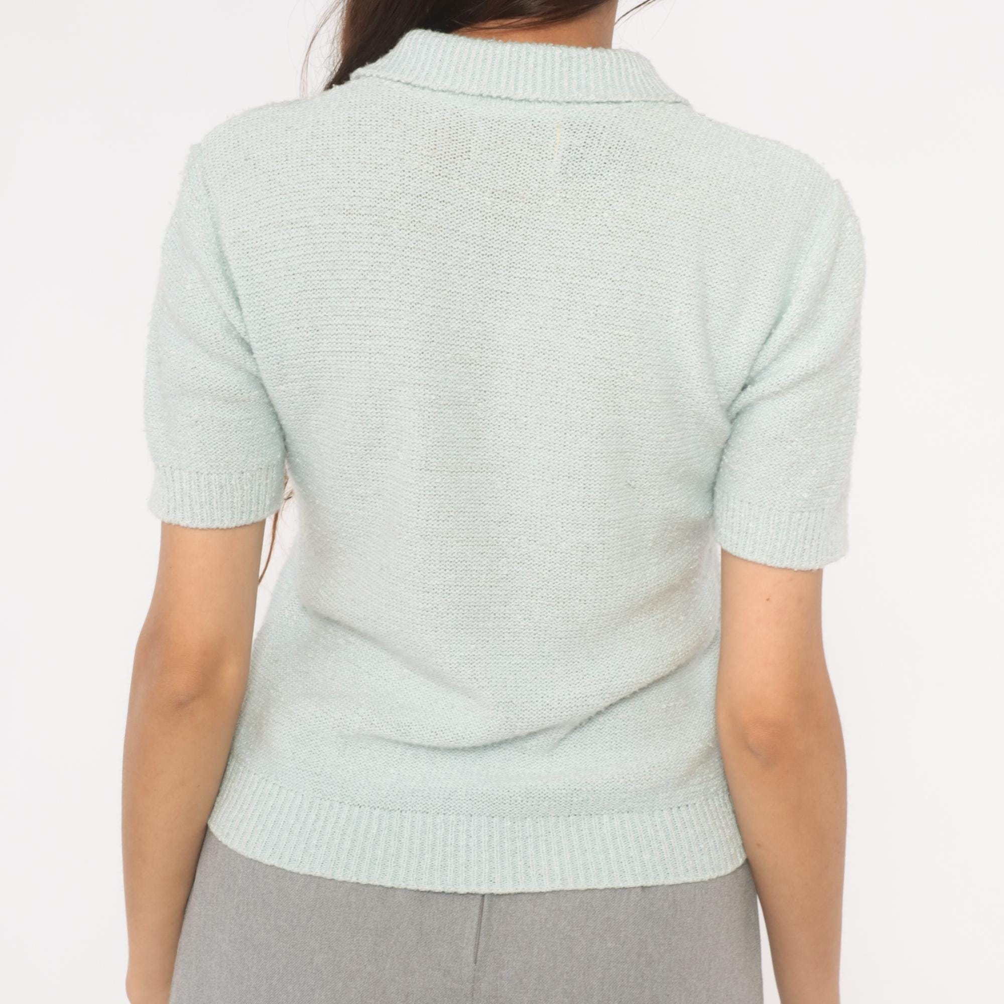 70s mint knit polo from Chris Ann with a flat spread collar and open V neckline. Short sleeves with ribbed cuffs and a matching ribbed hem at the waist. Semi-sheer stockinette stitch body in a pale ice blue, fitted through the torso with a pullover construction and no closures.