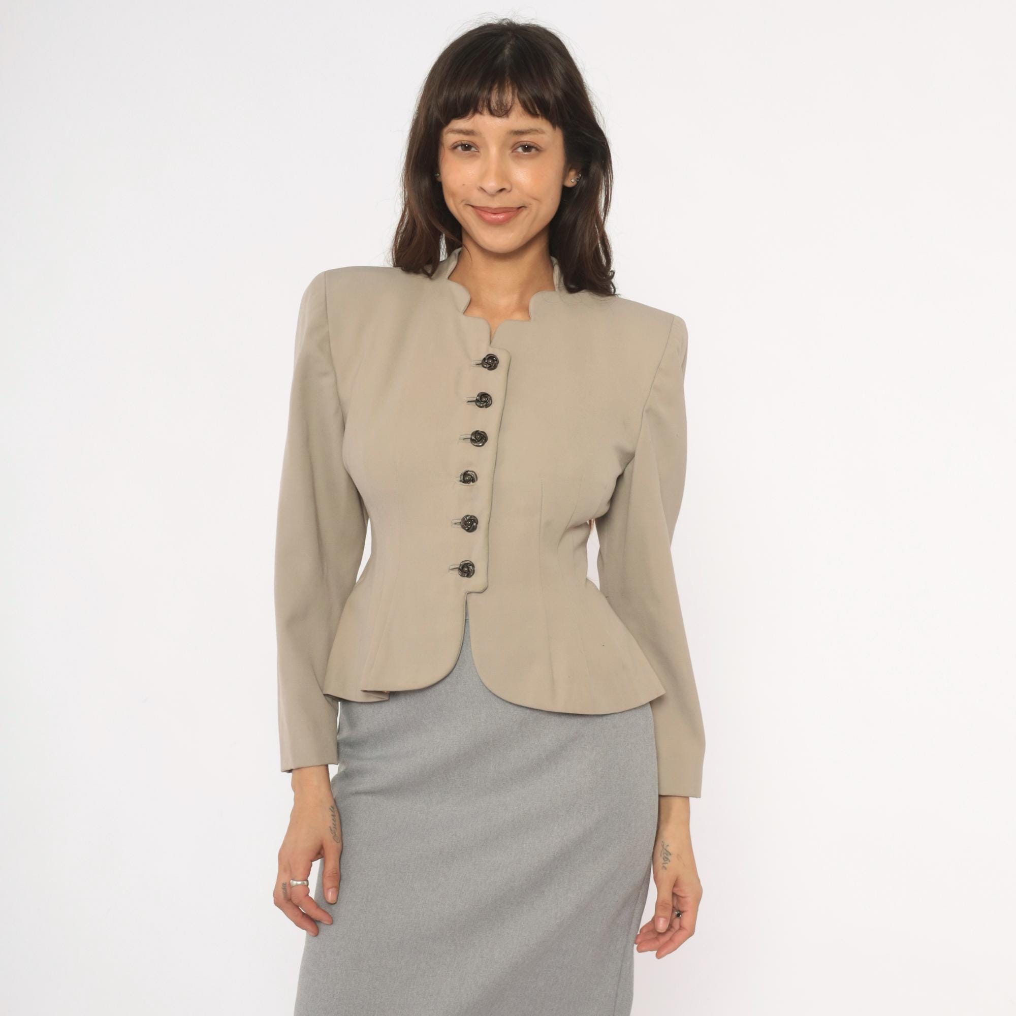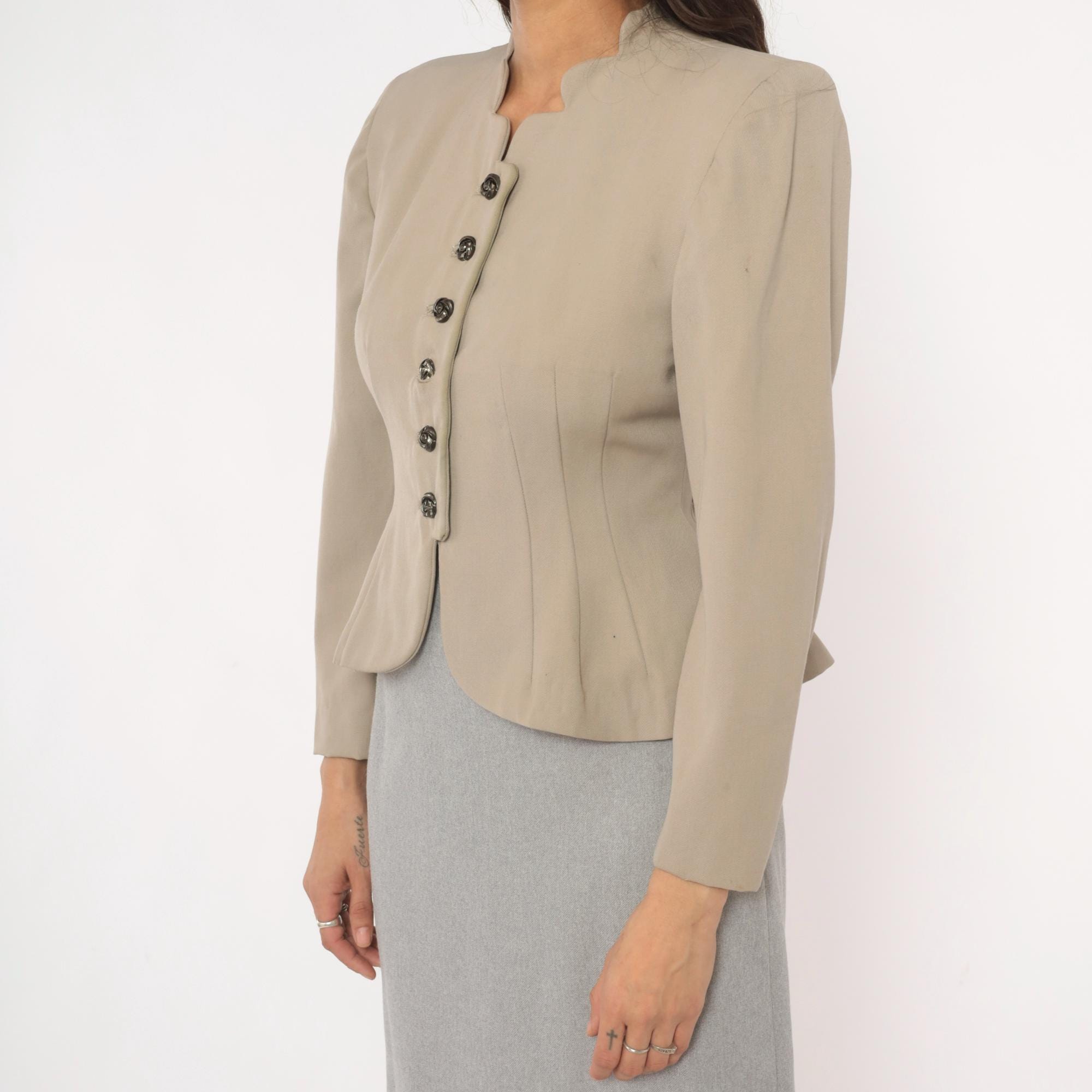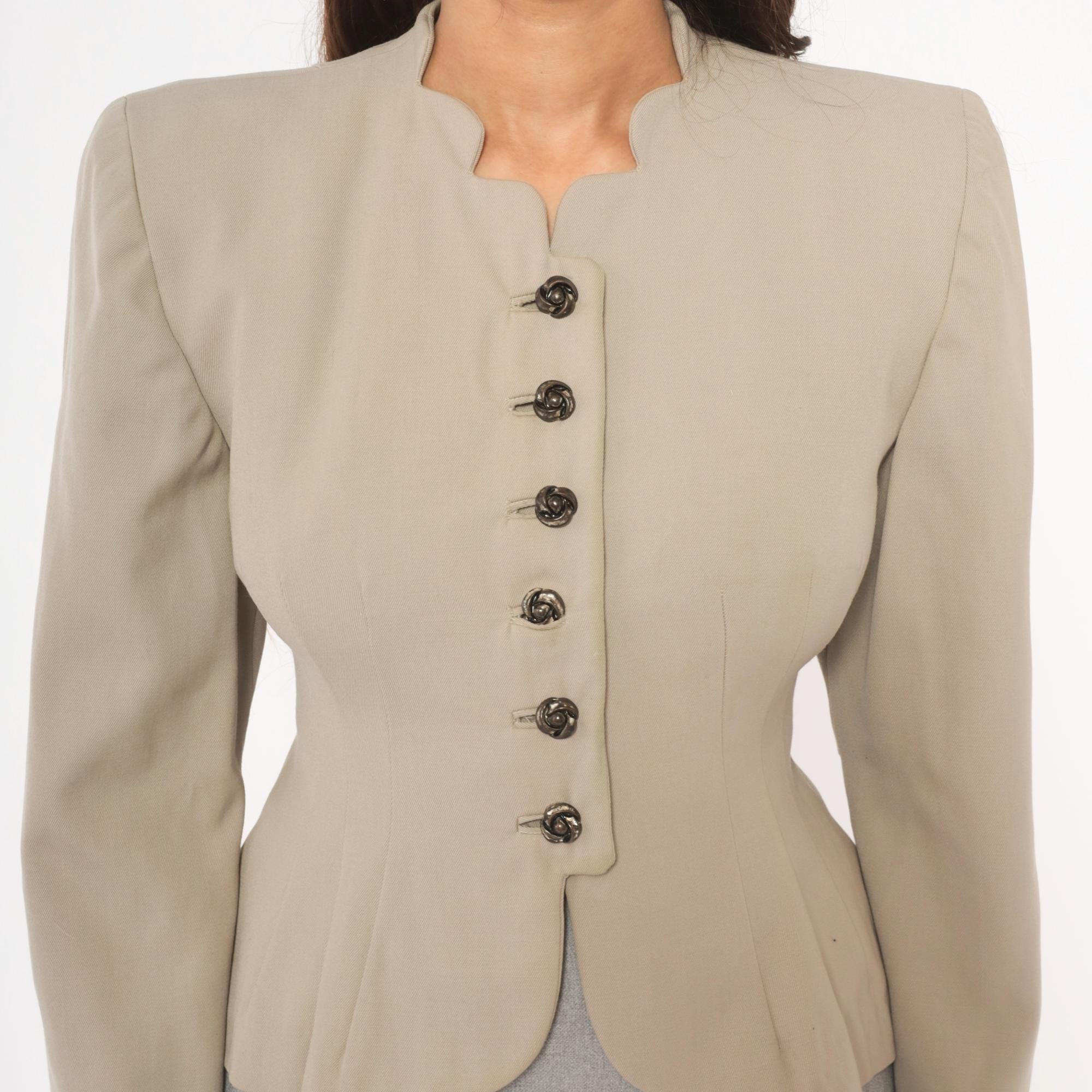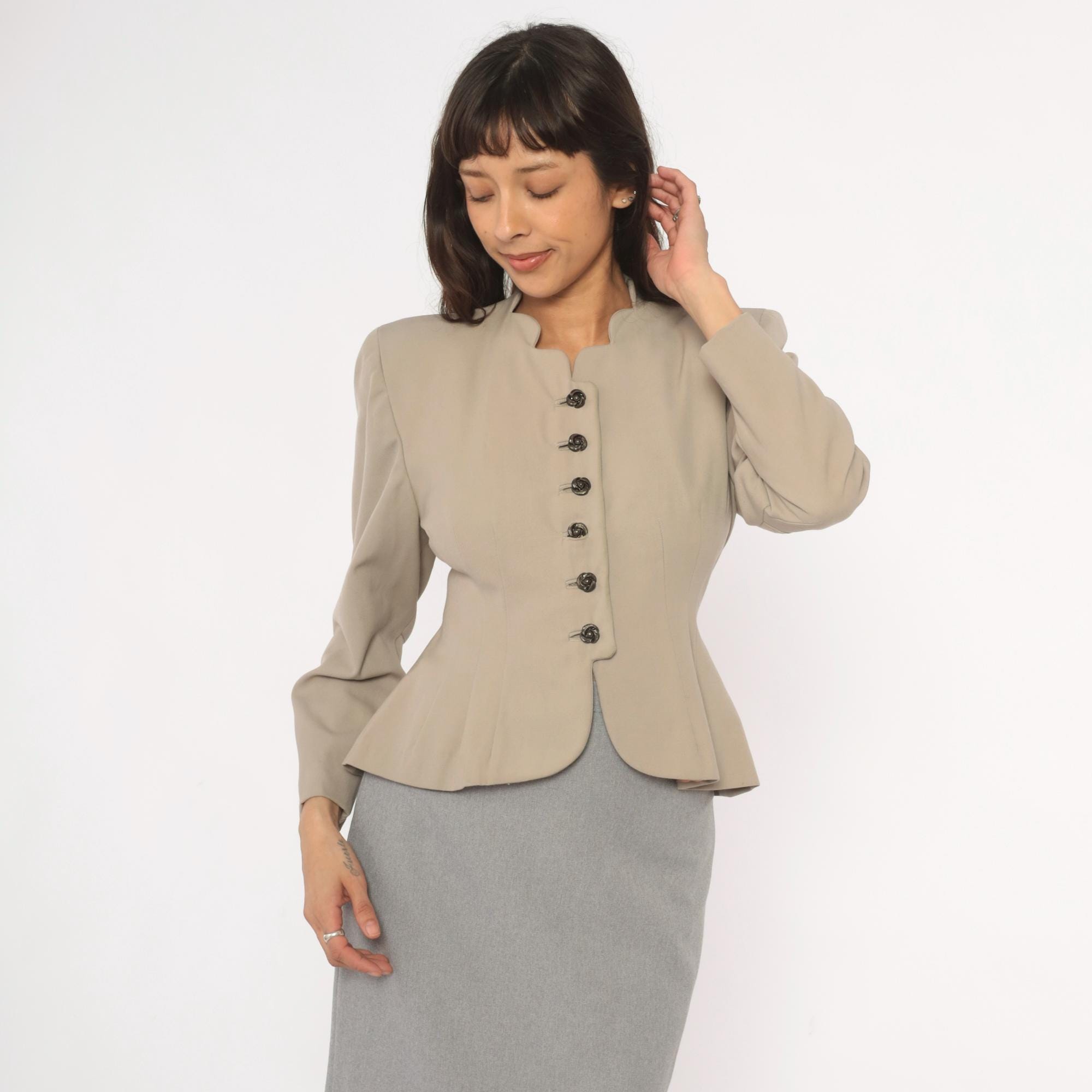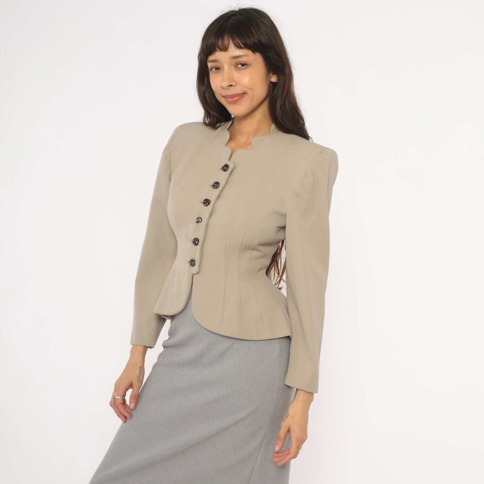 1950s taupe blazer from Betty Fashions with a scalloped split neckline and six ornate swirl-design metal buttons down the front. Fitted bodice with princess seaming, nipped waist, and pleated peplum flare at the back hem. Long sleeves, collarless mandarin-style neckband, and curved scalloped hemline.