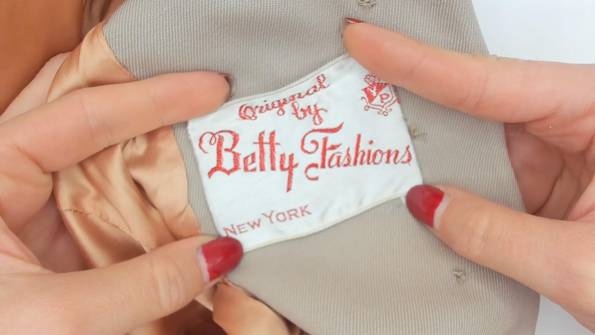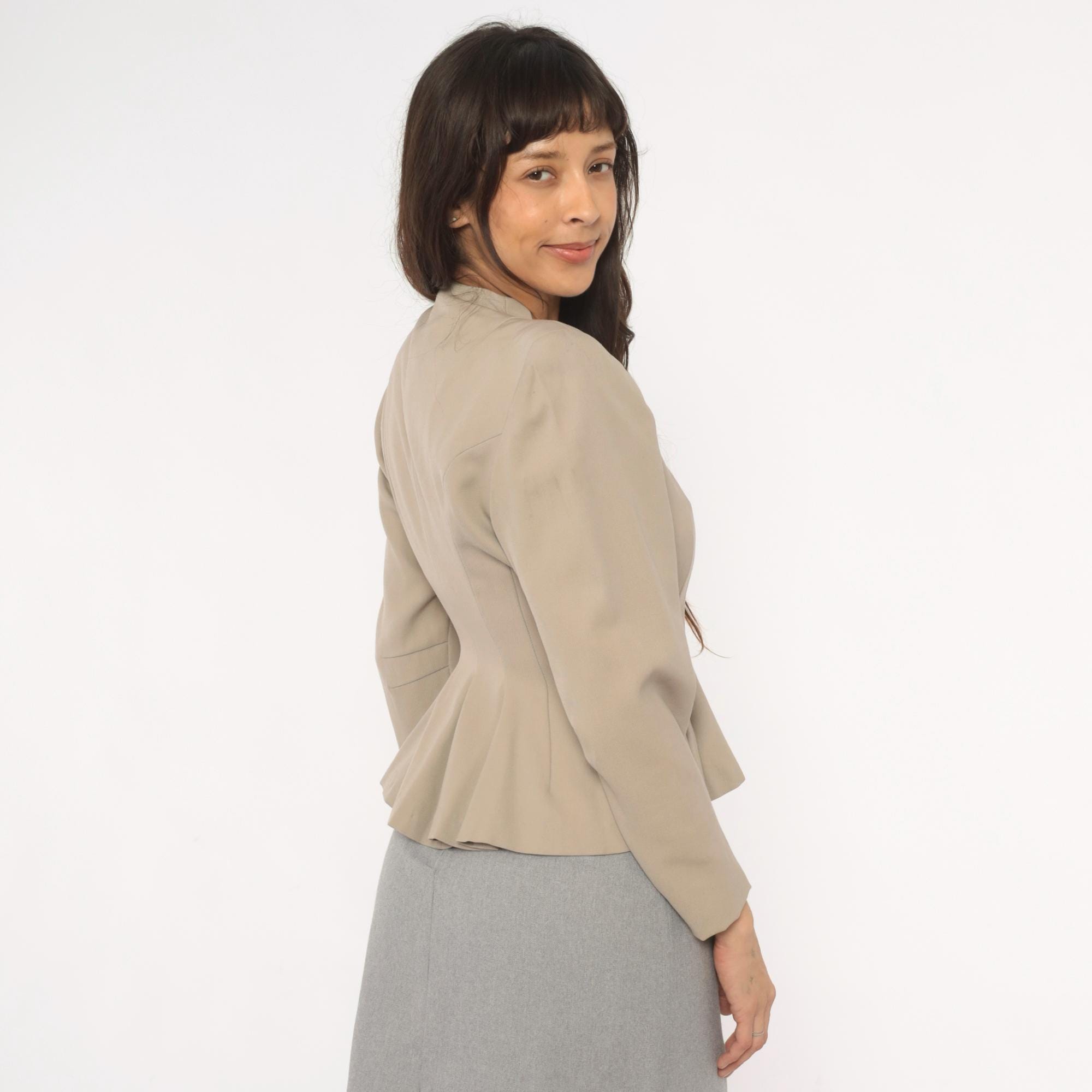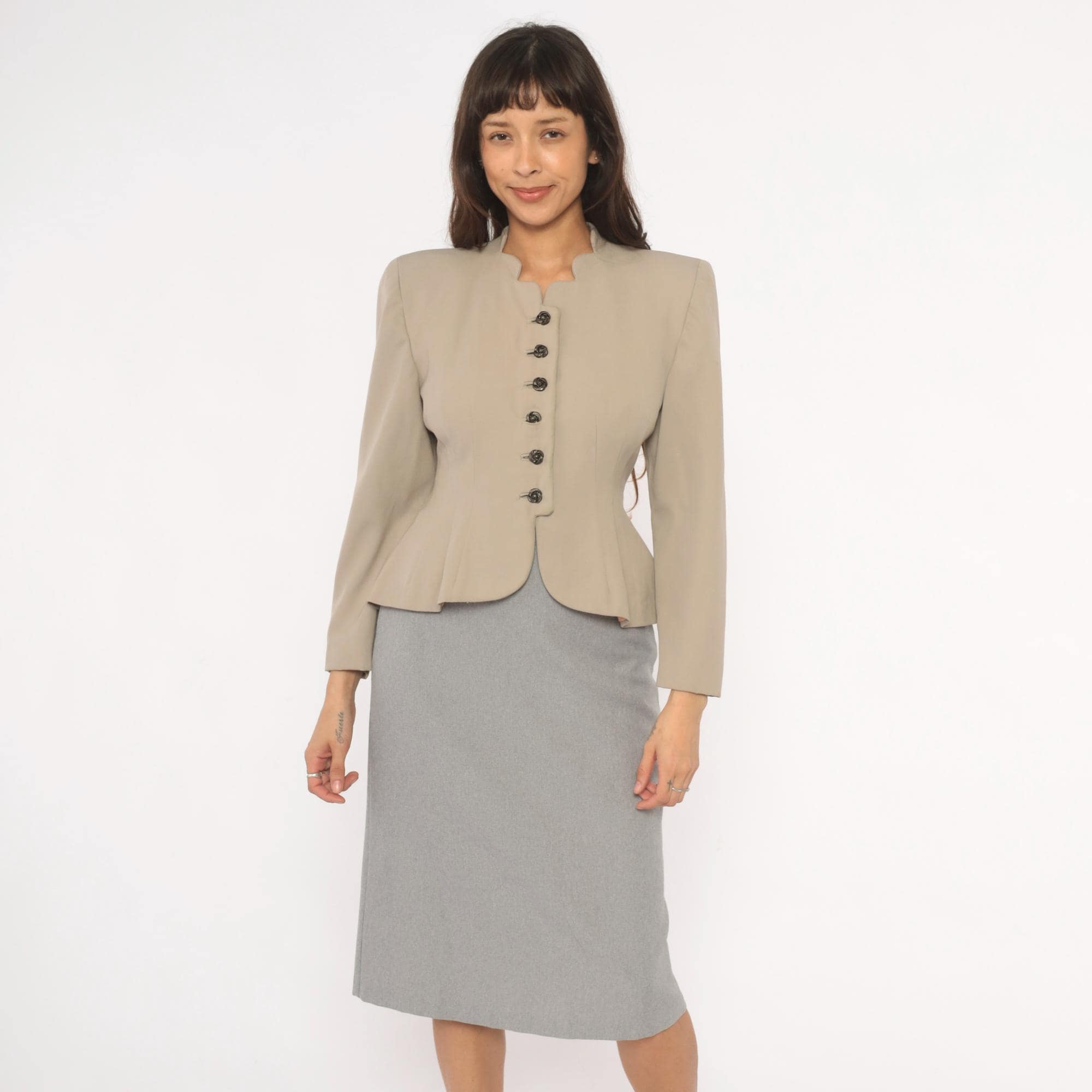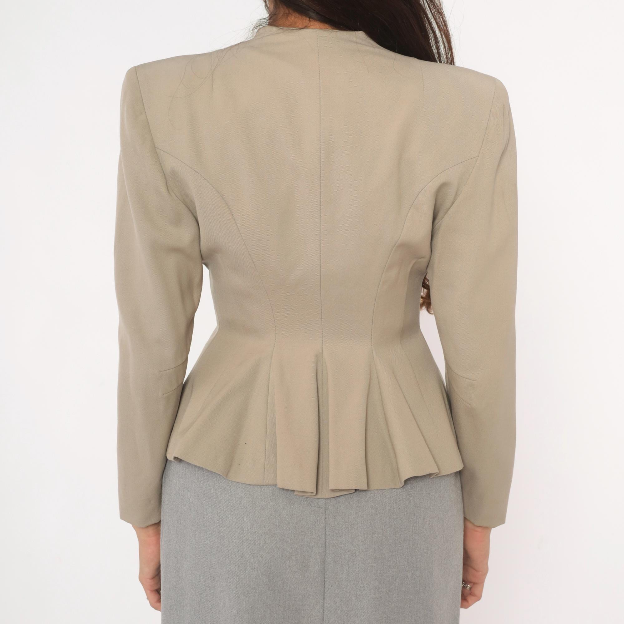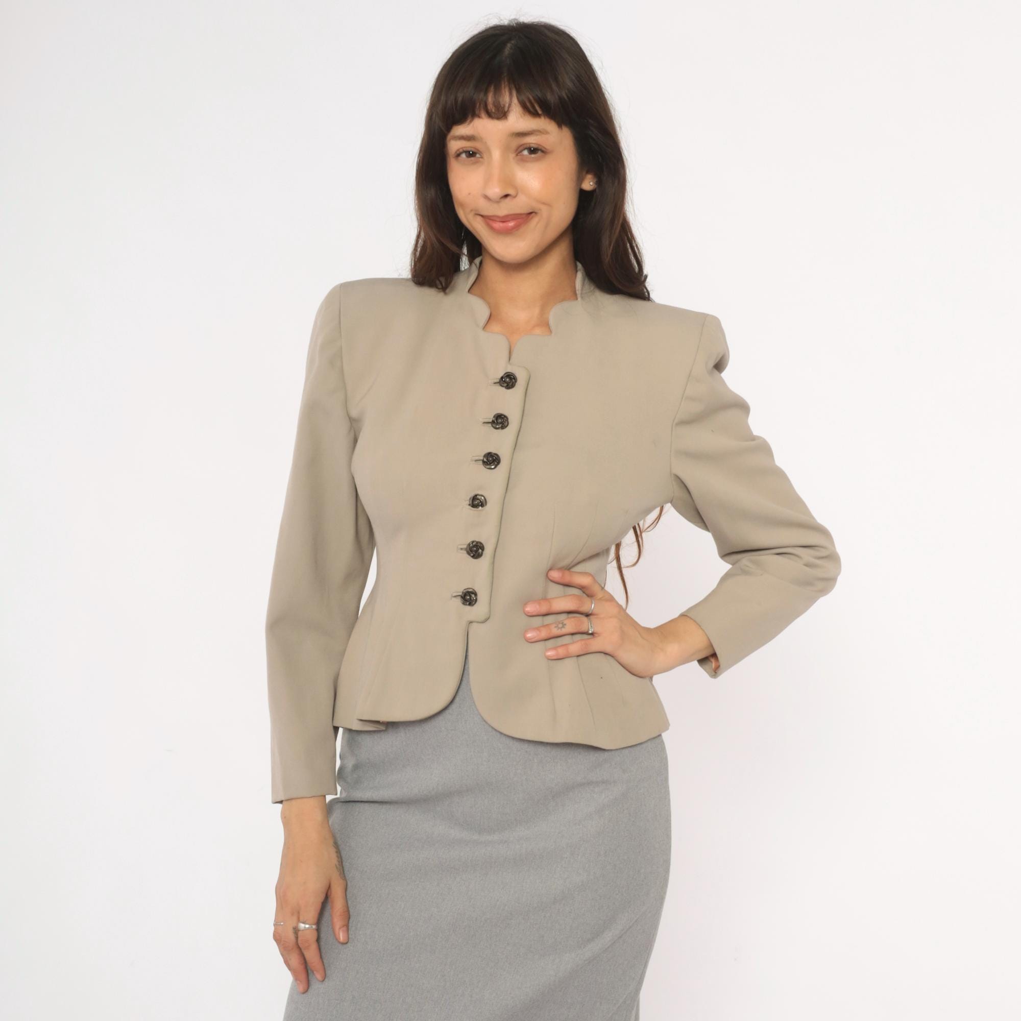 1950s taupe blazer from Betty Fashions with a scalloped split neckline and six ornate swirl-design metal buttons down the front. Fitted bodice with princess seaming, nipped waist, and pleated peplum flare at the back hem. Long sleeves, collarless mandarin-style neckband, and curved scalloped hemline.