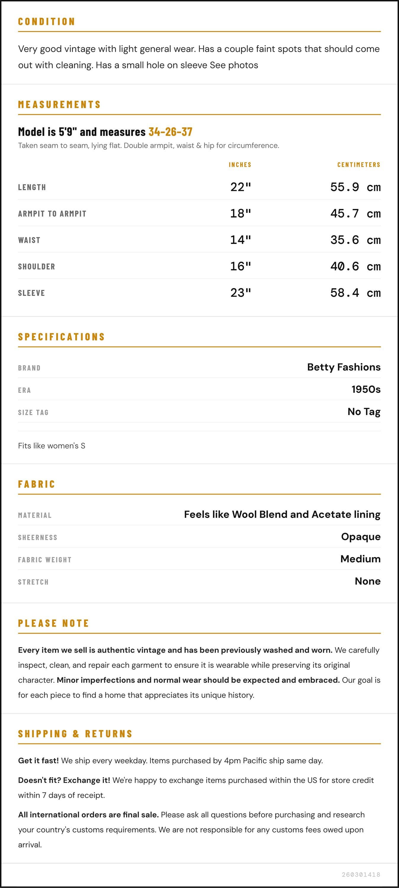 Condition: Very good vintage with light general wear. Has a couple faint spots that should come out with cleaning. Has a small hole on sleeve See photos
