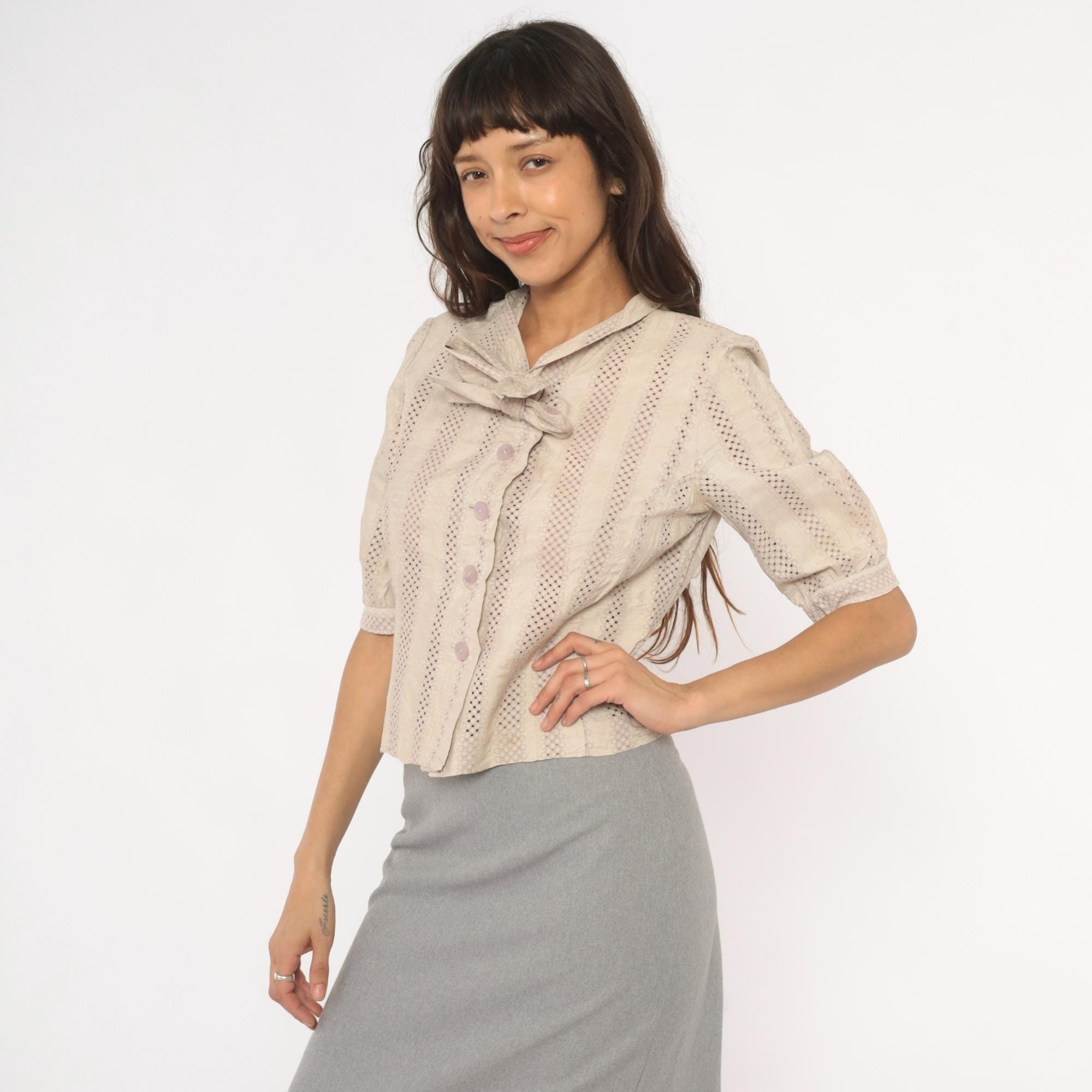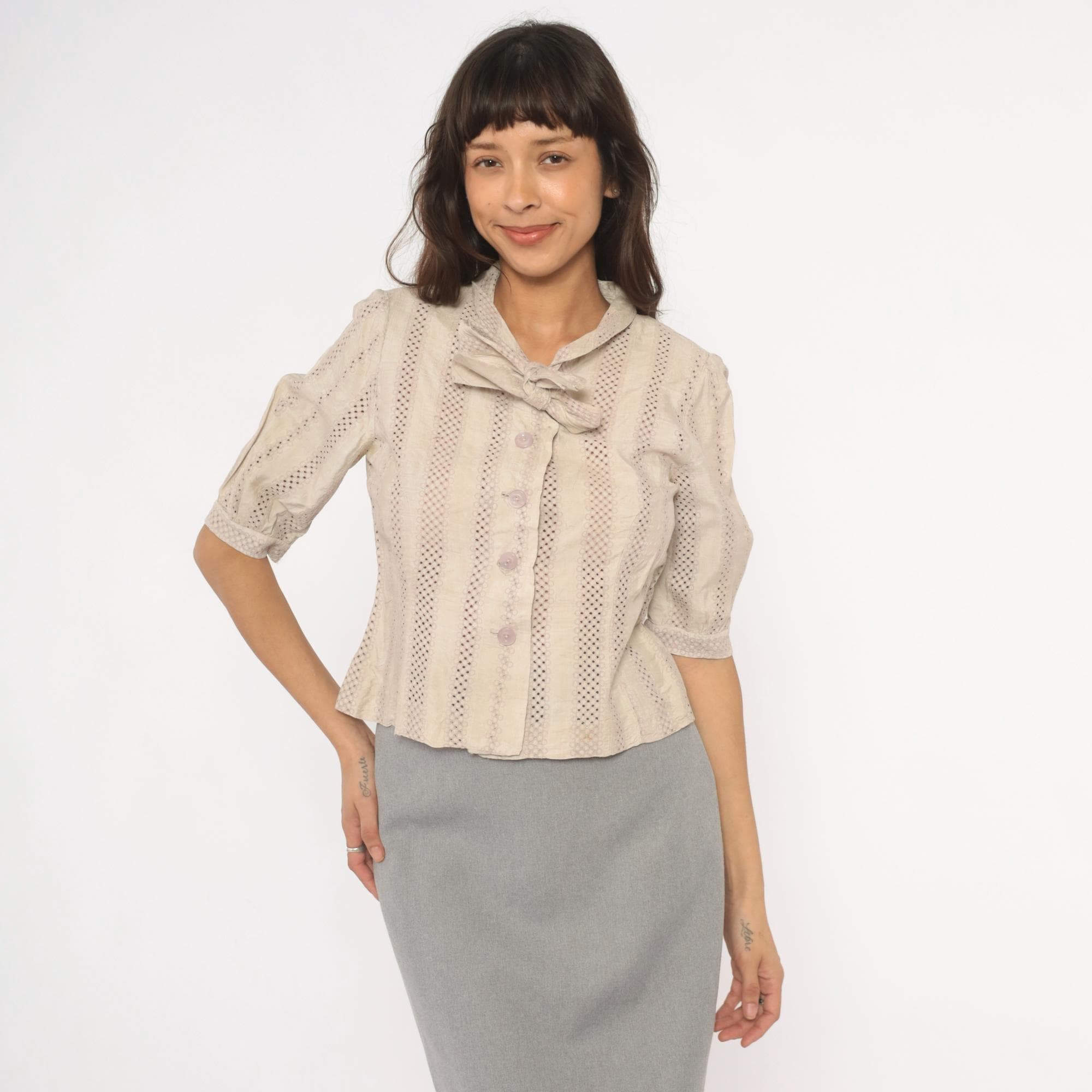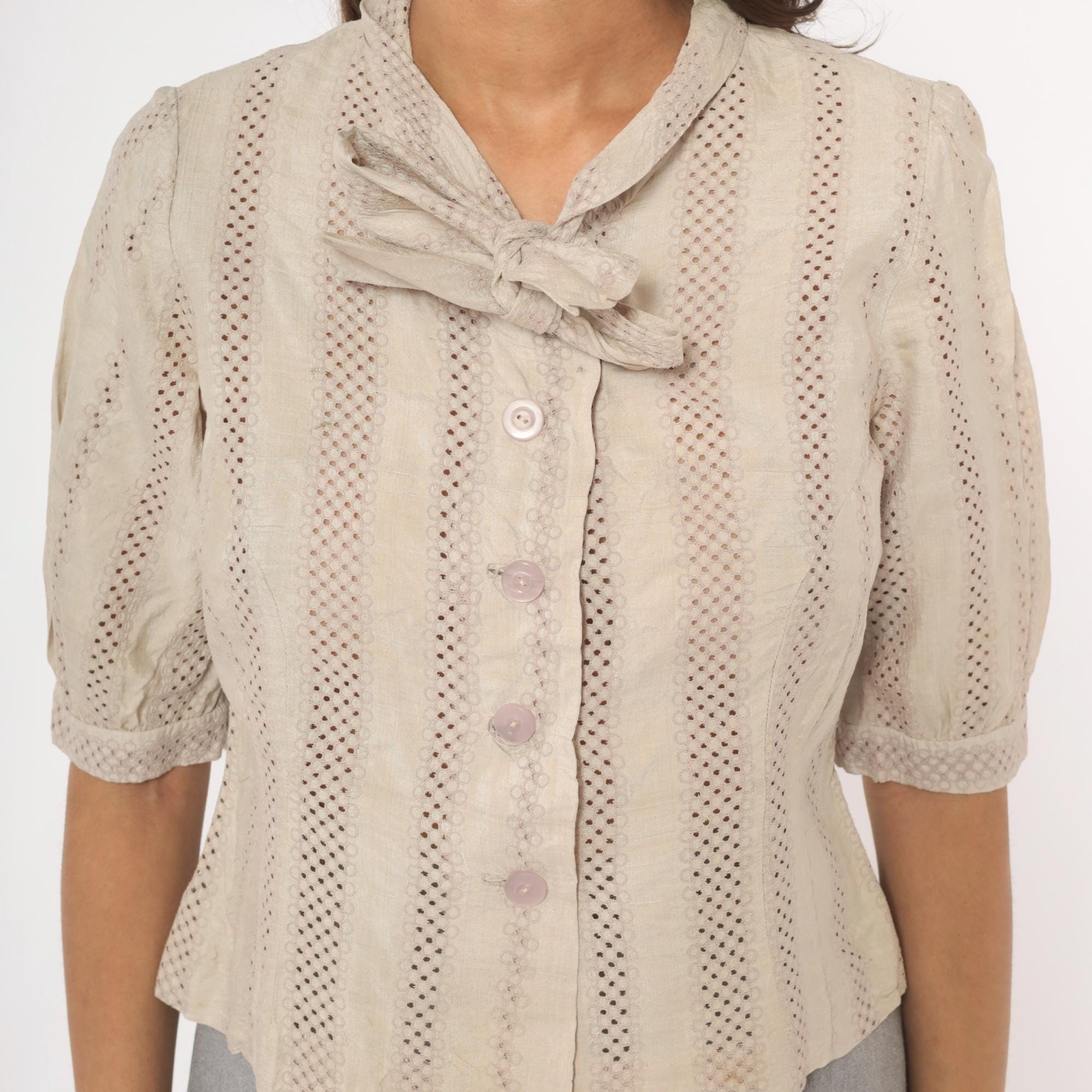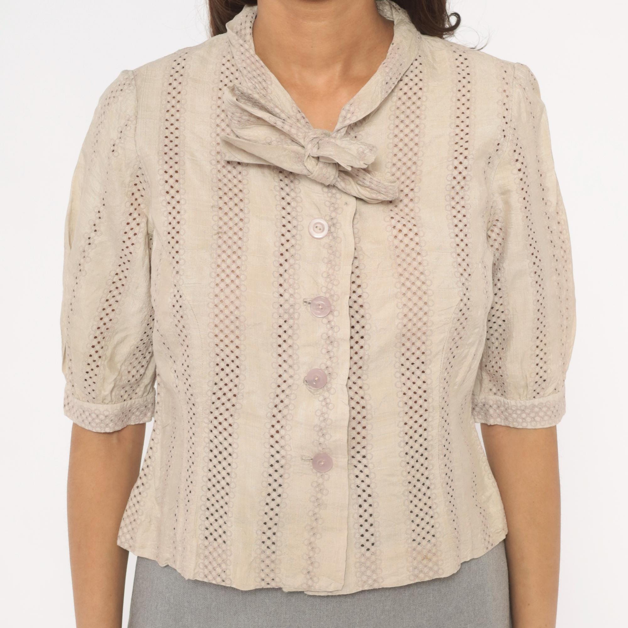 70s cream eyelet blouse with vertical striped openwork pattern and a tied bow at the collar. Button front closure with lavender-toned buttons, puff sleeves gathered into narrow cuffs, and a fitted waist. Ascot collar with allover eyelet creating alternating bands of solid and perforated stripes.