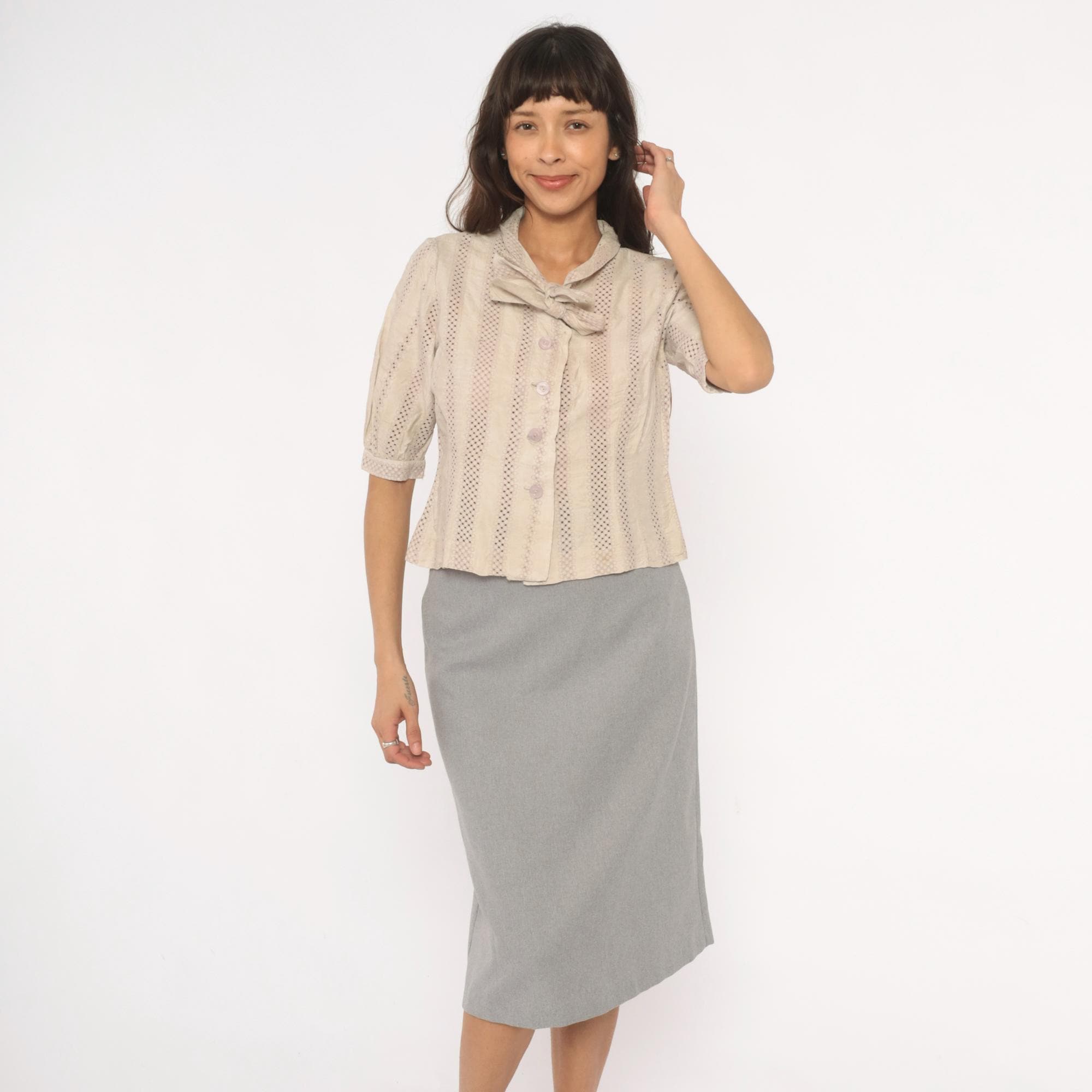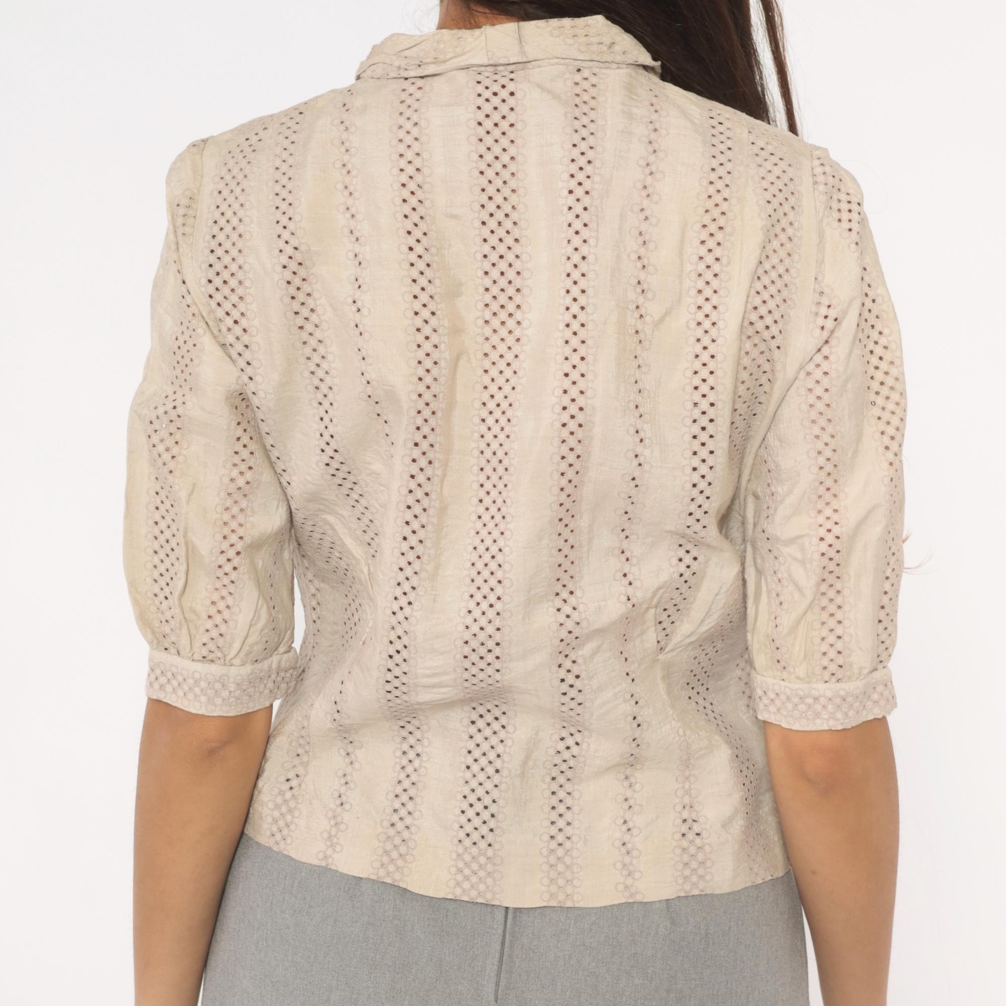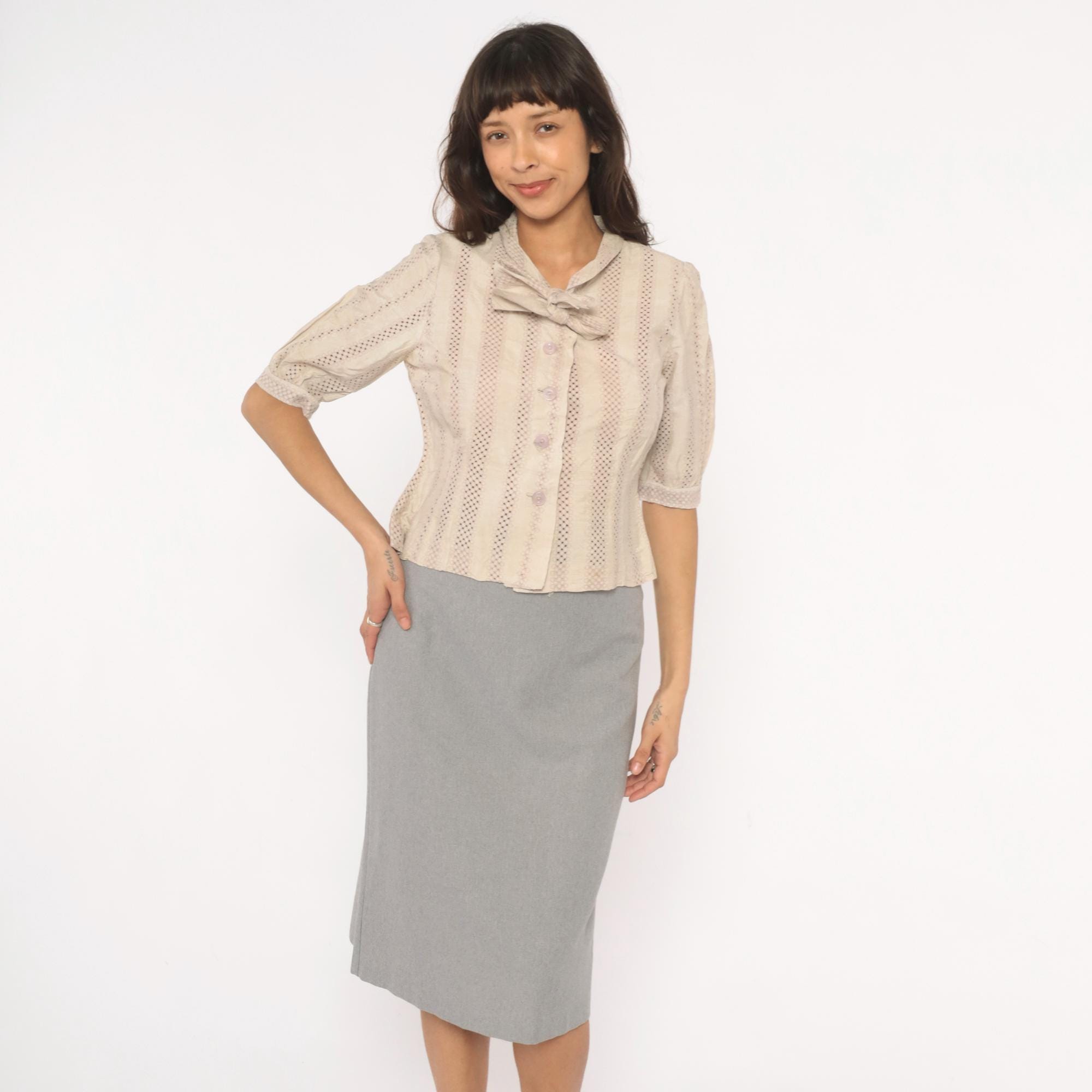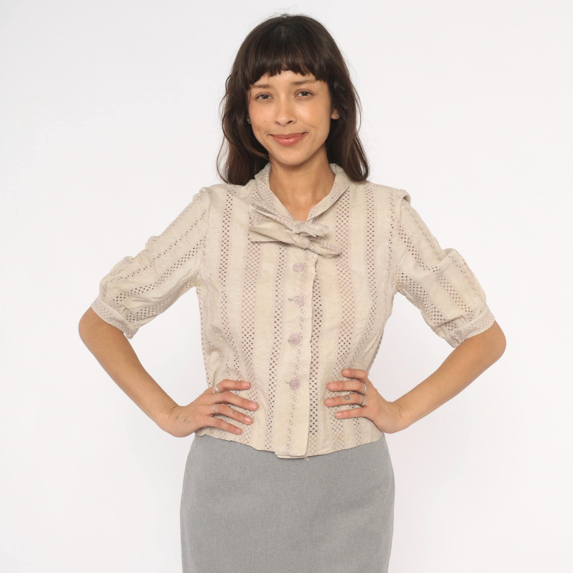 70s cream eyelet blouse with vertical striped openwork pattern and a tied bow at the collar. Button front closure with lavender-toned buttons, puff sleeves gathered into narrow cuffs, and a fitted waist. Ascot collar with allover eyelet creating alternating bands of solid and perforated stripes.