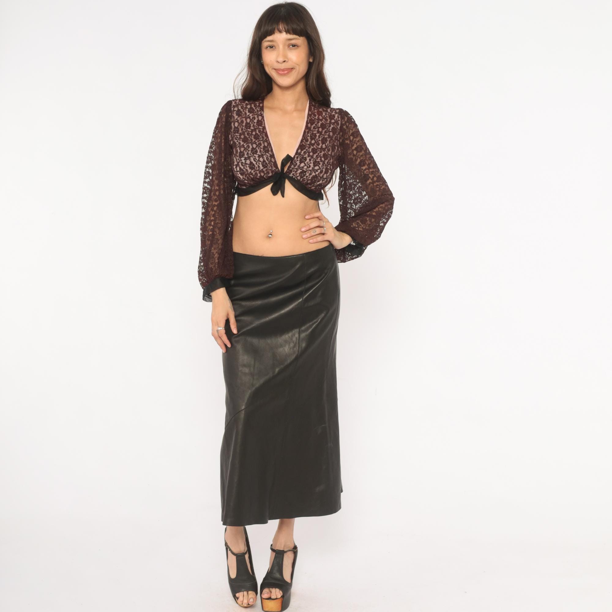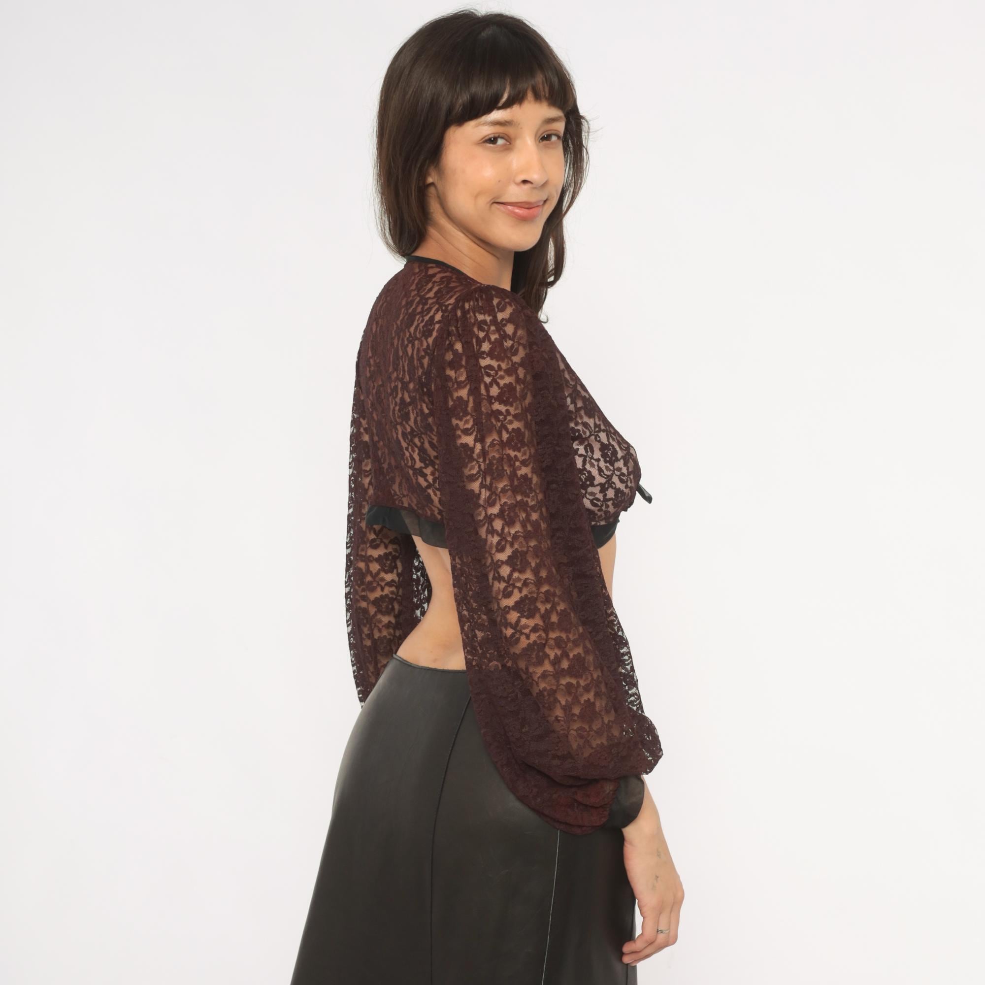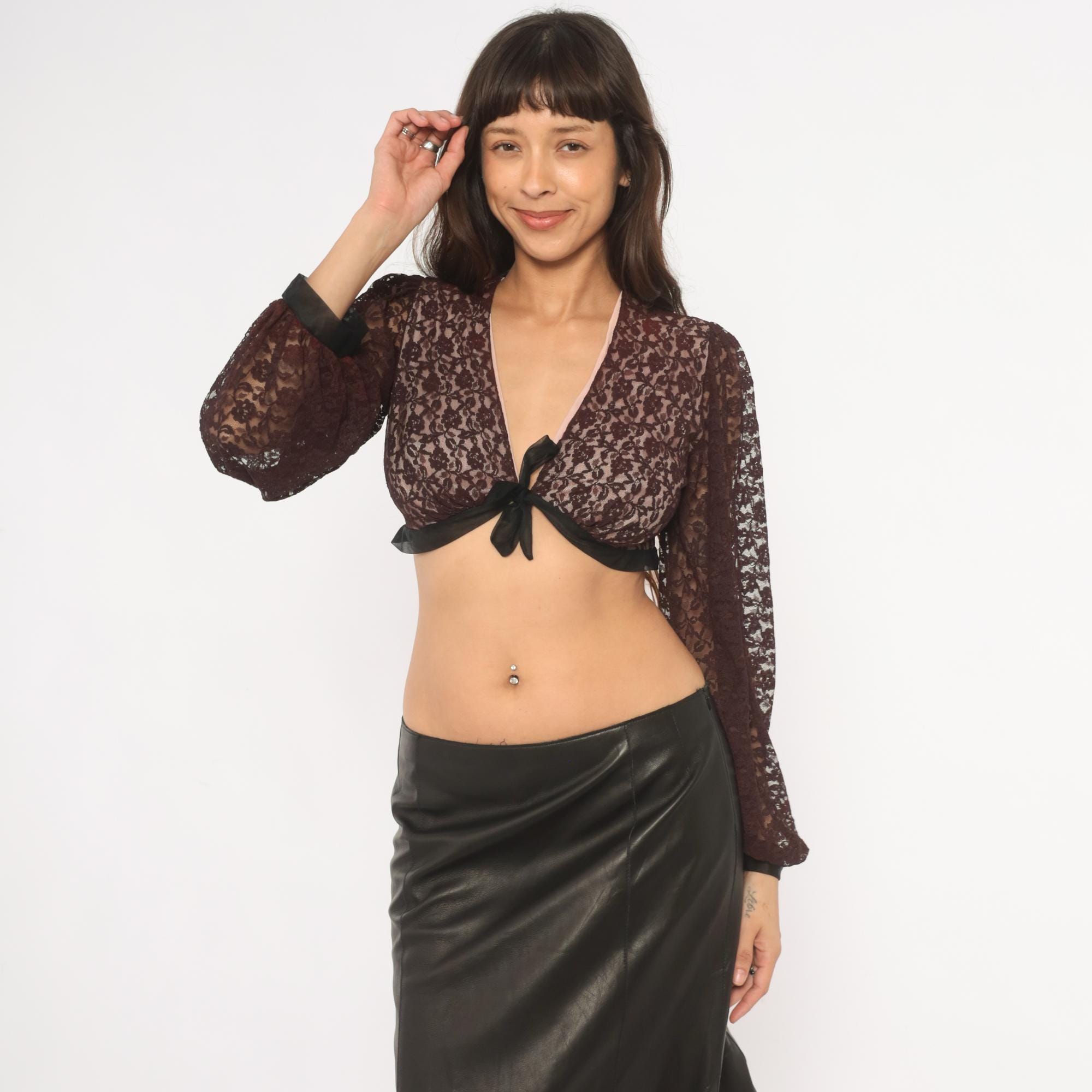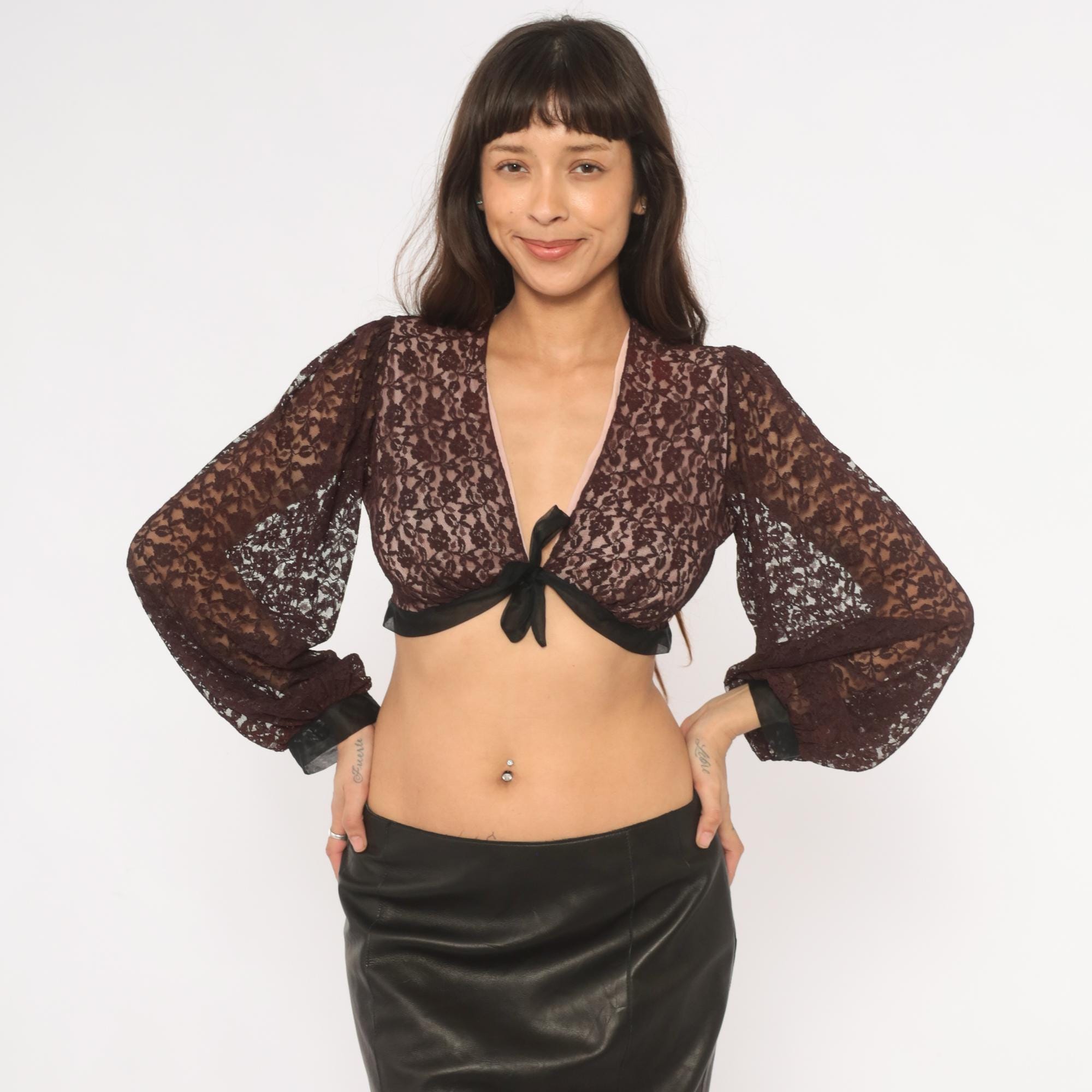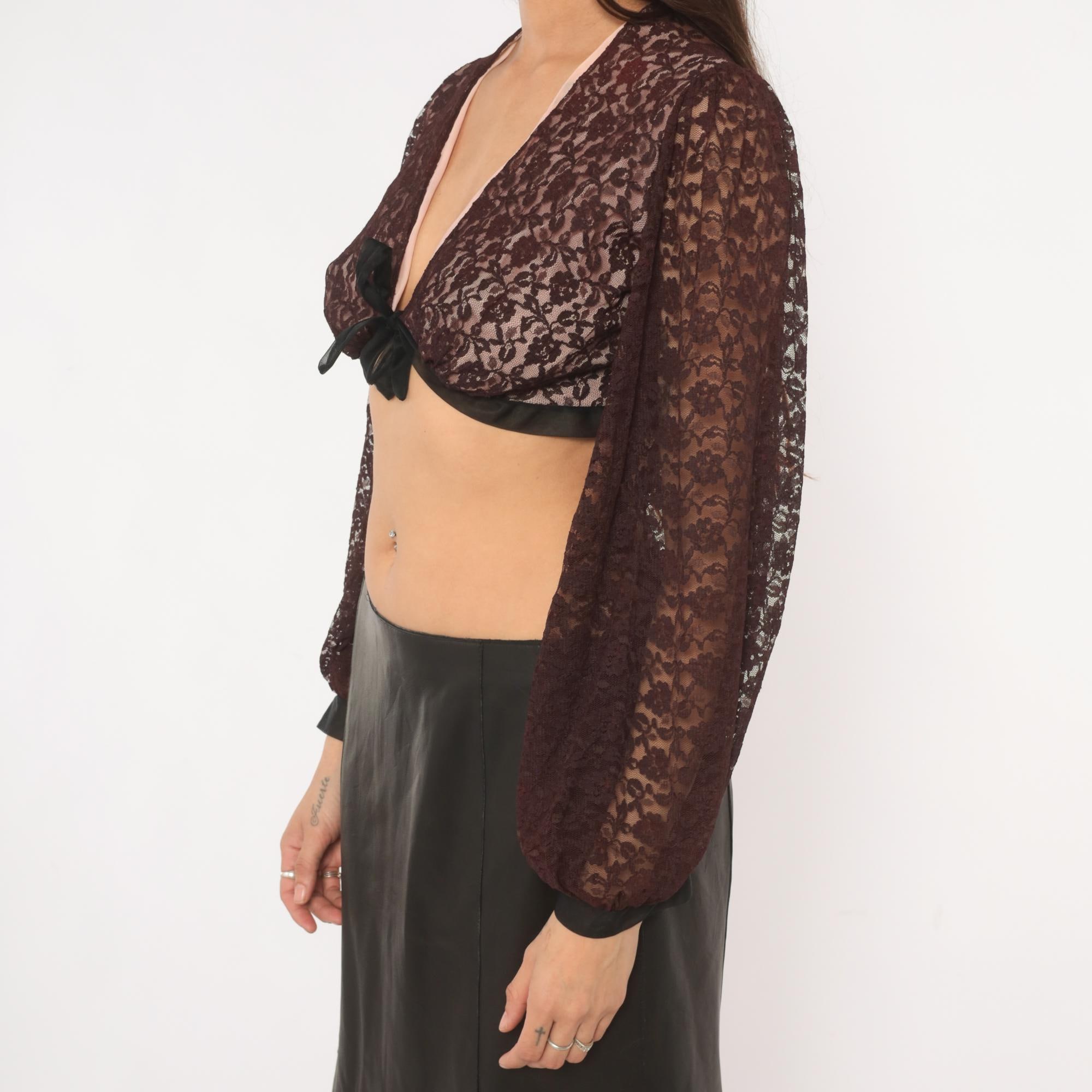 70s black lace crop top from Rovel of California with a deep V neckline, tie front closure, and black satin trim along the hem and cuffs. All-over floral lace in a black with a pink-toned lining through the bodice and sheer unlined bishop sleeves that gather into fitted black cuffs. The back is semi-sheer with the same floral lace pattern and black satin band at the hemline.
