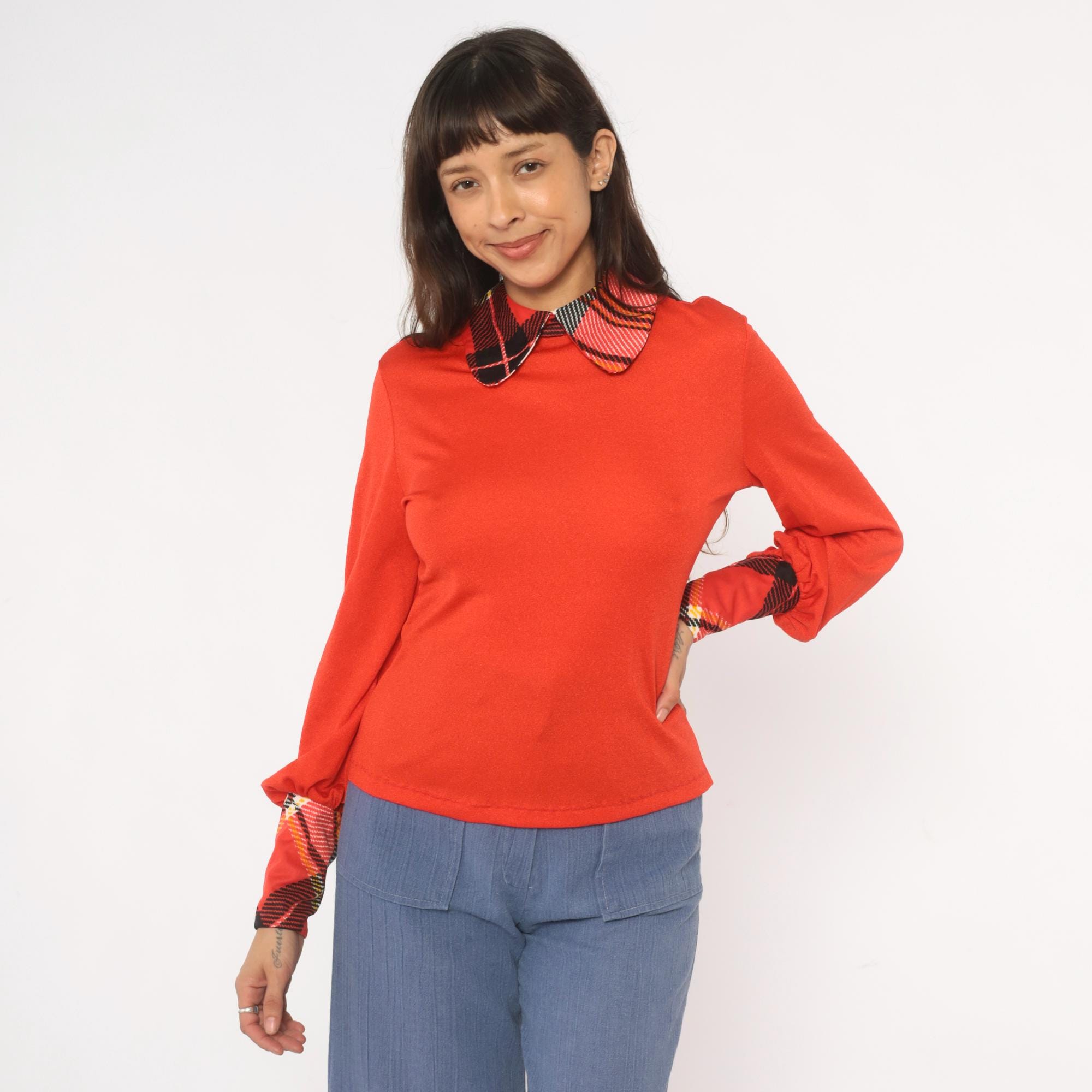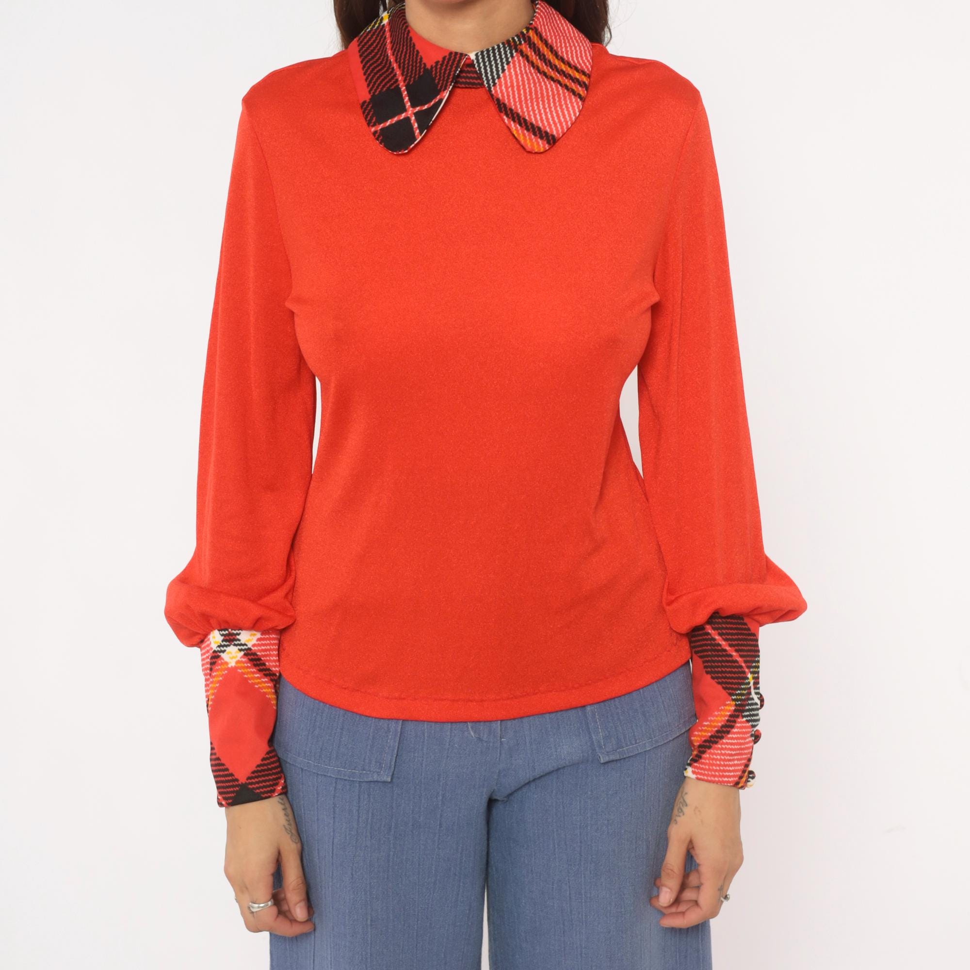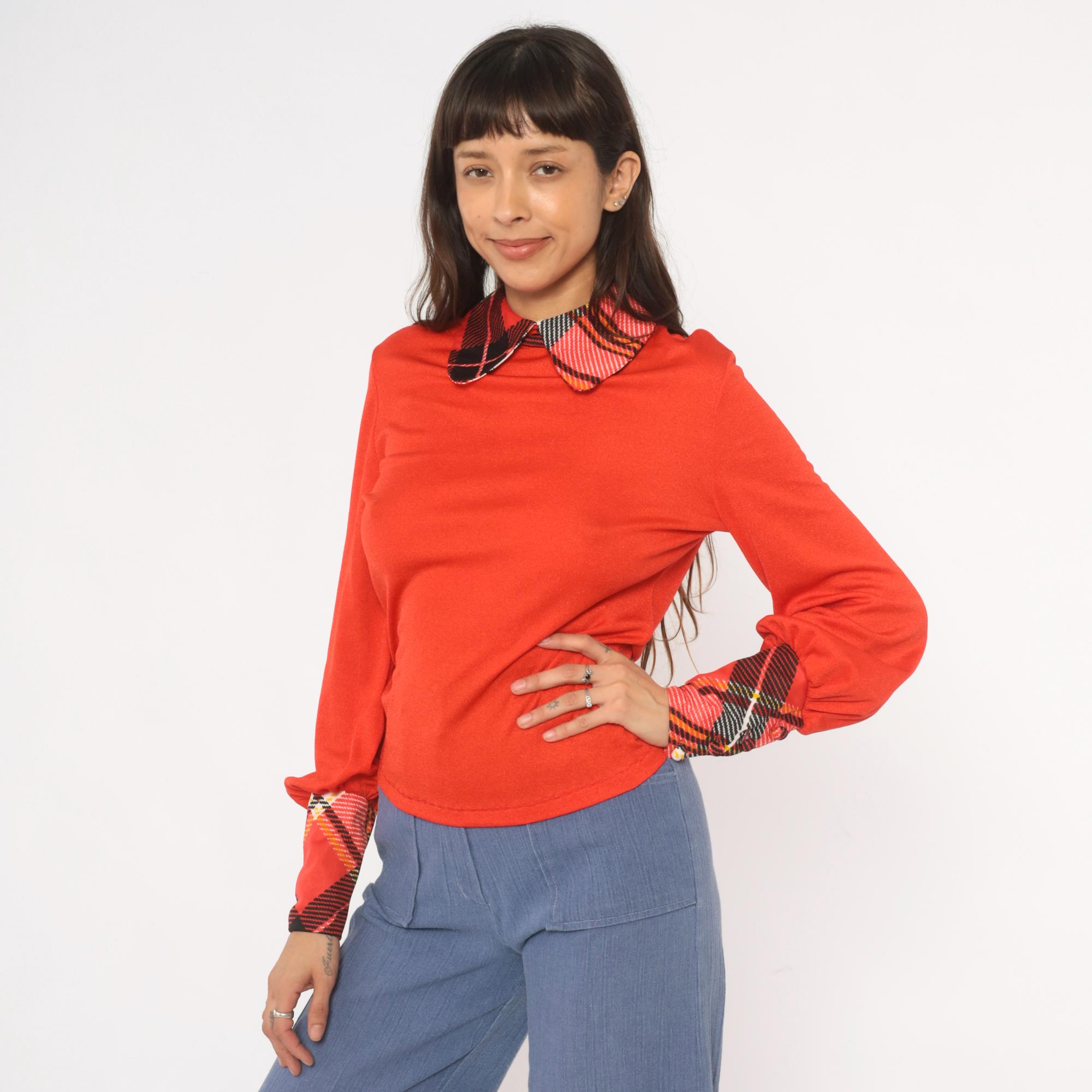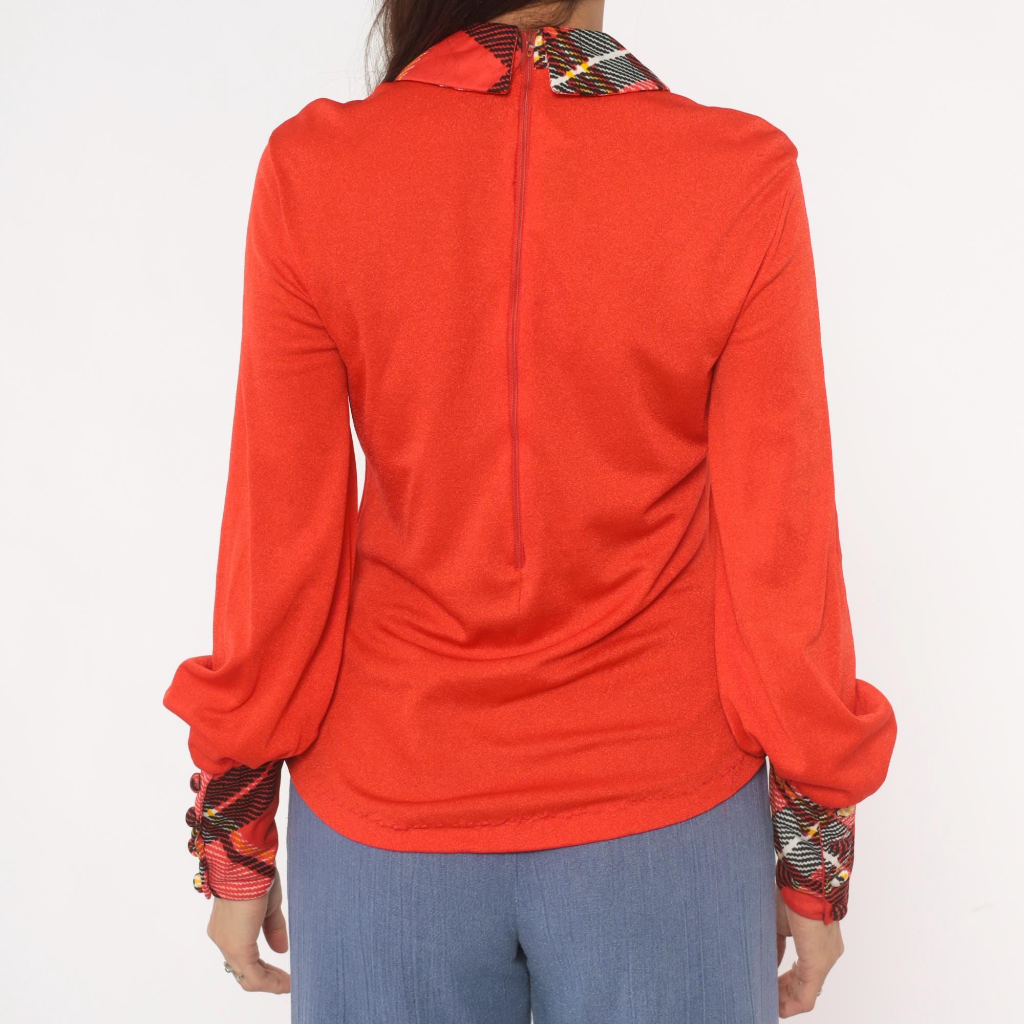 70s orange-red pullover top from Cirette California with a peter pan tartan collar and matching tartan cuffs. Bishop sleeves gather into the patterned cuff panels, which include small button closures. Back zipper closure runs from the neckline partway down. The tartan accents incorporate black, white, gold, and coral tones against the red-orange base.