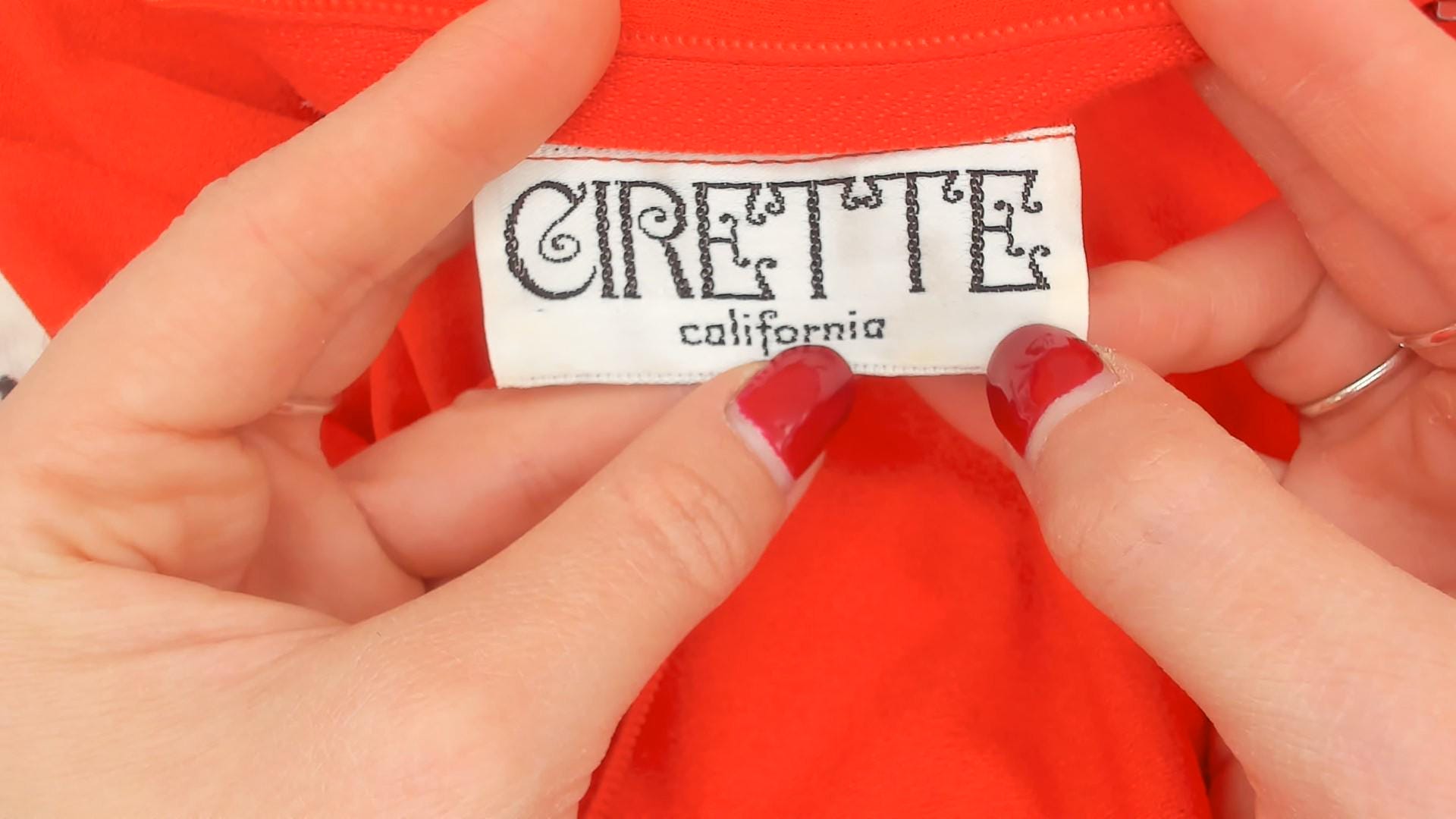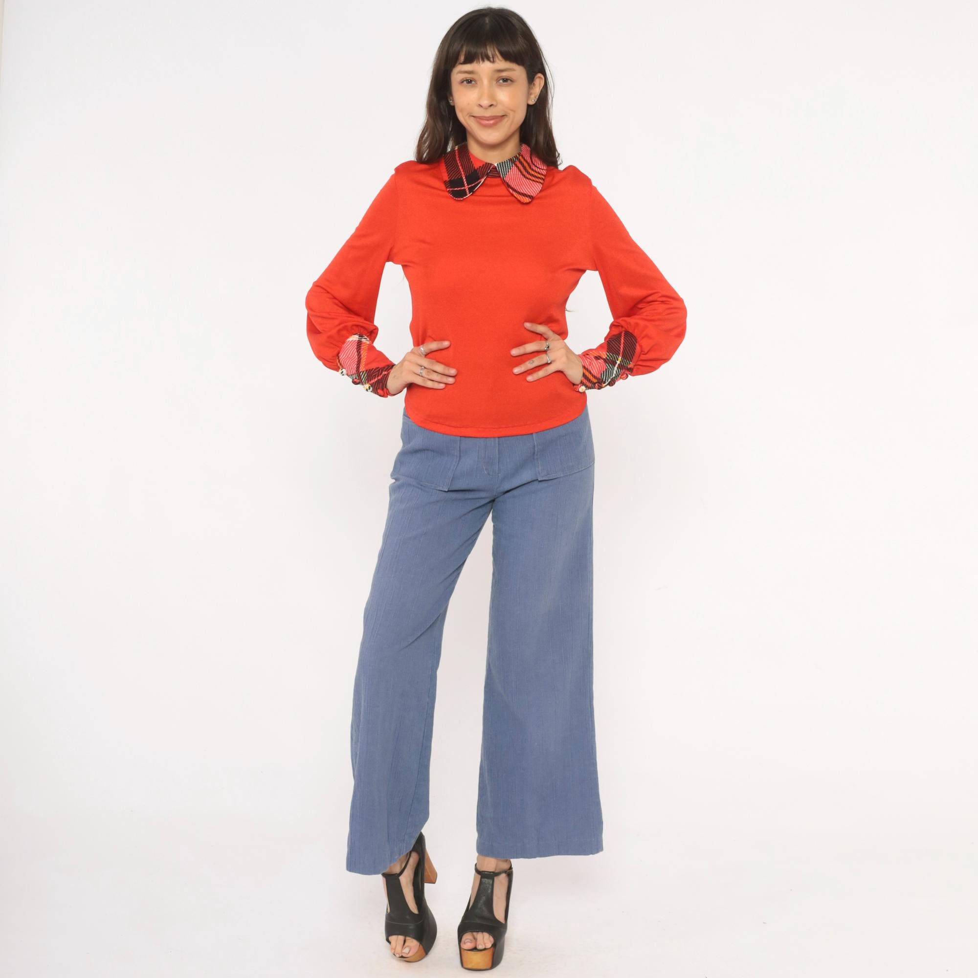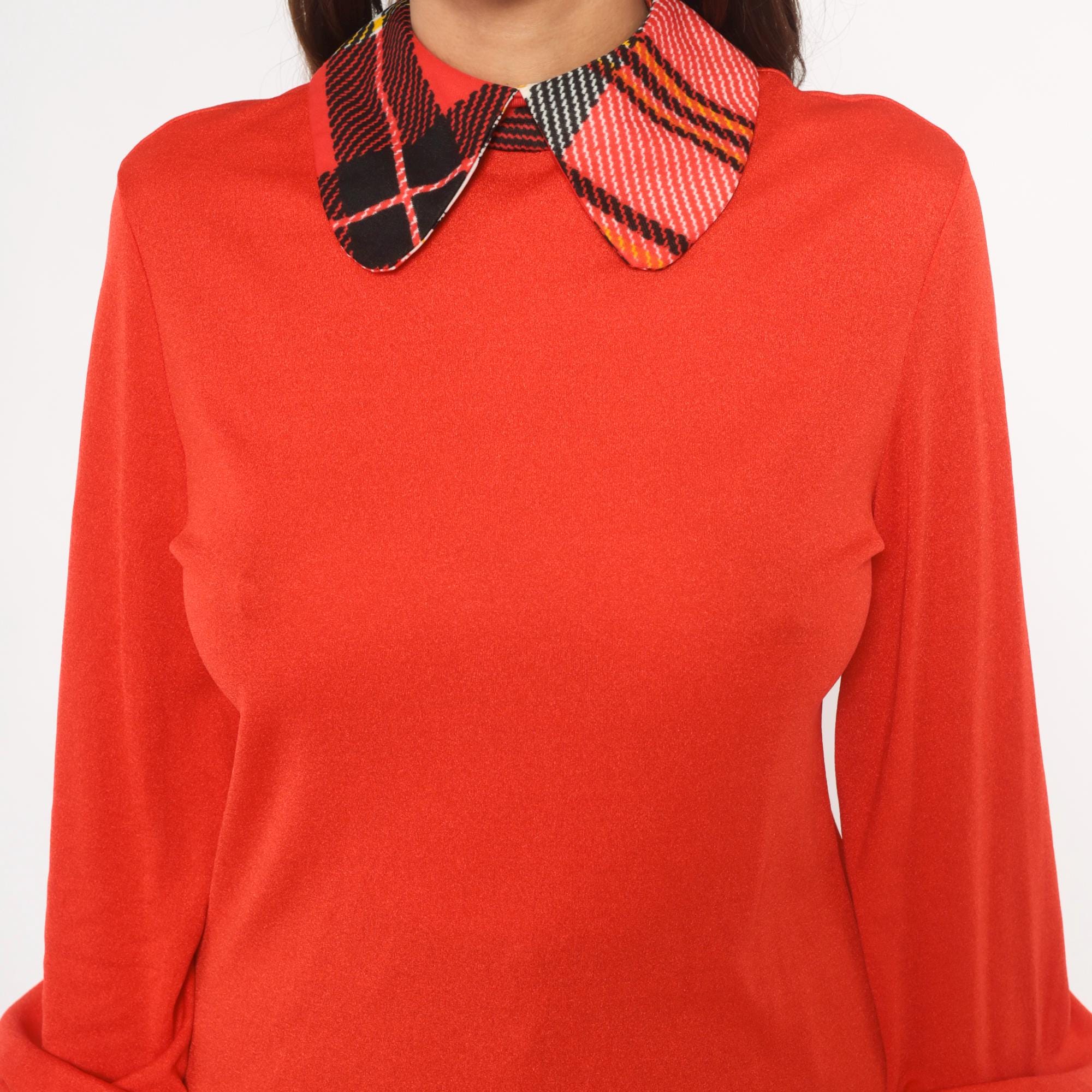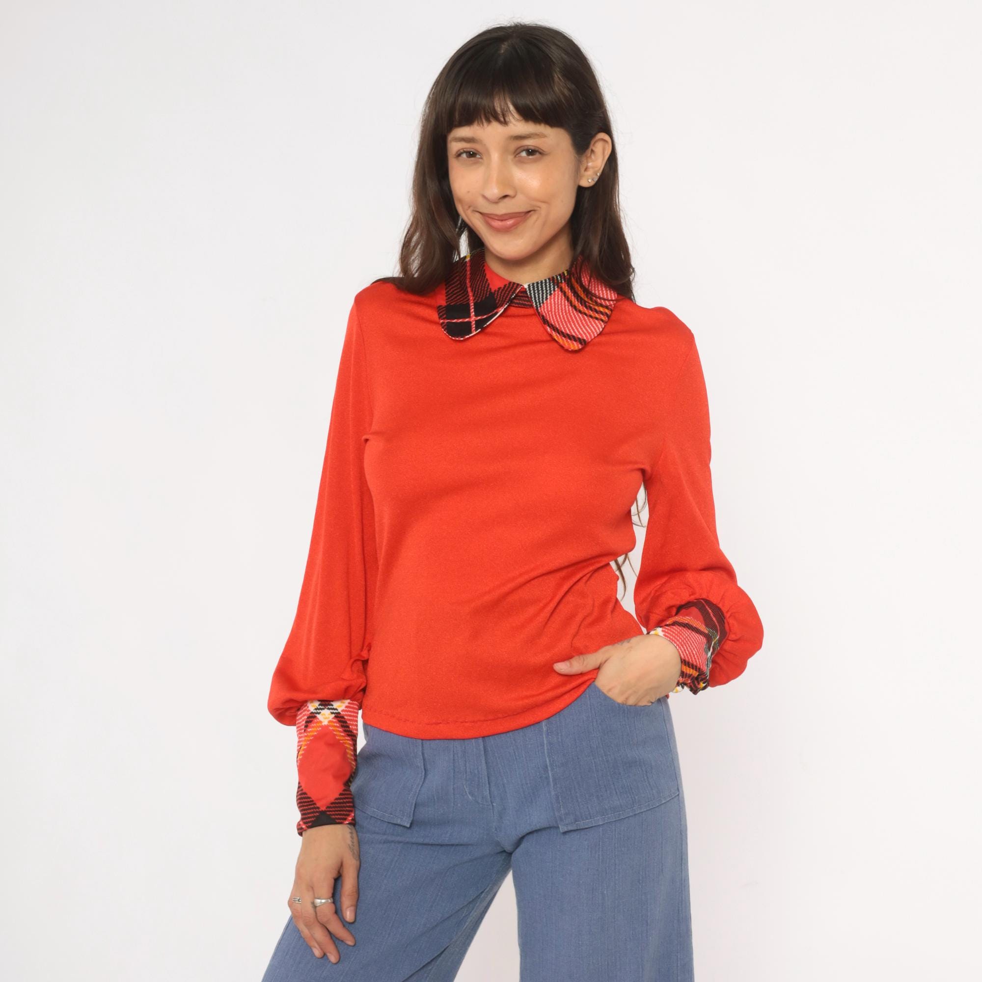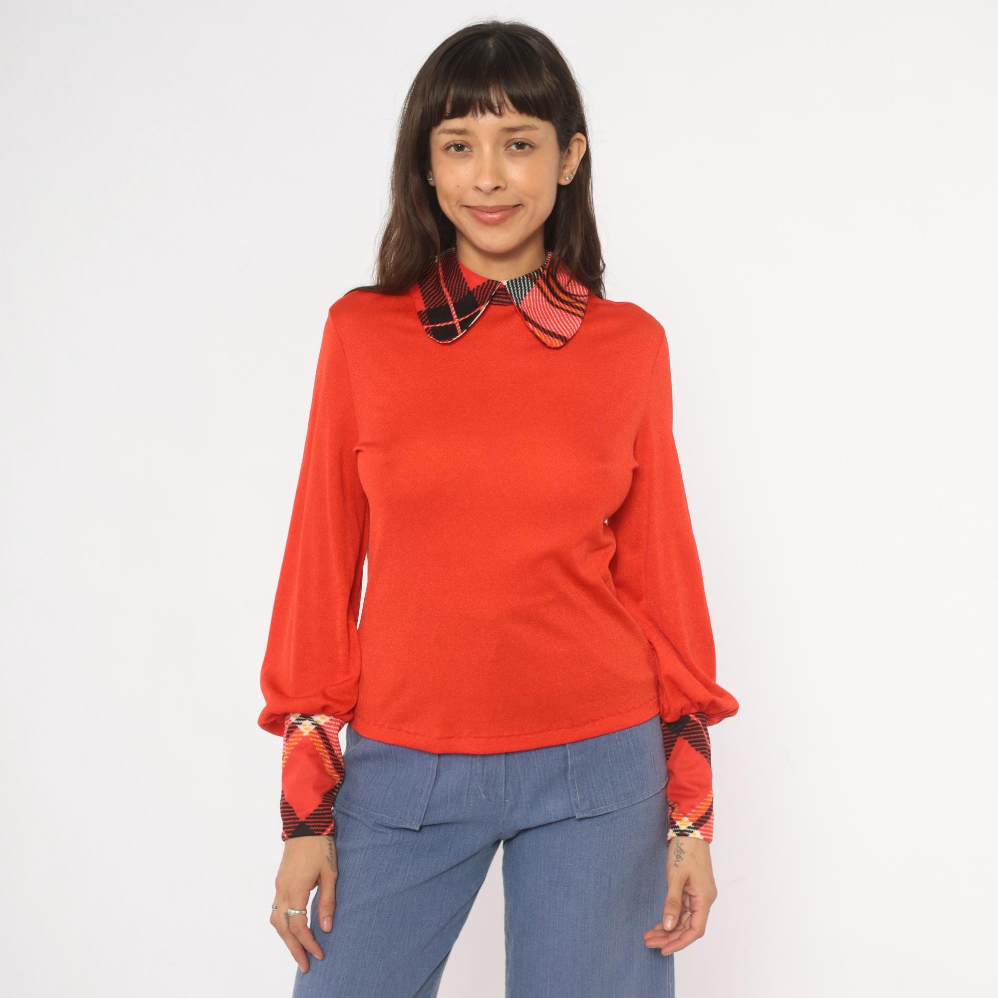 70s orange-red pullover top from Cirette California with a peter pan tartan collar and matching tartan cuffs. Bishop sleeves gather into the patterned cuff panels, which include small button closures. Back zipper closure runs from the neckline partway down. The tartan accents incorporate black, white, gold, and coral tones against the red-orange base.