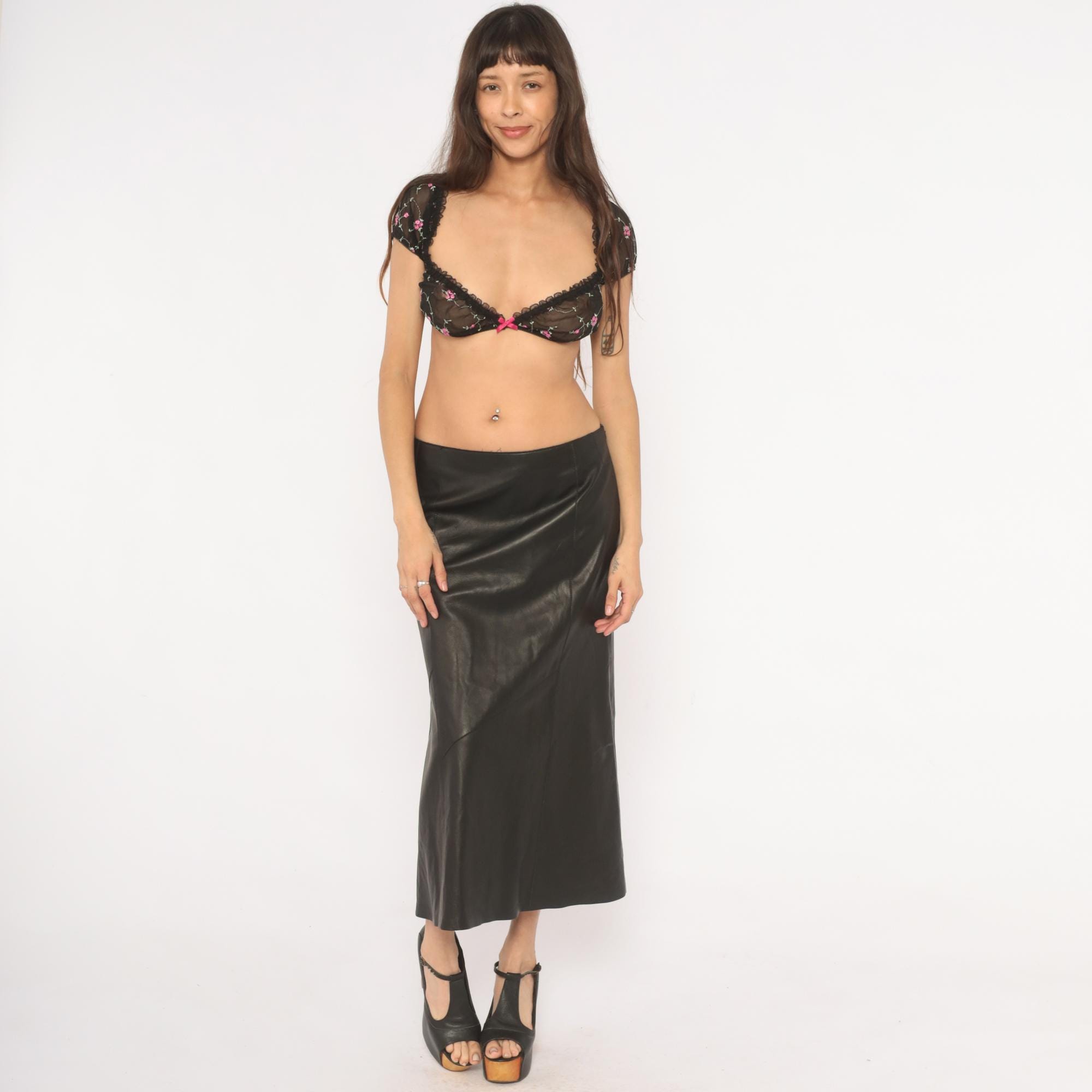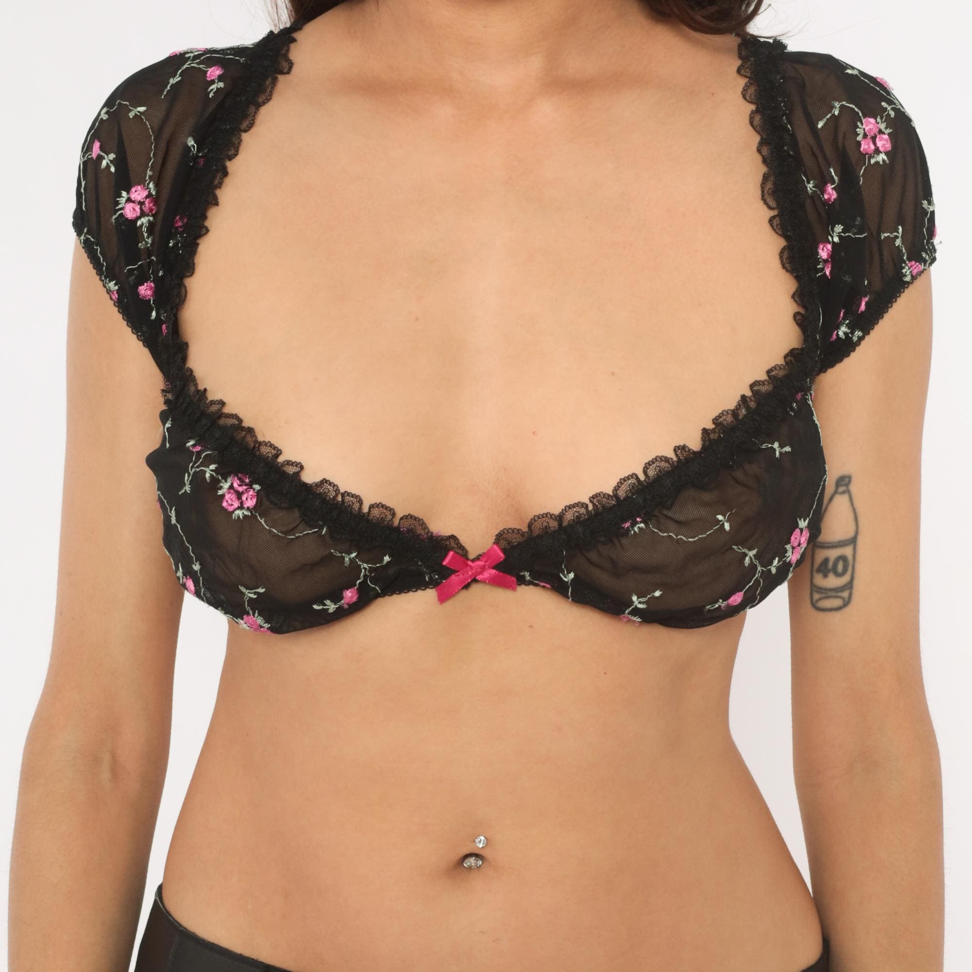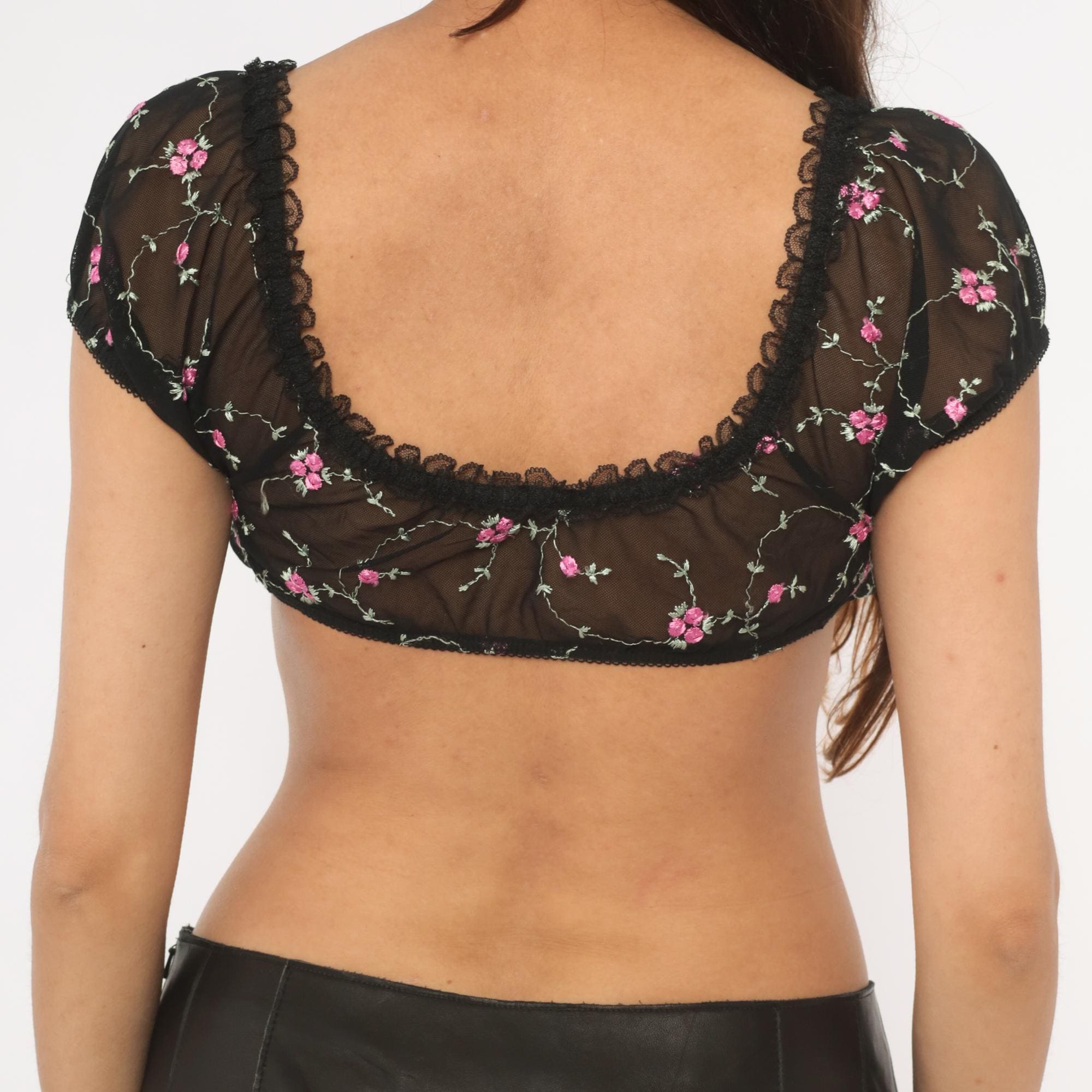90s black mesh crop bralette with pink and green embroidered rose vine pattern throughout. Scoop neckline and low scoop back, both trimmed with scalloped black lace edging. Short puff sleeves with elastic cuffs, pink satin bow at center front between the underwire cups. Pullover construction with no closure.