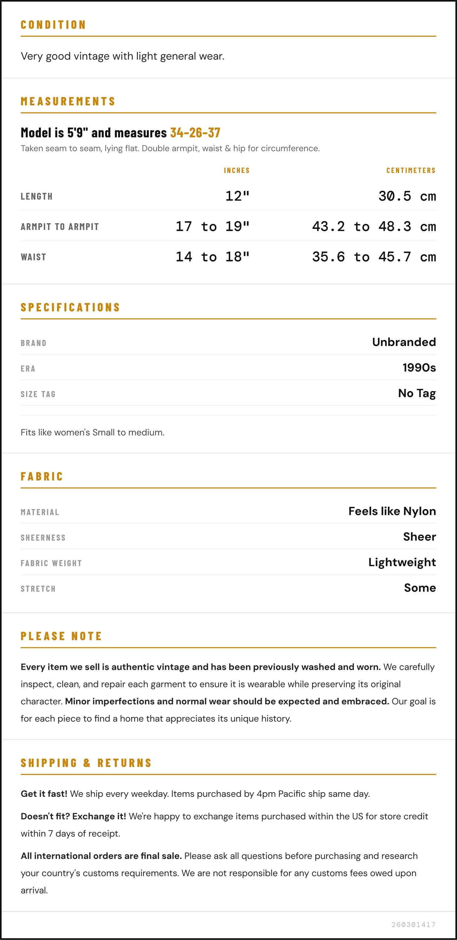 Measurements are taken laying flat and should be doubled where applicable. The "best fits" size is just an estimate, and vintage sizing can vary from modern sizing. Please use measurements to ensure proper fit. The best thing to do is measure a similar item of your own, and compare. When an item has stretch, we will list the unstretched dimensions with the stretched measurement afterwards.