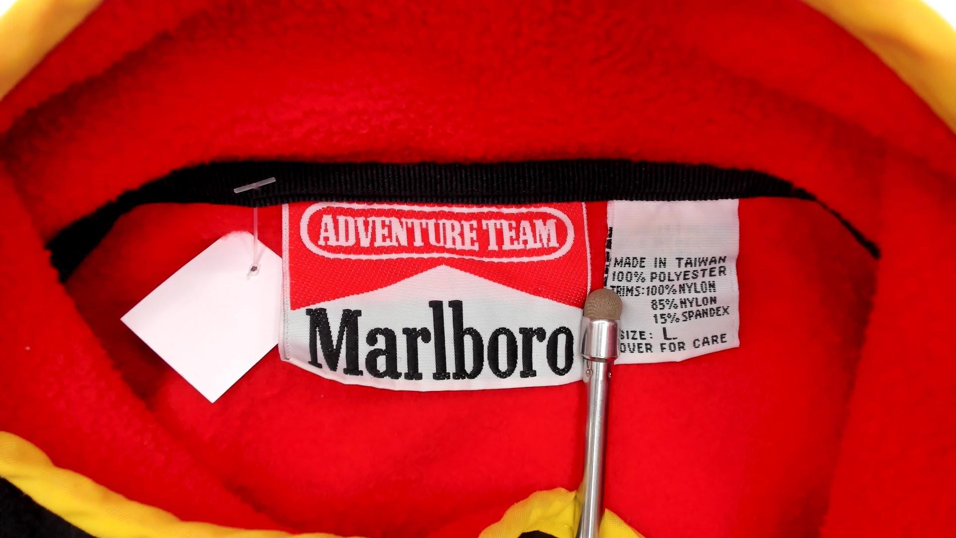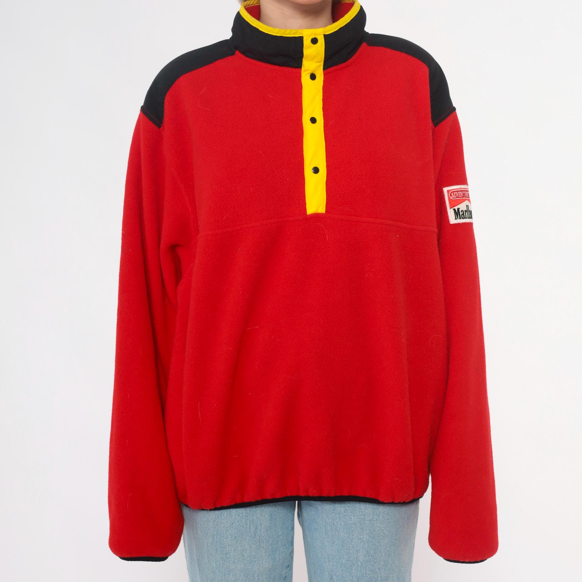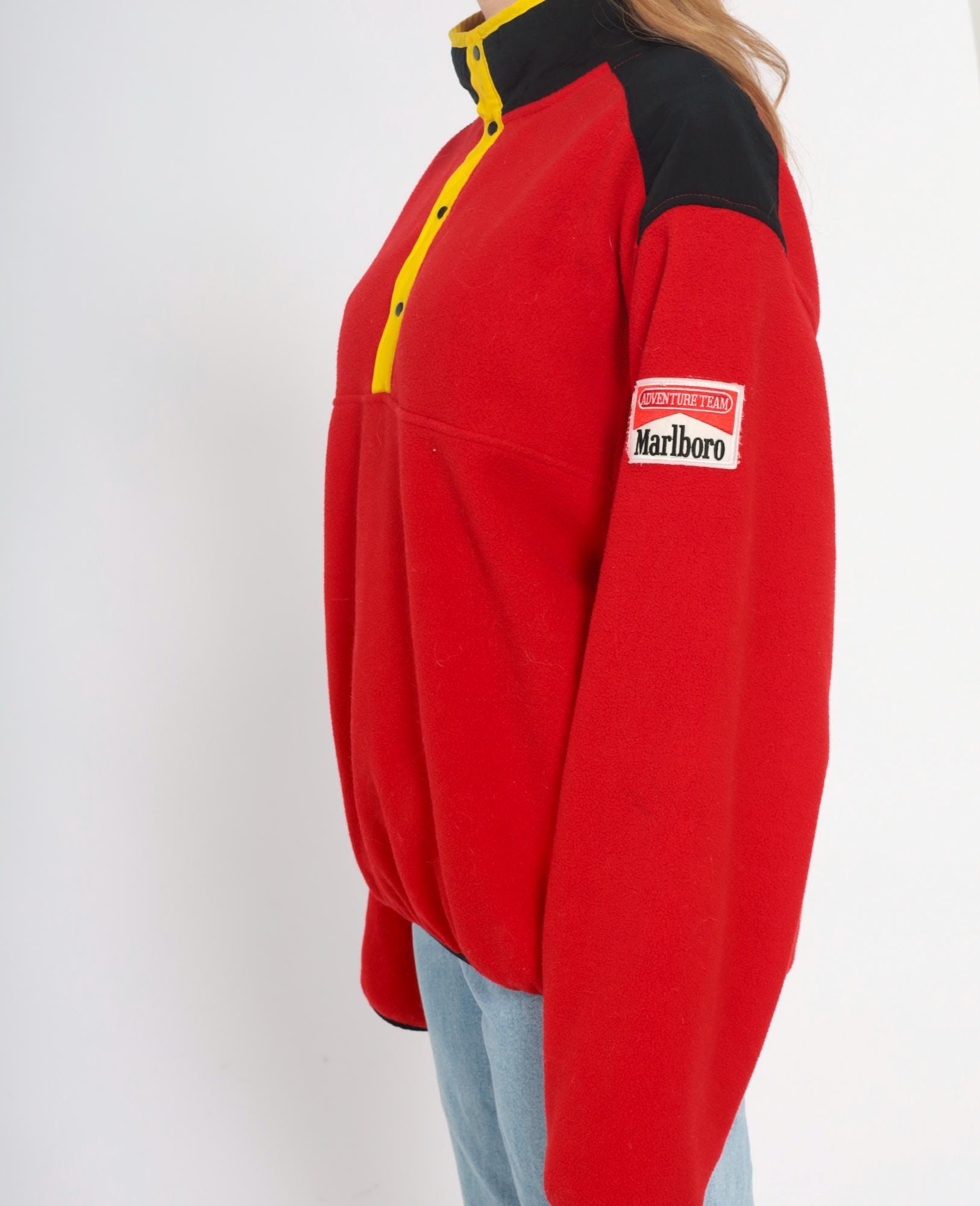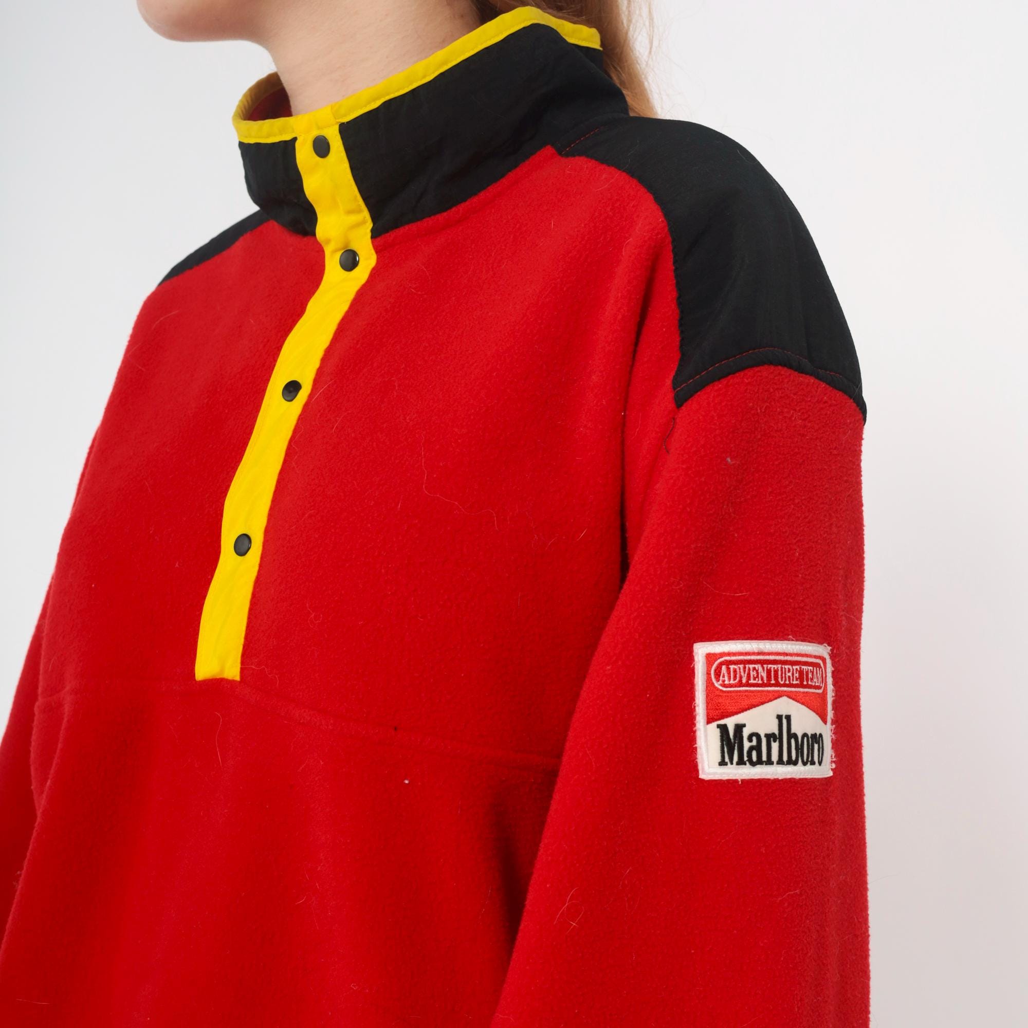 90s Marlboro Adventure Team snap-button pullover in red with black shoulder panels and yellow placket trim. High stand collar with five snap closures down a partial front opening, and a kangaroo pocket at the front. Embroidered "Adventure Team Marlboro" patch on the left sleeve, black binding along the hem and cuffs.