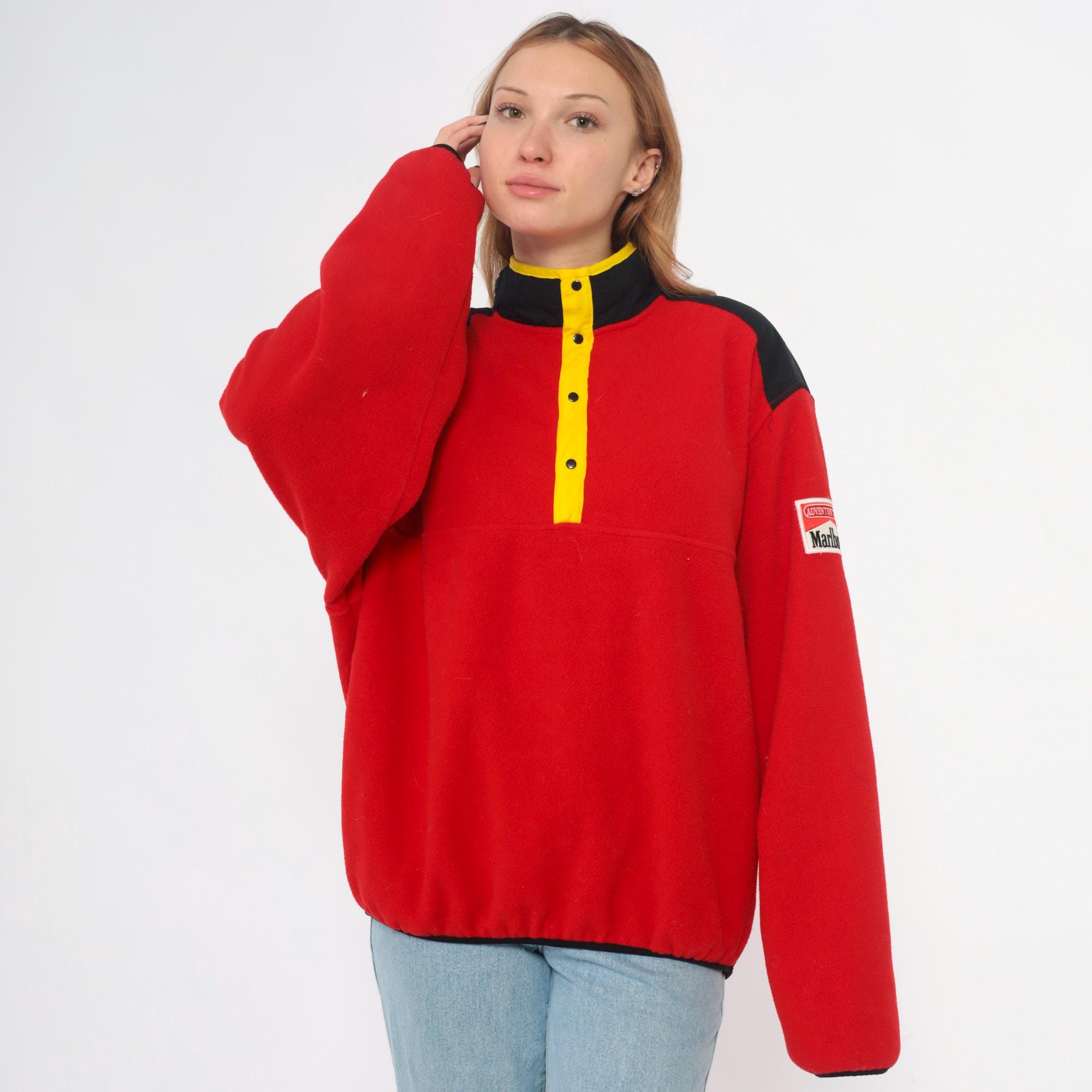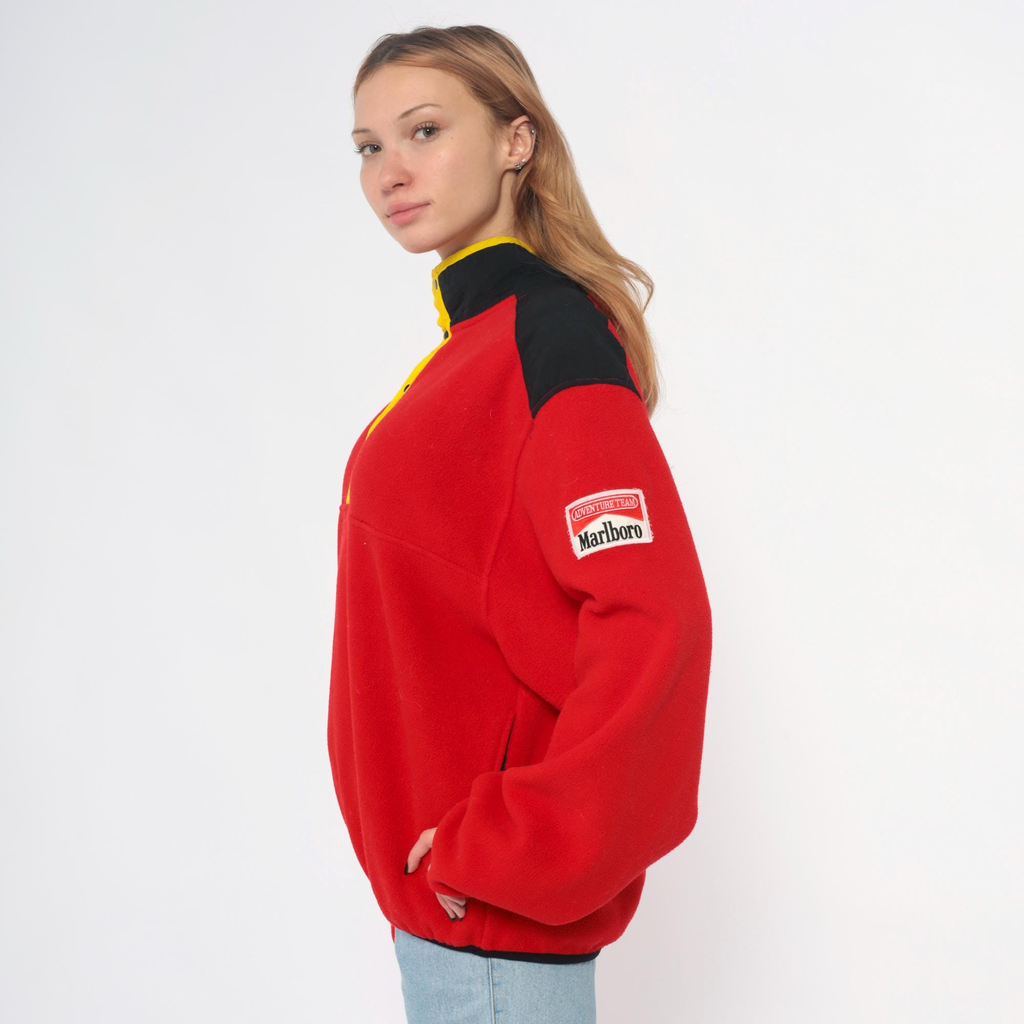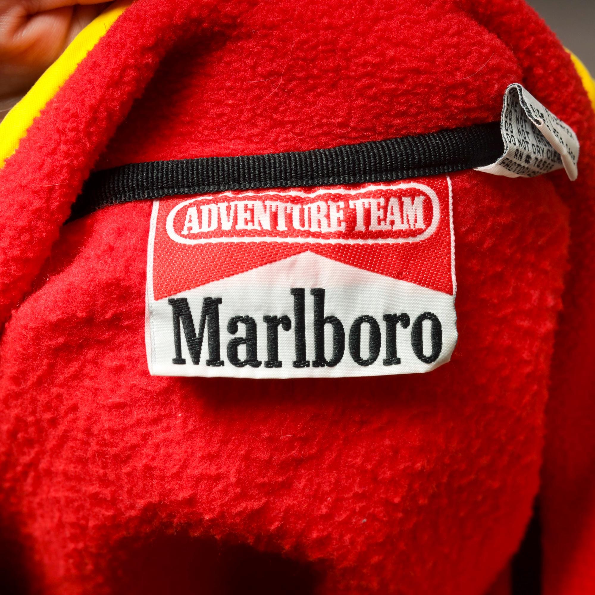 90s Marlboro Adventure Team snap-button pullover in red with black shoulder panels and yellow placket trim. High stand collar with five snap closures down a partial front opening, and a kangaroo pocket at the front. Embroidered "Adventure Team Marlboro" patch on the left sleeve, black binding along the hem and cuffs.