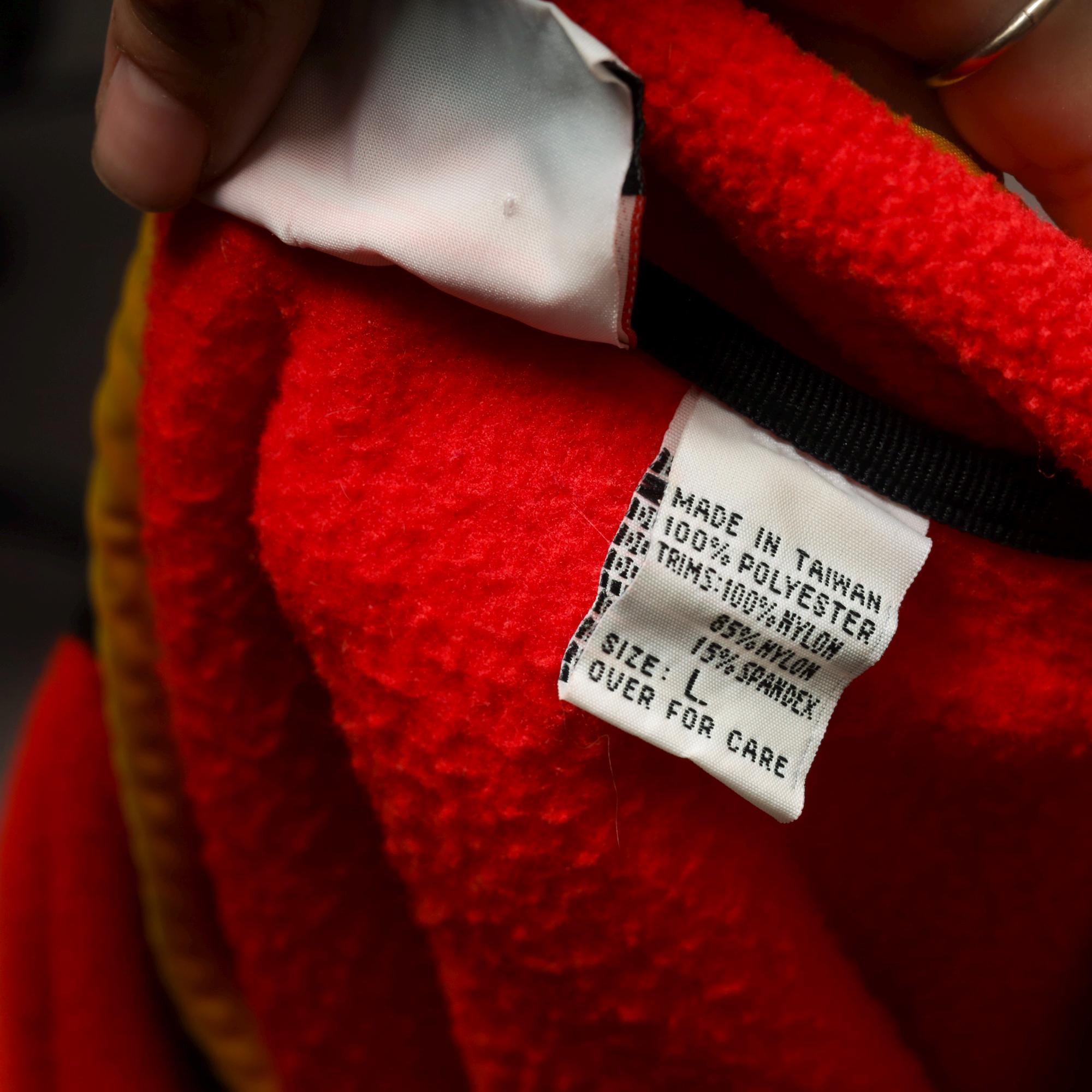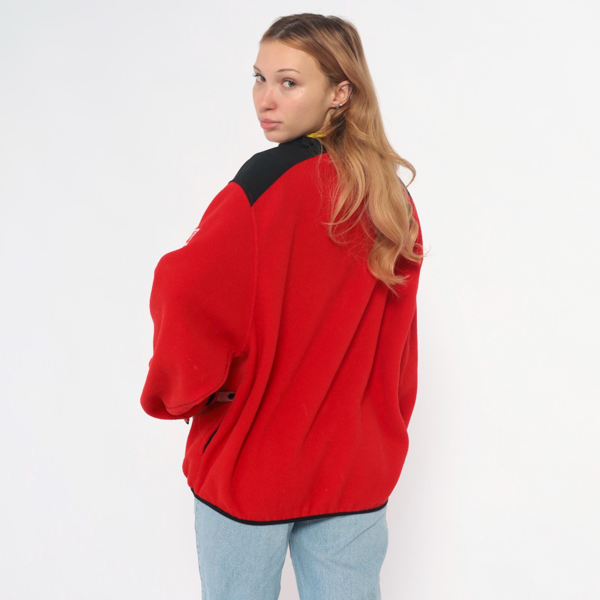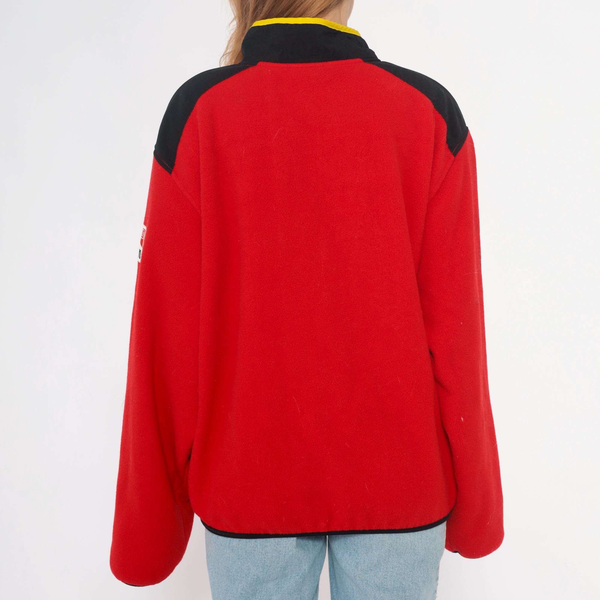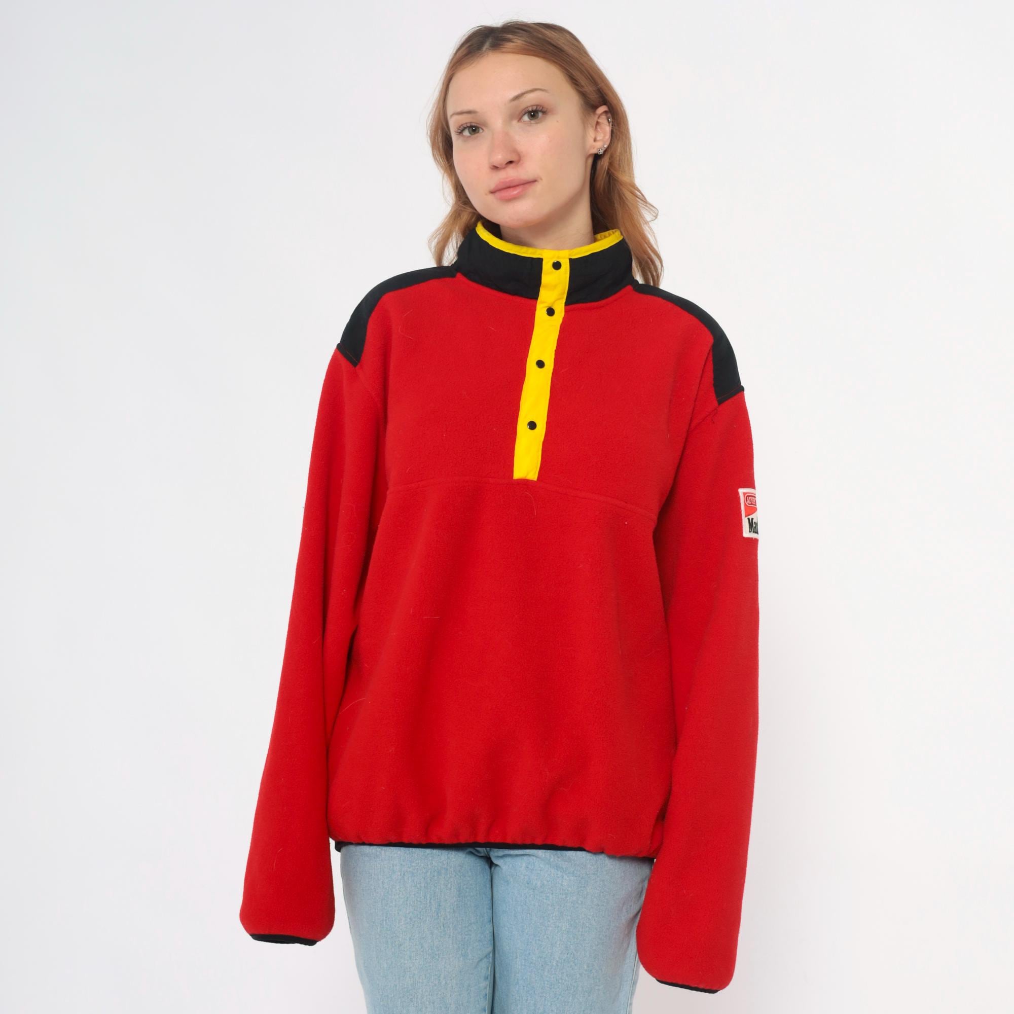 90s Marlboro Adventure Team snap-button pullover in red with black shoulder panels and yellow placket trim. High stand collar with five snap closures down a partial front opening, and a kangaroo pocket at the front. Embroidered "Adventure Team Marlboro" patch on the left sleeve, black binding along the hem and cuffs.