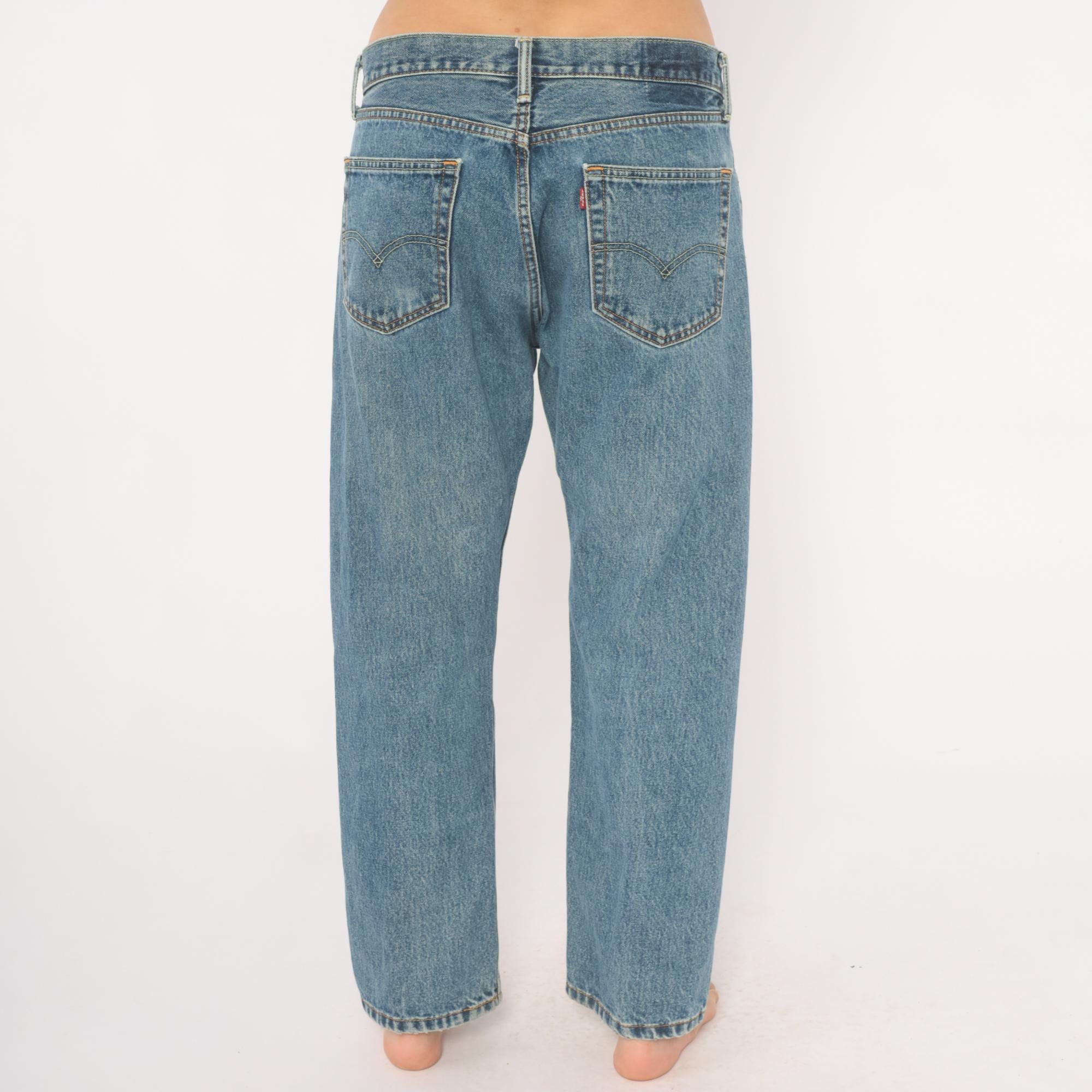2000s Levi's 501 jeans in a light stonewash blue denim with button fly closure and copper rivet details. Straight leg cut with a mid rise, five-pocket design, and signature arcuate stitching on both back pockets. Red Levi's tab on the right back pocket, belt loops, and contrast gold topstitching throughout.