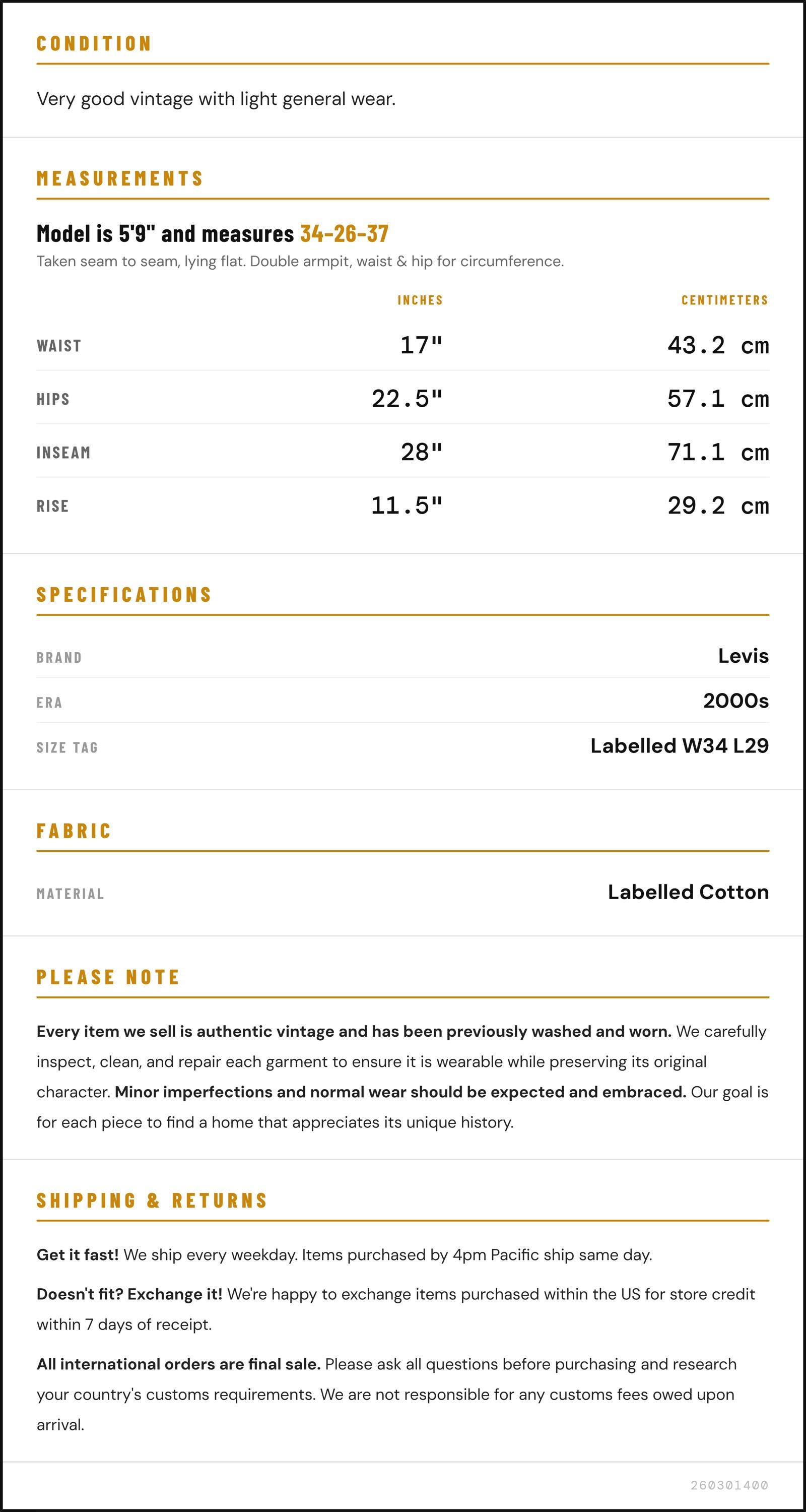 Vintage denim was usually made without any stretch, unlike modern jeans. Check the measurements to ensure proper fit, and remember to give yourself a little wiggle room in the waist and hips, depending on your preferred fit.