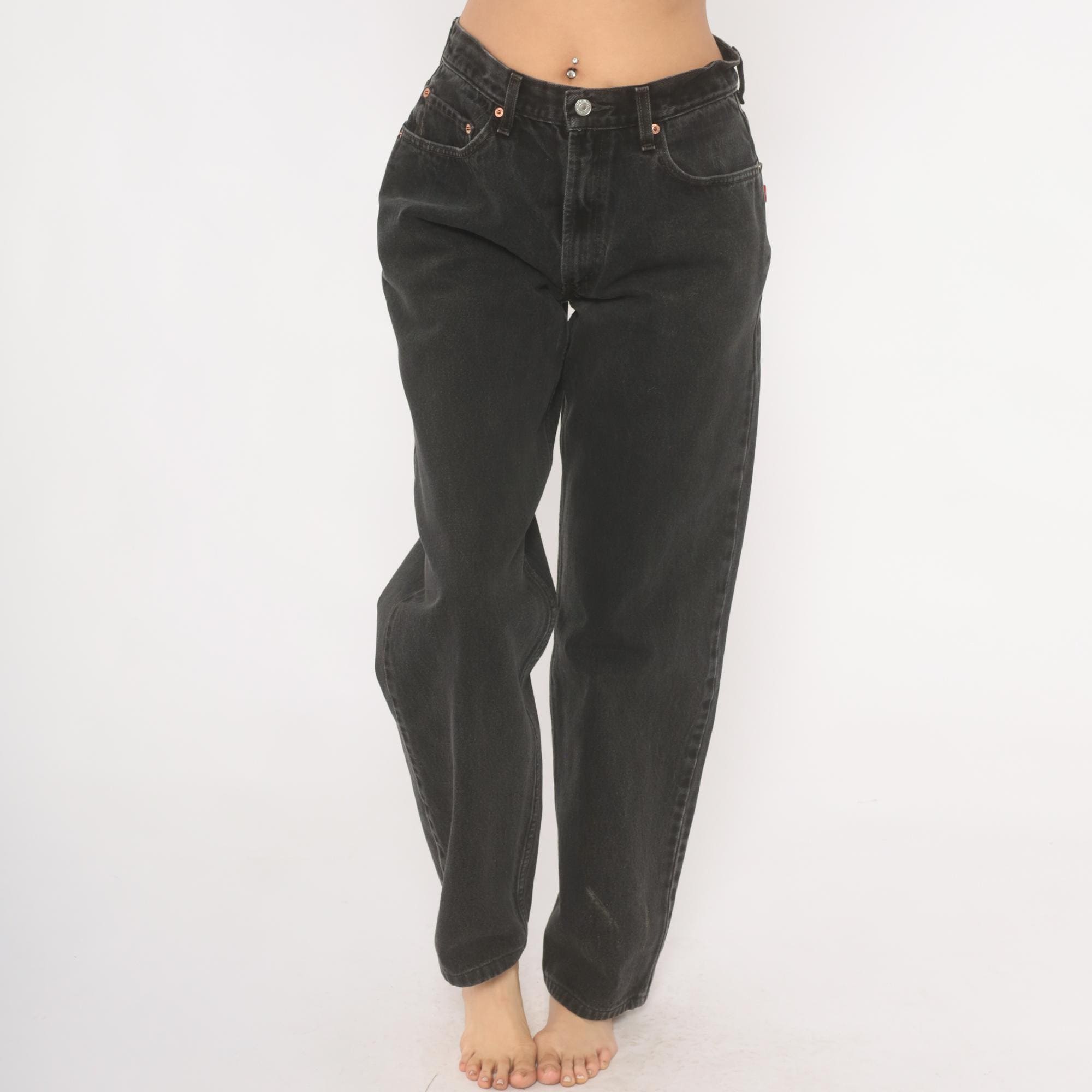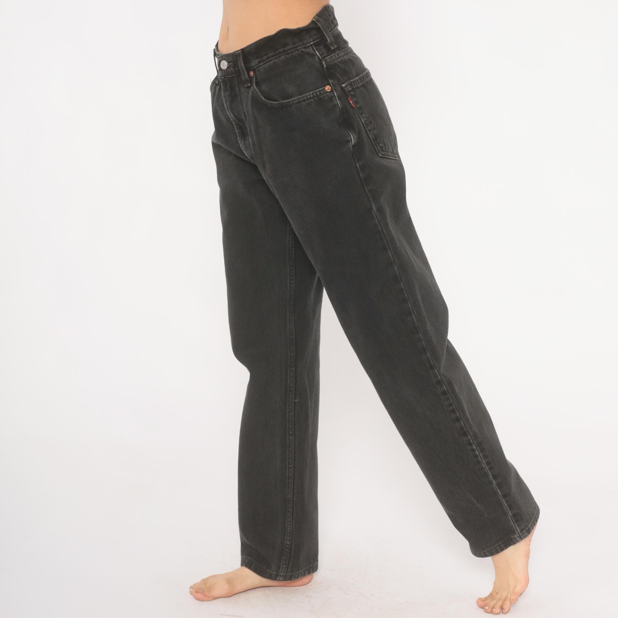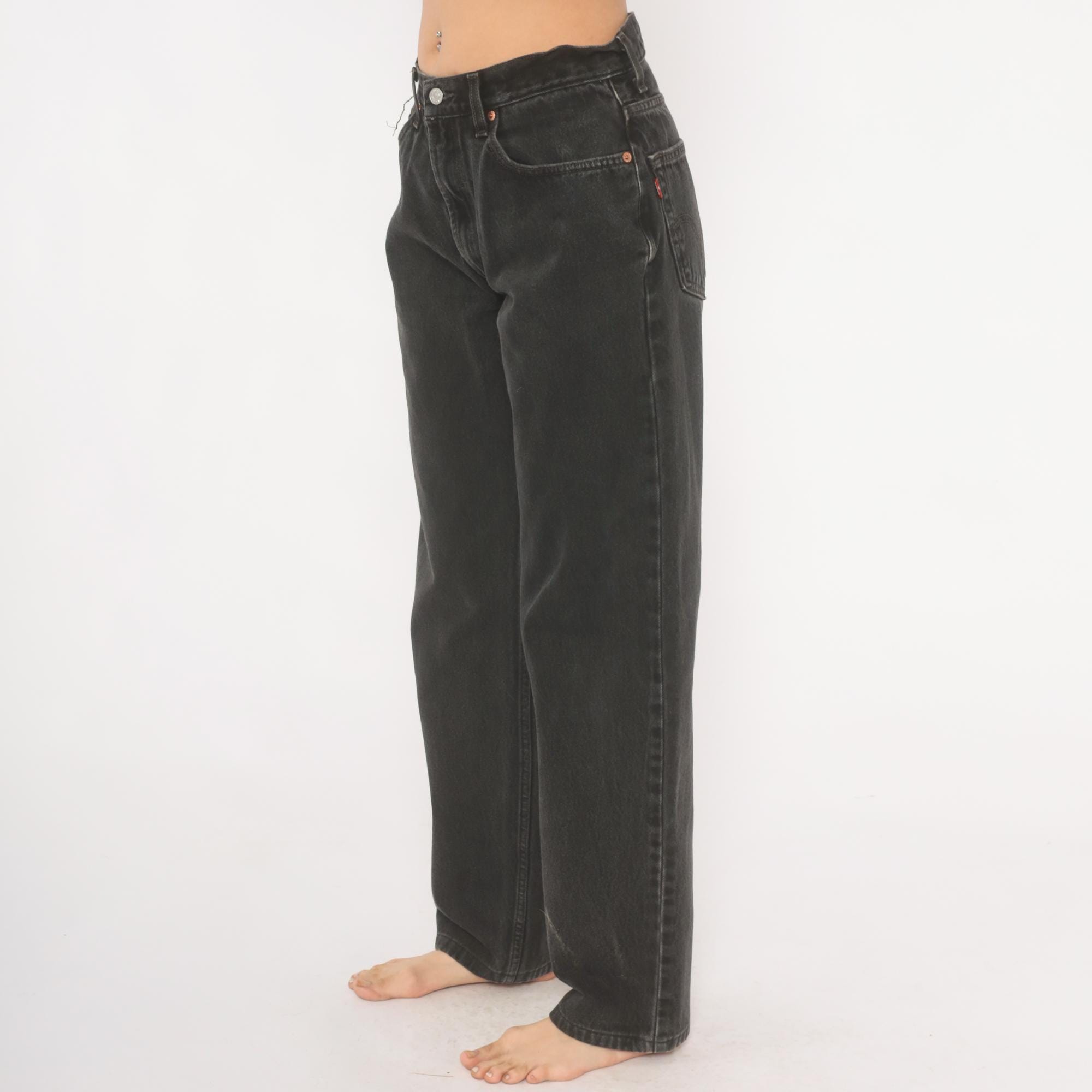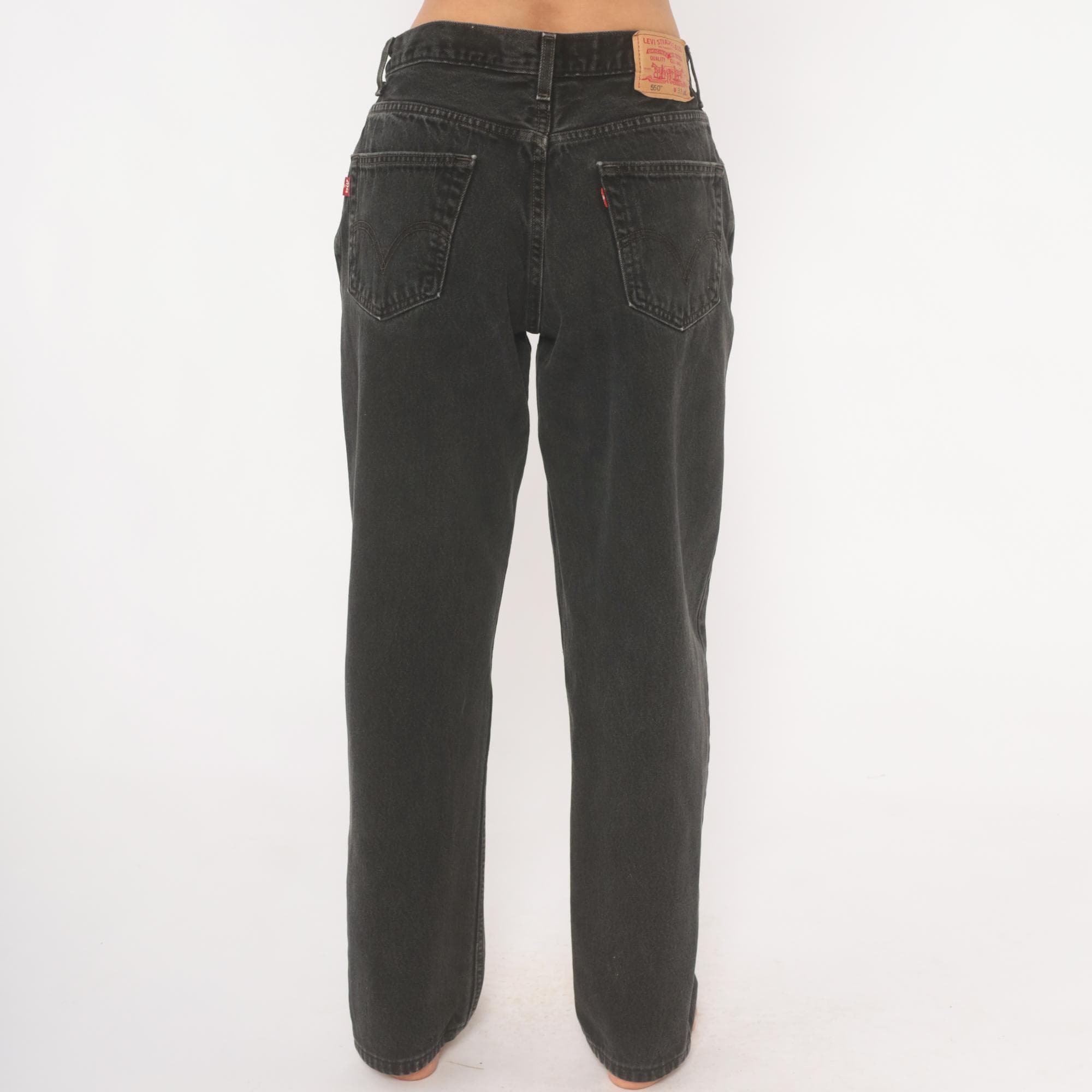 Faded black Levi's 550 jeans from the 2000s with a high rise and relaxed, tapered straight leg. Button and zipper front closure, five-pocket construction with copper rivets and signature arcuate stitching on back pockets. Red tab on the right back pocket and leather brand patch at the waistband. Charcoal wash with natural fading throughout.