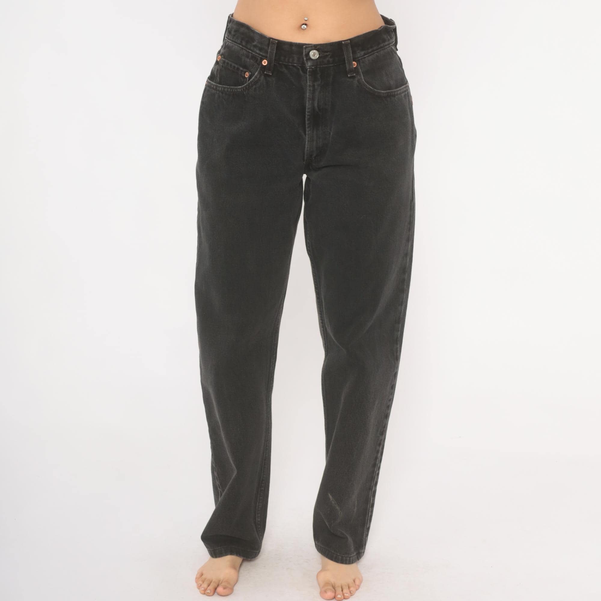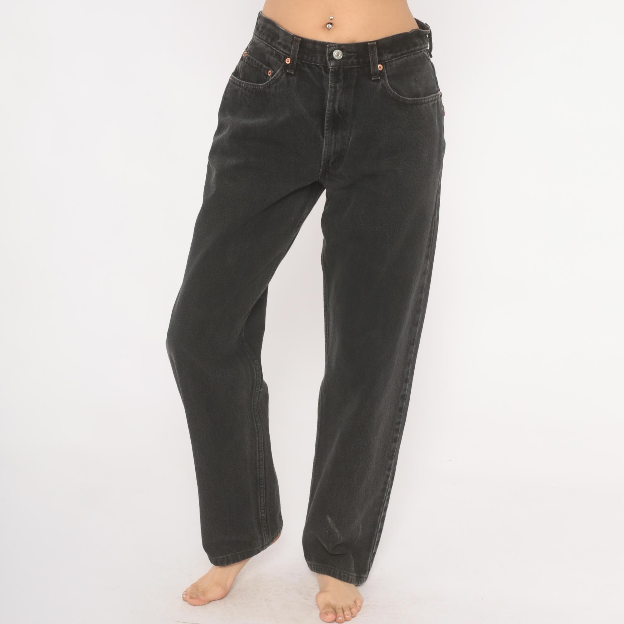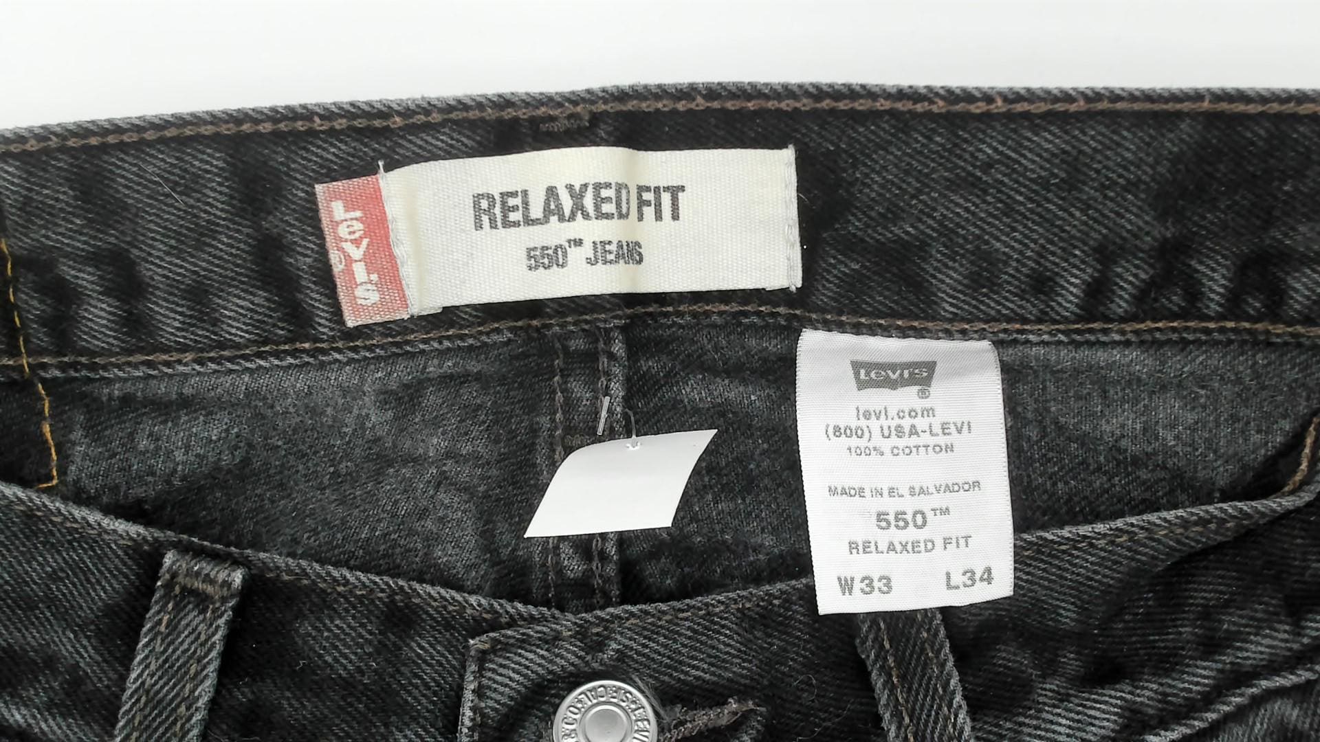 Faded black Levi's 550 jeans from the 2000s with a high rise and relaxed, tapered straight leg. Button and zipper front closure, five-pocket construction with copper rivets and signature arcuate stitching on back pockets. Red tab on the right back pocket and leather brand patch at the waistband. Charcoal wash with natural fading throughout.