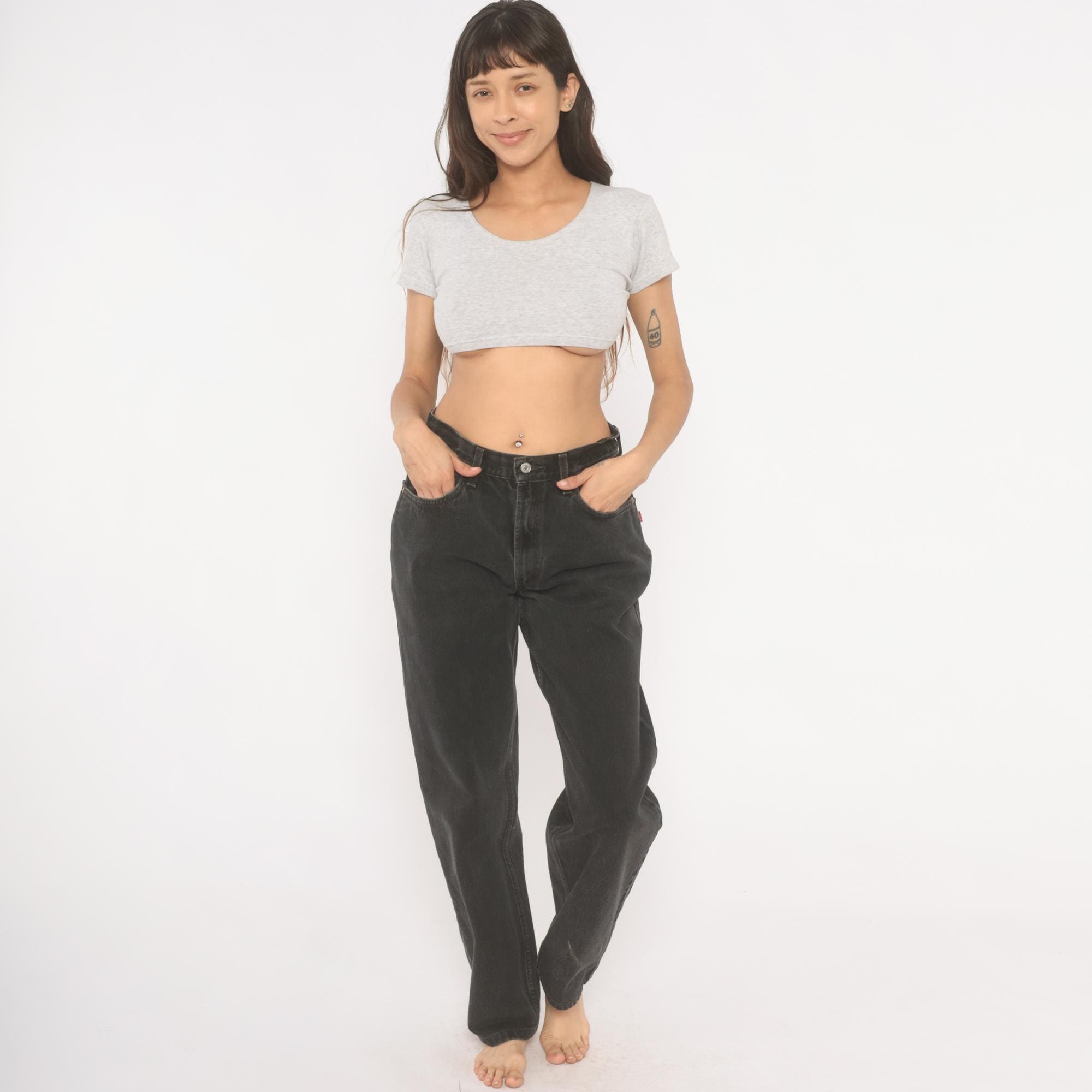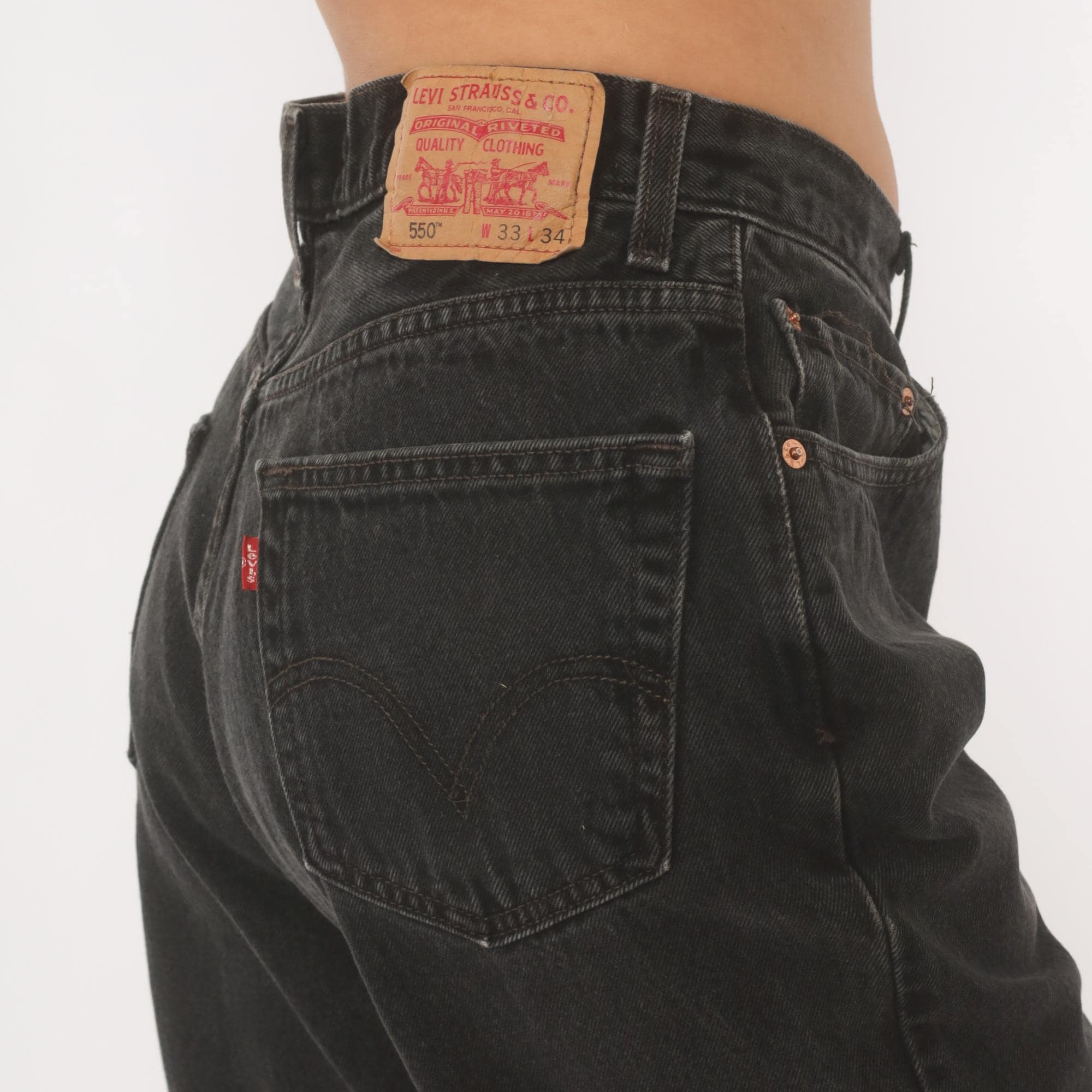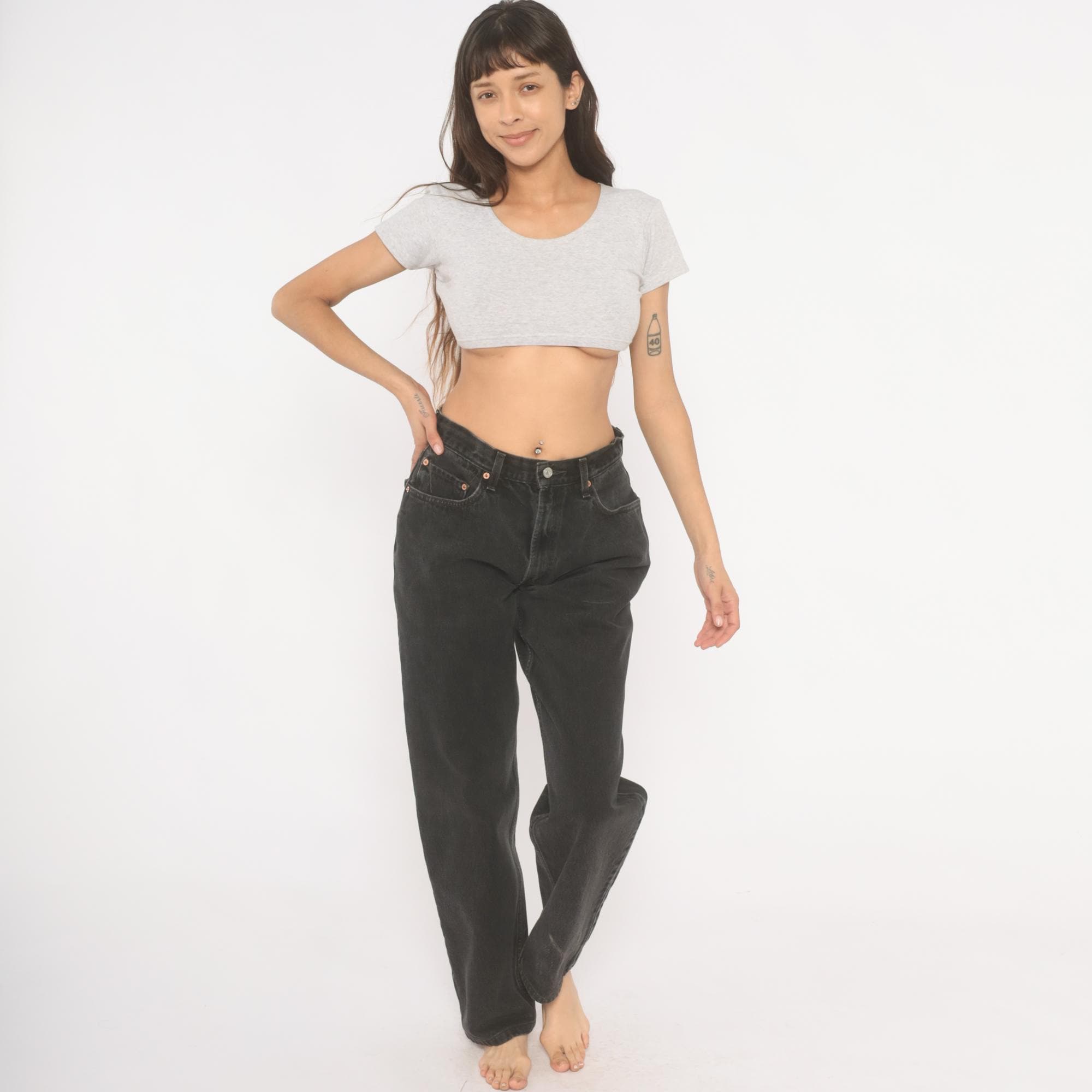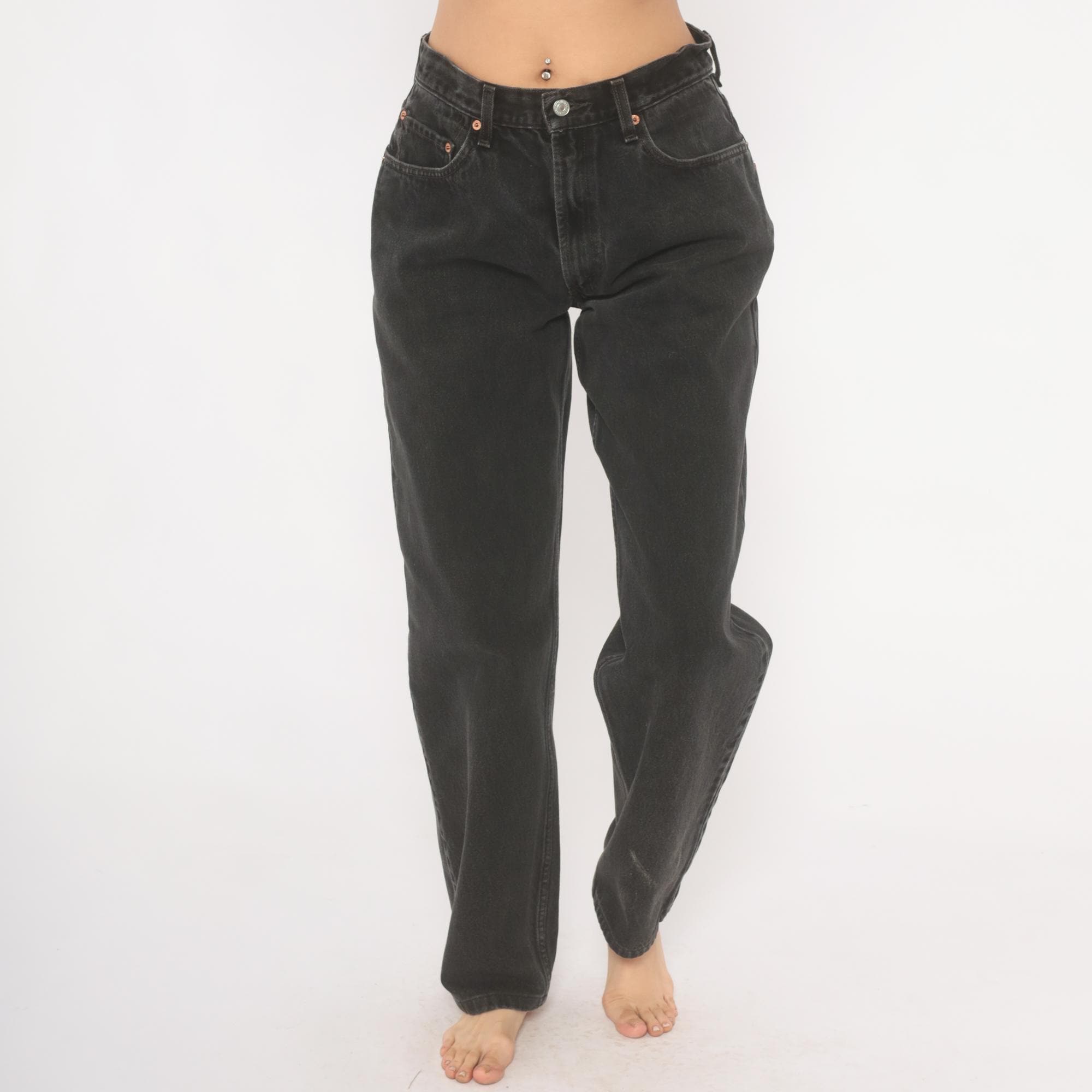 Faded black Levi's 550 jeans from the 2000s with a high rise and relaxed, tapered straight leg. Button and zipper front closure, five-pocket construction with copper rivets and signature arcuate stitching on back pockets. Red tab on the right back pocket and leather brand patch at the waistband. Charcoal wash with natural fading throughout.