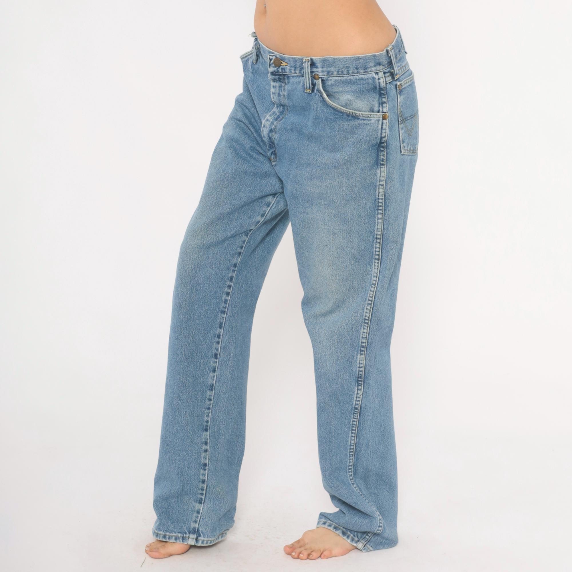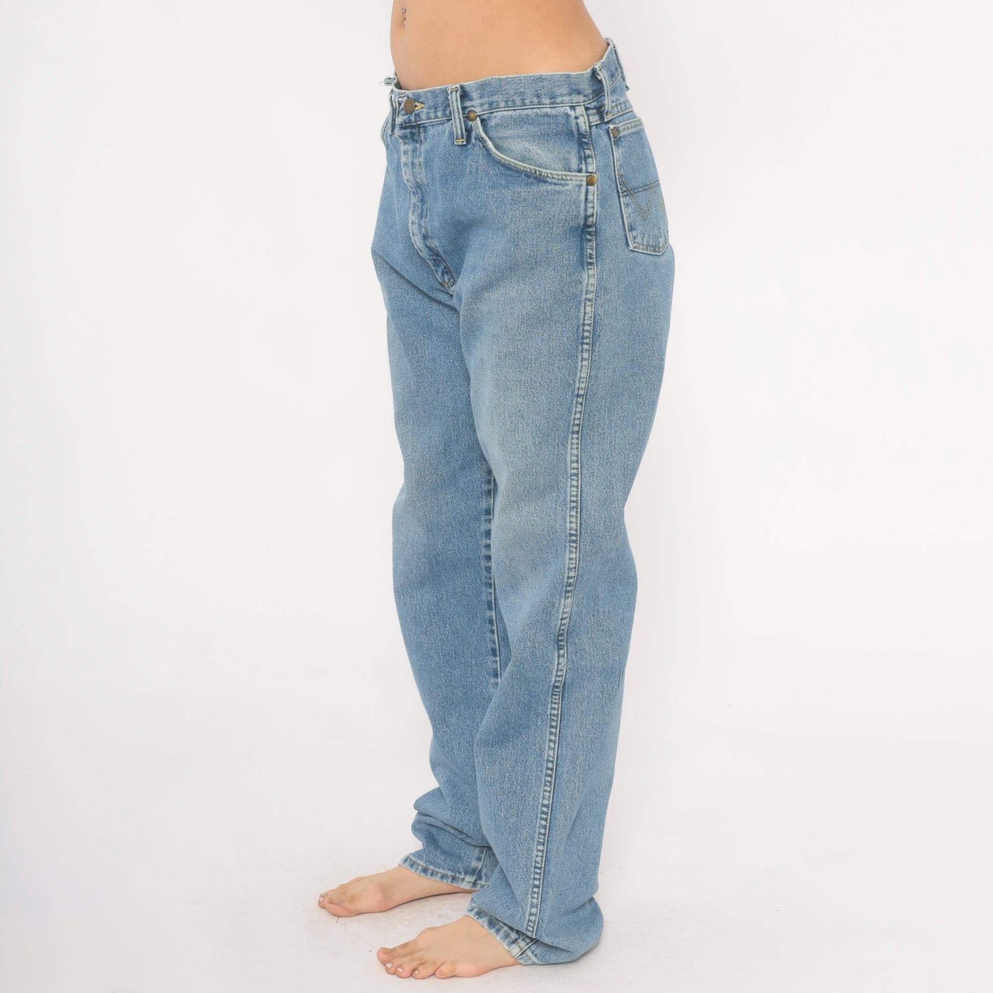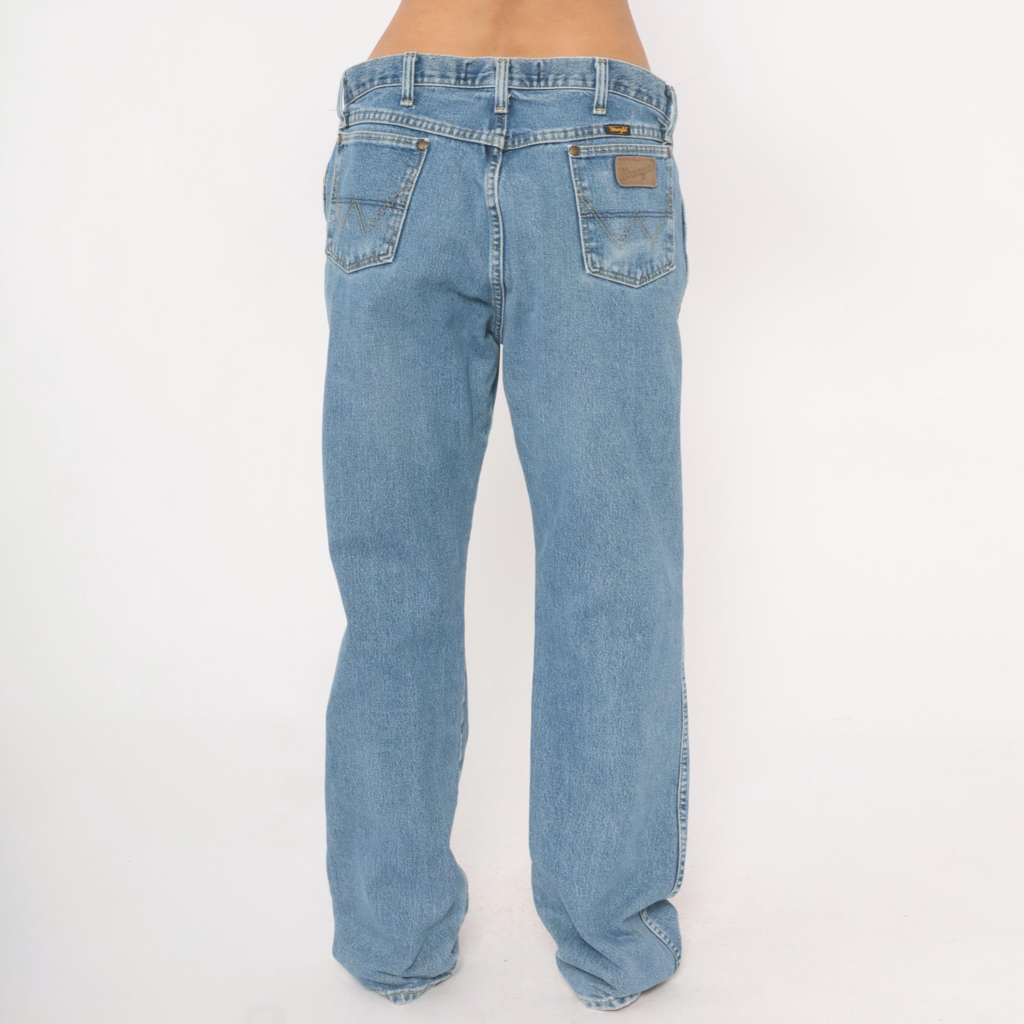 90s Wrangler straight leg jeans in a light blue stonewash with natural fading throughout. Five-pocket construction with brass rivets, zipper fly with button closure, and belt loops along the waistband. Signature W stitching on both back pockets and a leather Wrangler patch on the back right pocket.