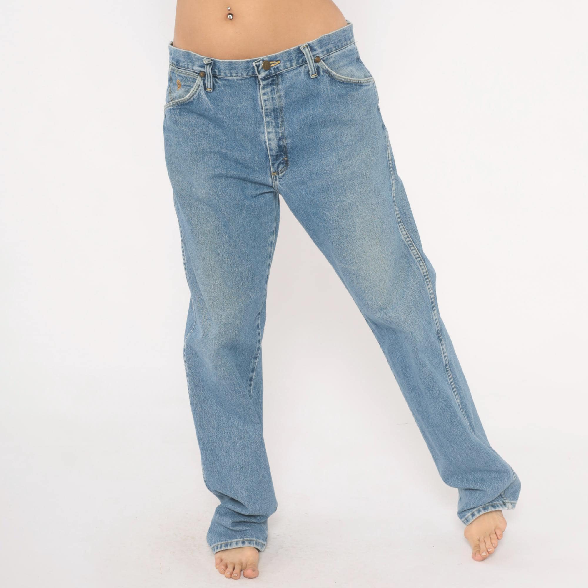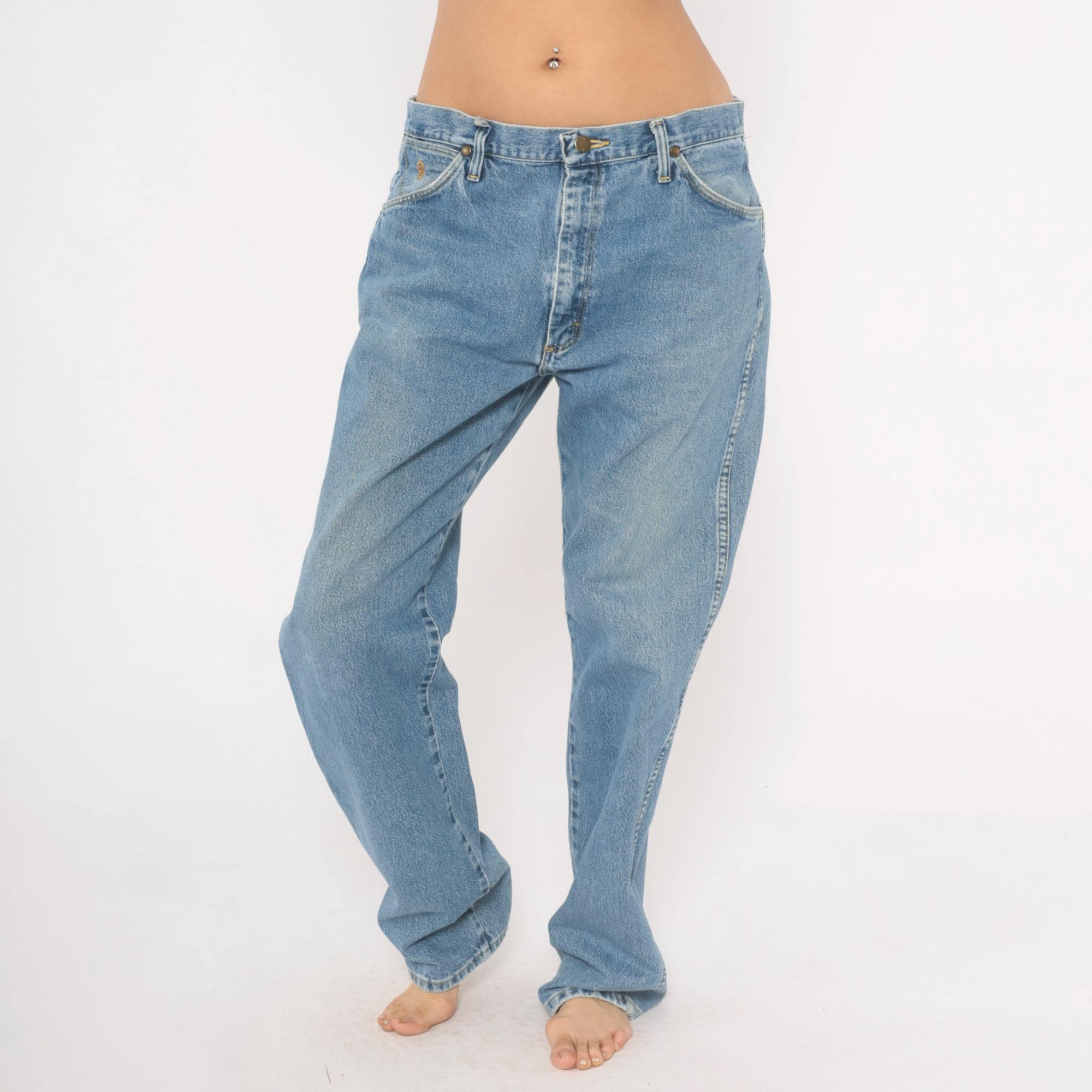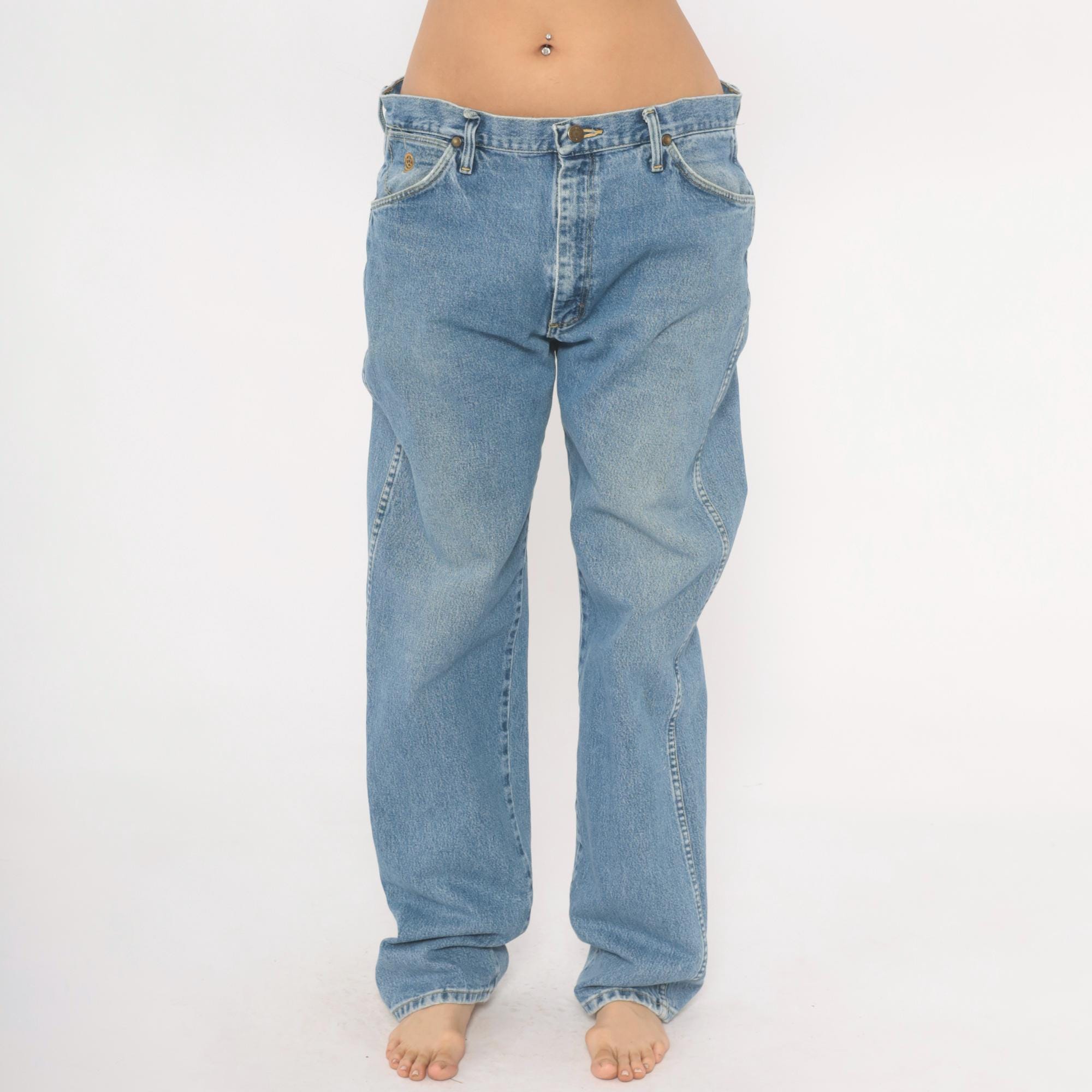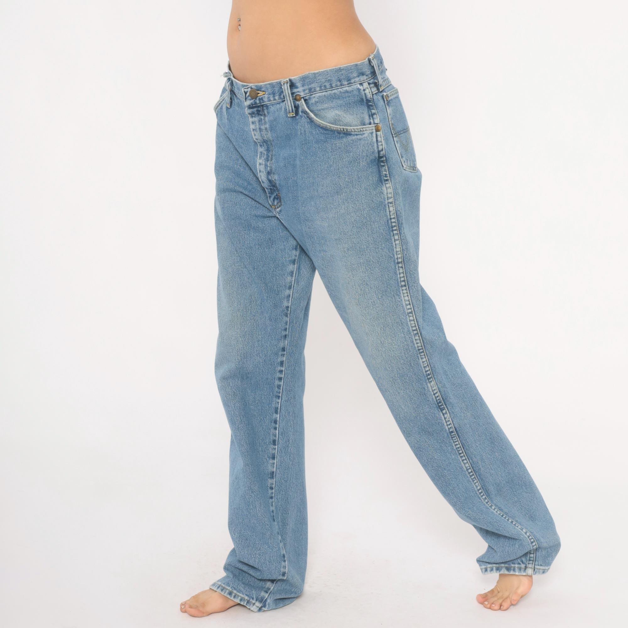 90s Wrangler straight leg jeans in a light blue stonewash with natural fading throughout. Five-pocket construction with brass rivets, zipper fly with button closure, and belt loops along the waistband. Signature W stitching on both back pockets and a leather Wrangler patch on the back right pocket.