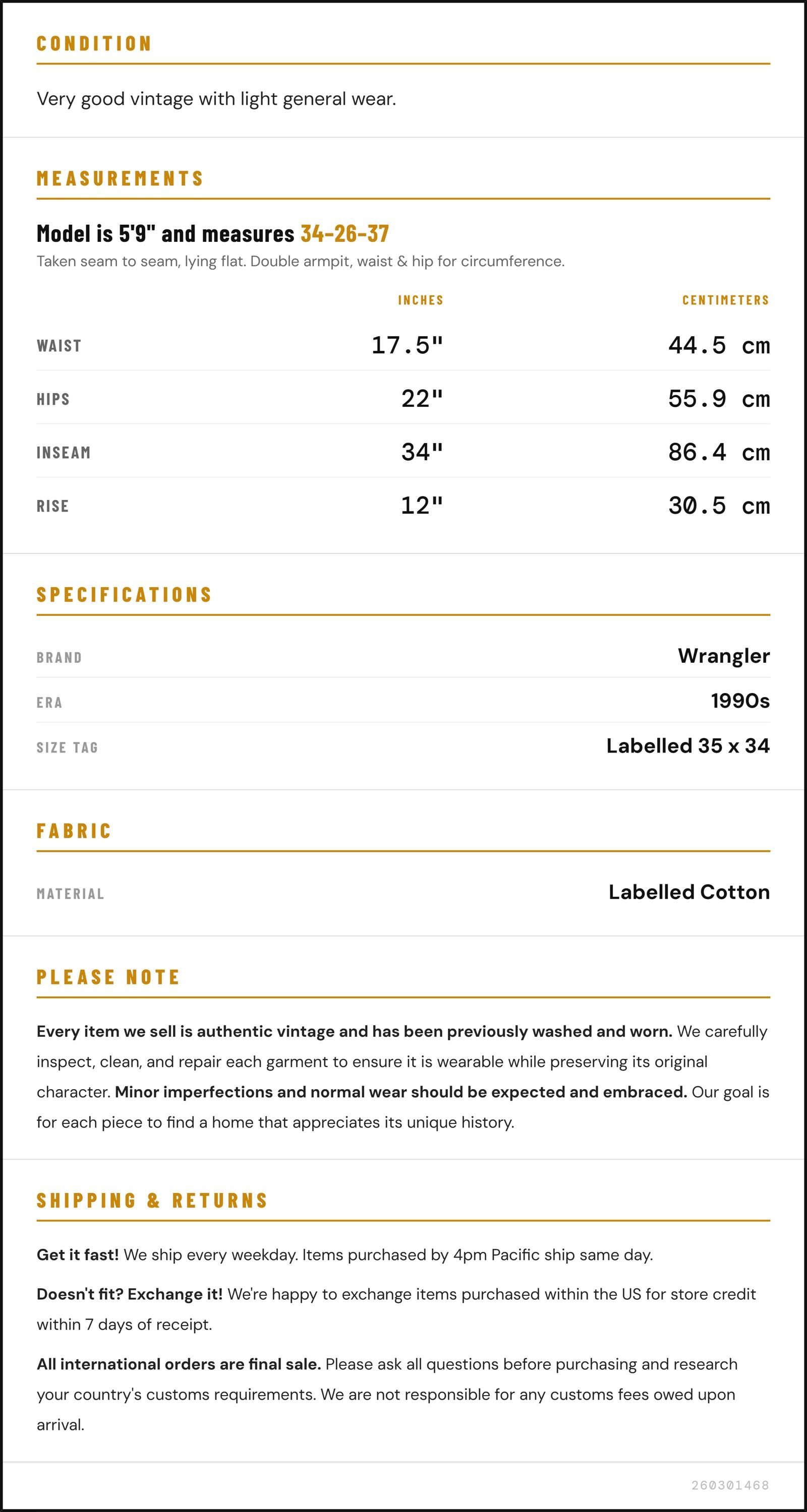 Vintage denim was usually made without any stretch, unlike modern jeans. Check the measurements to ensure proper fit, and remember to give yourself a little wiggle room in the waist and hips, depending on your preferred fit.