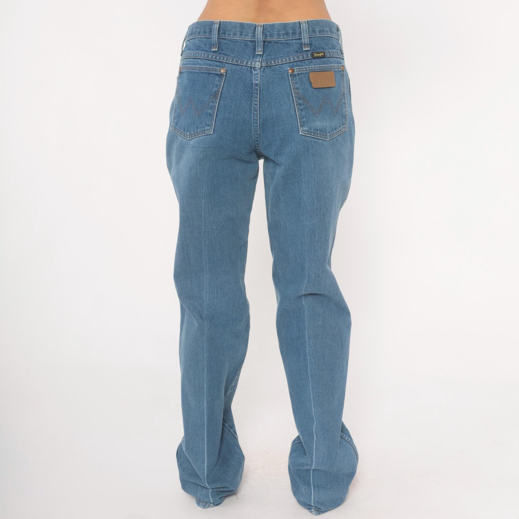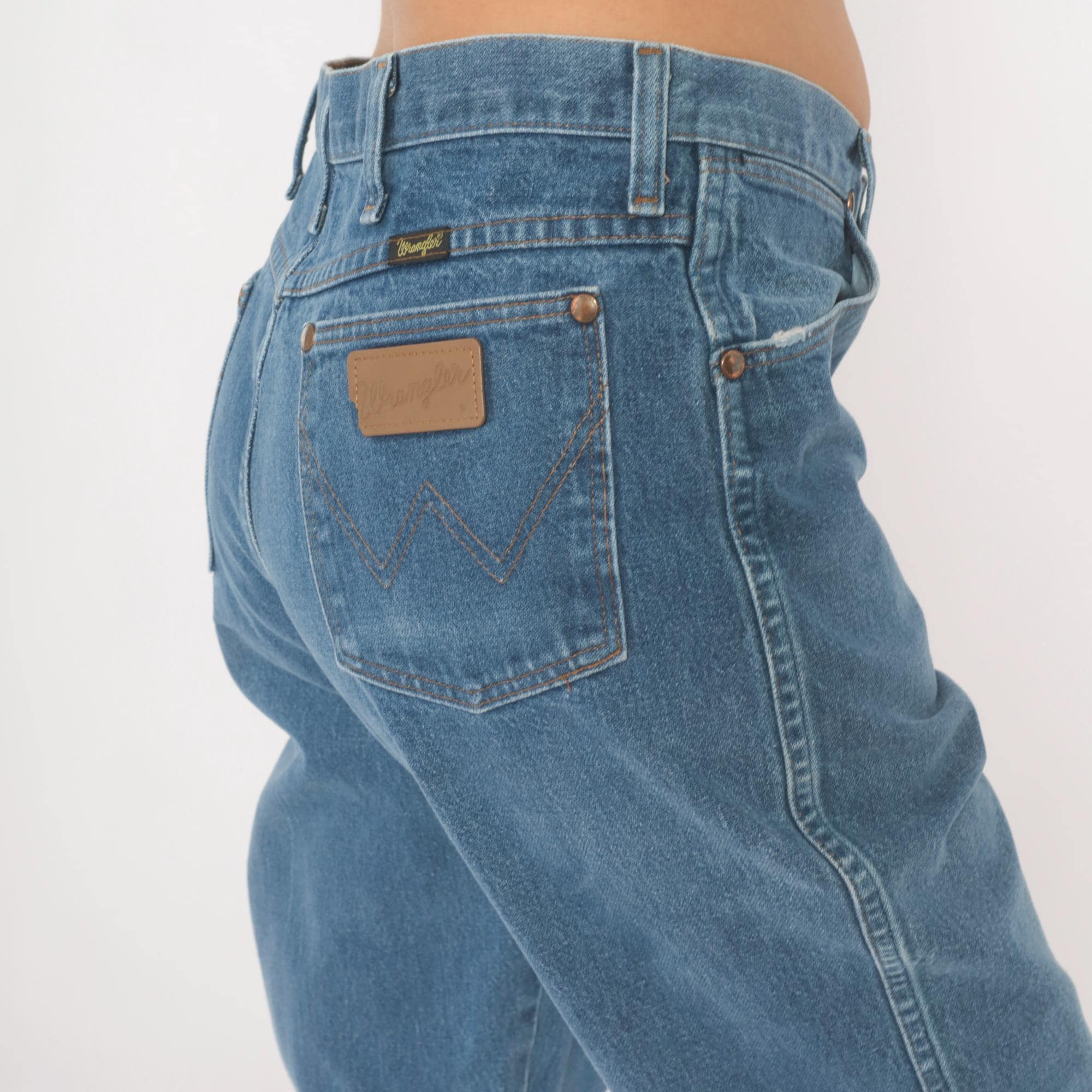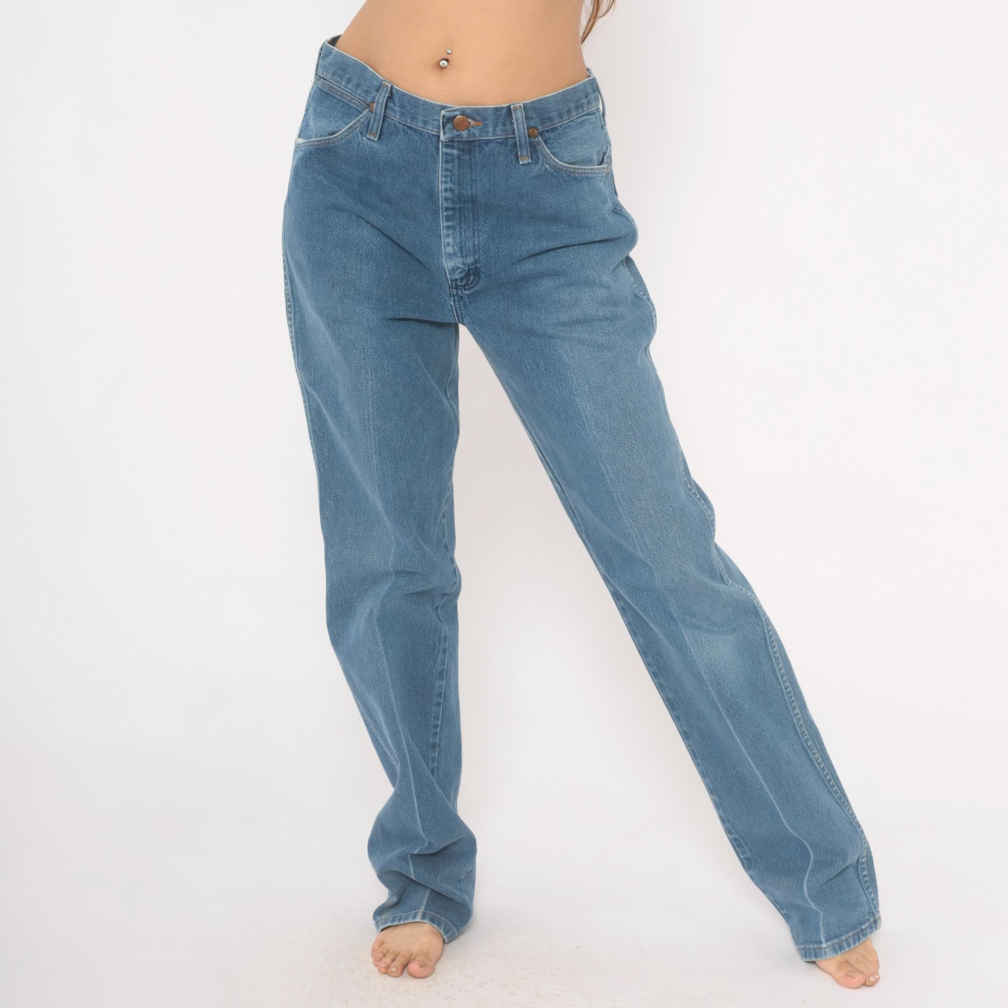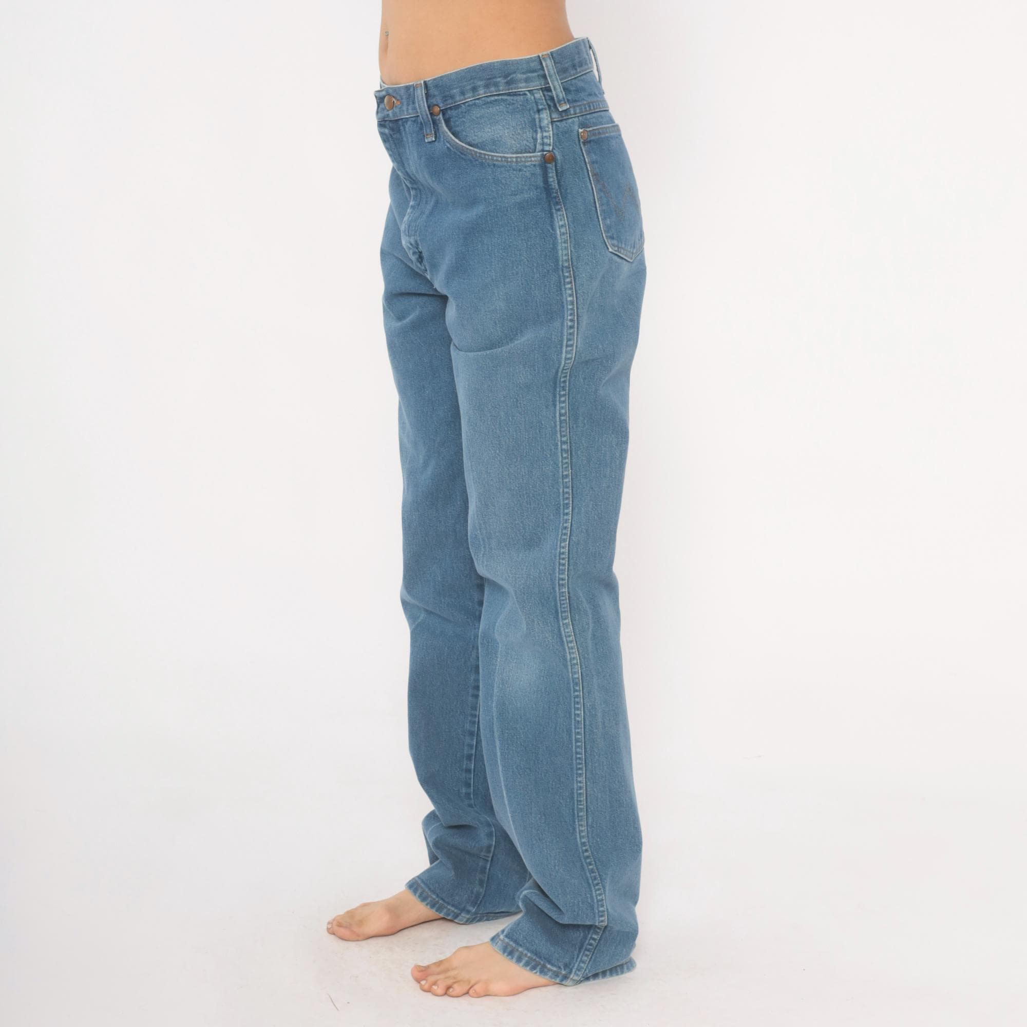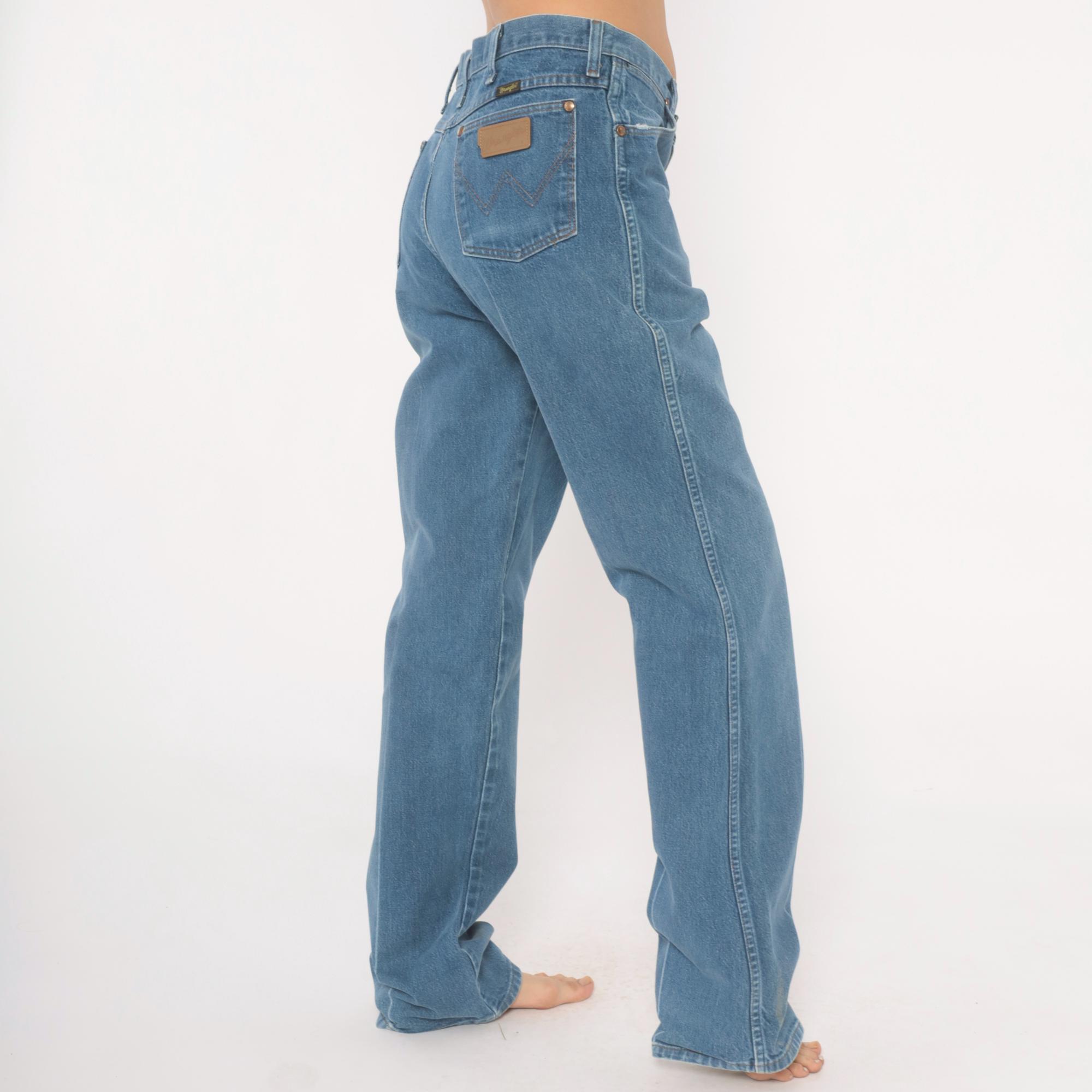 90s Wrangler straight leg jeans in a medium blue faded wash with copper rivets and signature W-stitching on the back pockets. Five-pocket construction with belt loops, front zipper, and button closure. Leather brand patch on the right rear pocket and embroidered Wrangler label on the waistband.