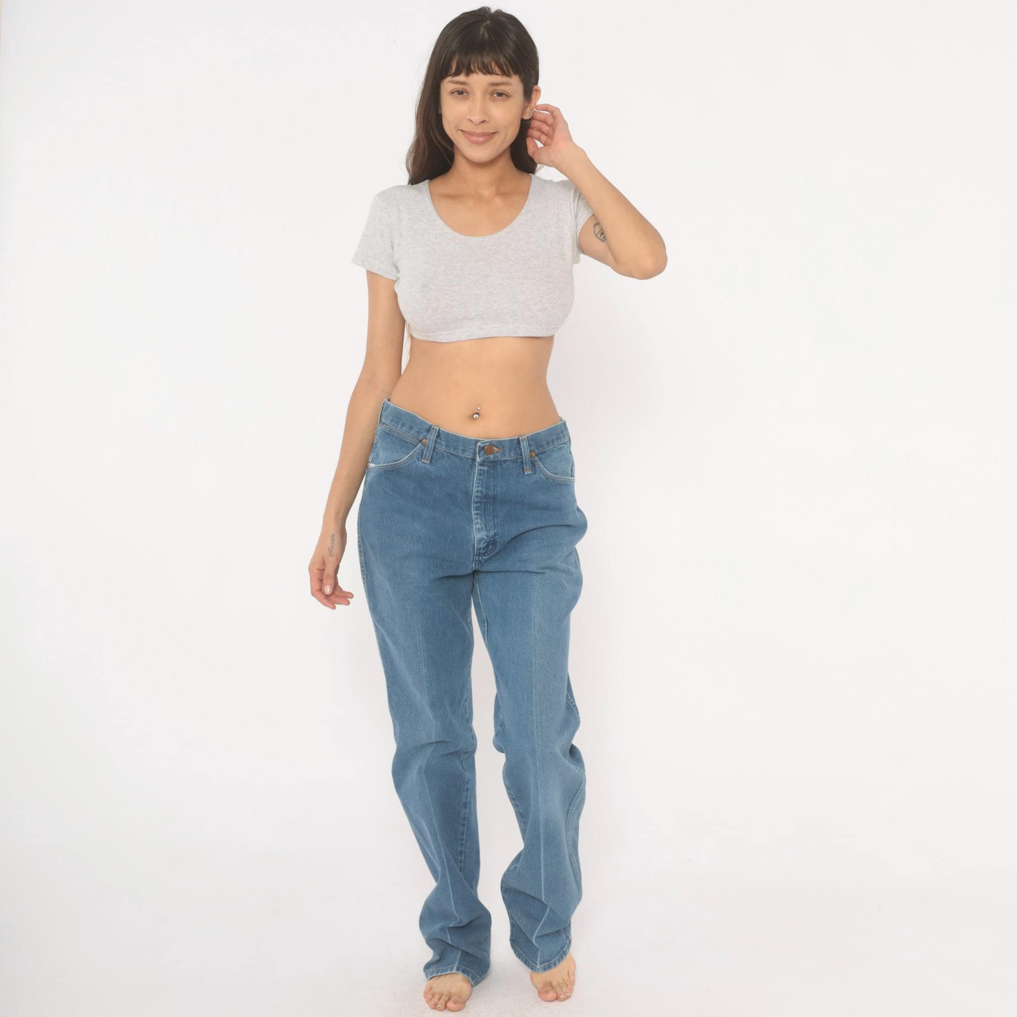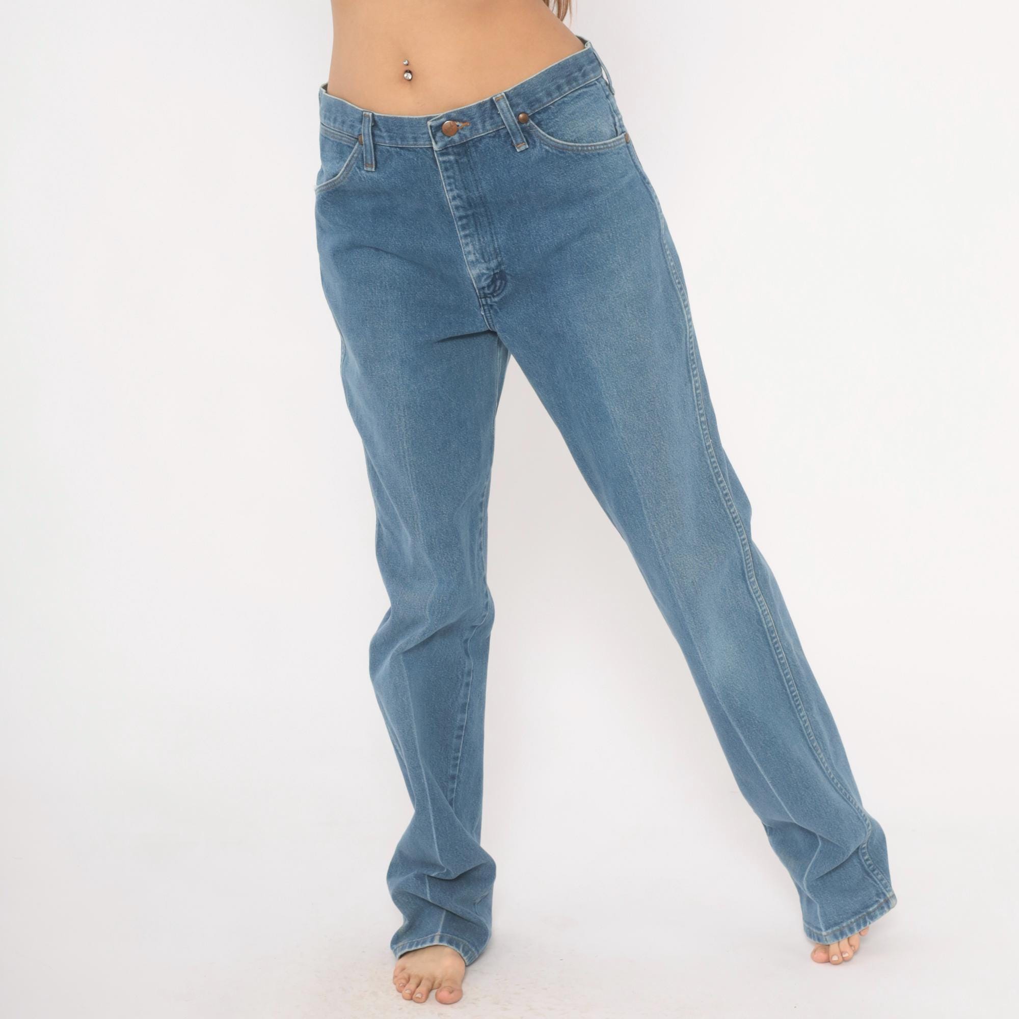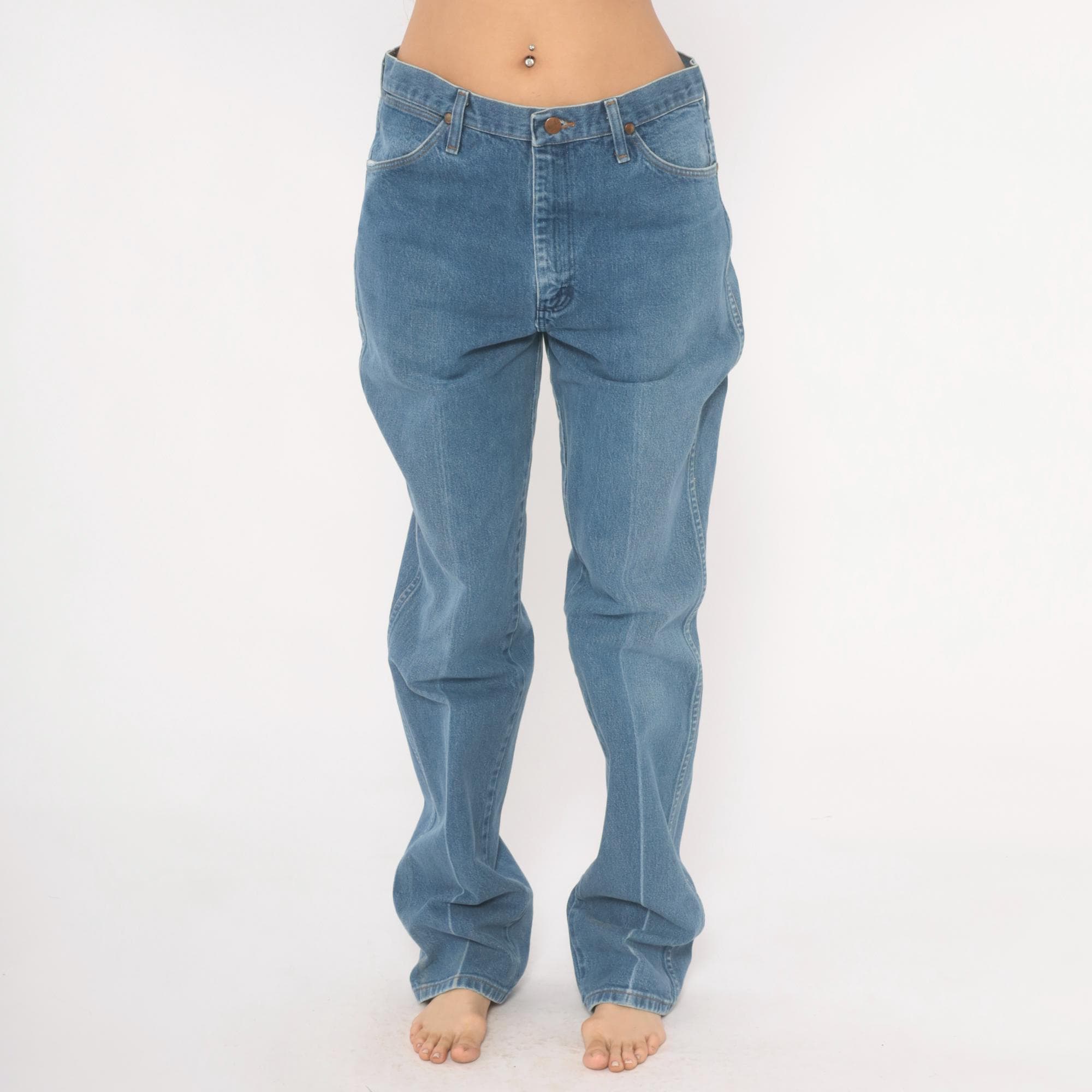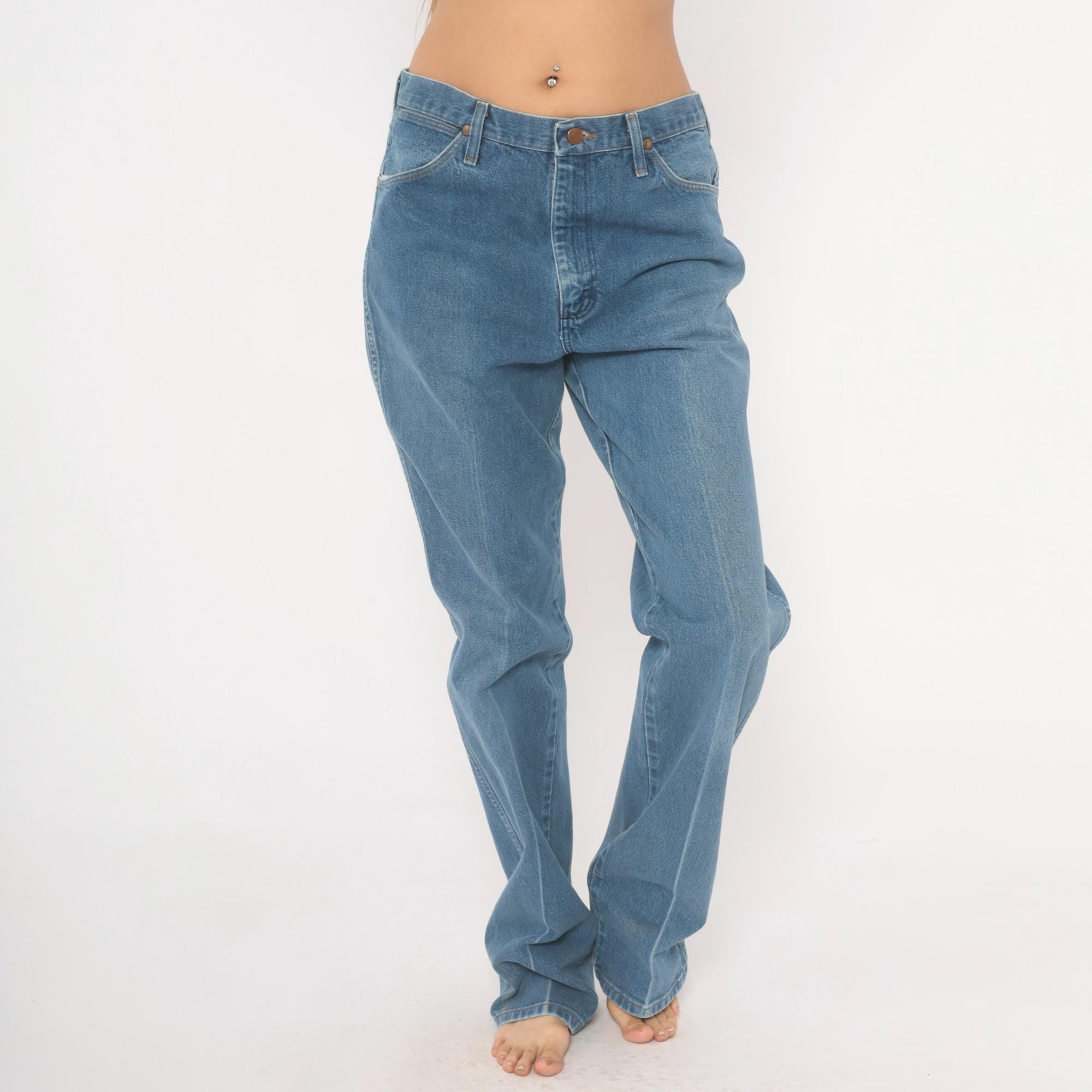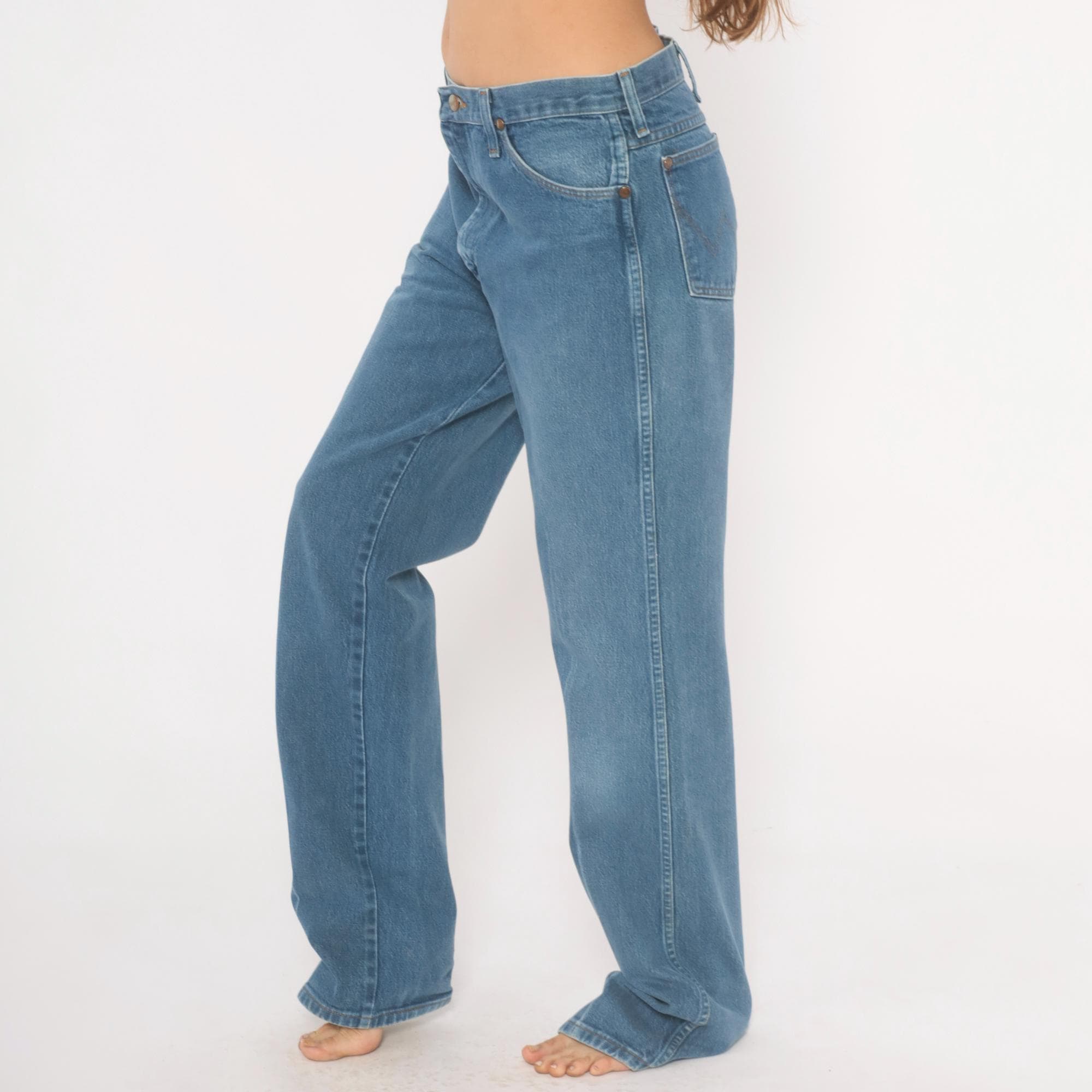 90s Wrangler straight leg jeans in a medium blue faded wash with copper rivets and signature W-stitching on the back pockets. Five-pocket construction with belt loops, front zipper, and button closure. Leather brand patch on the right rear pocket and embroidered Wrangler label on the waistband.