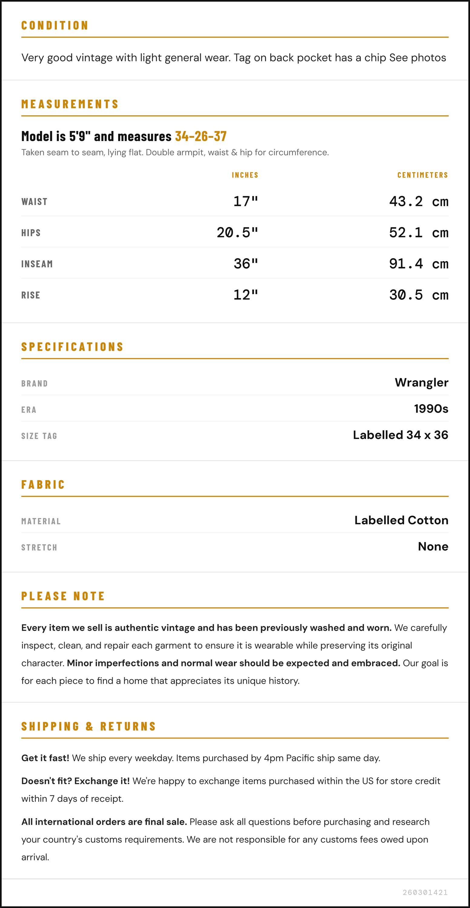Vintage denim was usually made without any stretch, unlike modern jeans. Check the measurements to ensure proper fit, and remember to give yourself a little wiggle room in the waist and hips, depending on your preferred fit.