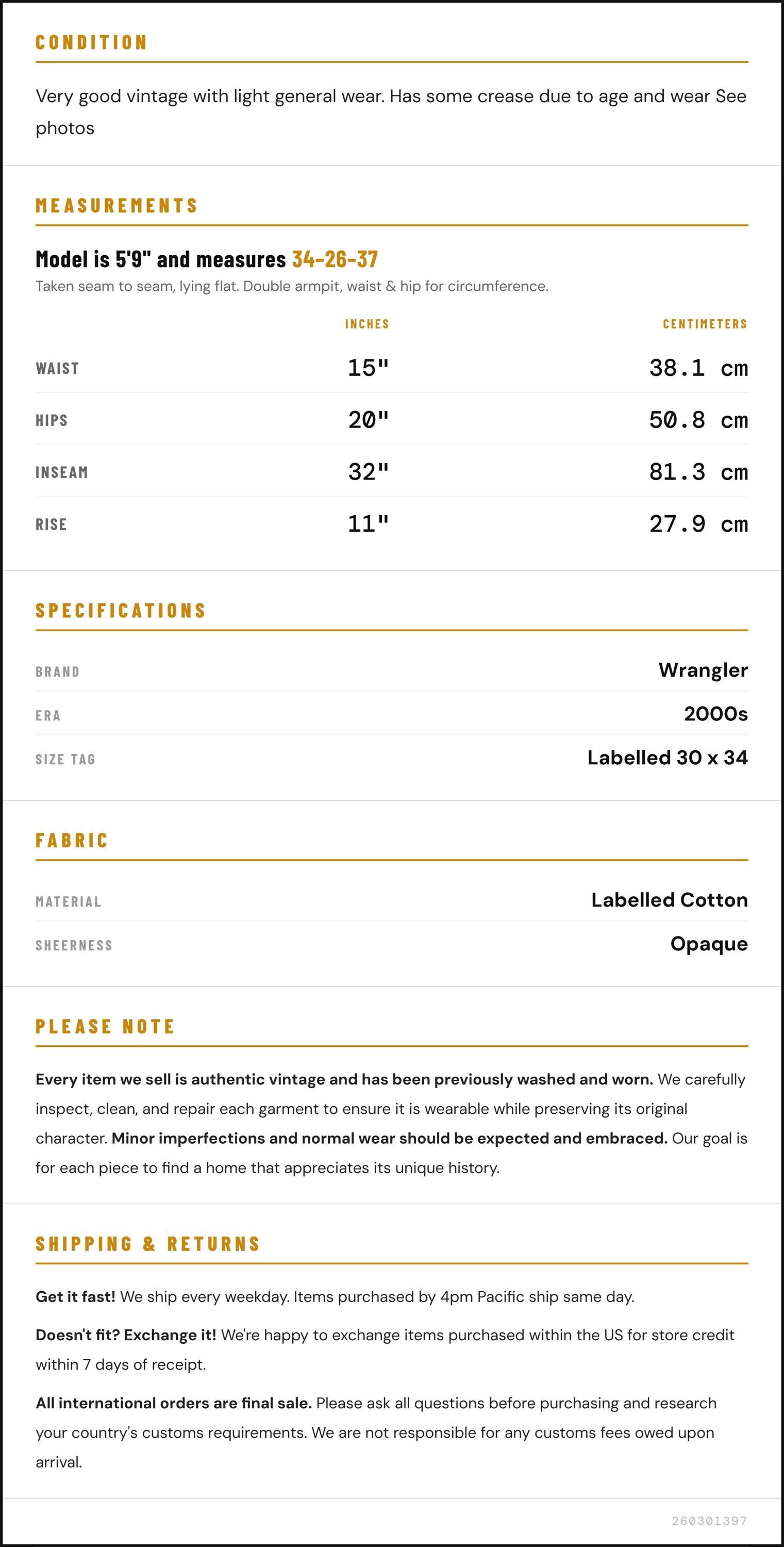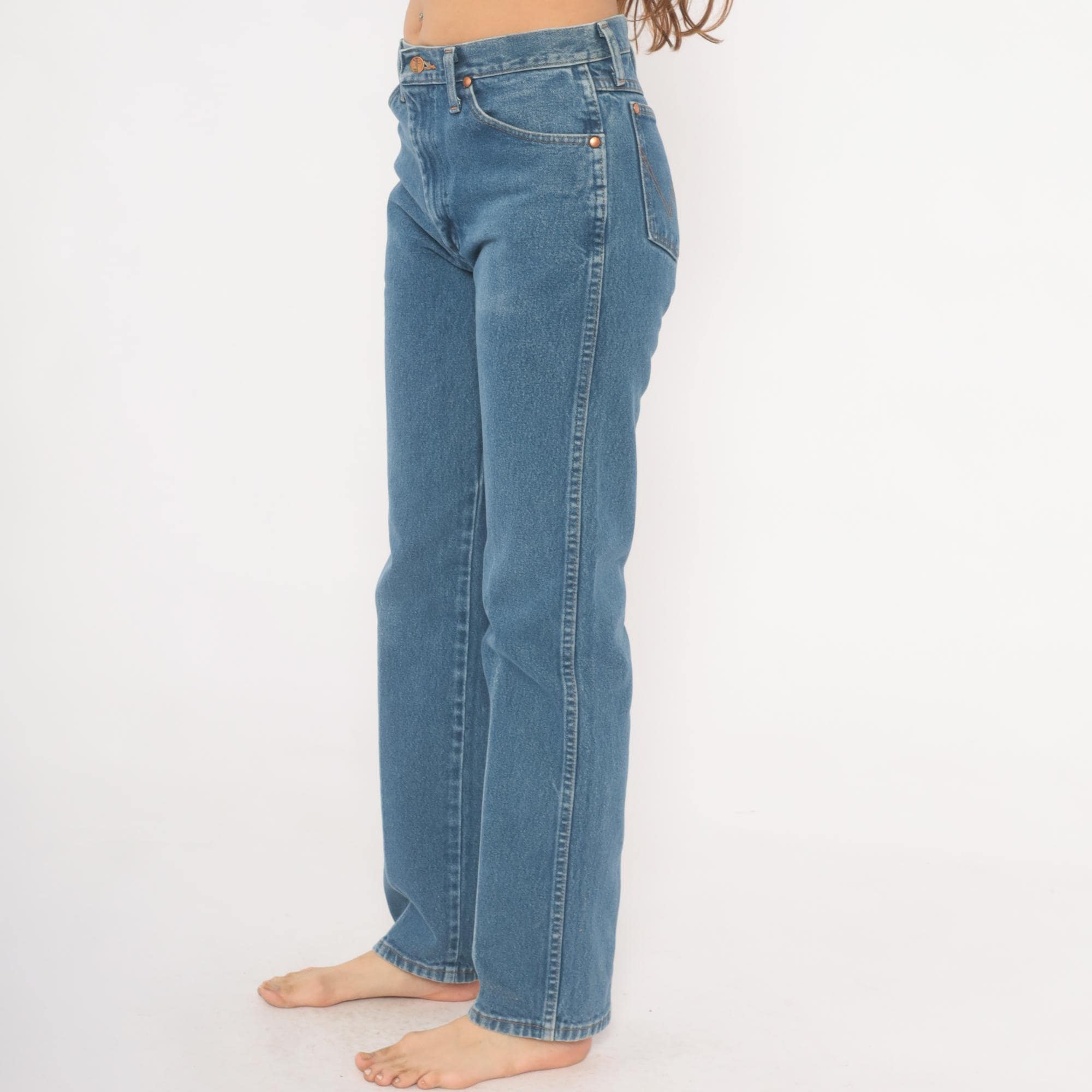 Vintage denim was usually made without any stretch, unlike modern jeans. Check the measurements to ensure proper fit, and remember to give yourself a little wiggle room in the waist and hips, depending on your preferred fit.