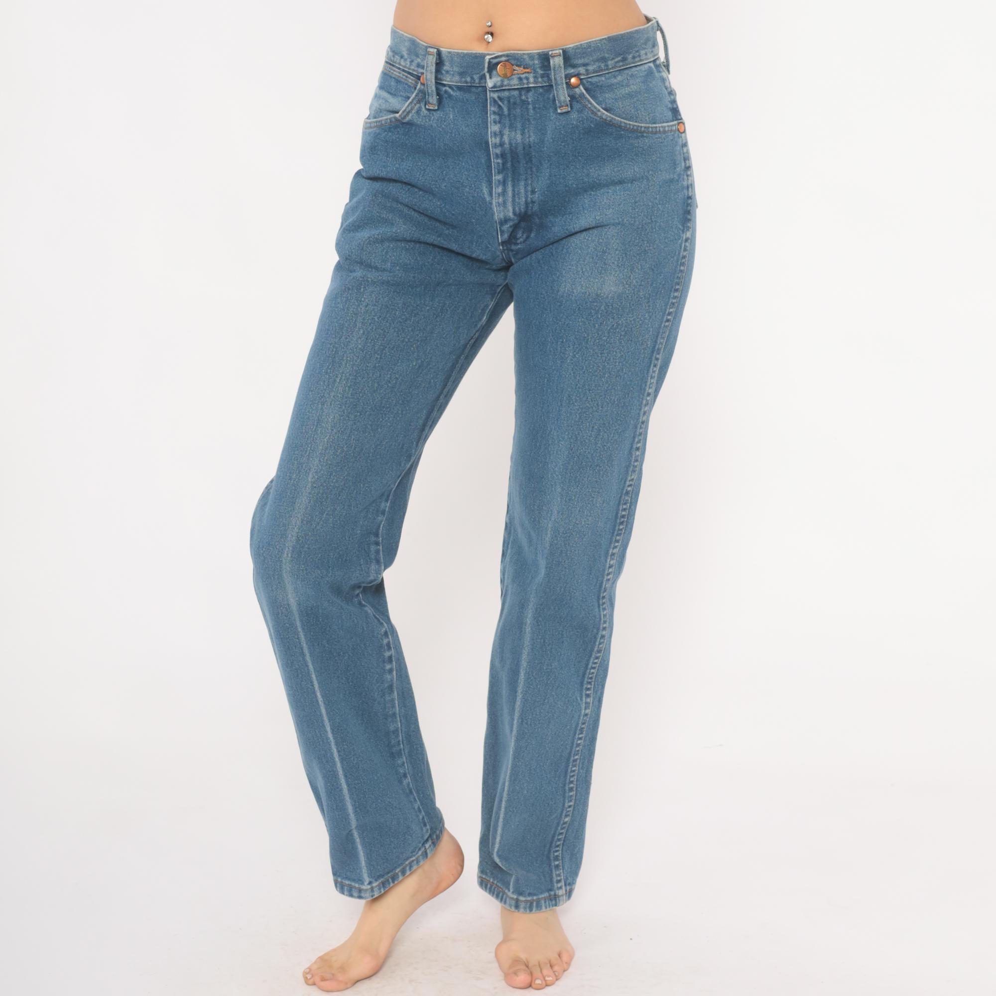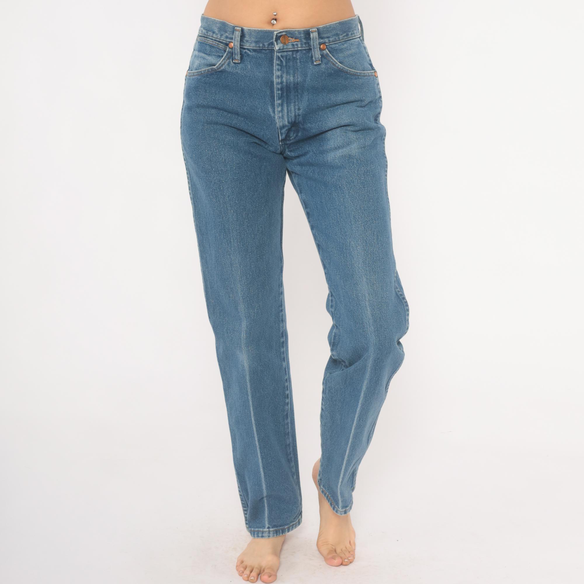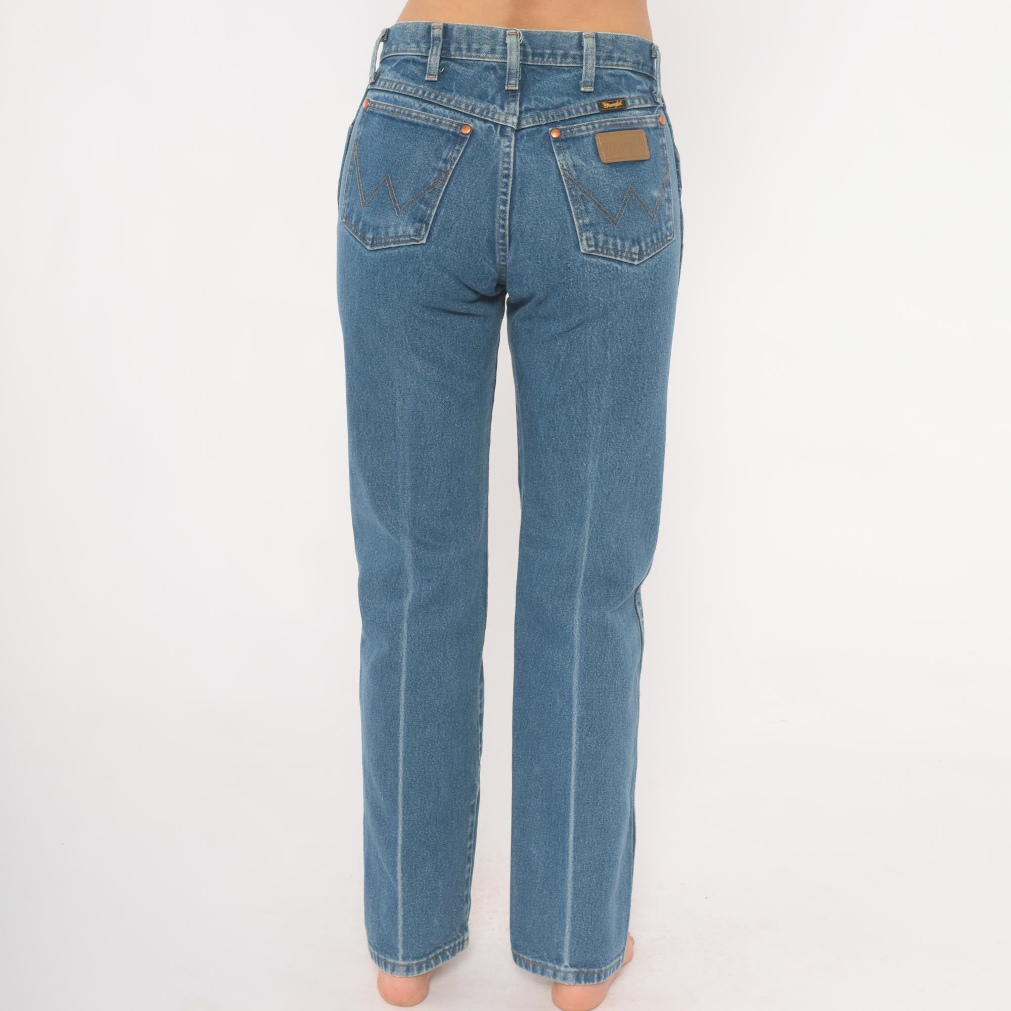 2000s Wrangler jeans in a medium blue wash with straight leg cut and high rise. Five-pocket construction with copper rivets, zipper fly, and single button closure at the waist. Signature W-stitching on both back pockets with leather Wrangler logo patch and branded tag along the waistband. Belt loops along the waistband.