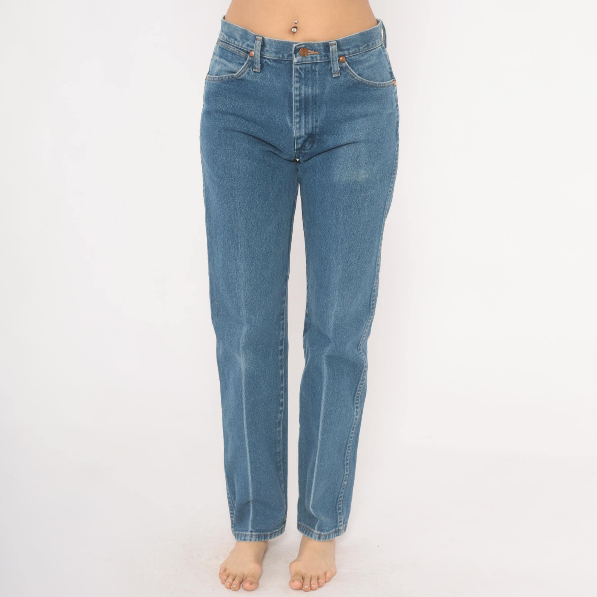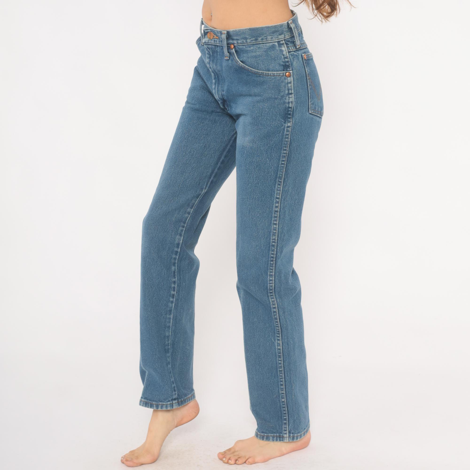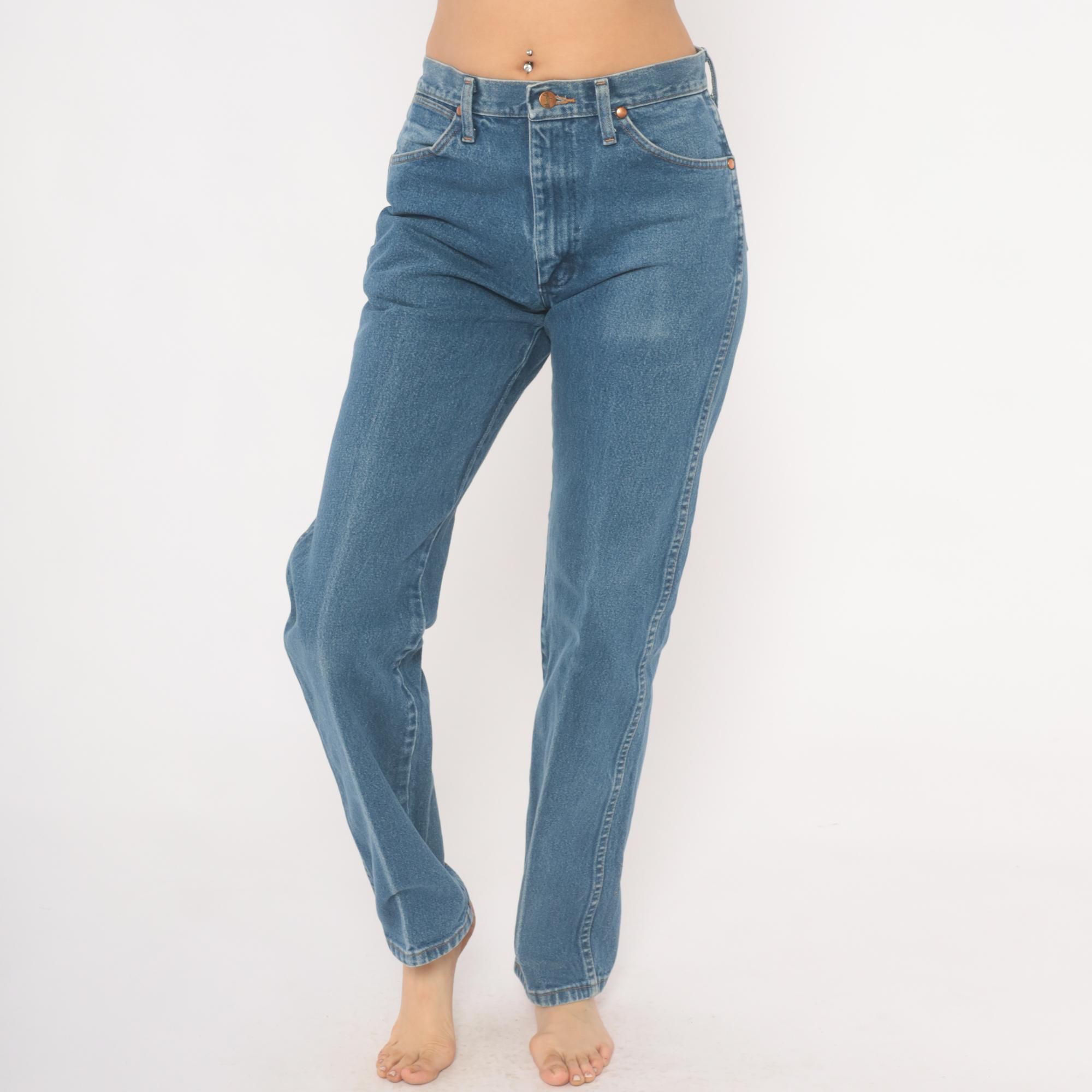 2000s Wrangler jeans in a medium blue wash with straight leg cut and high rise. Five-pocket construction with copper rivets, zipper fly, and single button closure at the waist. Signature W-stitching on both back pockets with leather Wrangler logo patch and branded tag along the waistband. Belt loops along the waistband.