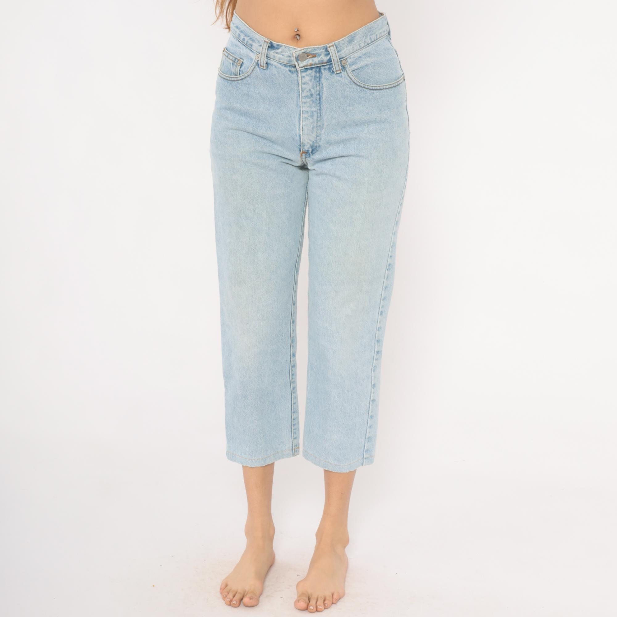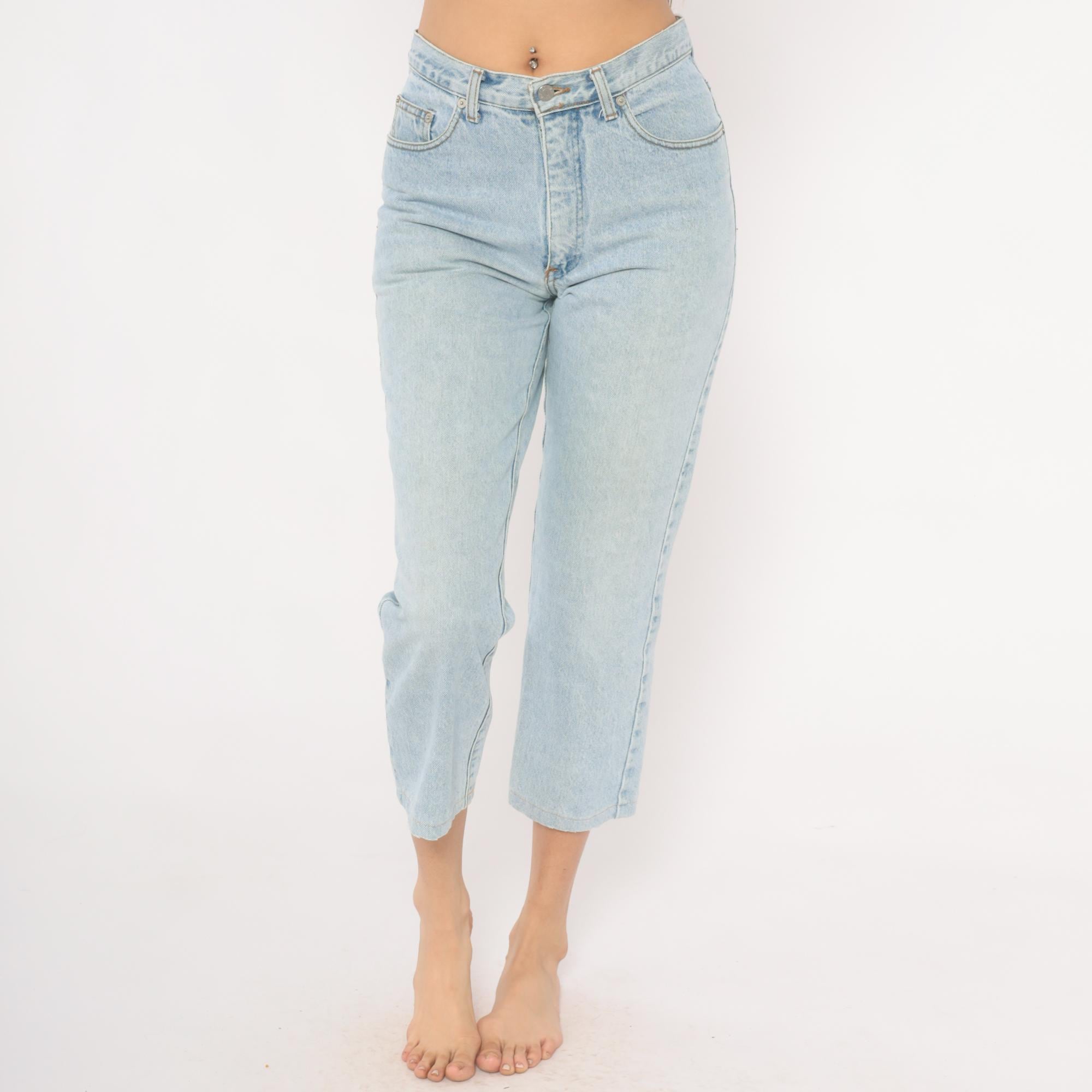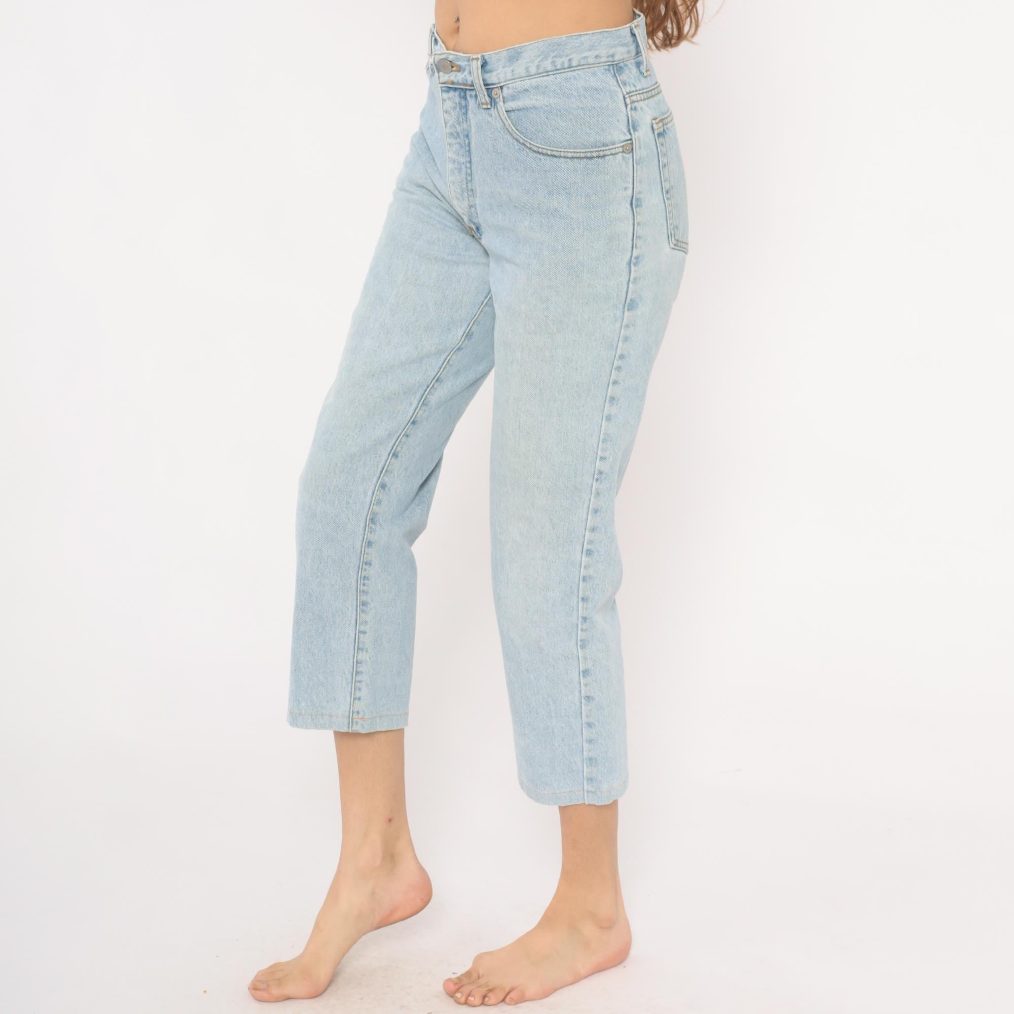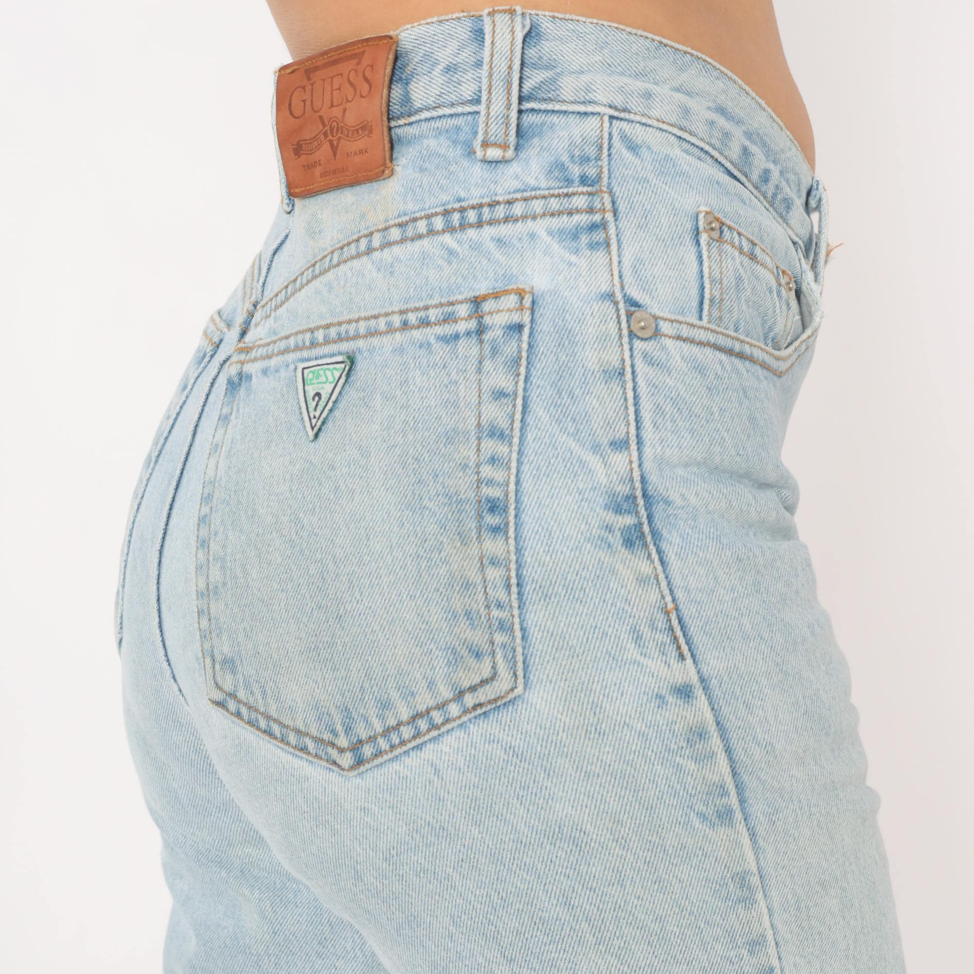 90s Guess jeans in a light wash, faded blue denim with a high-waisted straight leg silhouette and cropped ankle length. Button fly closure with a zip front, five-pocket construction, and belt loops at the waistband. Brown leather Guess logo patch on the back waistband and the signature green triangle emblem on the right rear pocket.