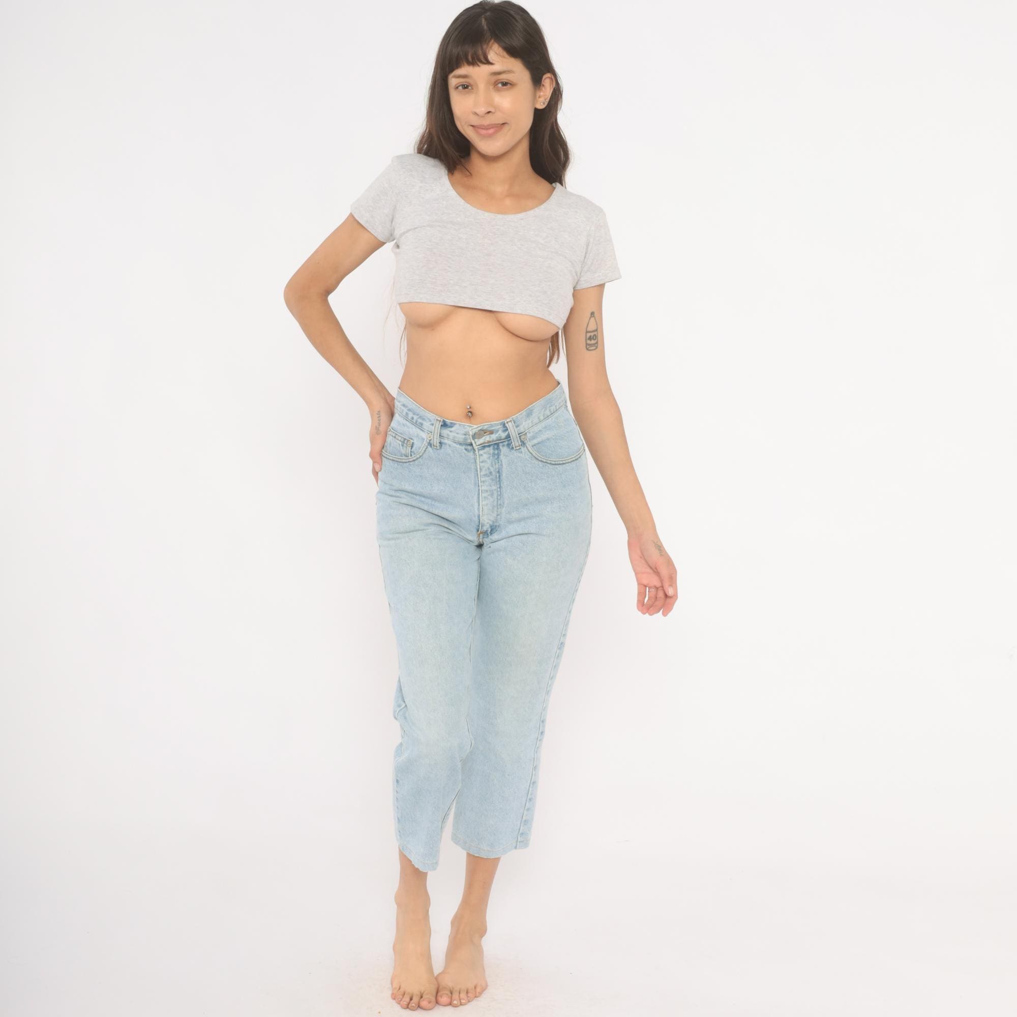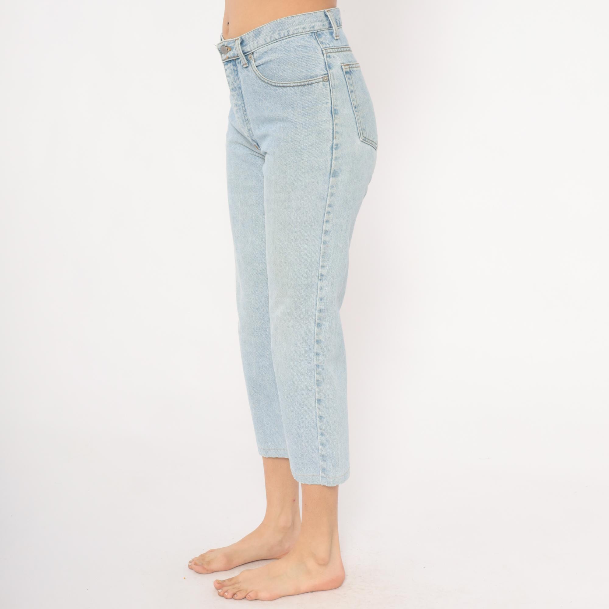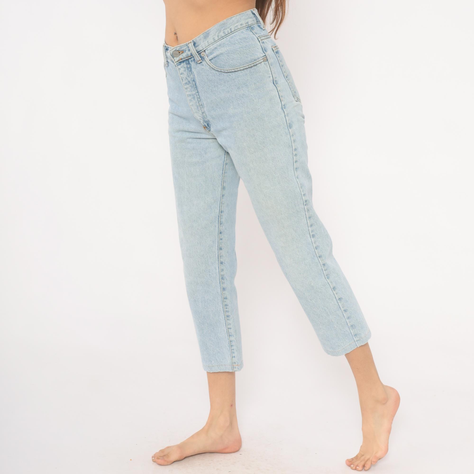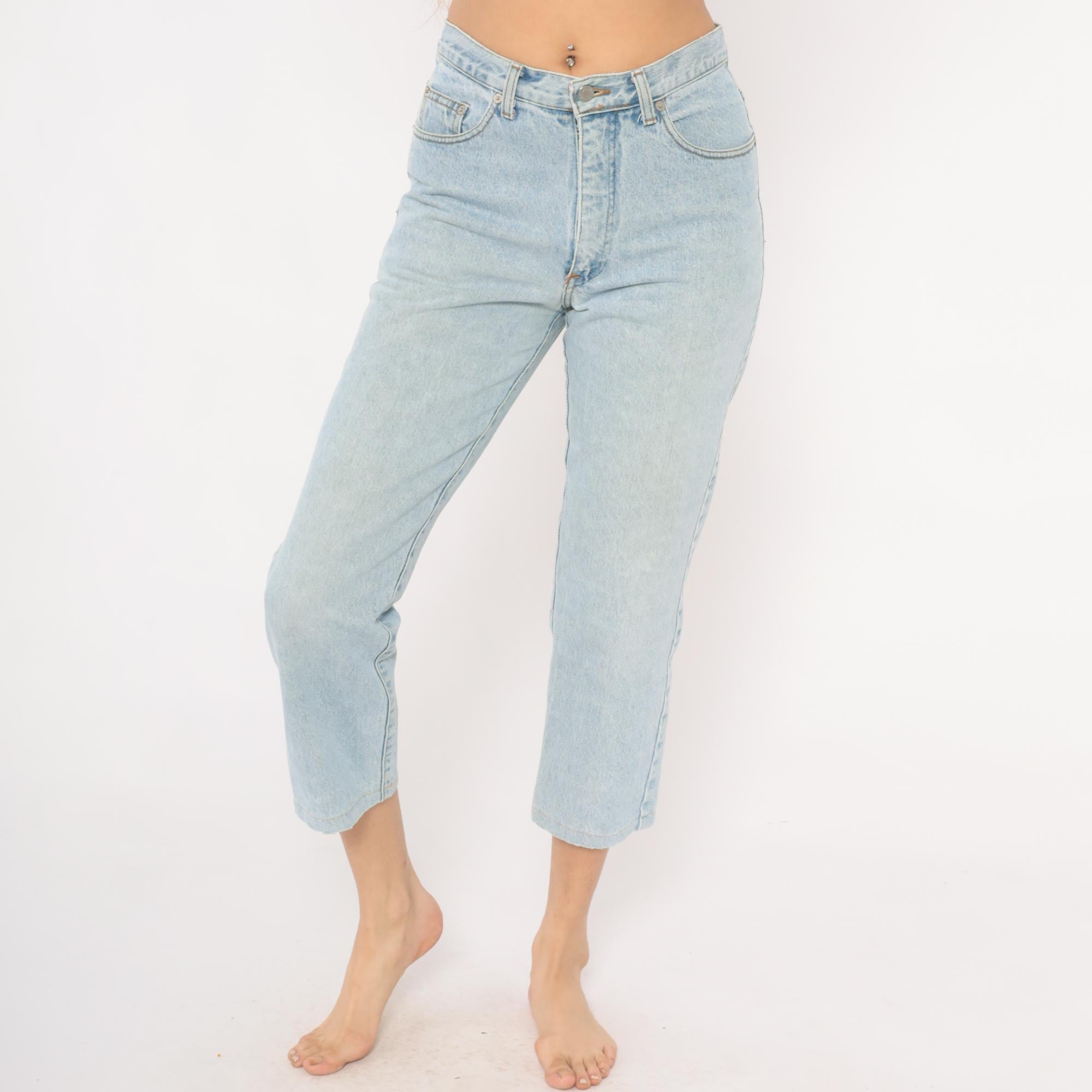 90s Guess jeans in a light wash, faded blue denim with a high-waisted straight leg silhouette and cropped ankle length. Button fly closure with a zip front, five-pocket construction, and belt loops at the waistband. Brown leather Guess logo patch on the back waistband and the signature green triangle emblem on the right rear pocket.
