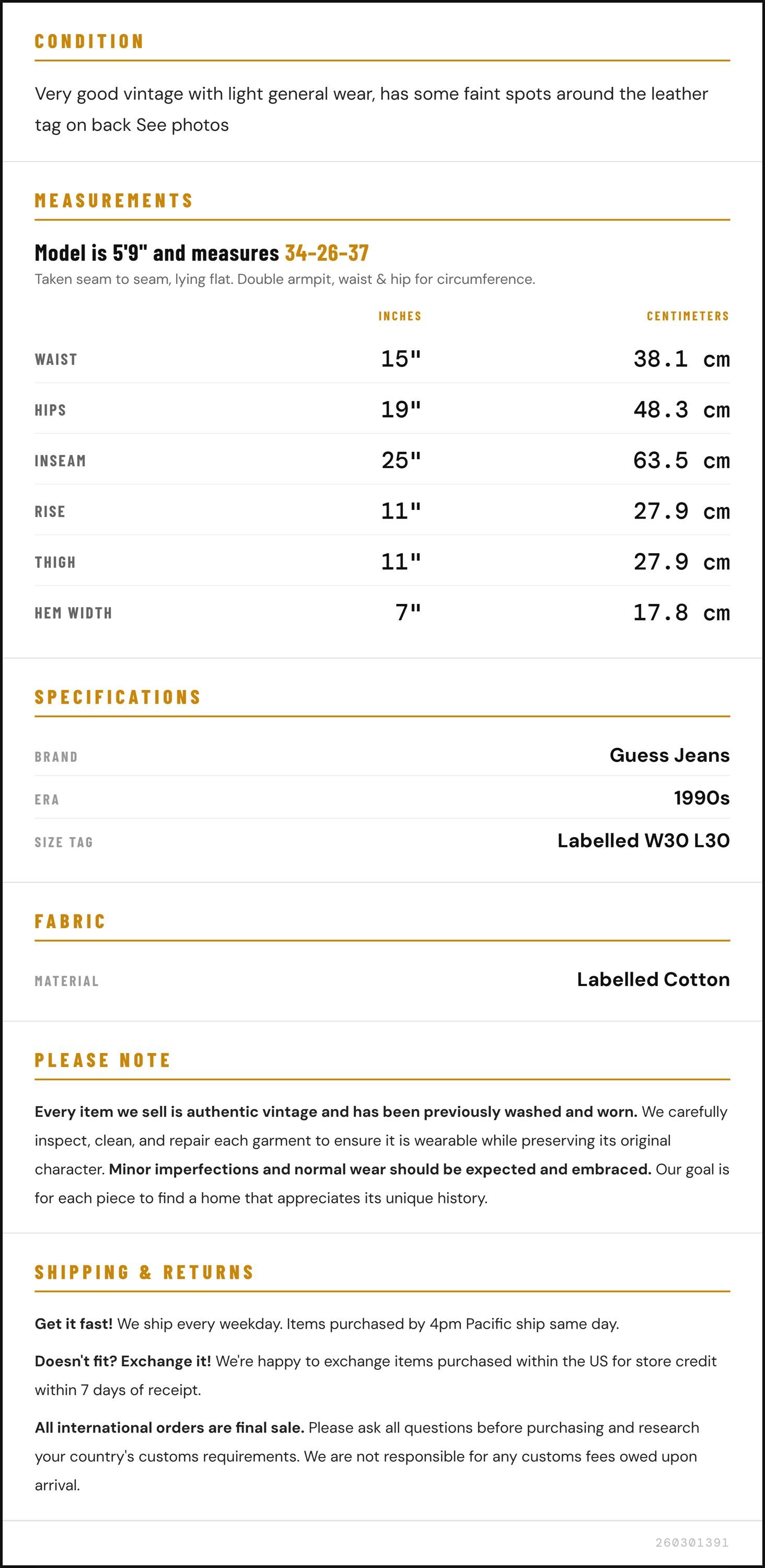 Vintage denim was usually made without any stretch, unlike modern jeans. Check the measurements to ensure proper fit, and remember to give yourself a little wiggle room in the waist and hips, depending on your preferred fit.