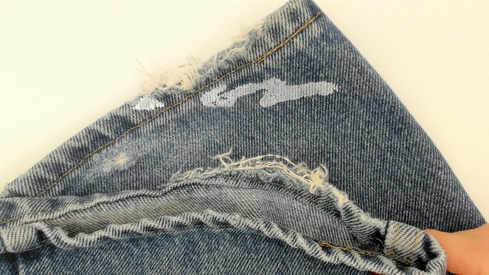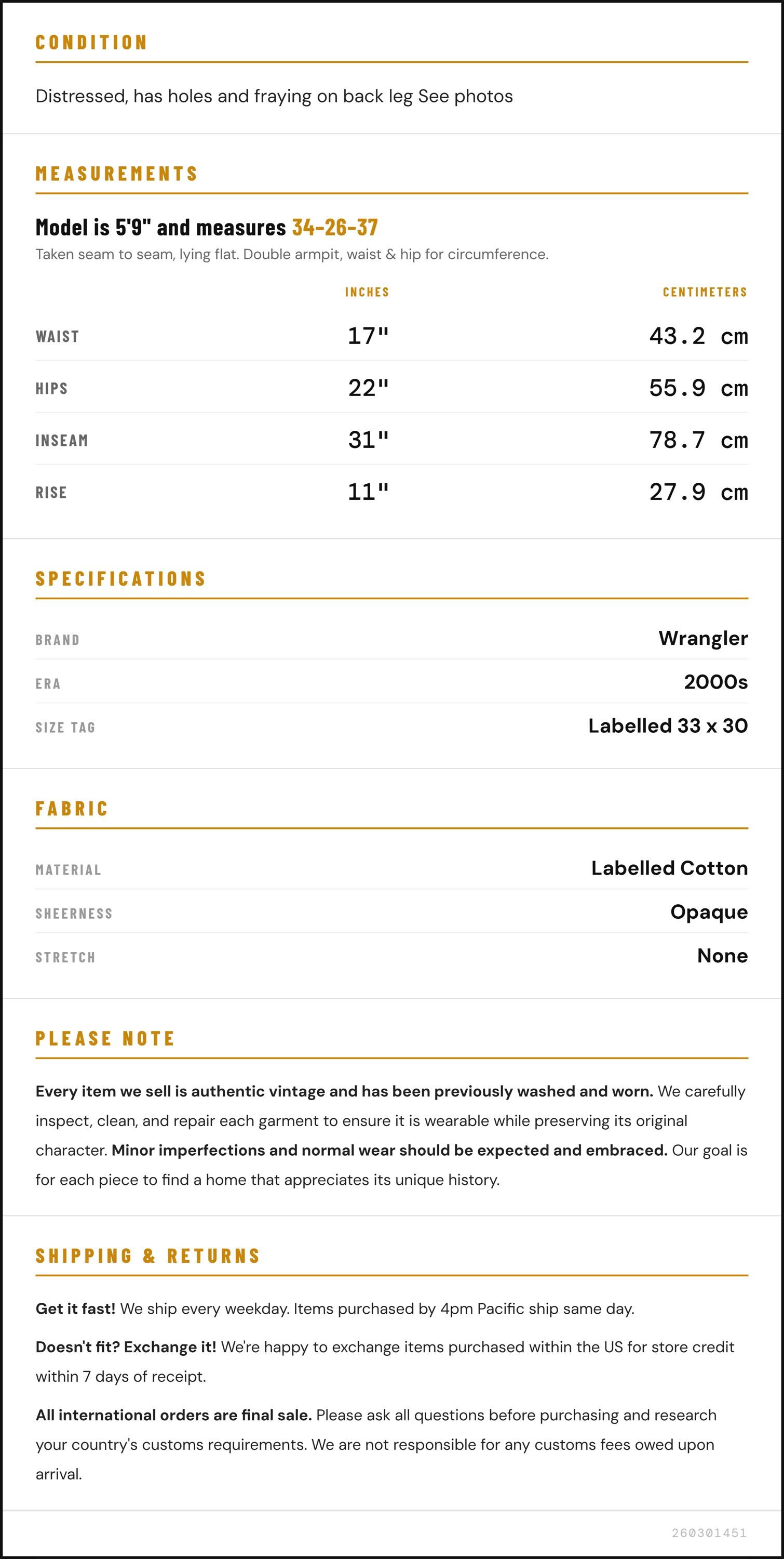 Condition: Distressed, has holes and fraying on back leg See photos