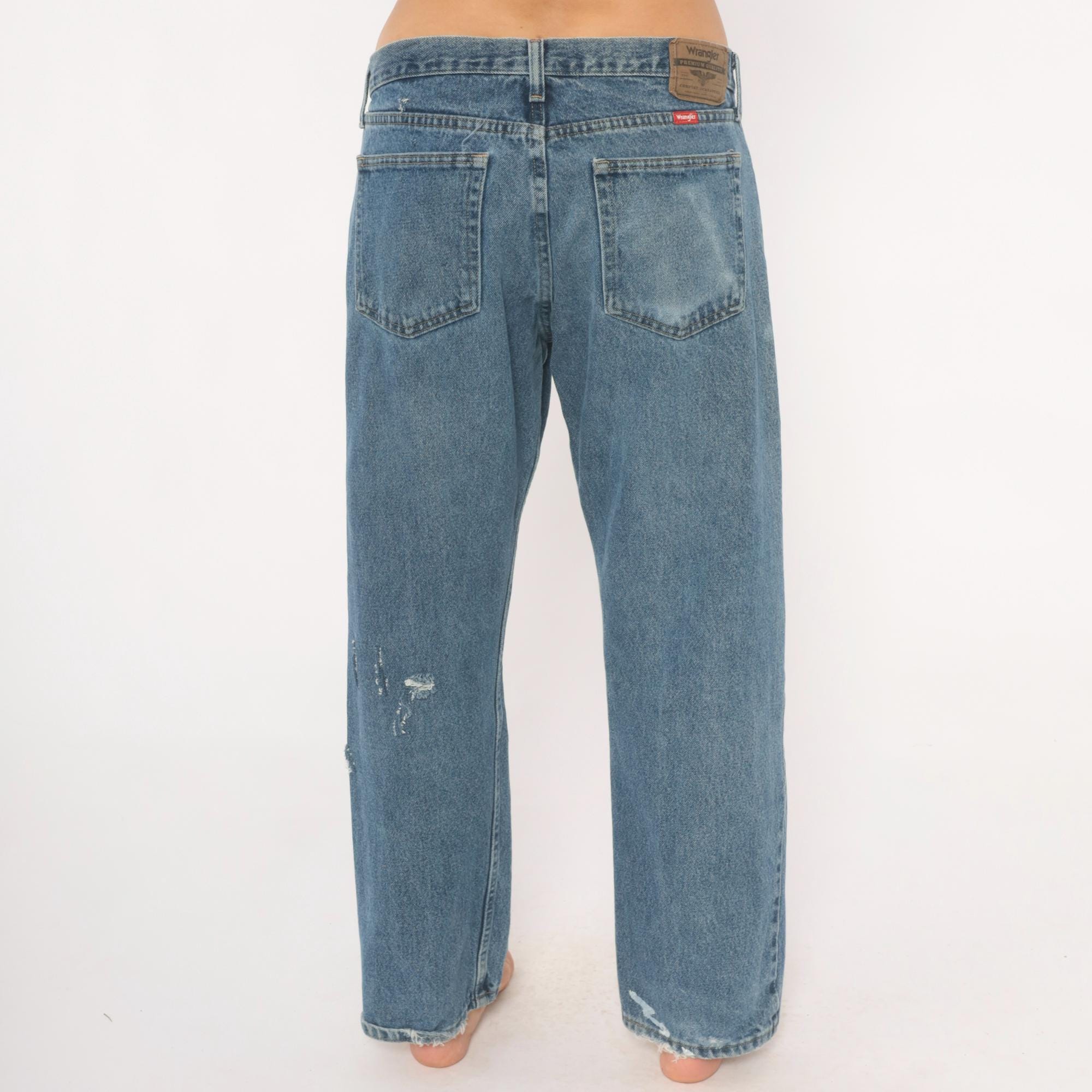 2000s Wrangler straight leg jeans in a medium blue stonewash with natural fading and distressing throughout the legs and hems. Five-pocket construction with copper-tone rivets, front zipper and button closure, and belt loops. Brown leather brand patch on the back waistband with a red Wrangler logo tab on the right rear pocket.