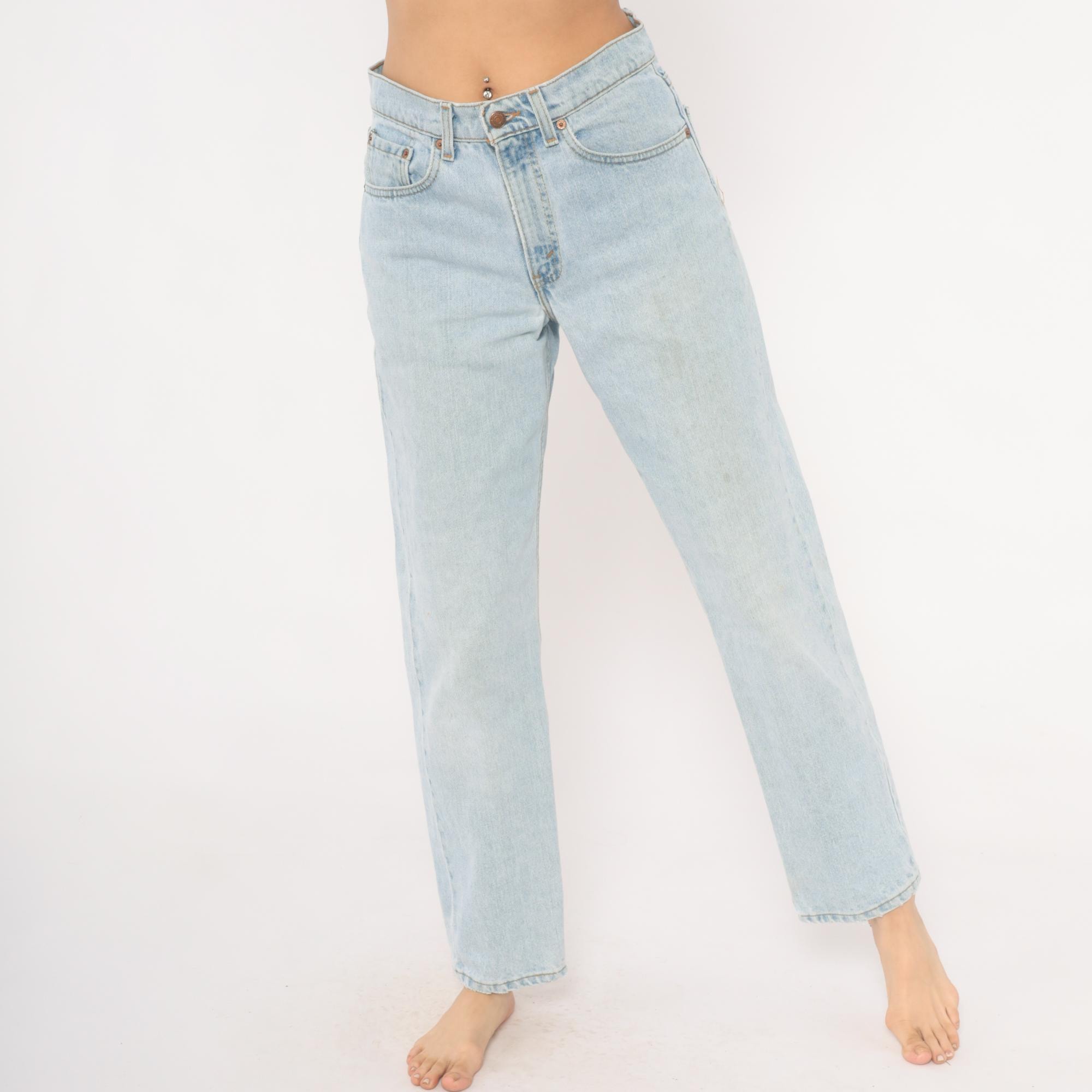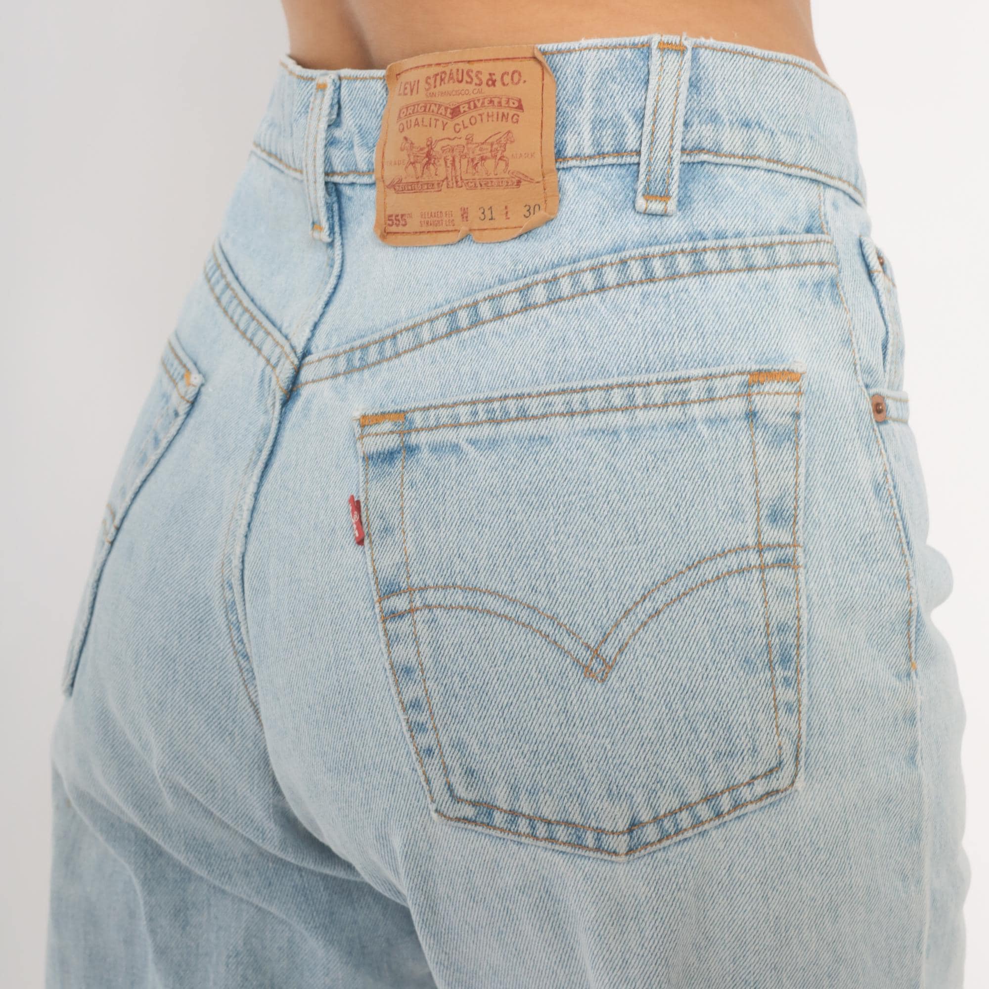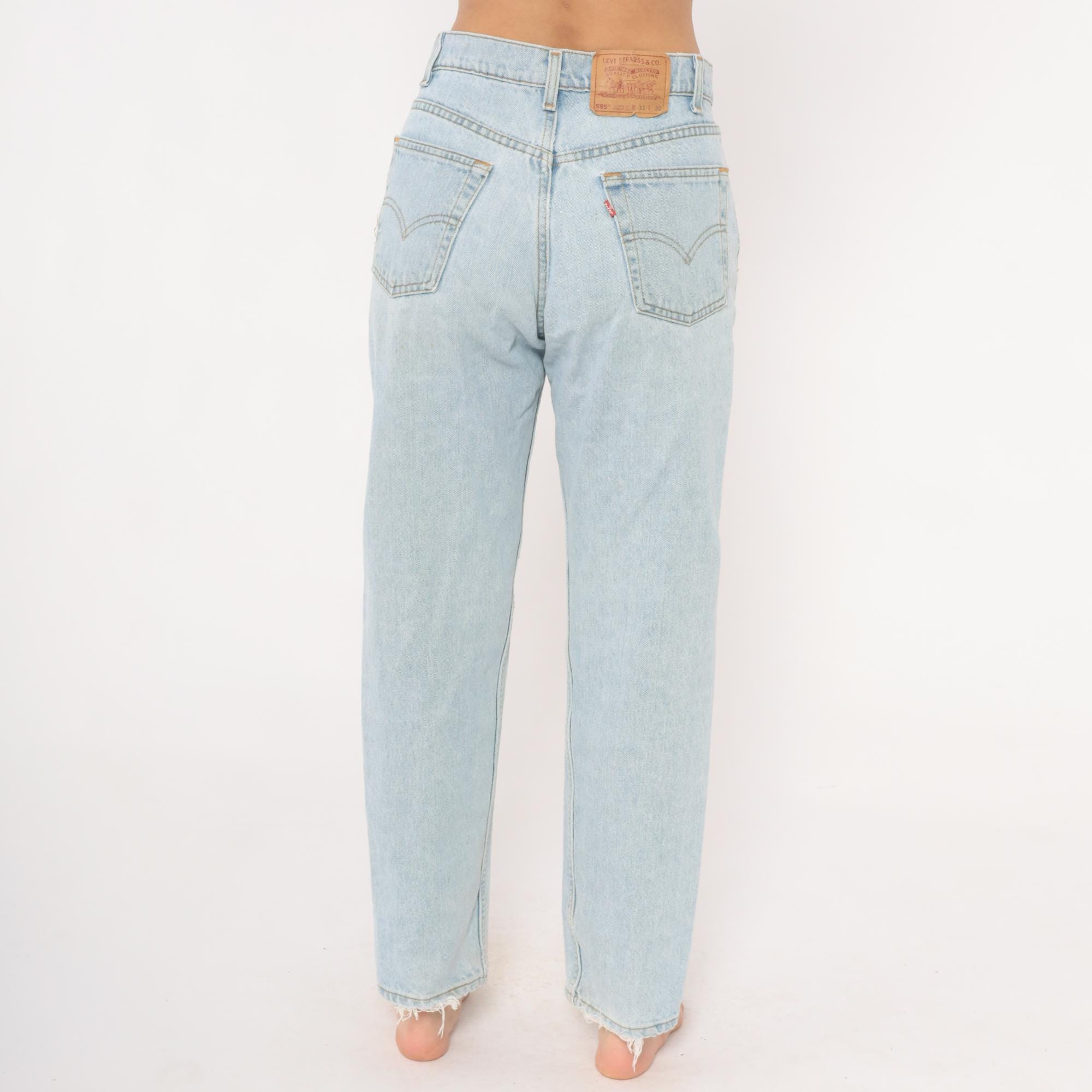 90s Levi's 555 relaxed fit straight leg jeans in a light stonewash blue with faded, worn-in coloring throughout. High waisted rise with button and zipper front closure, five-pocket construction, and copper rivets.