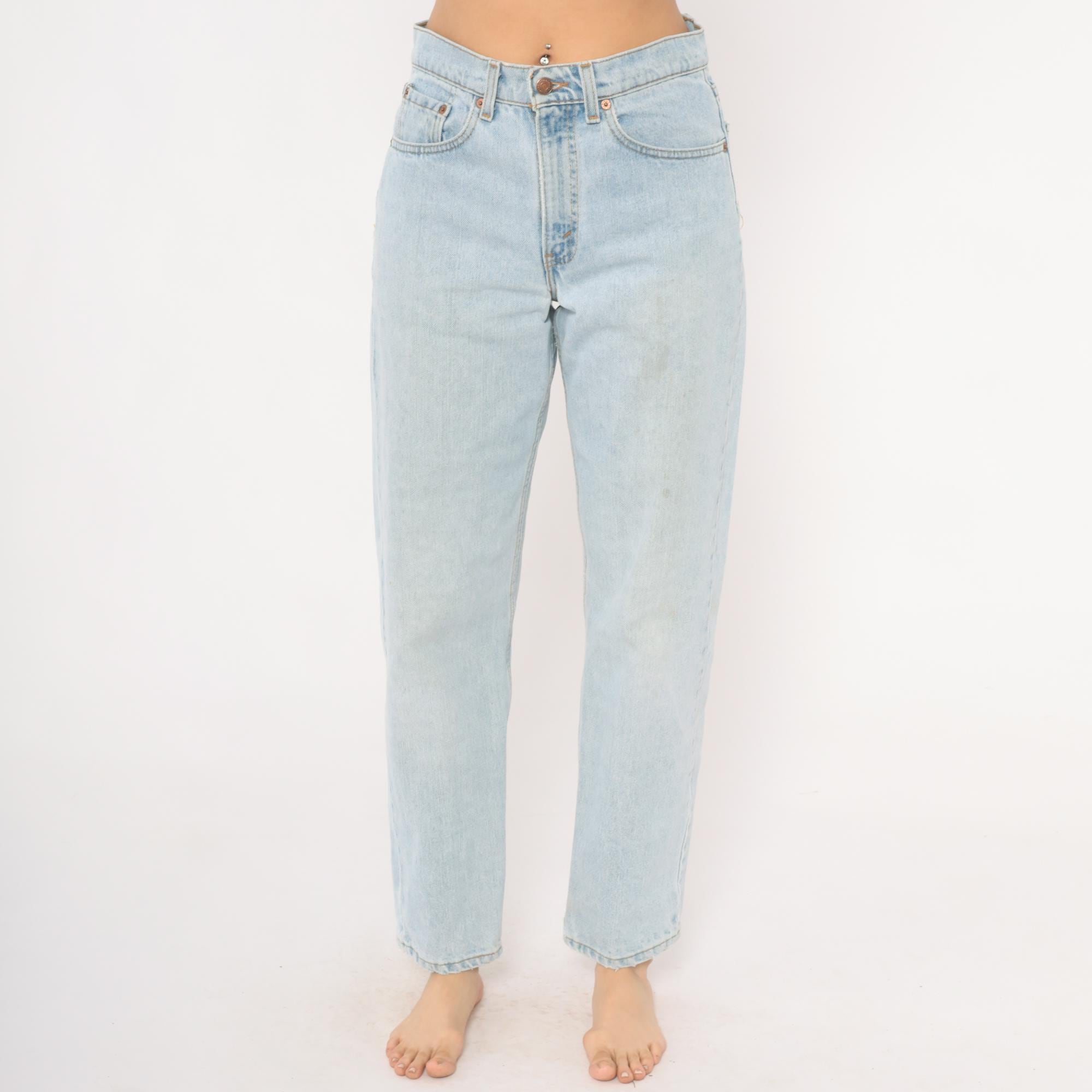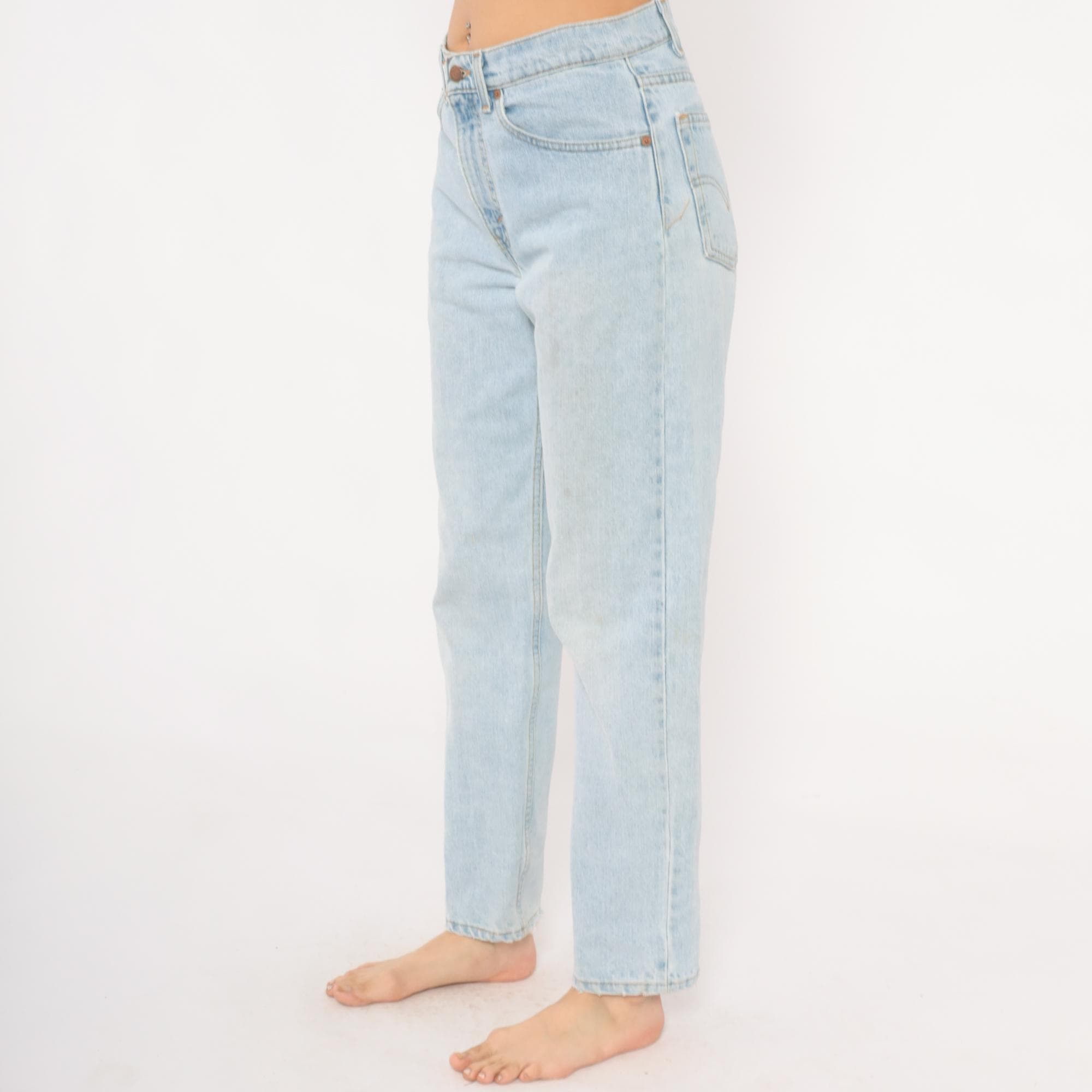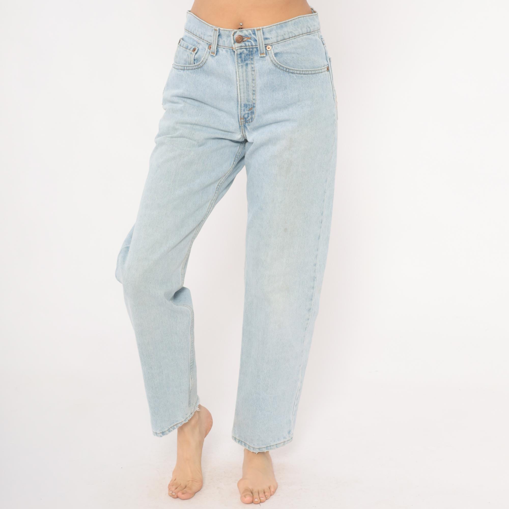 90s Levi's 555 relaxed fit straight leg jeans in a light stonewash blue with faded, worn-in coloring throughout. High waisted rise with button and zipper front closure, five-pocket construction, and copper rivets.
