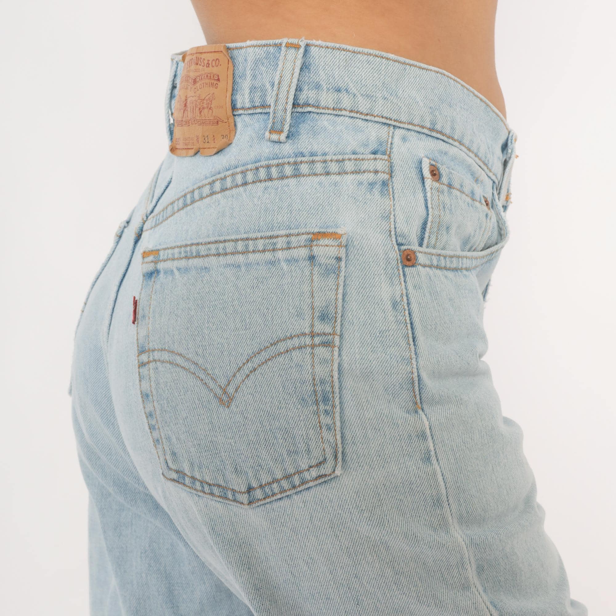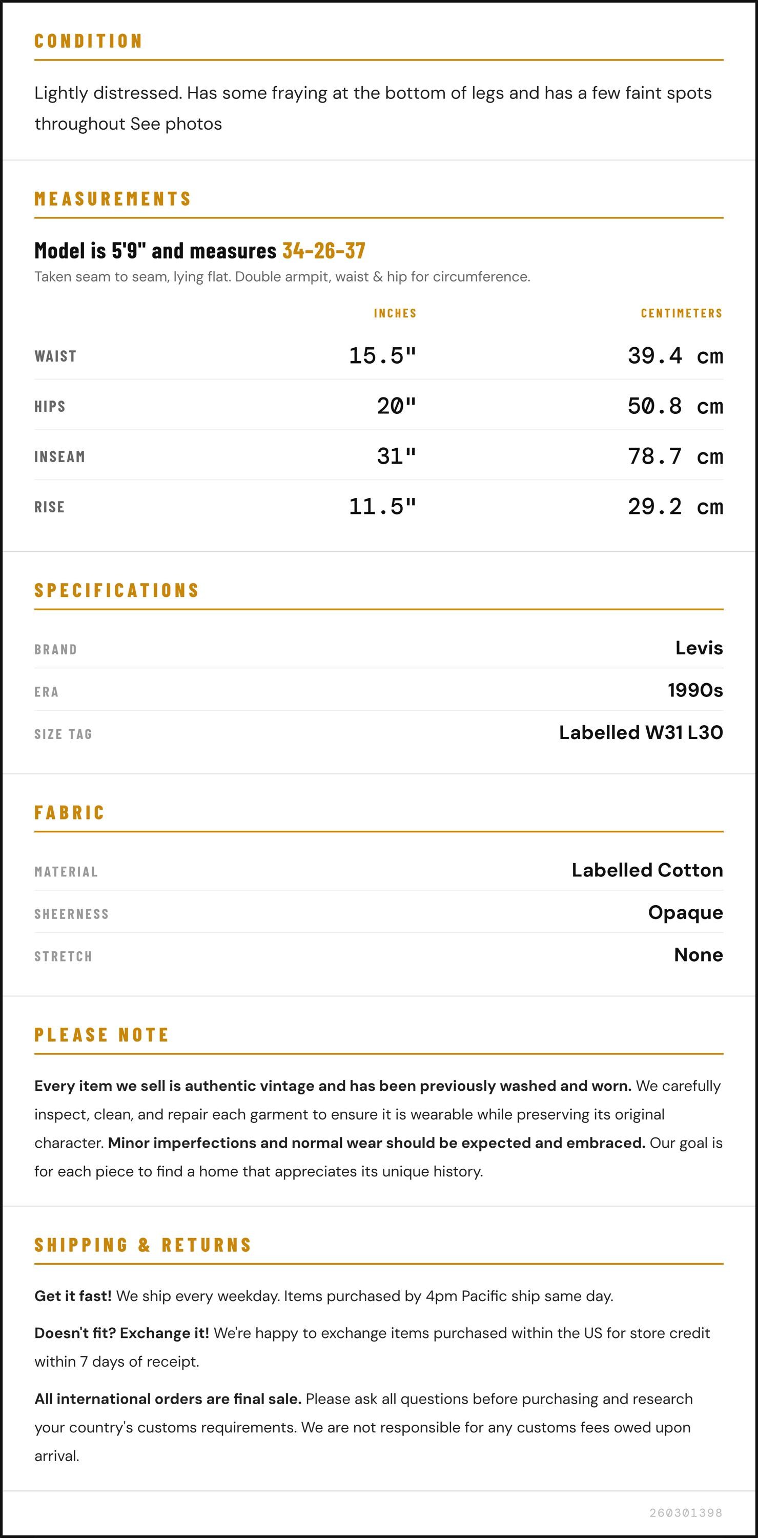 Vintage denim was usually made without any stretch, unlike modern jeans. Check the measurements to ensure proper fit, and remember to give yourself a little wiggle room in the waist and hips, depending on your preferred fit.